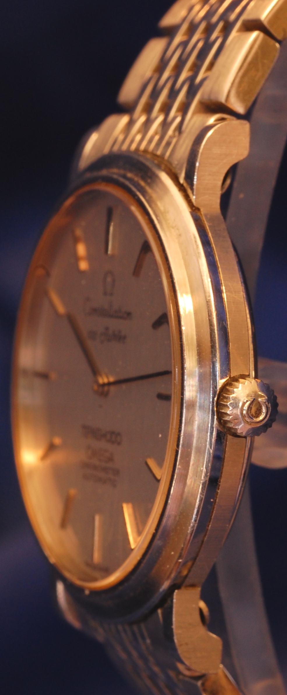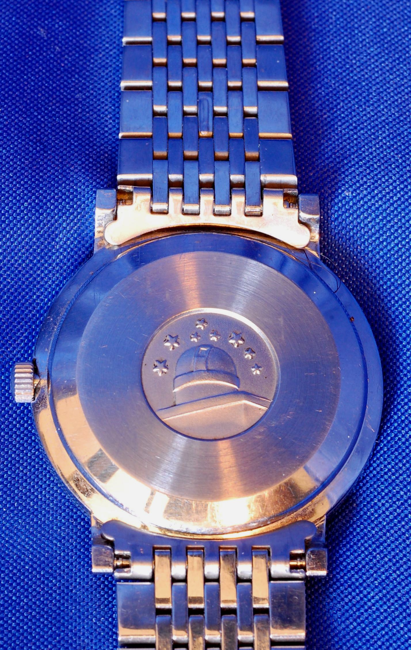 The watchband is not correct, this watch was shipped from Omega with a leather strap. This is a replica Omega bracelet sourced from the UK that seemed to fit well with the ultra-thin aspect of the 157.0001 Constellation. The curved ends were much too long and had to be tediously cut down and radiused. My understanding is that the 712 is the thinnest automatic movement produced in-house by Omega. It keeps impeccable time, and I enjoy that it does not have a sweep. The dial is not reproduced well in my photos. In person it is a brushed aluminum gray that is just barely lighter than the case. I do have a photo of the actual movement, from the seller, but it is on a computer that is not cooperating at the moment. I will include it later.
