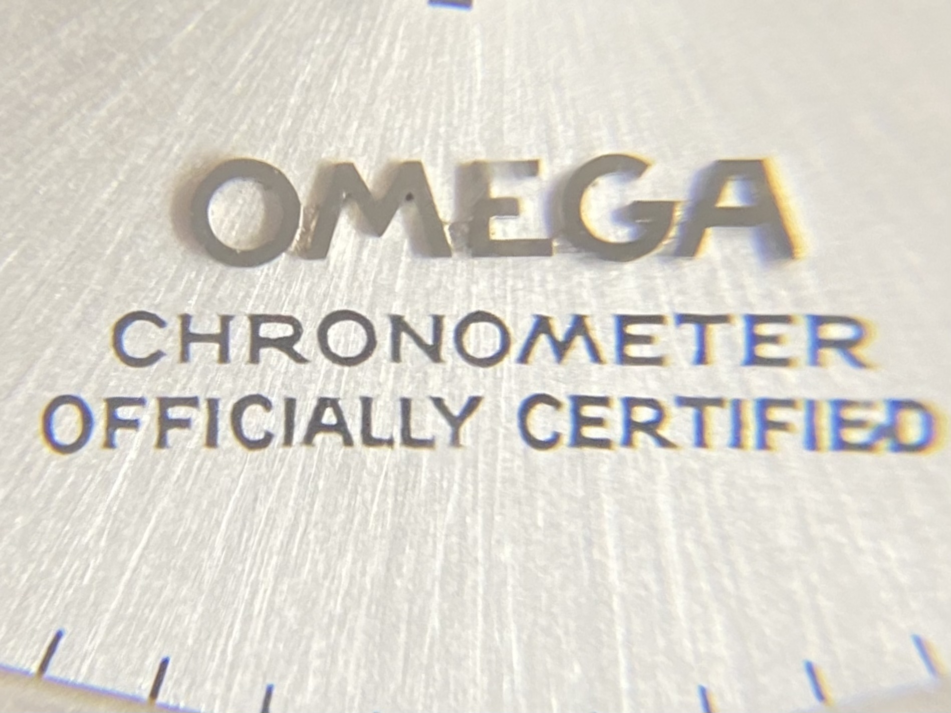 Dial: silver-white sunburst pie pan dial. SS furniture, onyx insert markers, applied Omega logo