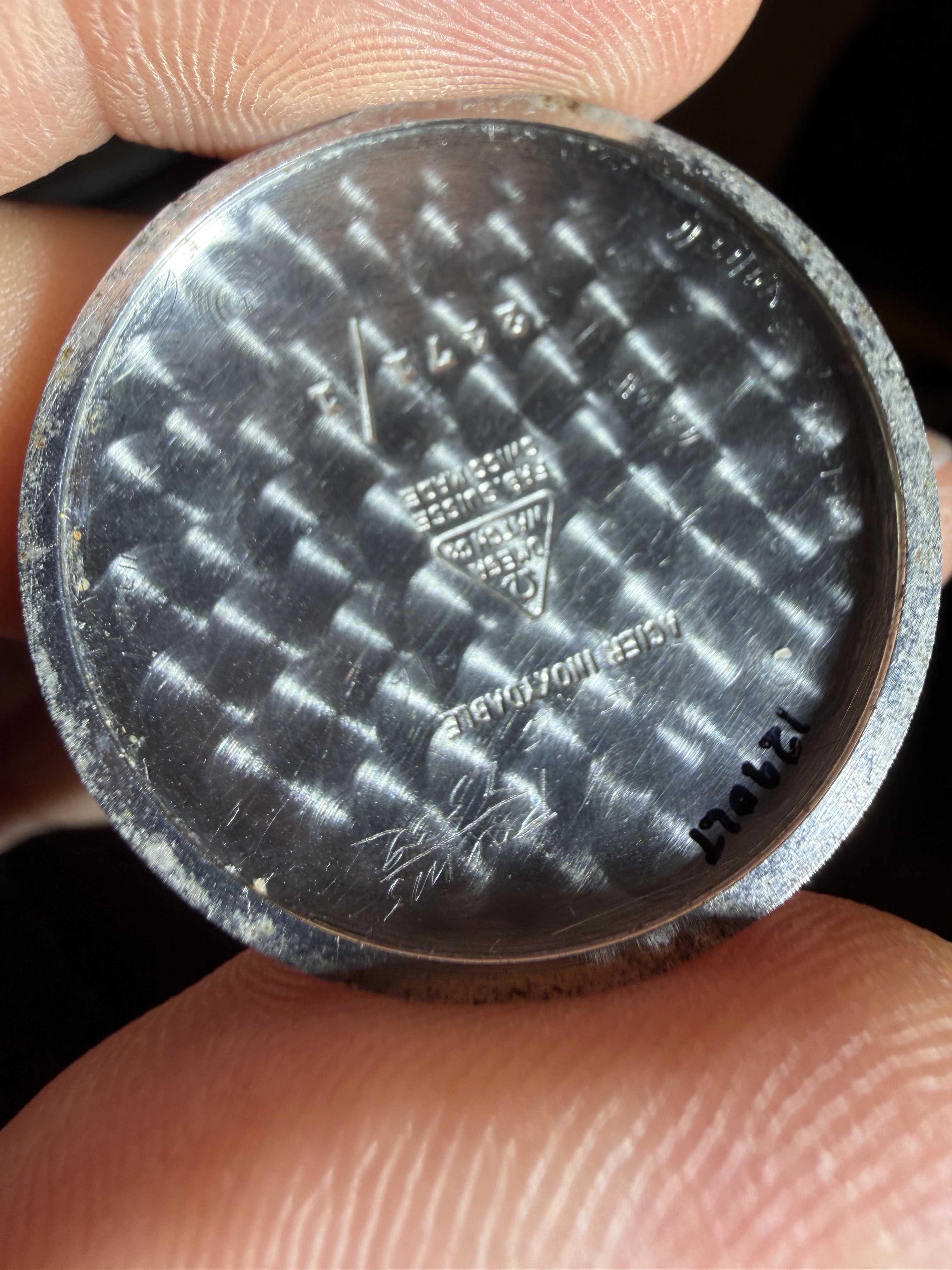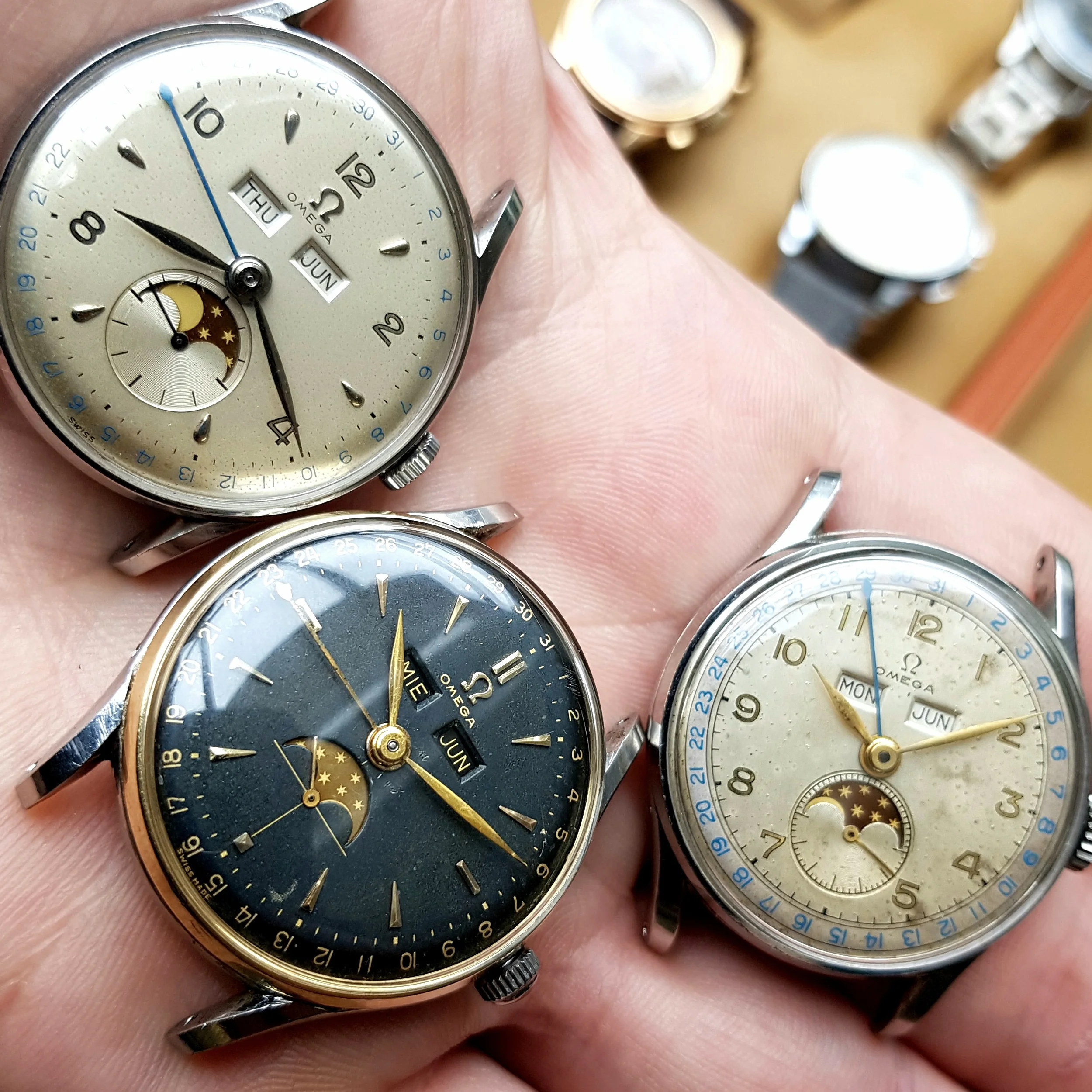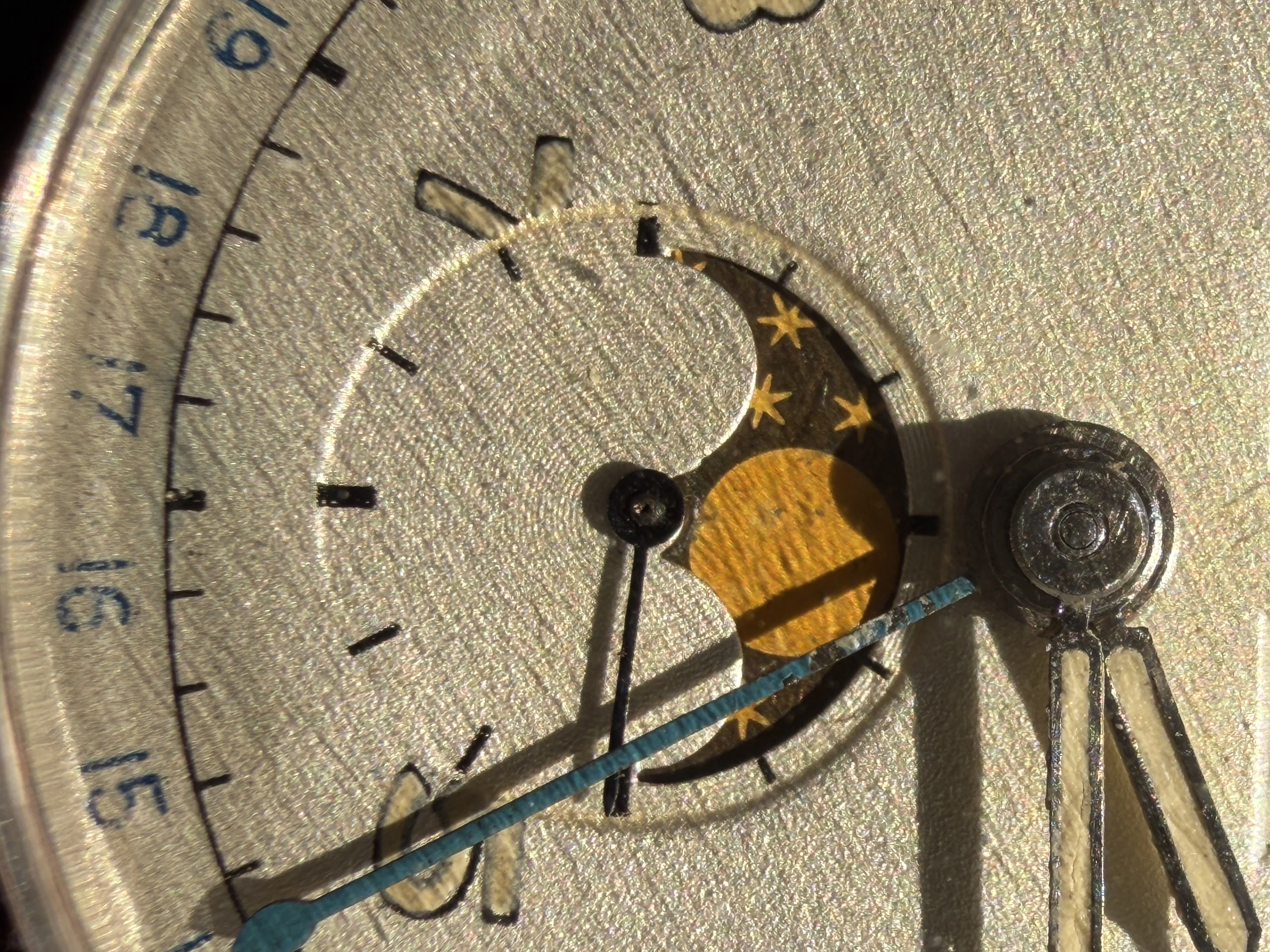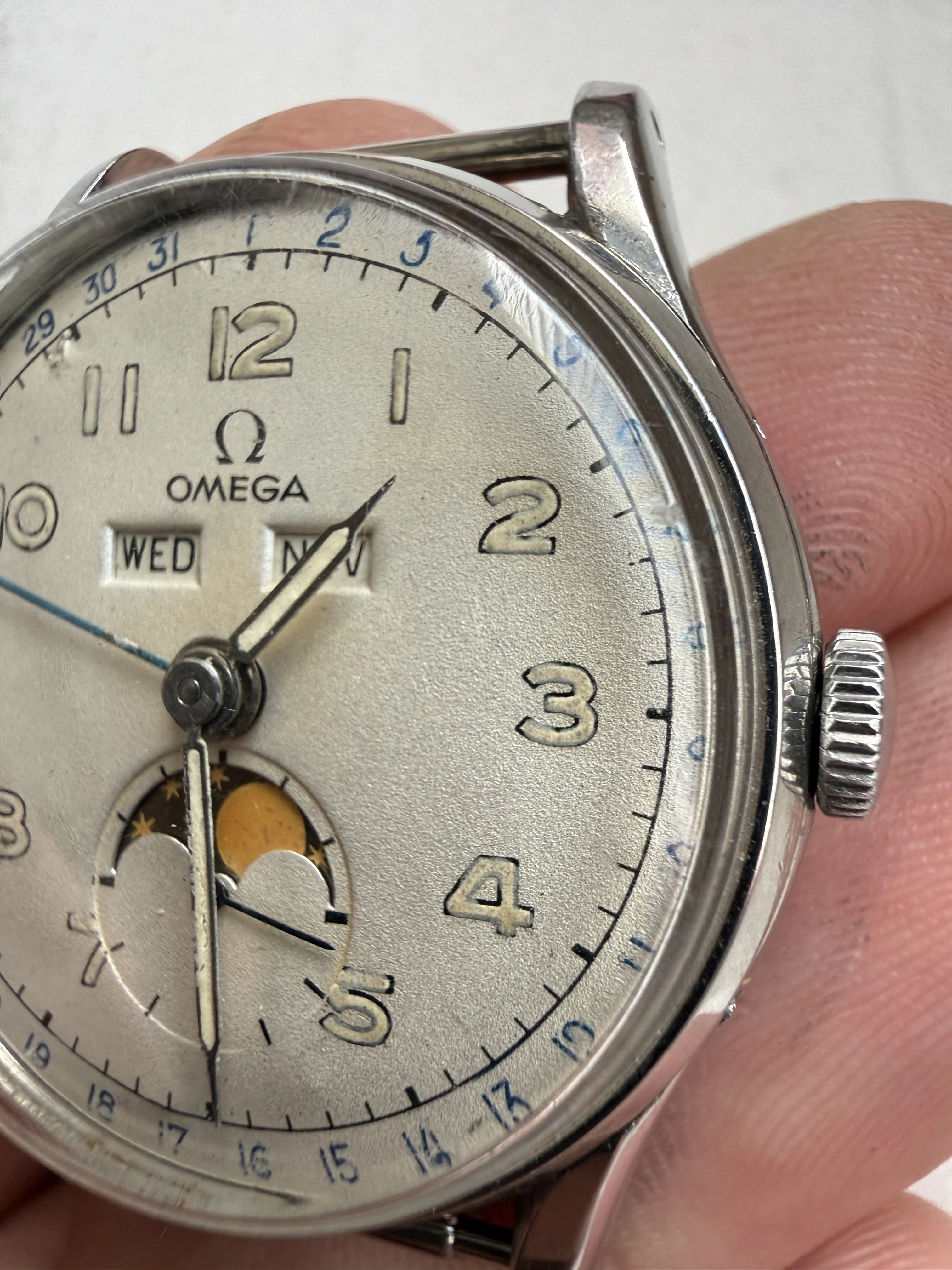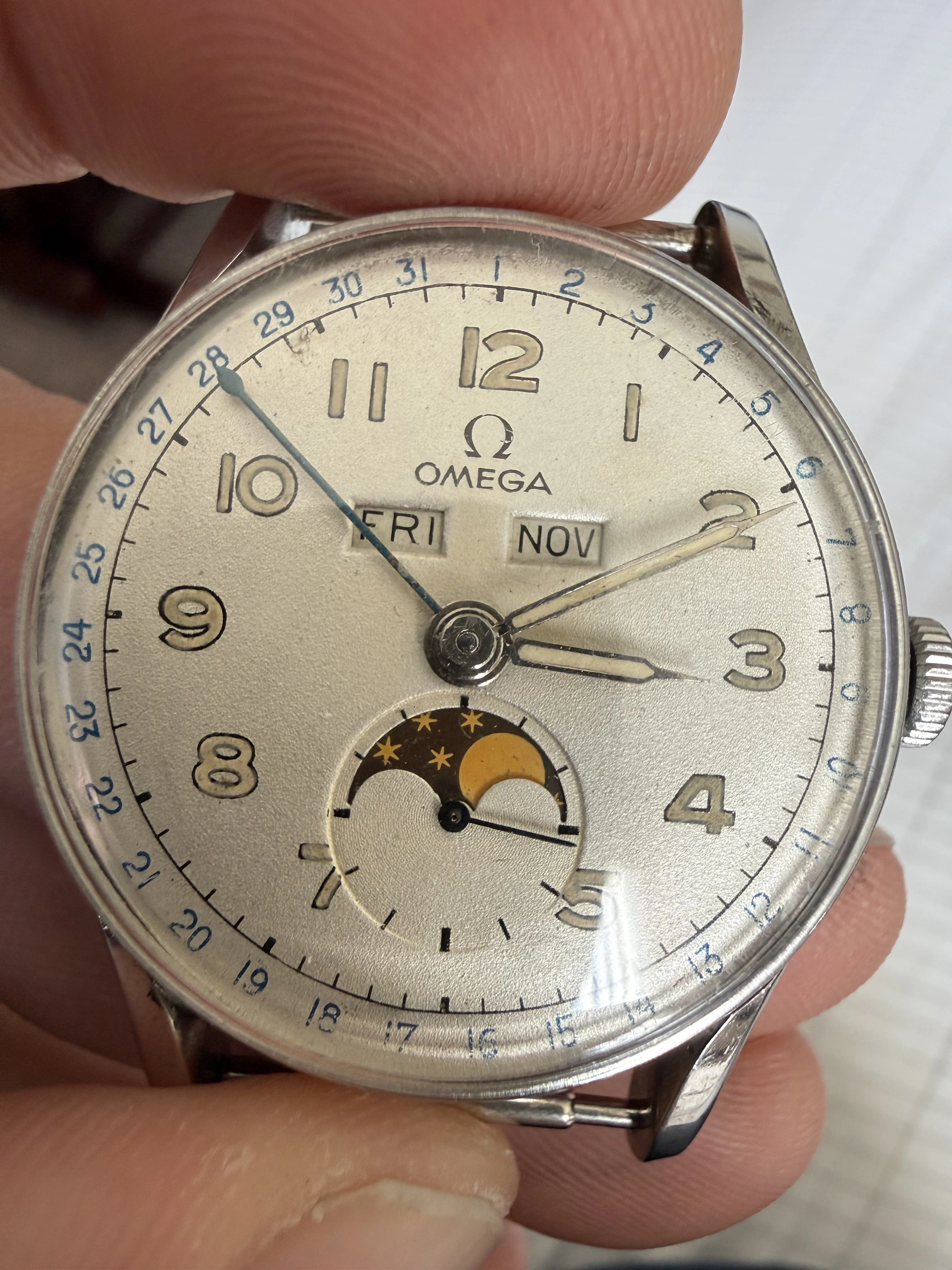 The watch was recently serviced. The case pushers were fabricated. Moonphase mechanism fixed.