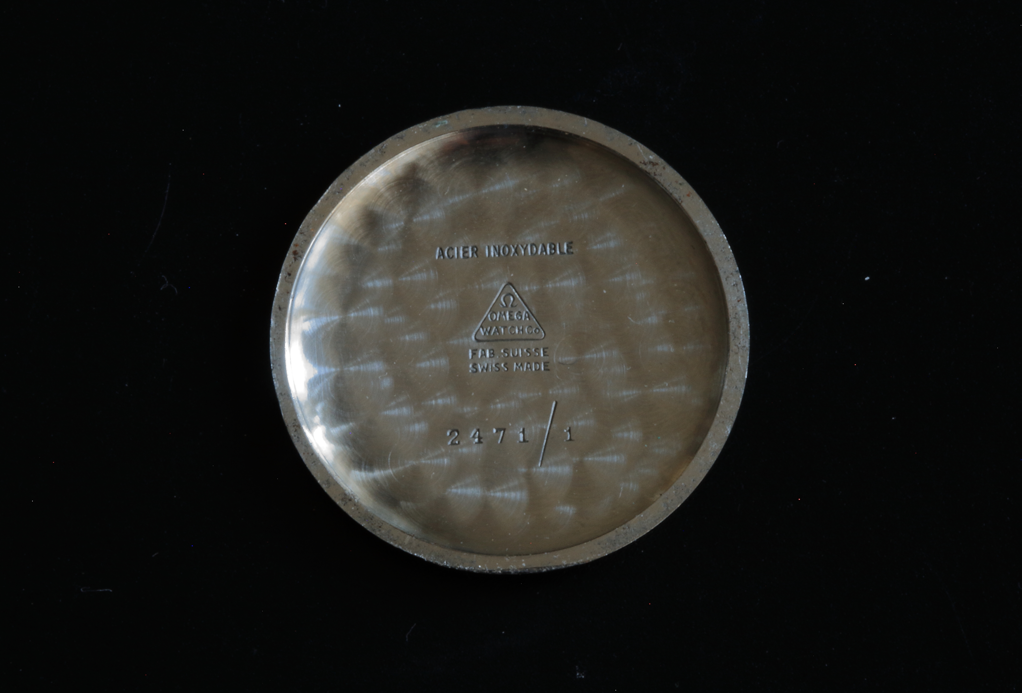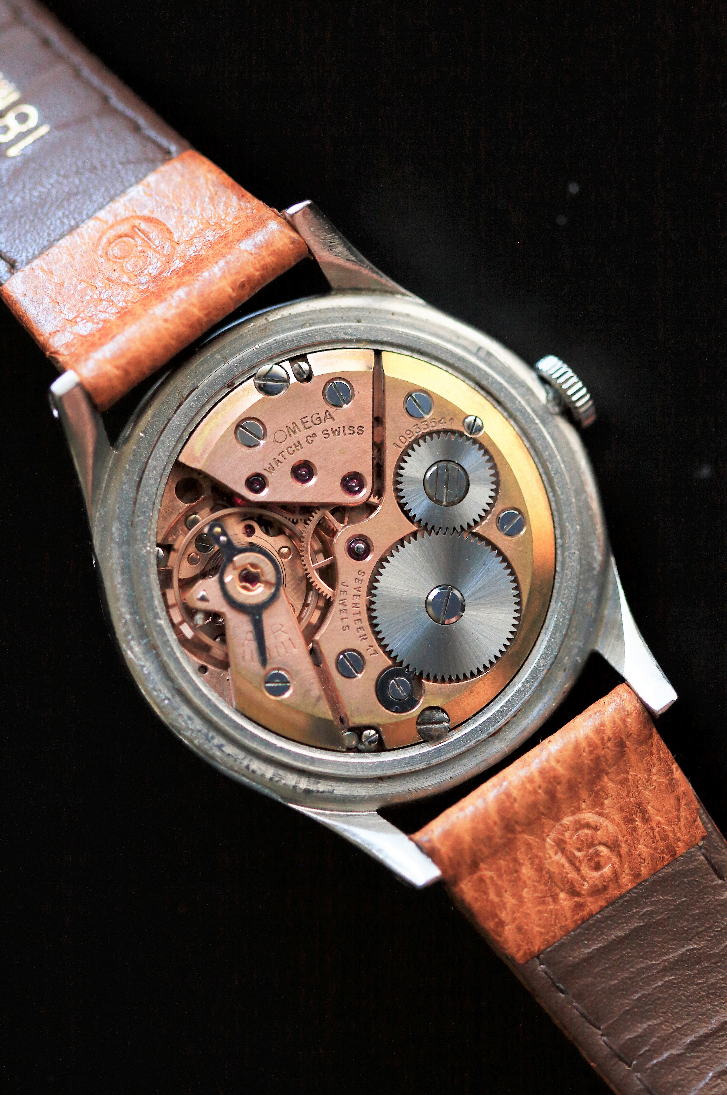 The two-tone cream dial has raised dot indices, gilt arabics and a blue date chapter ring and has developed a charming and even patina. This is an early dial with the printed Omega logo and text. The golden leaf hands with blue seconds pointer are also in good condition. The stars/moon disk has a nice brown hue which is very helpful when it comes to picking out a complimentary leather strap.