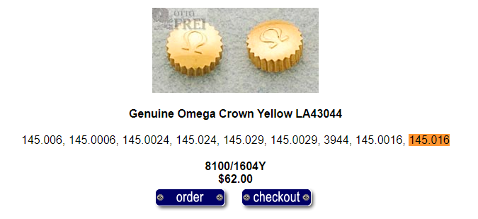 i am looking for an Omega Crown for a 145.016 / 145.006. Unfortunatelly i dont know the correct Part Number for the original (the repacement crown for those is 069ST43044).