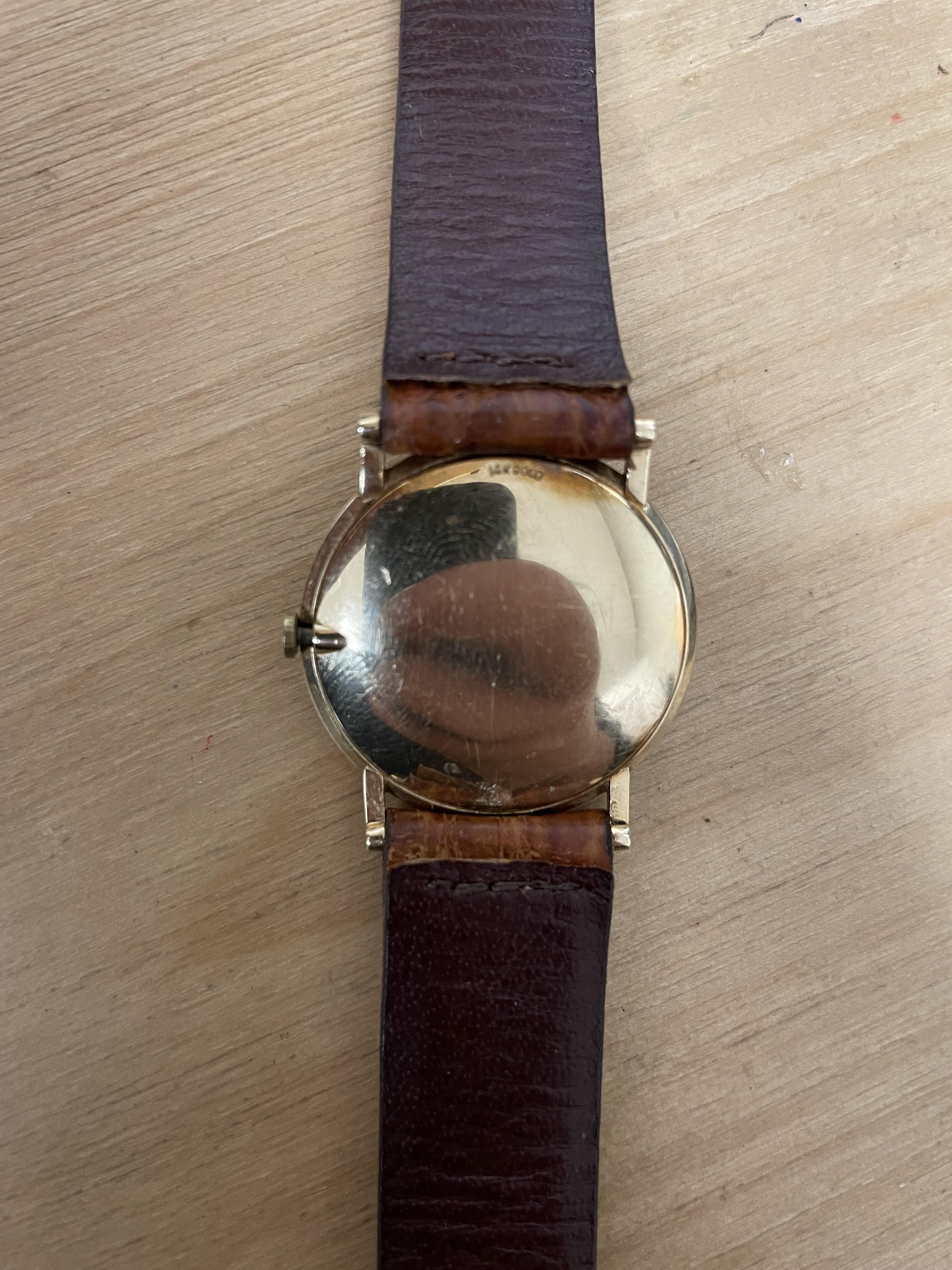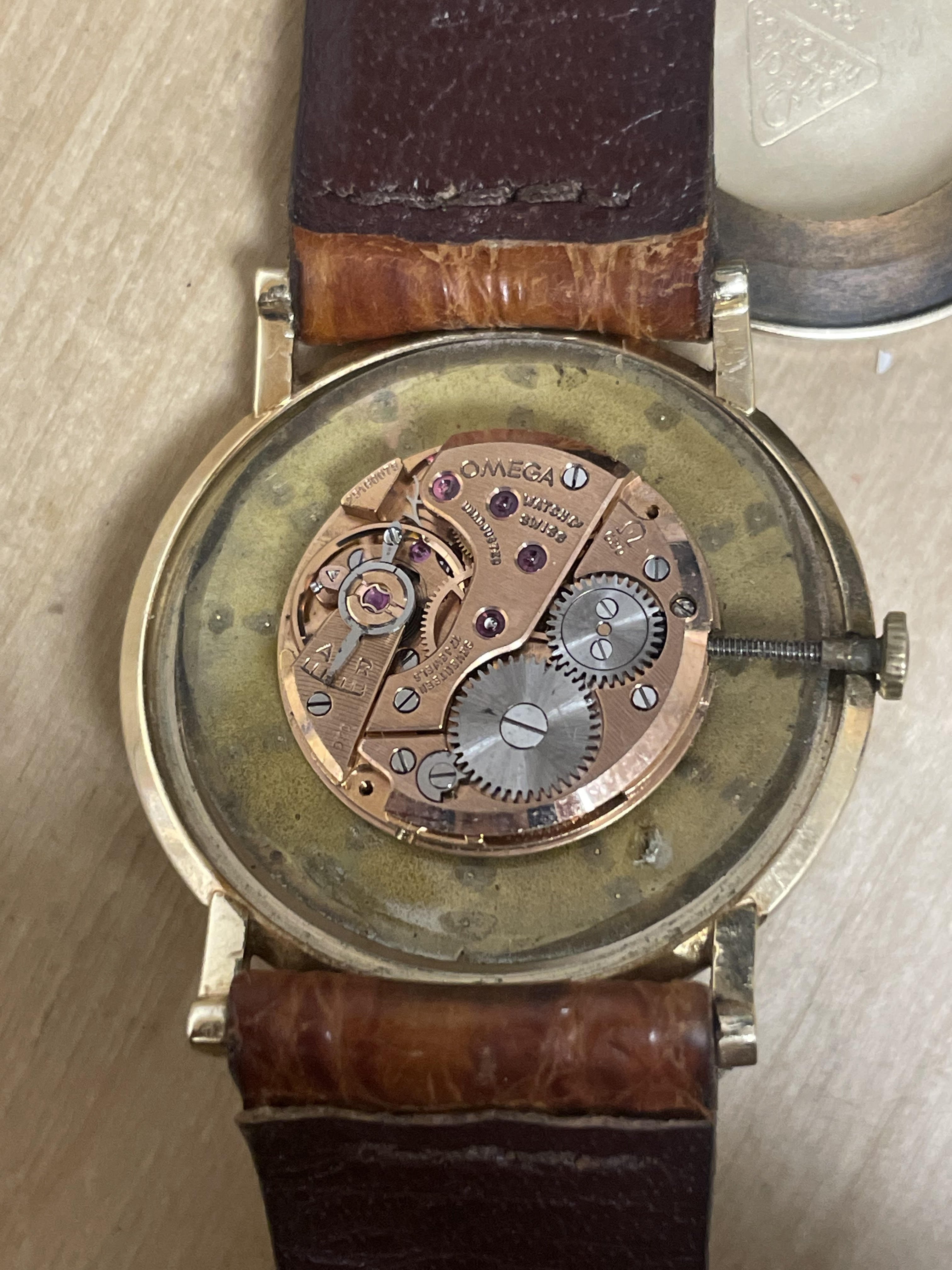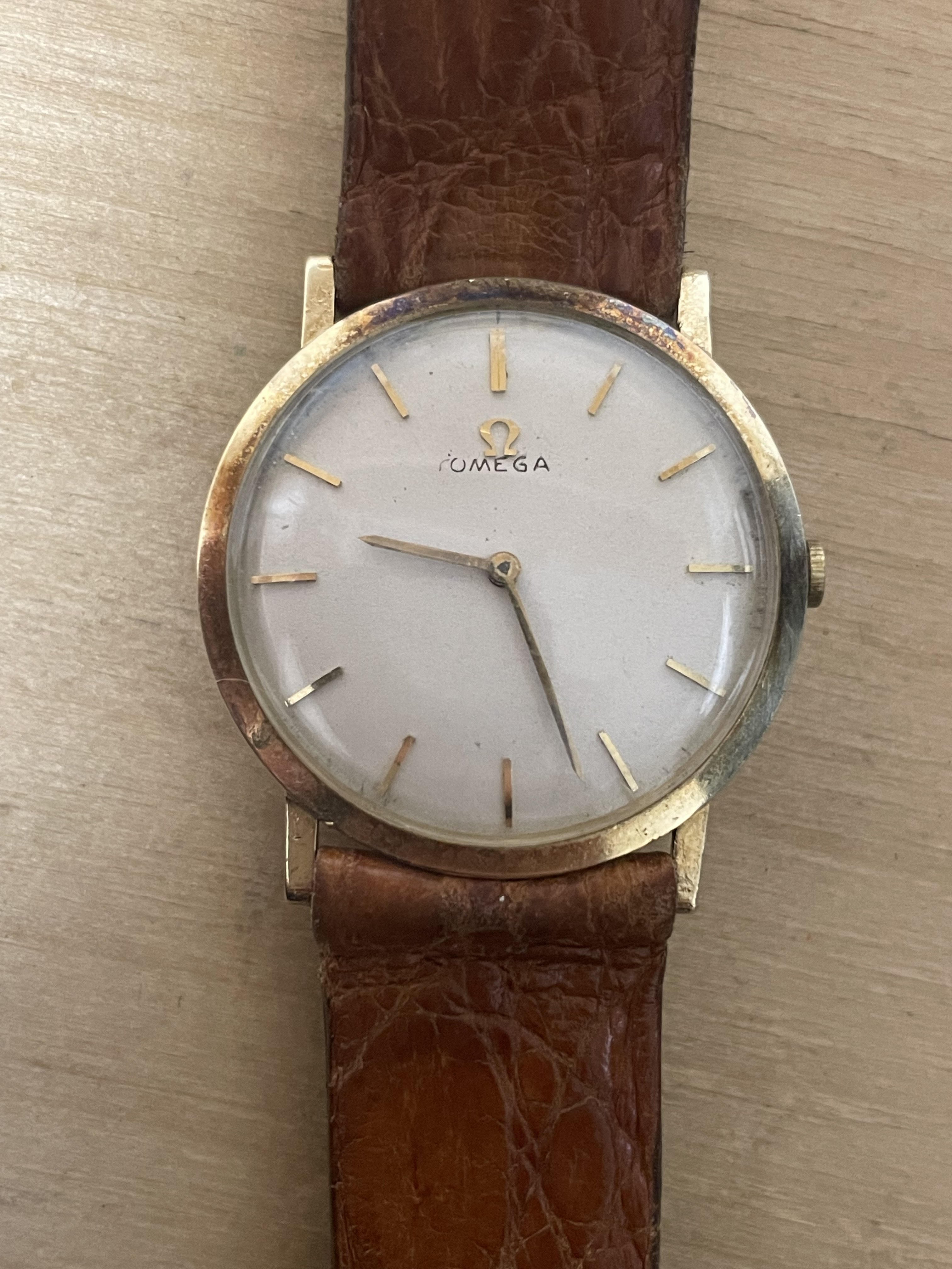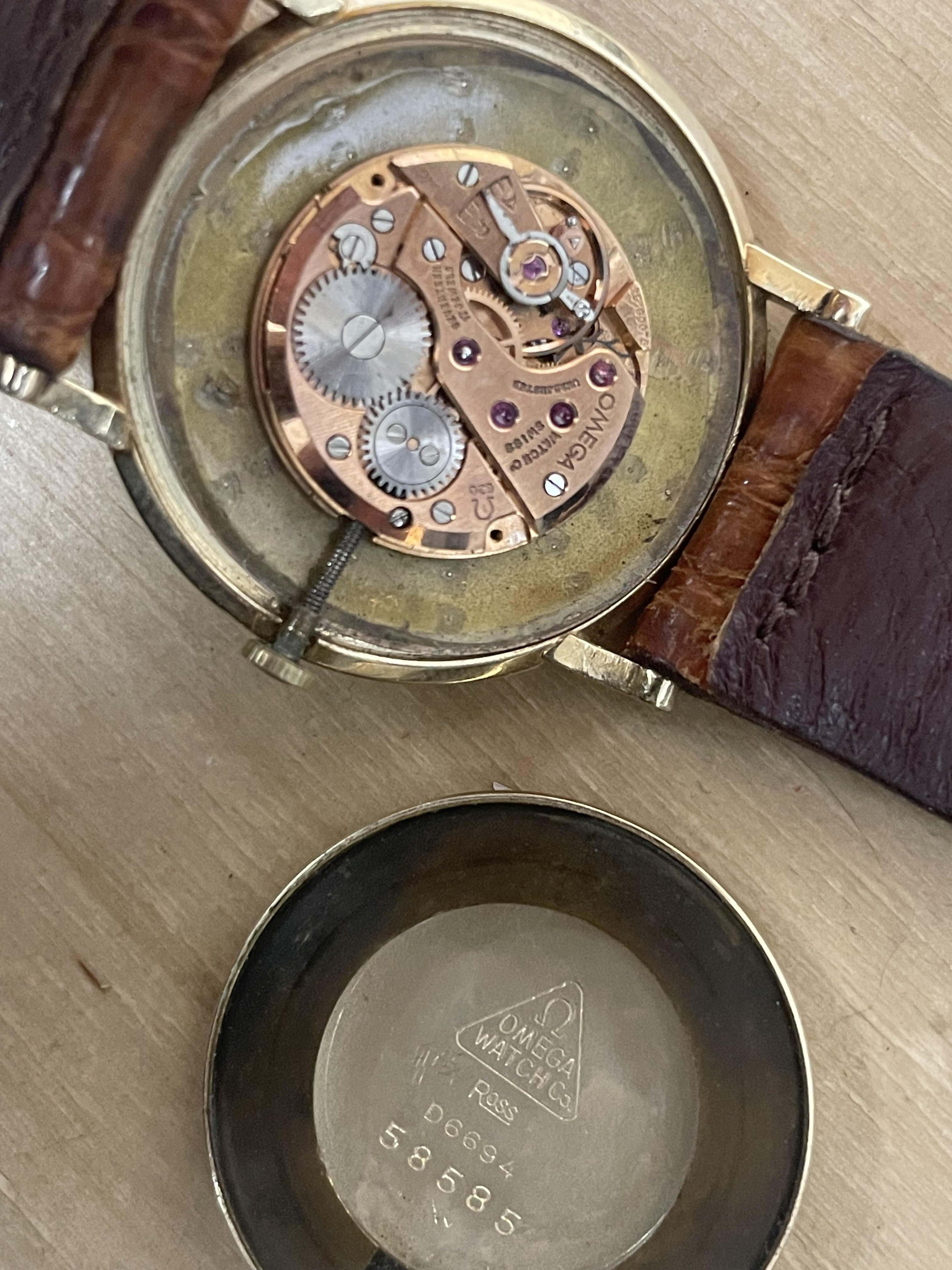 ·Hi guys, I am a complete novice to vintage watches and know absolutely nothing. My FIL gave me this watch he got from some type of estate sale or auction. On first glance, I noticed the word OMEGA looks badly written, especially the E and G look completely off and make me think its a fake, along with the apparent discoloration around the band, which I cant tell if or if not it is due to the band dye wearing off. However upon further inspection, I dont see any tell tale signs on the INSIDE that the watch is fake, and the deep scratches on the back of the case dont seem to reveal any base metal. since the marking seem to be right and the movement is copper coated.