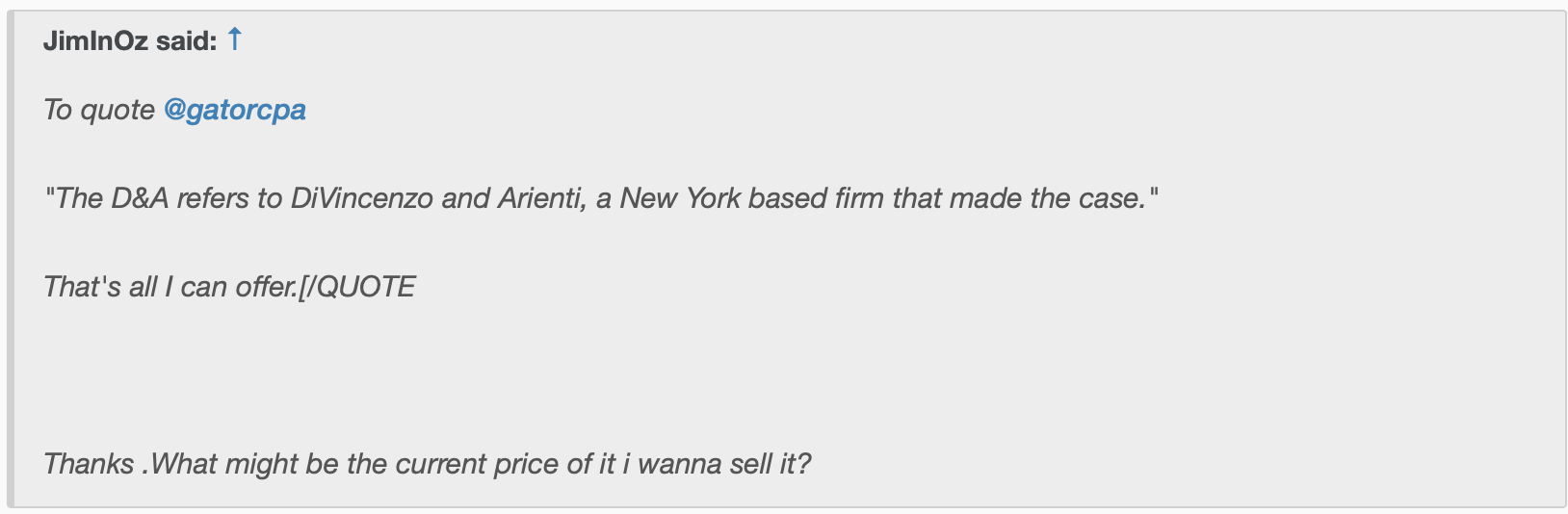 Y Posts 3 Likes 0 Yusuf000 ·Mar 31, 2024 JimInOz To quote @gatorcpa "The D&A refers to DiVincenzo and Arienti, a New York based firm that made the case." That's all I can offer.[/QUOTE Thanks .What might be the current price of it i wanna sell it?