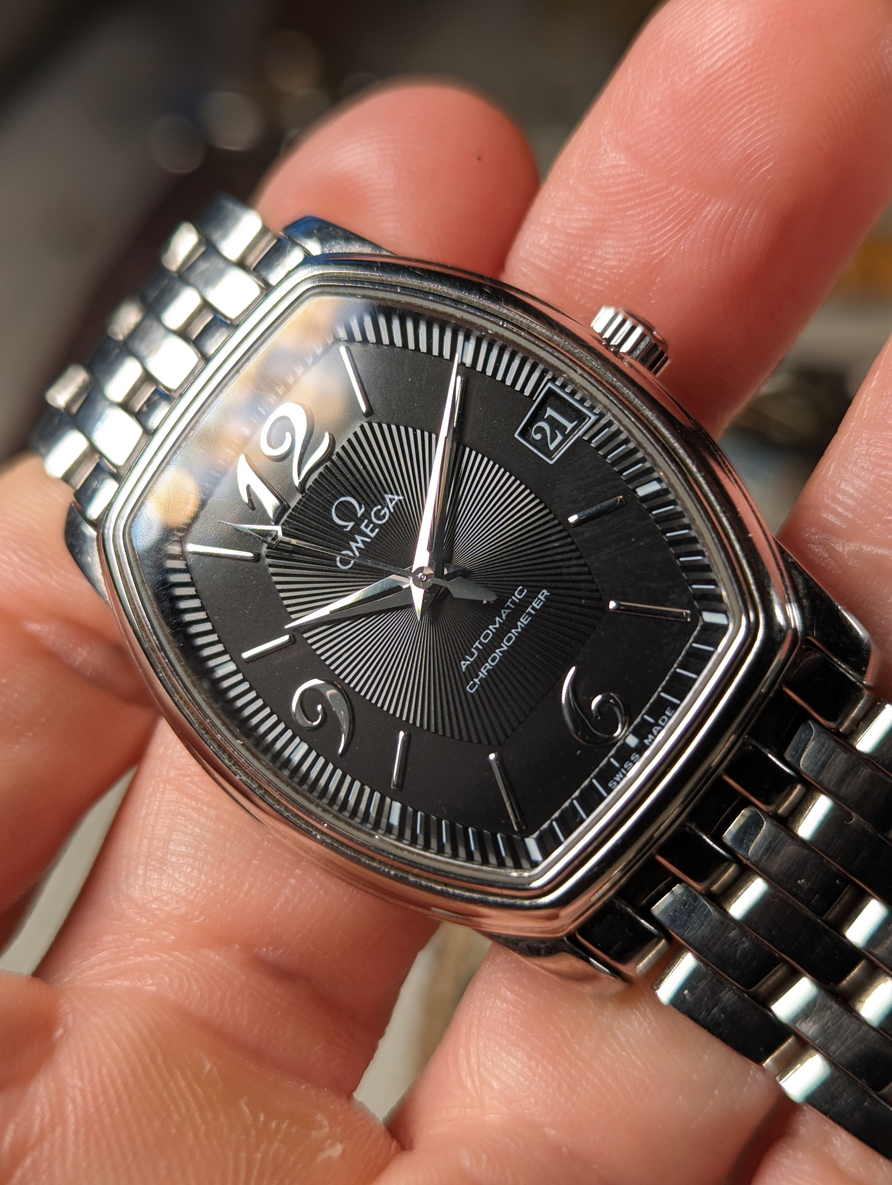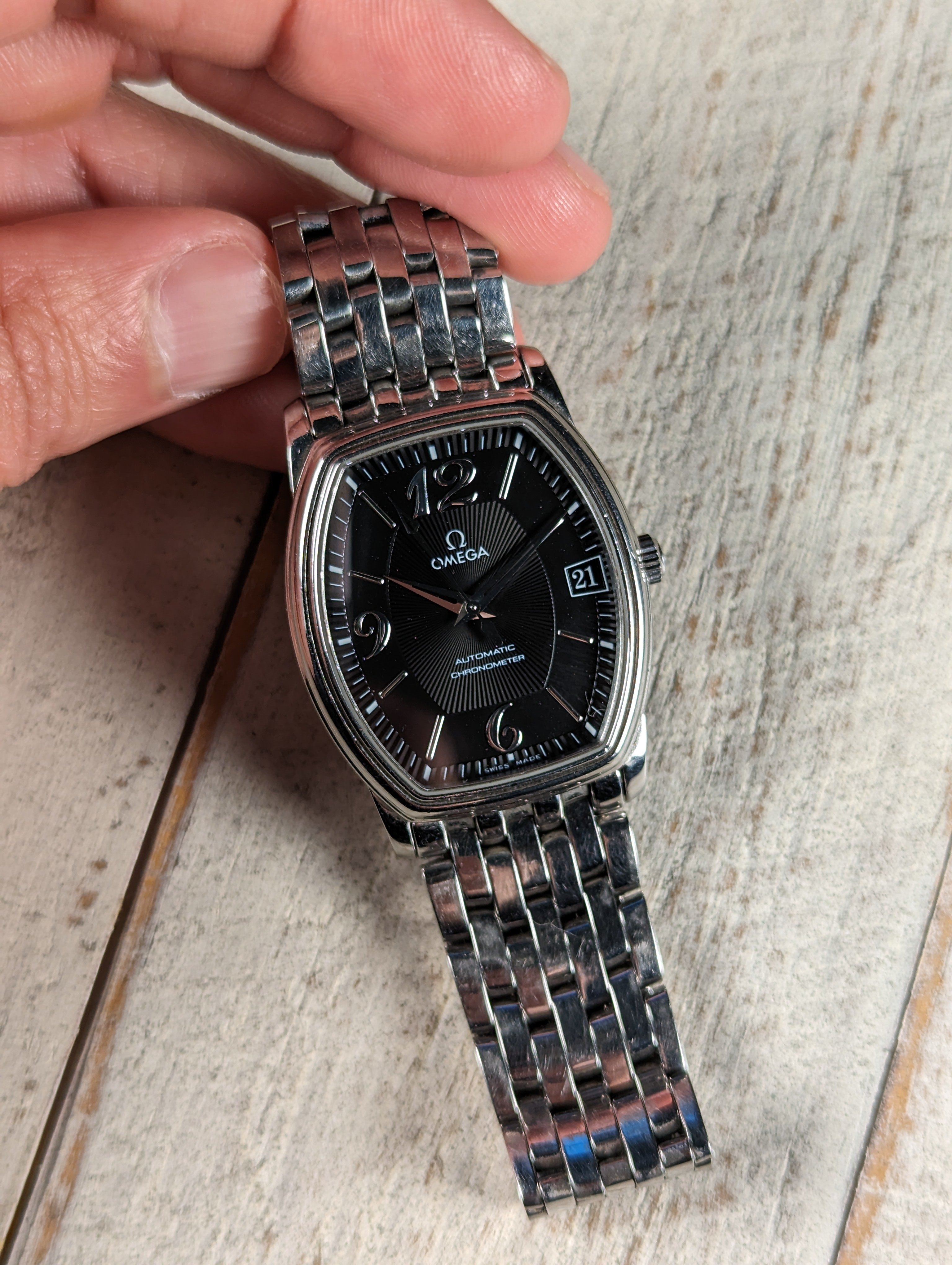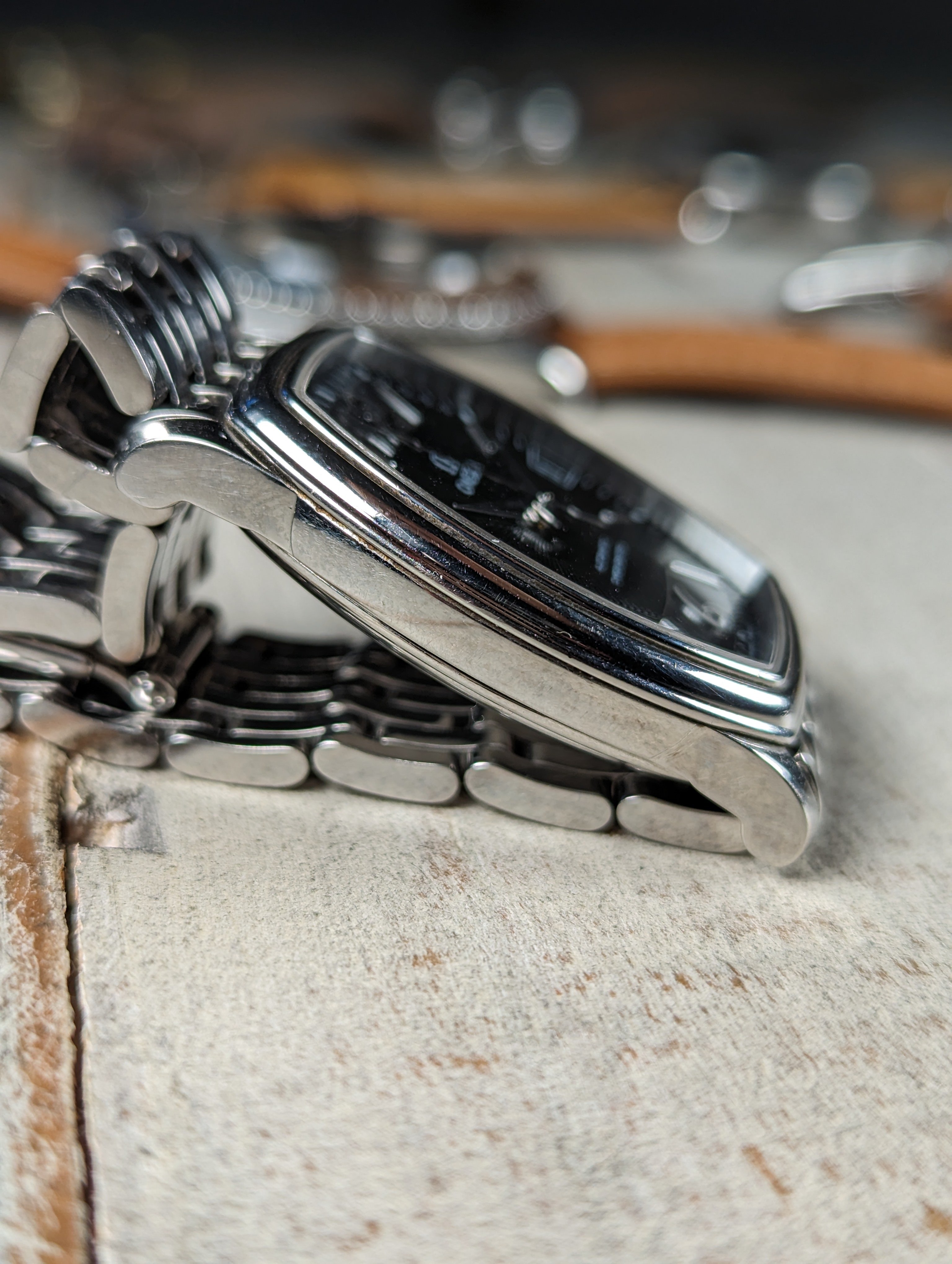 CASE: 31.2 x 35.6 mm steel, tonneau shaped case.