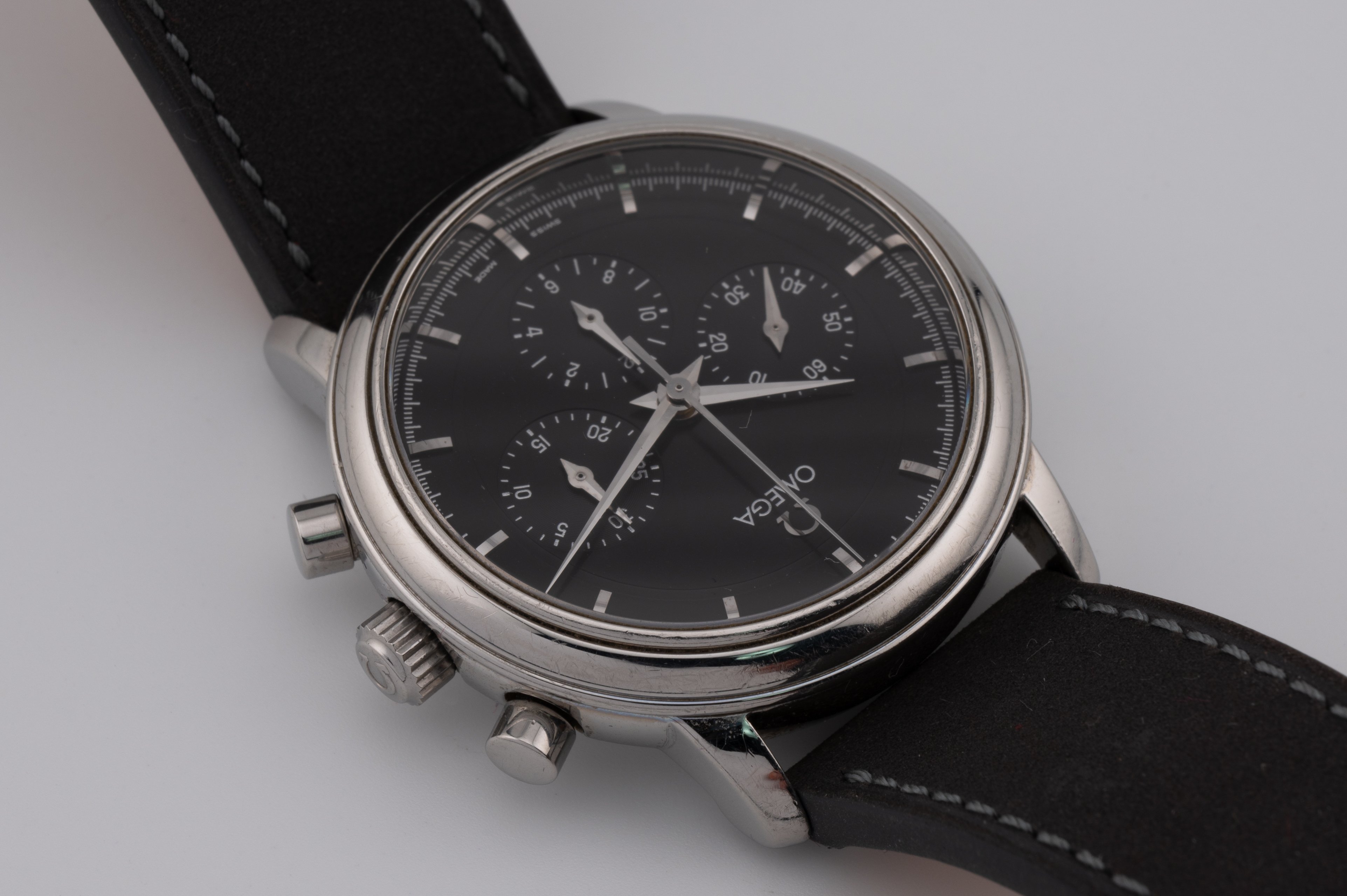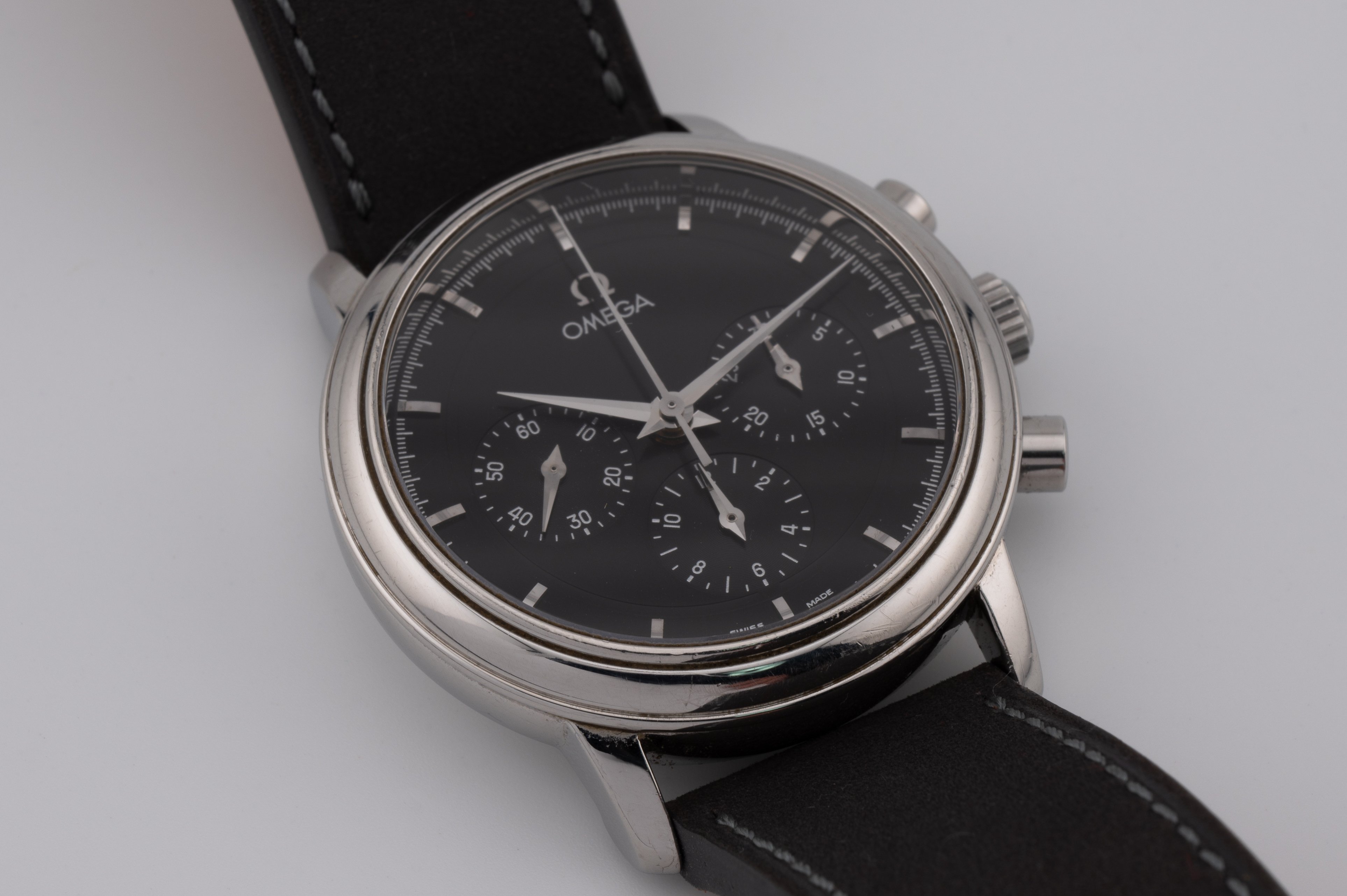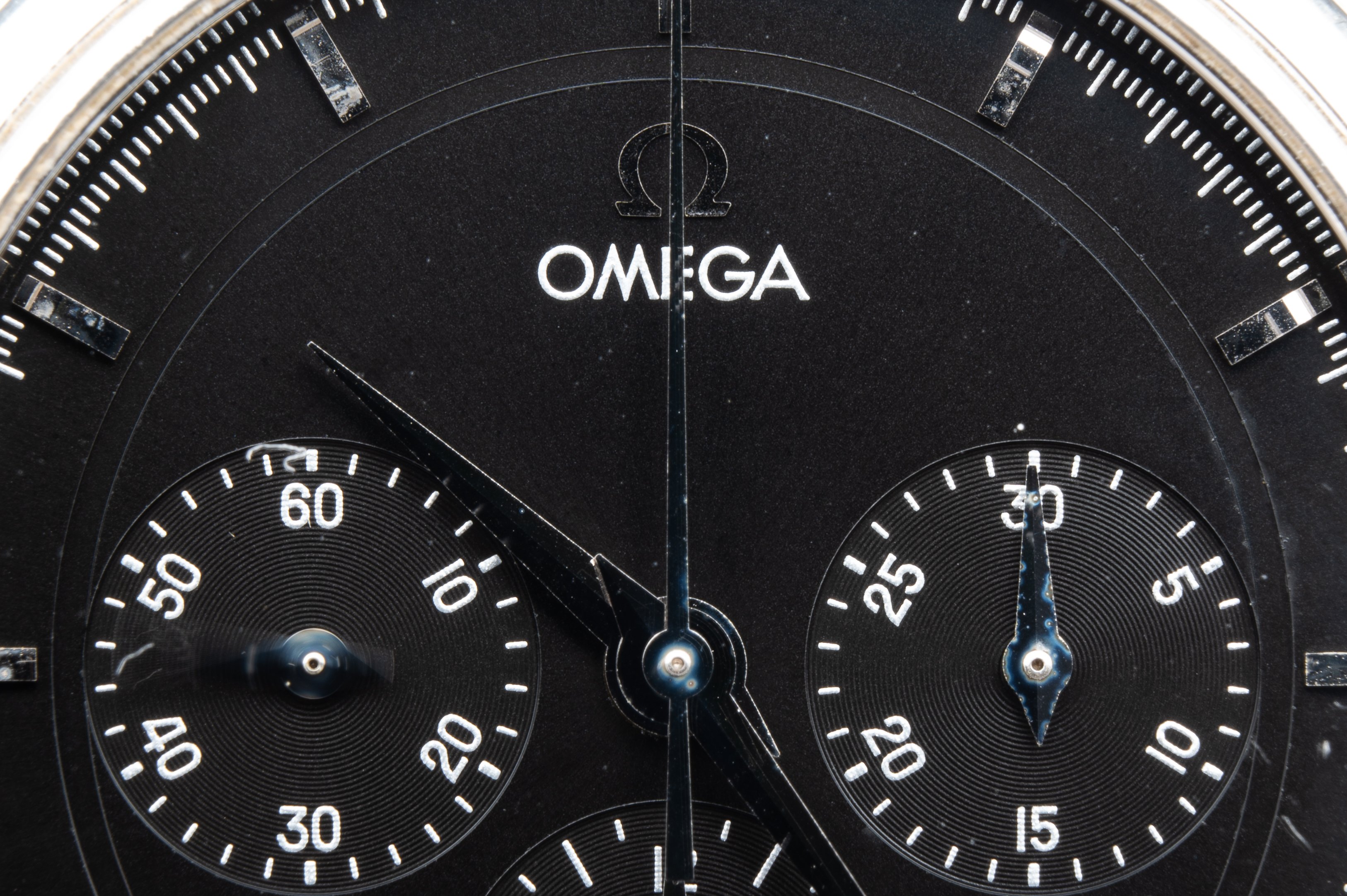 Dial and dial hardware are in very good condition. It's really hard to notice any defect under the naked eye. Using a macro lens with raking light, the hour markers reveal some patina and the hands some spotting, especially the chronograph minute hand. As these are high polish, under direct light it's hard to notice anything even with macro. Keep in mind, these are extreme close ups and the chronograph hands are only a few mm in length.