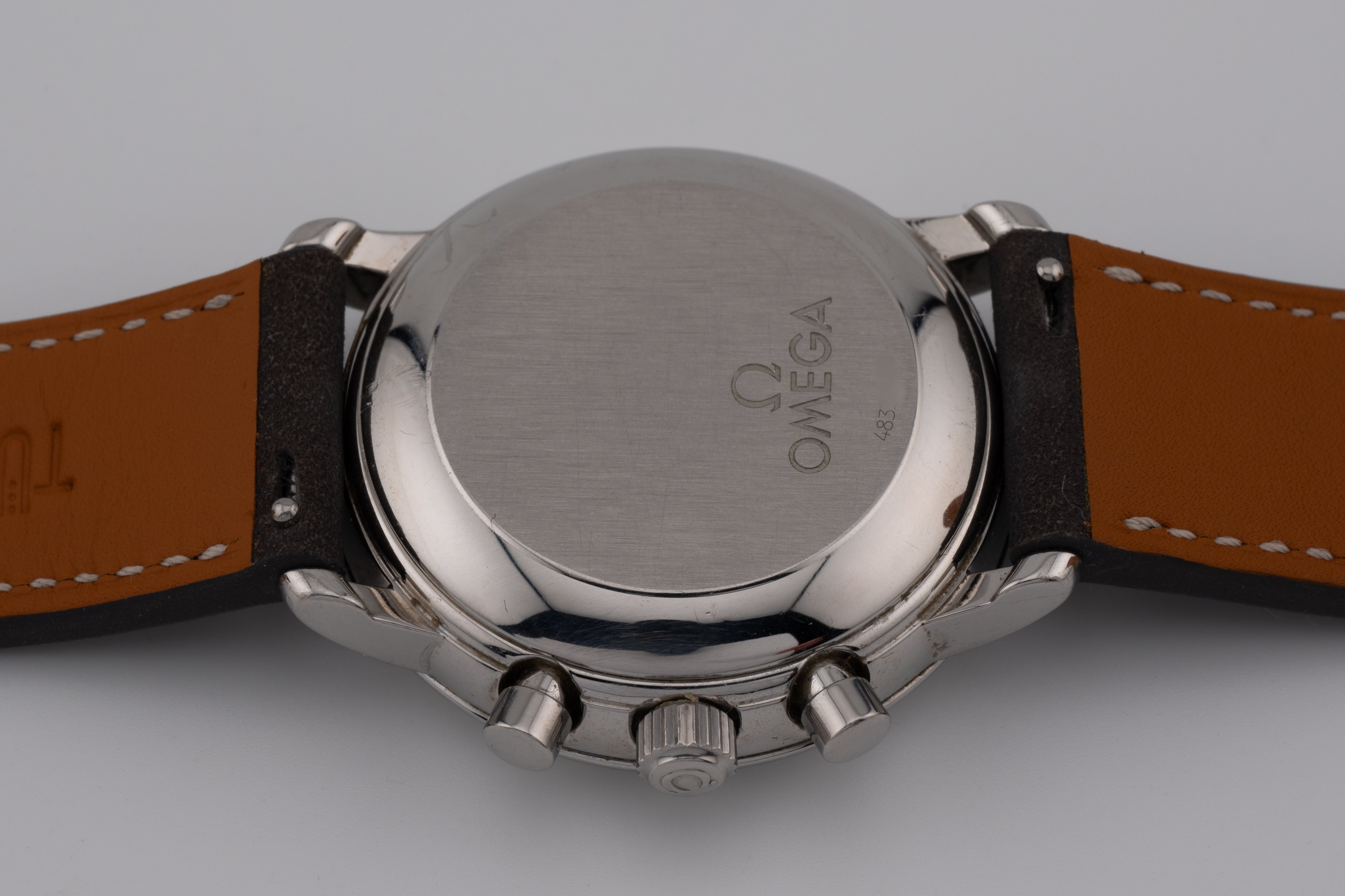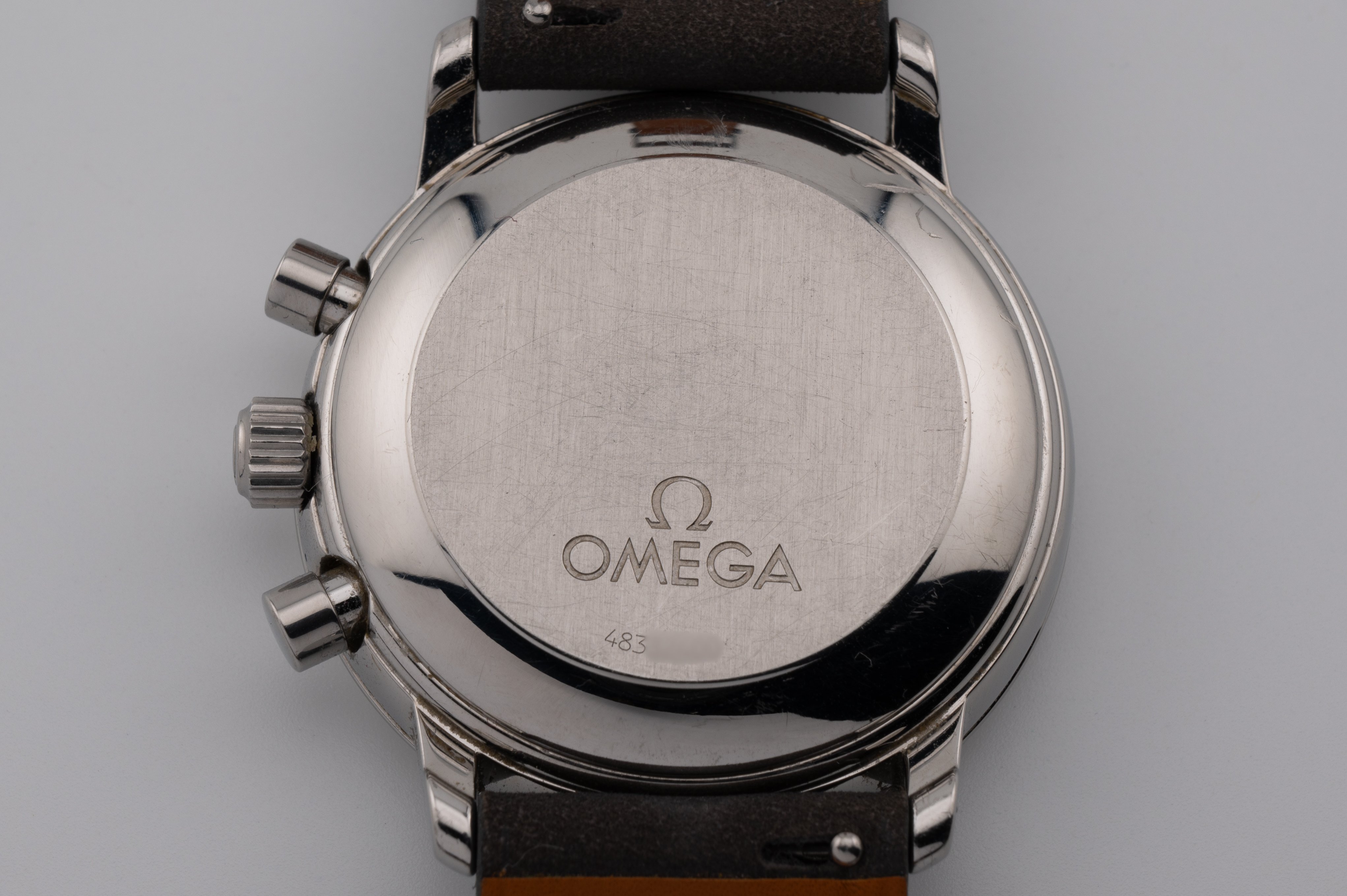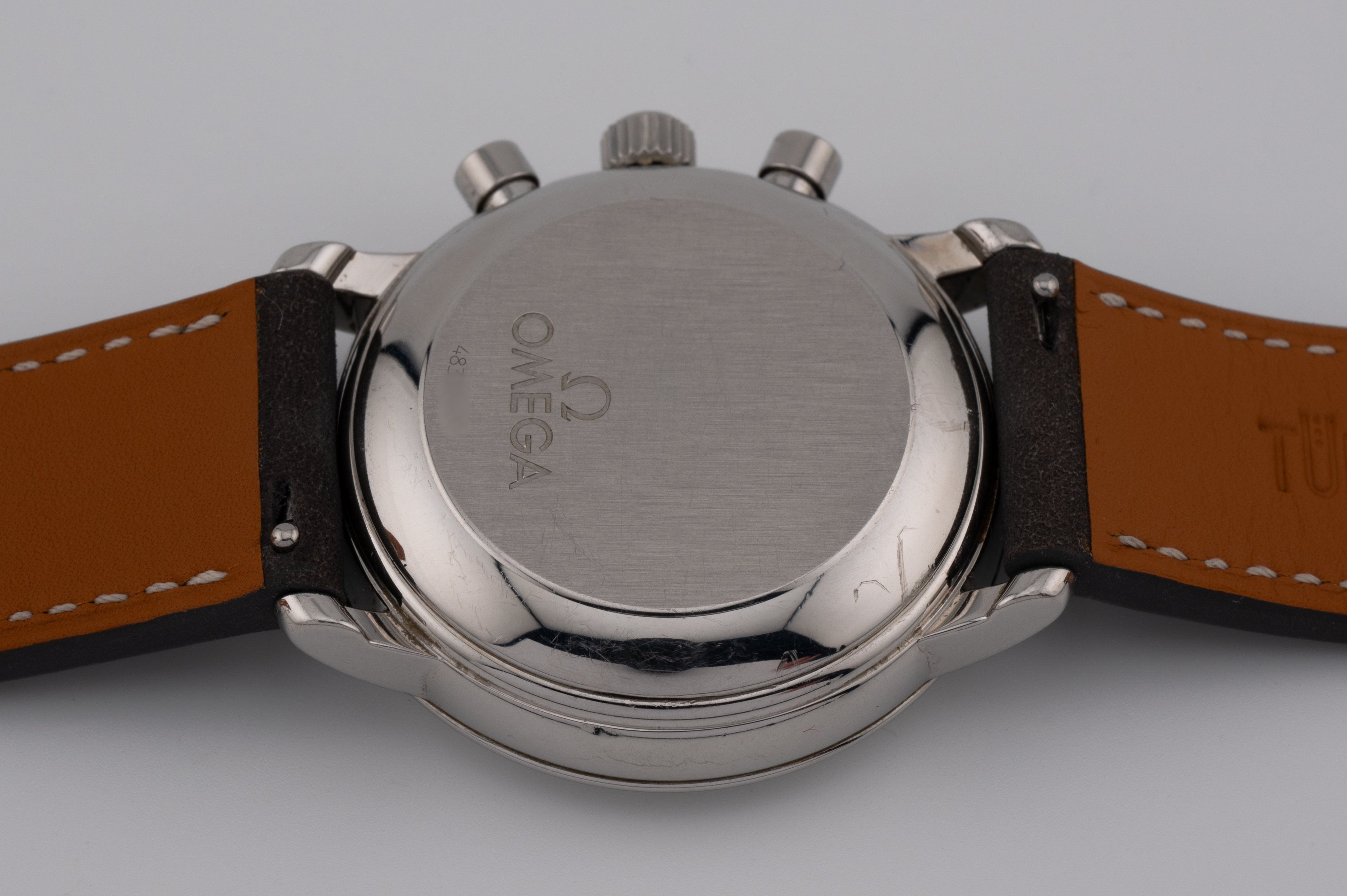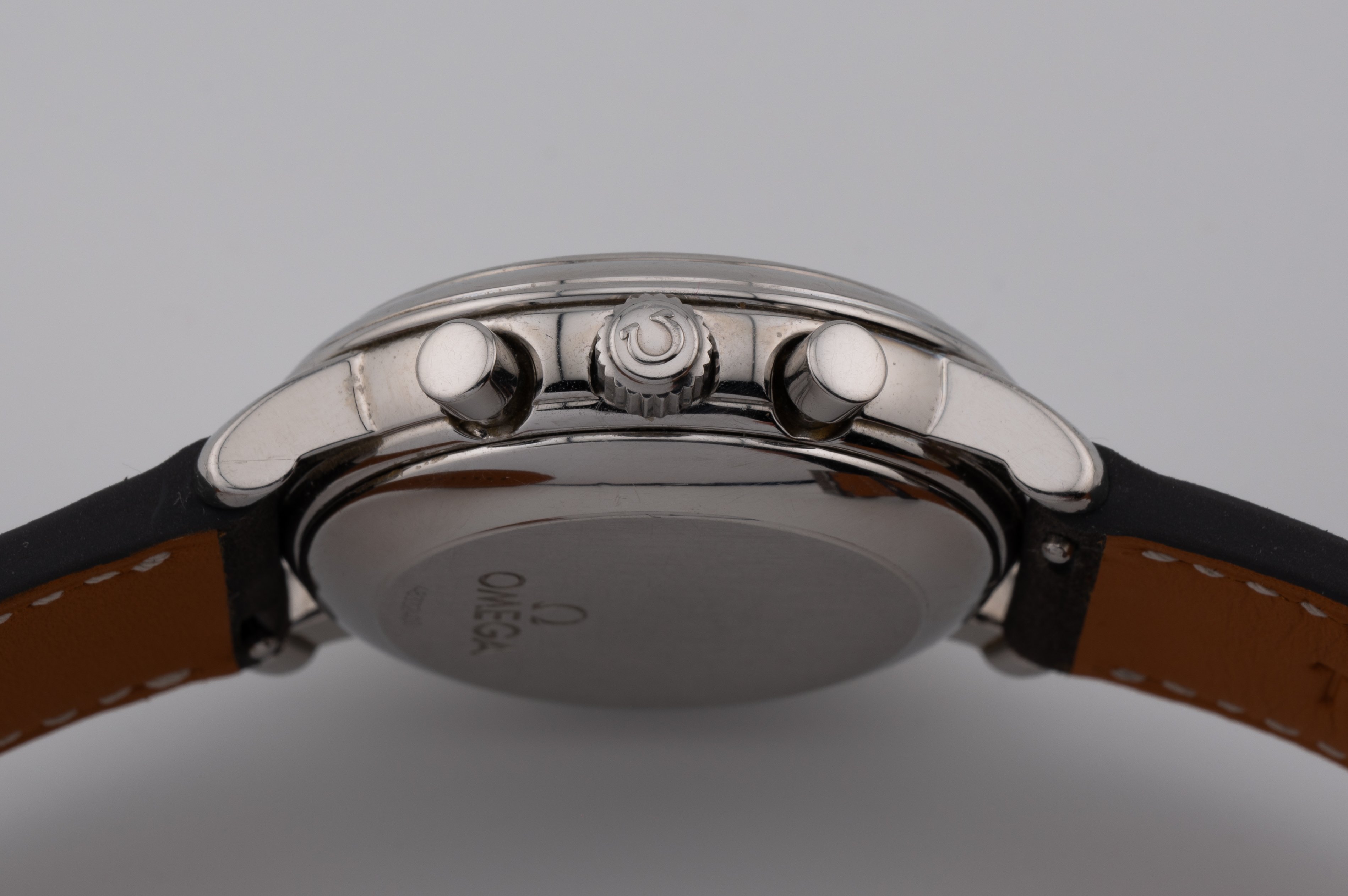 Case has scratches and marks from use. I can't notice anything major that would make the case unattractive. A good clean in the ultrasonic would definitely help though. Seeing the general condition of the case and sharp edges, I don't think it has even been polished. Crown and pushers I believe are original to the watch.
