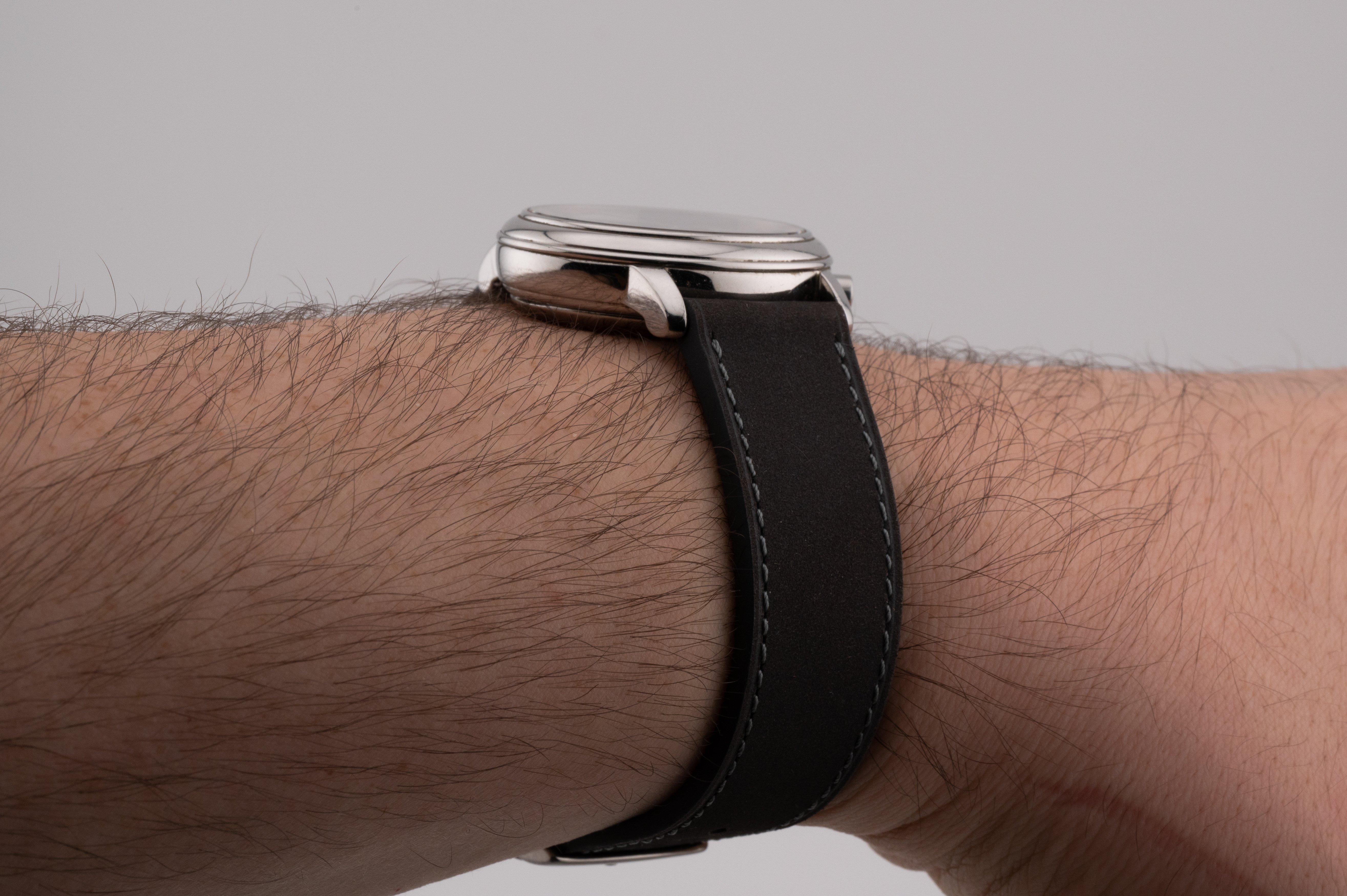 Included is an after market grey nubuck leather strap with an after market buckle, sized at 130/80mm. No box or papers, just the watch.