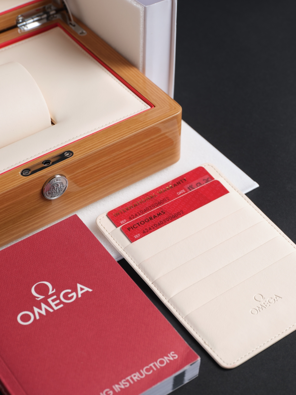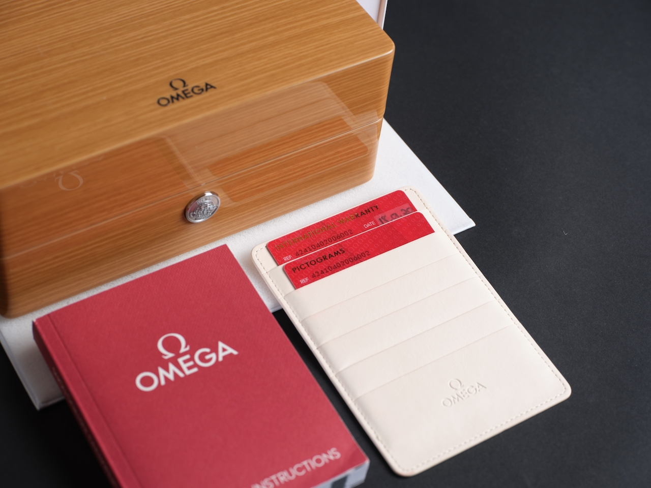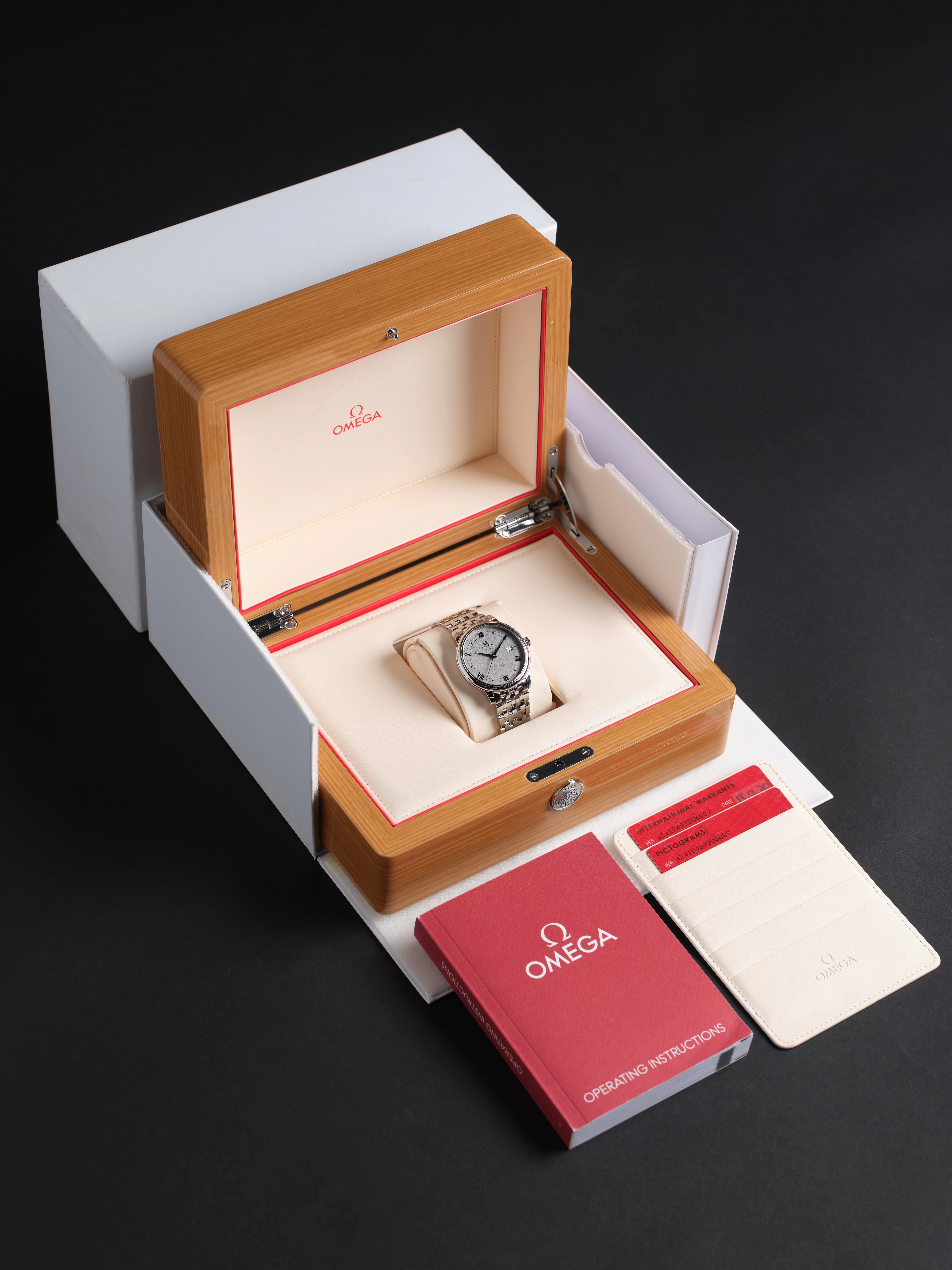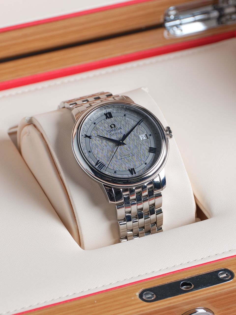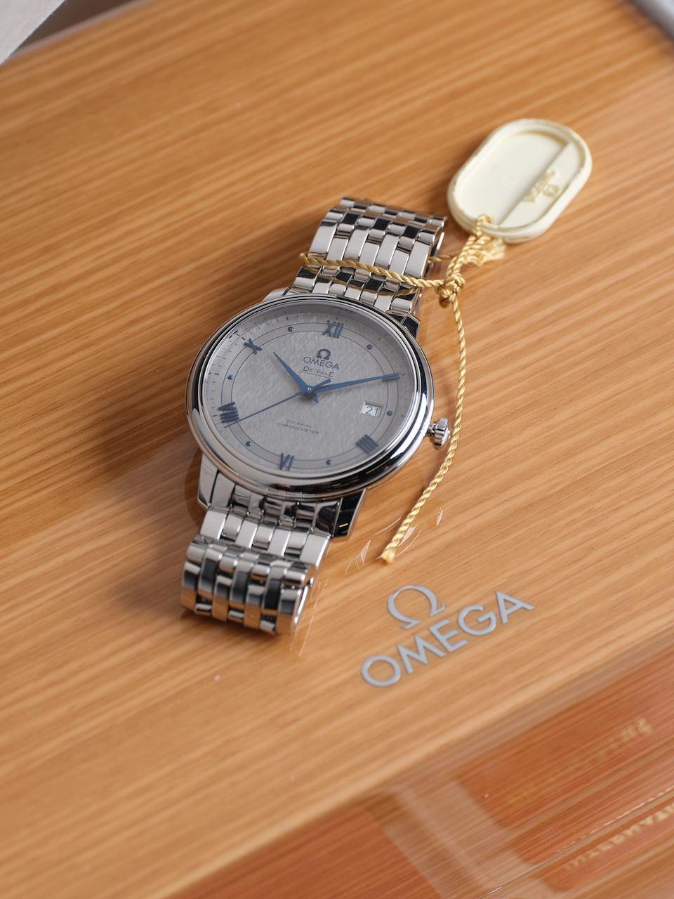 This is an Omega De Ville Prestige 39.5mm Steel Grey Dial Blue Hands 424.10.40.20.06.002. It has been sat unworn since purchase in 2020; it has only had some links removed for sizing. The extra links will be included. Otherwise has only been taken out of the box to be photographed. Please inspect photos for accurate condition - it is brand new with original stamped Omega cards (purchased from Johnsons Jewellers in Nuneaton, Warwickshire, UK), original box, operating instructions booklet, and outer protective box. For transparency, this watch was bought alongside a new Rolex Sea-Dweller upon its release, but has sat dormant in favour of other watches being worn (including said Sea-Dweller).