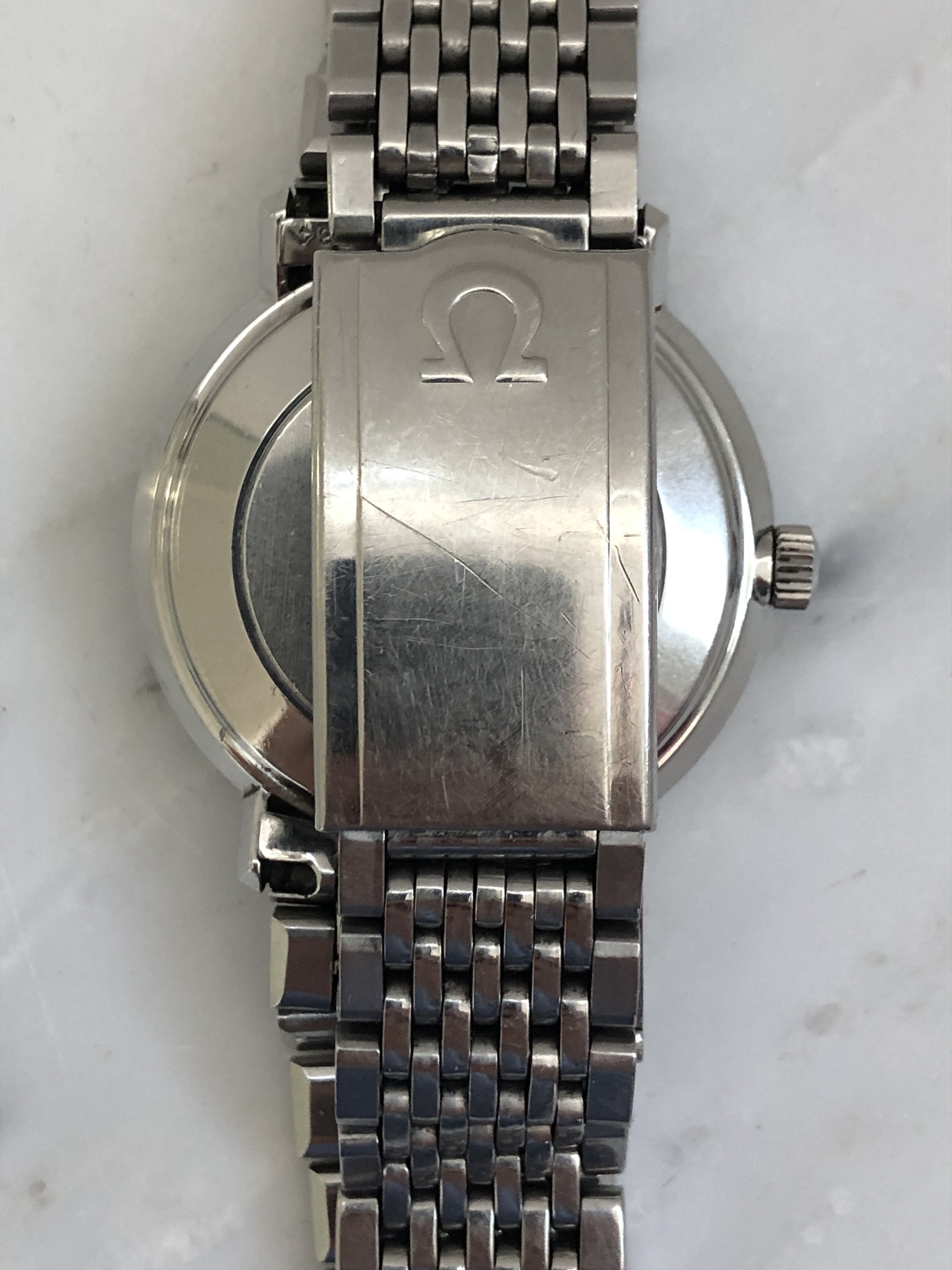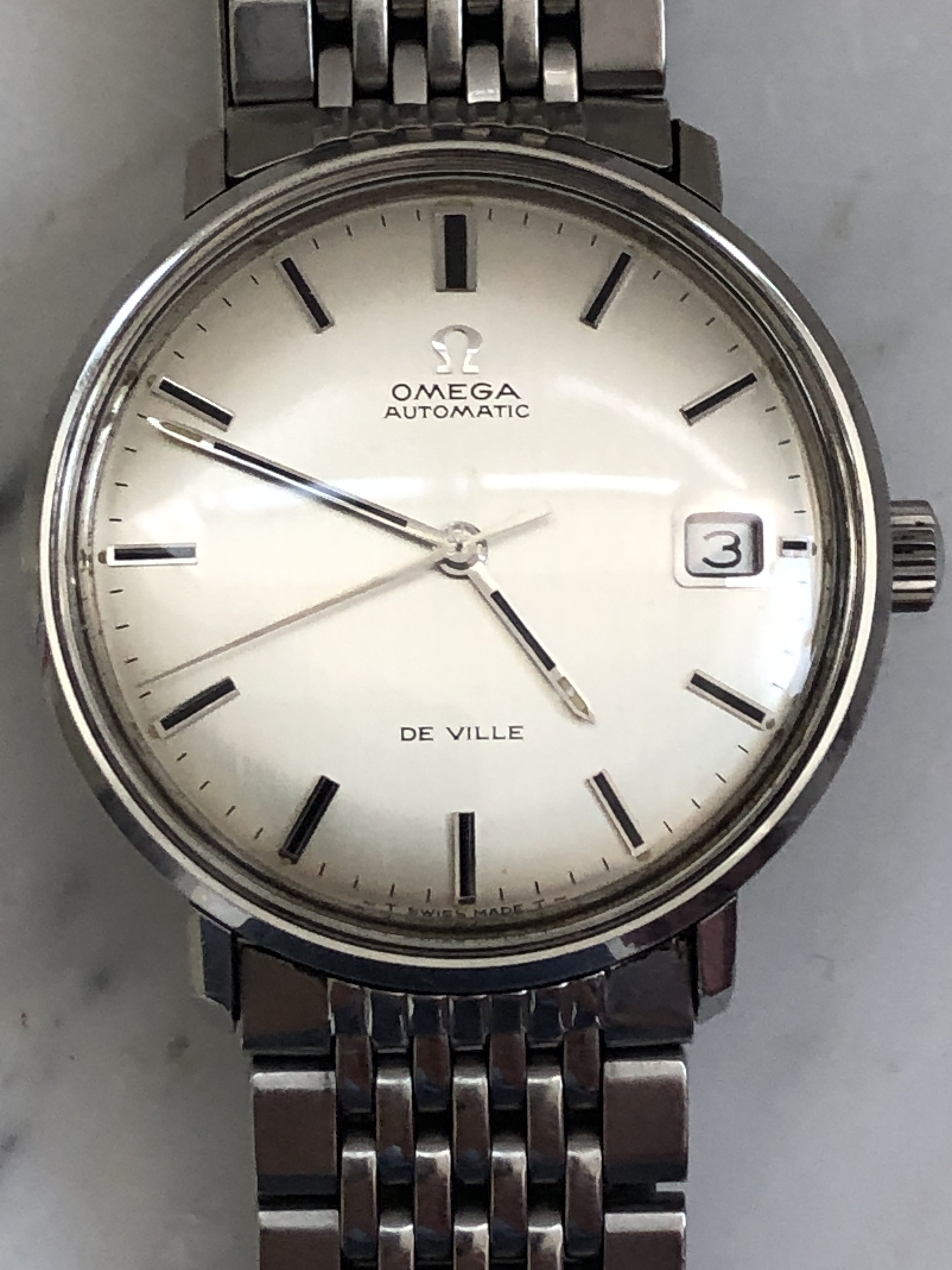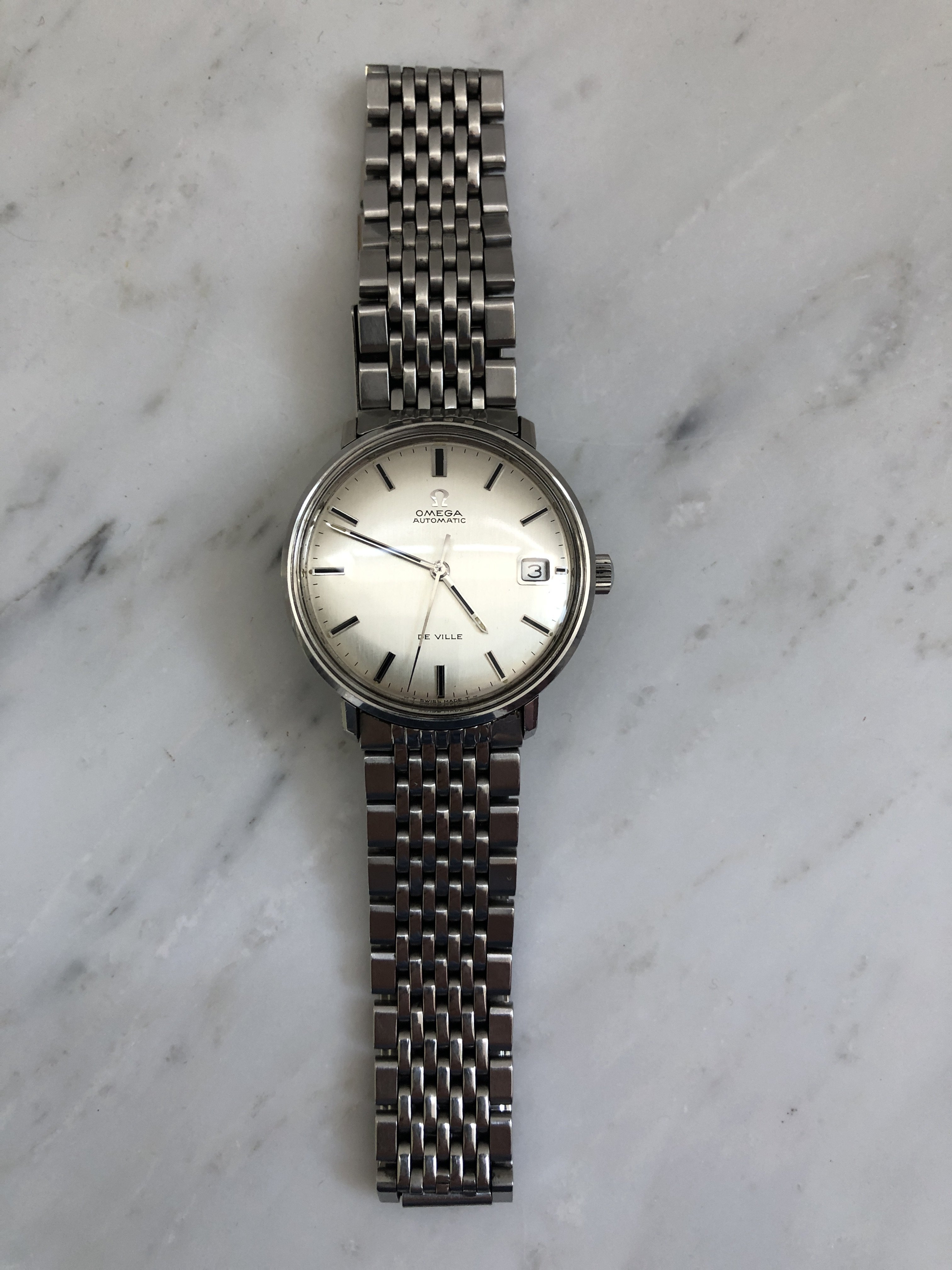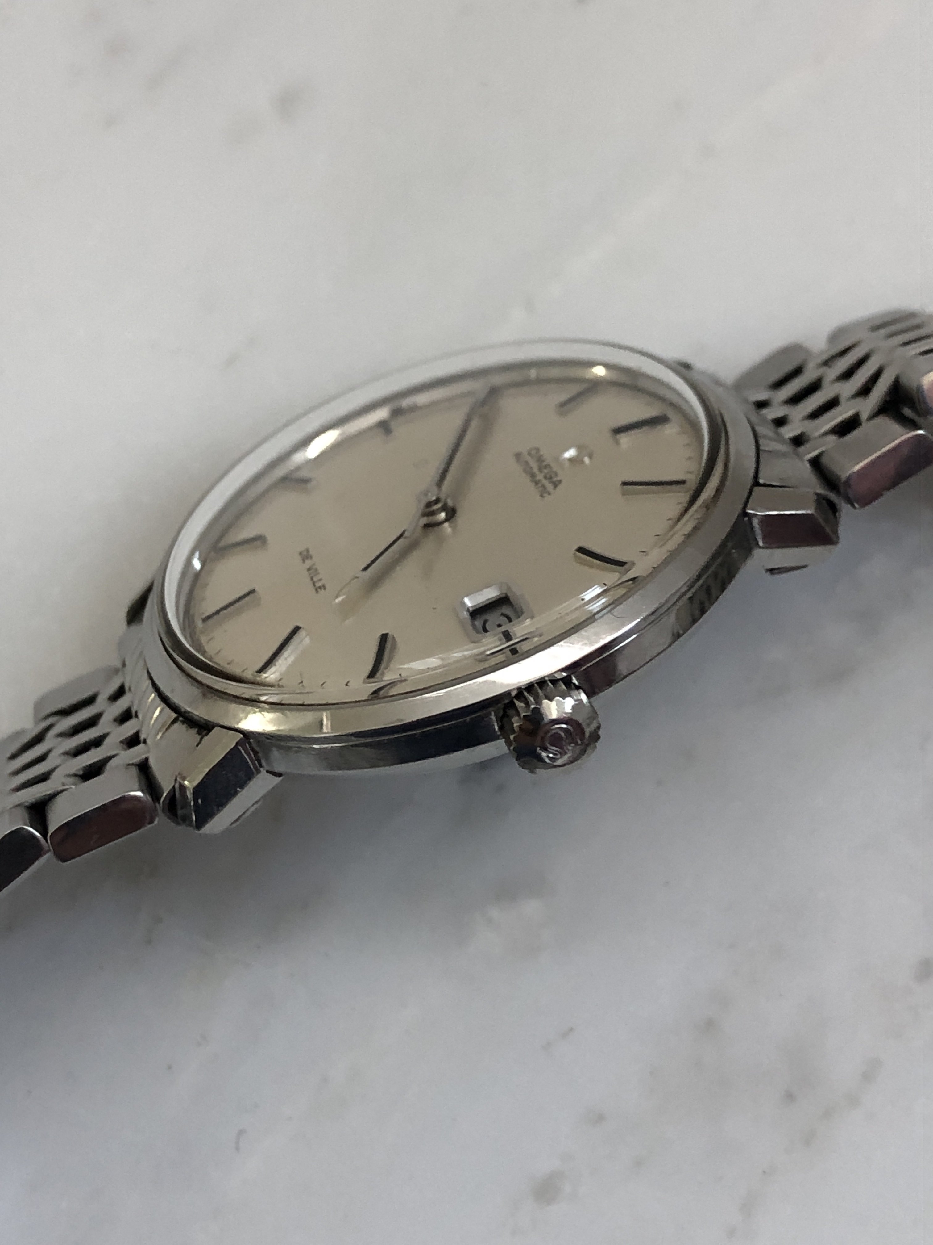 ·Omega stainless steel De Ville automatic with date ref. 166.033. Silverish dial with applied indexes and logo, pencil hands and date window. Signed acrylic crystal. Omega rice link bracelet with deployment clasp. All functions work as they should, including the quickset date.