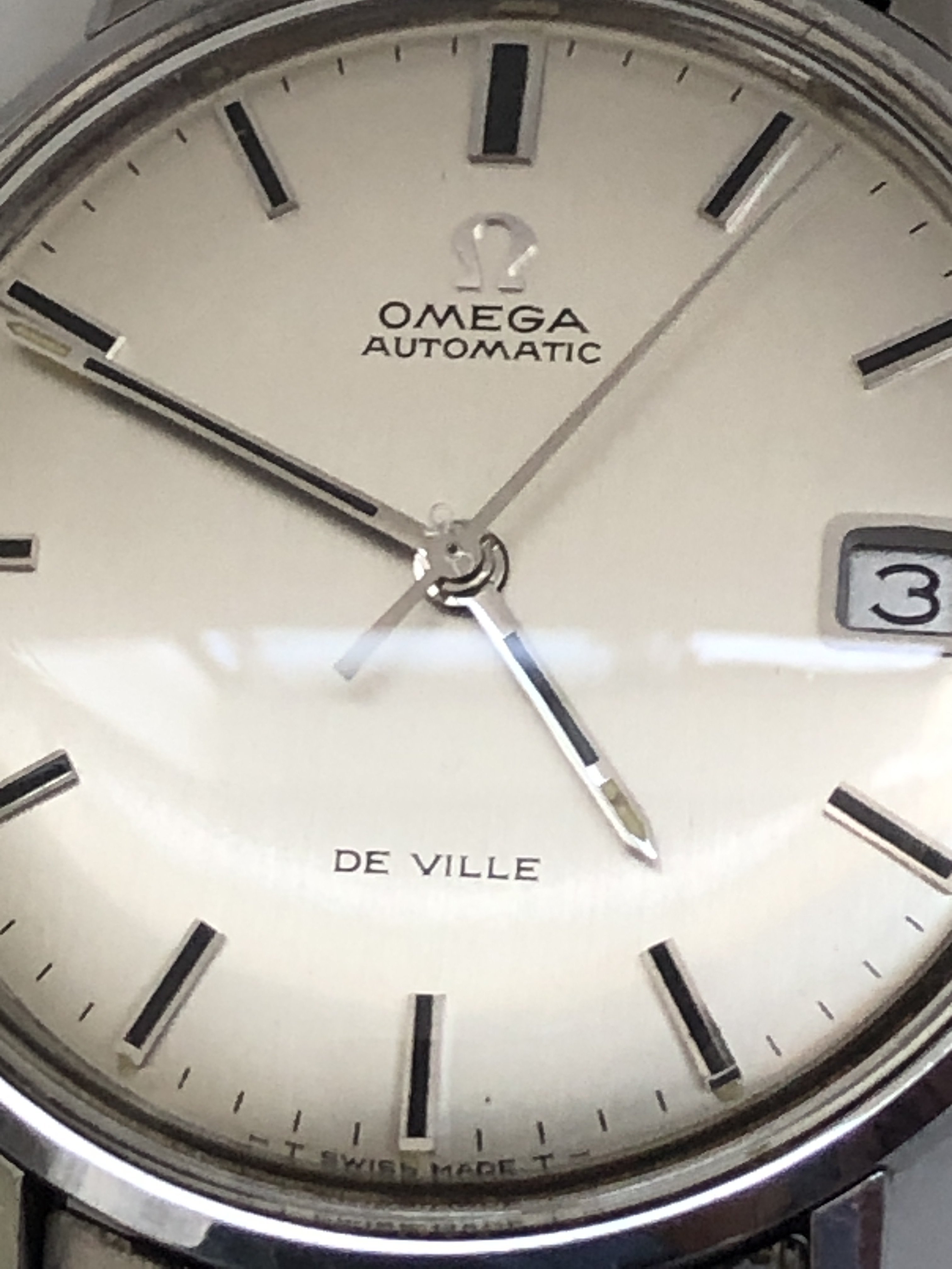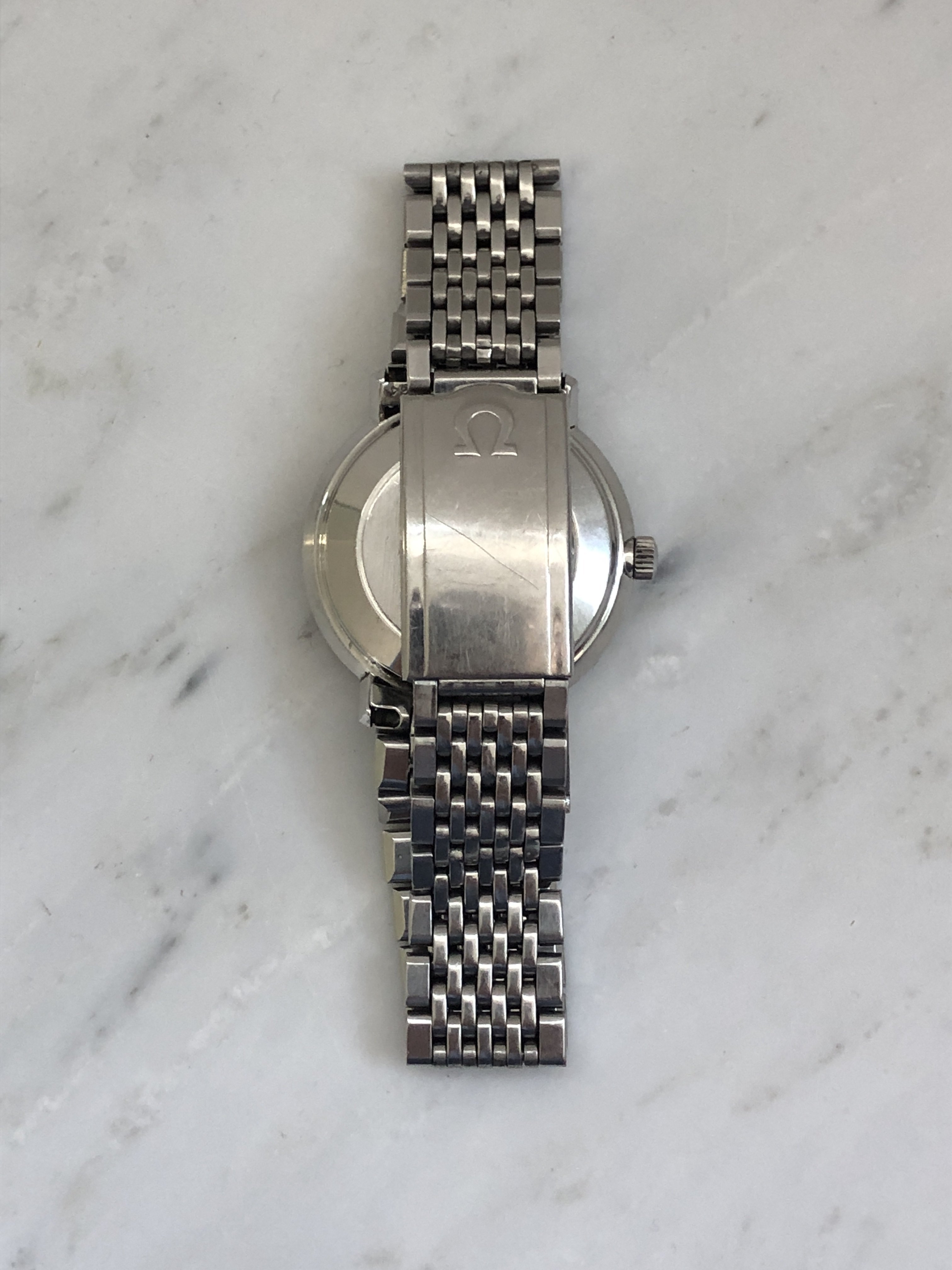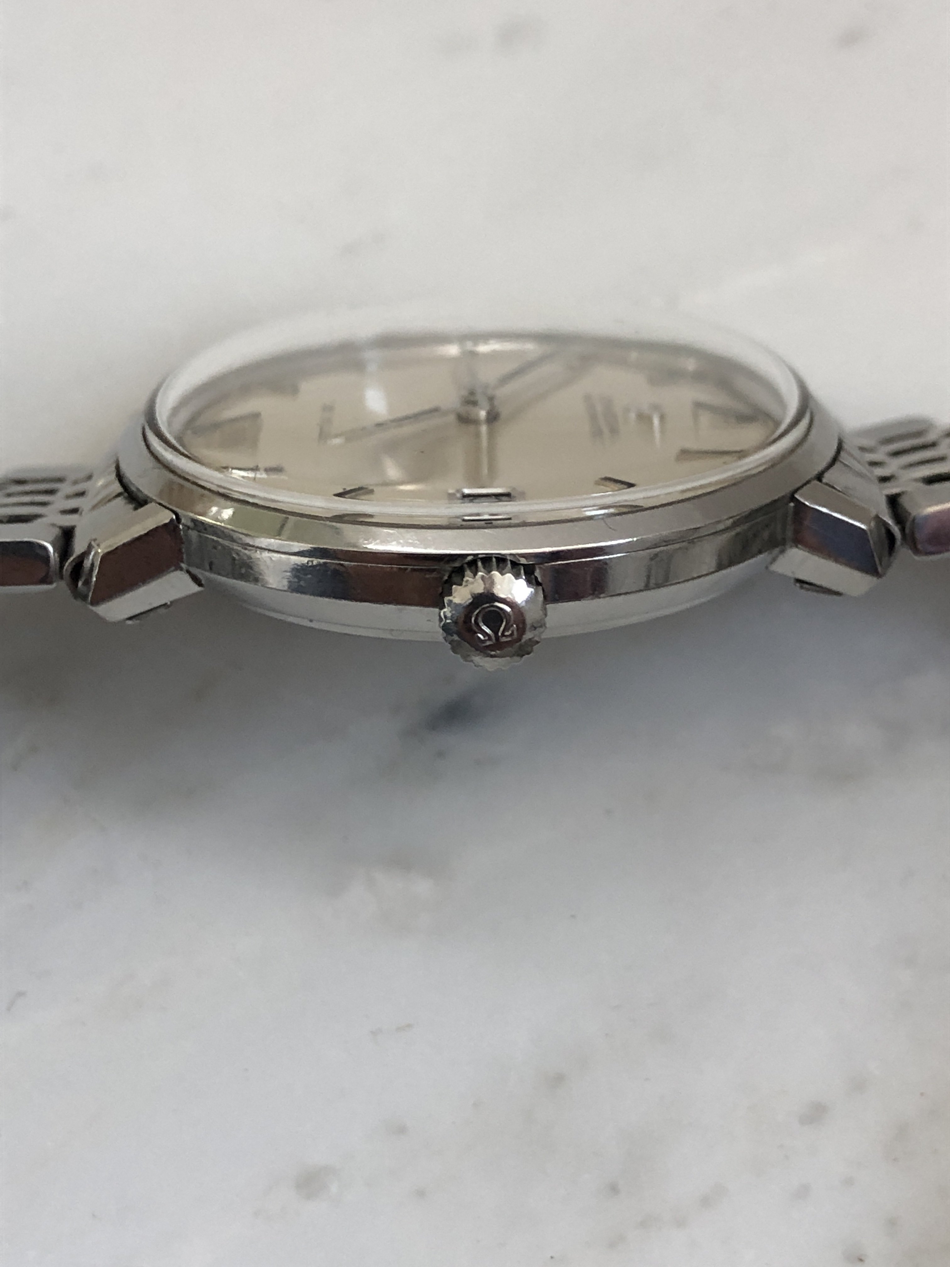 ·Omega stainless steel De Ville automatic with date ref. 166.033. Silverish dial with applied indexes and logo, pencil hands and date window. Signed acrylic crystal. Omega rice link bracelet with deployment clasp. All functions work as they should, including the quickset date.