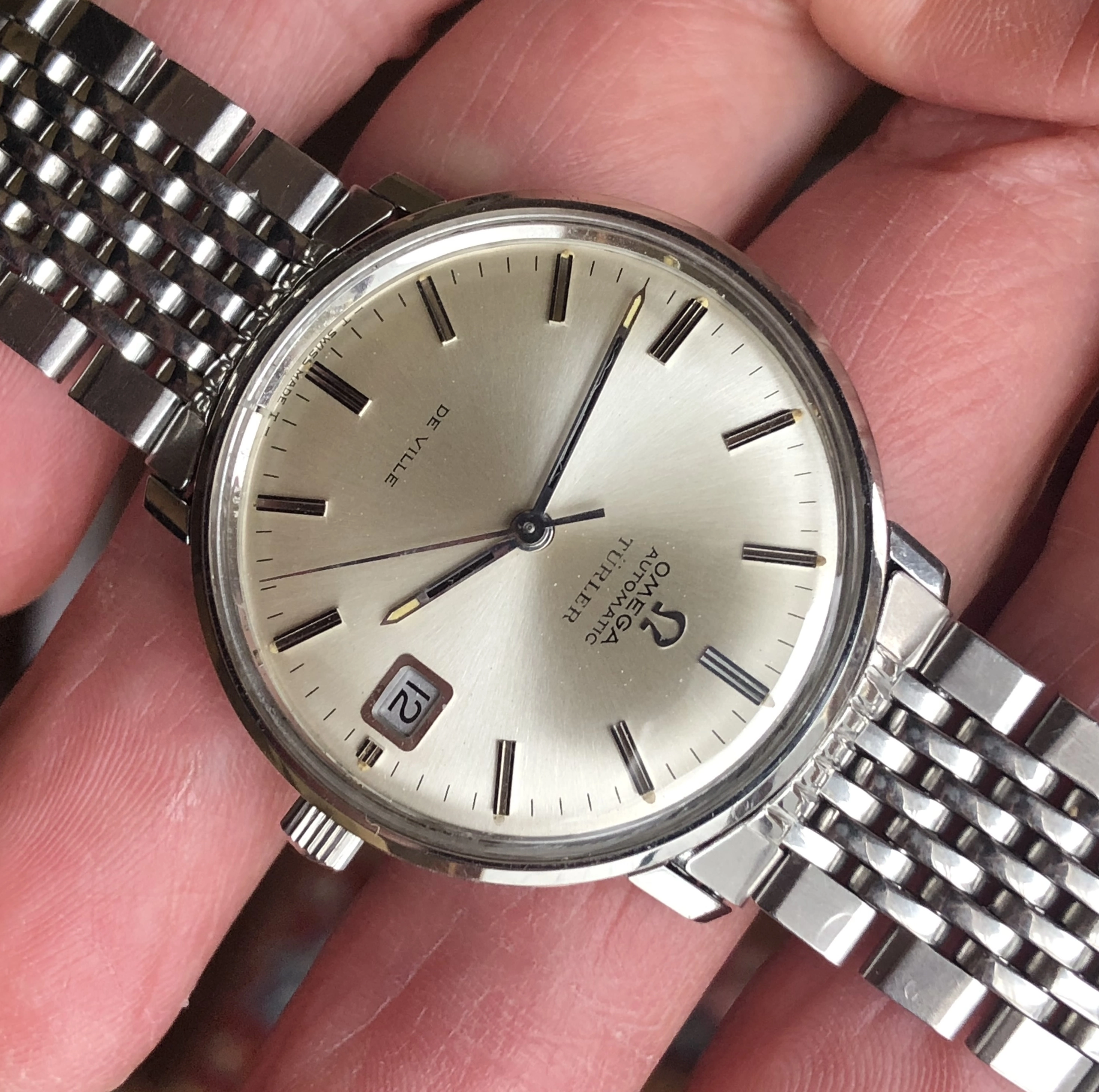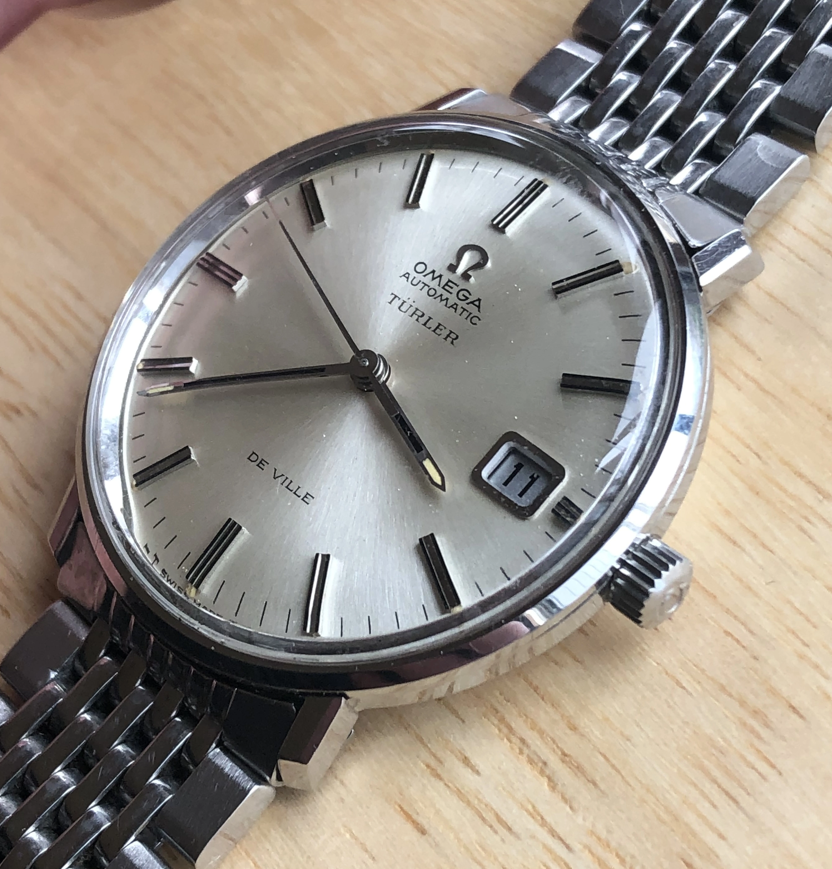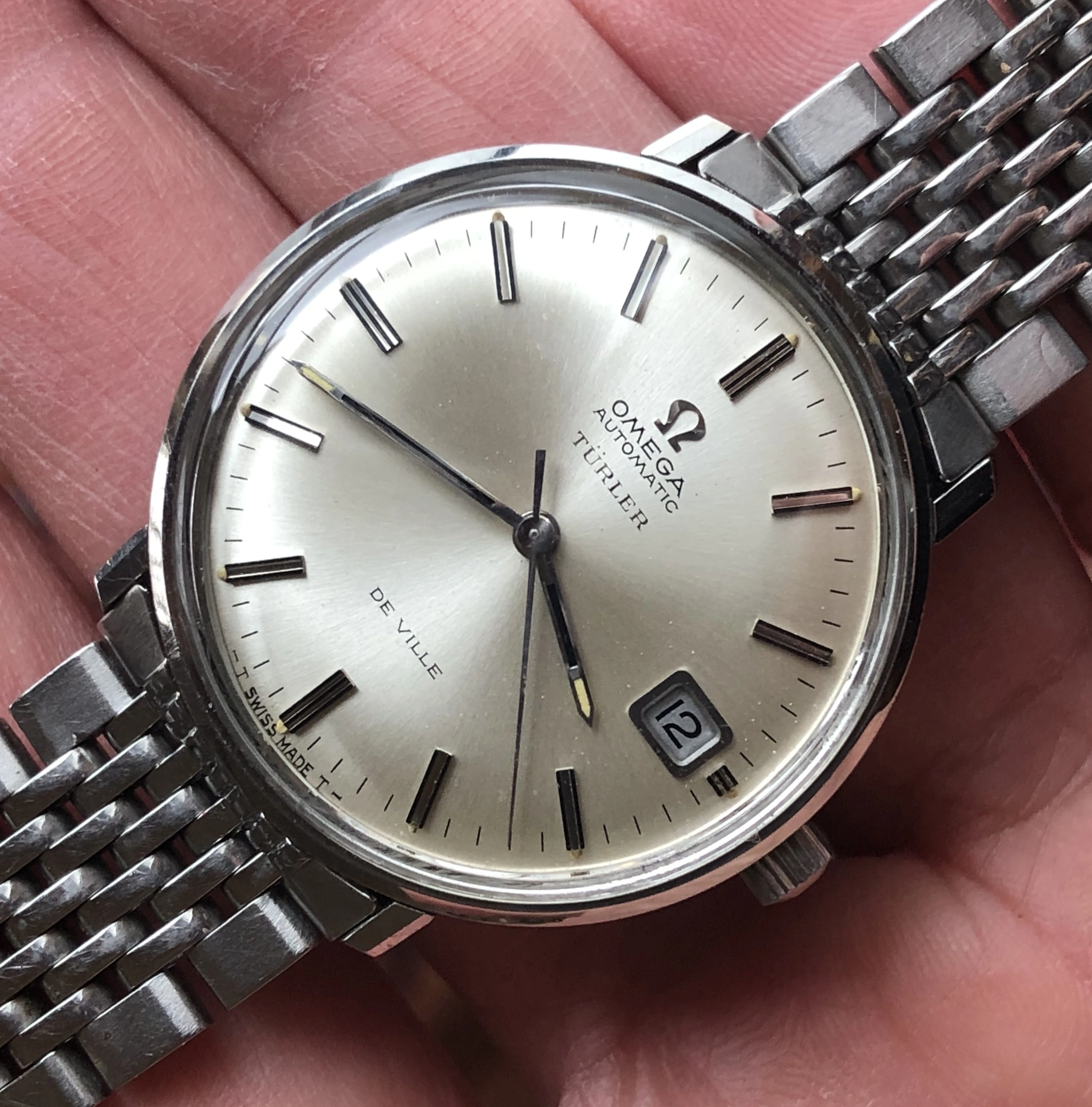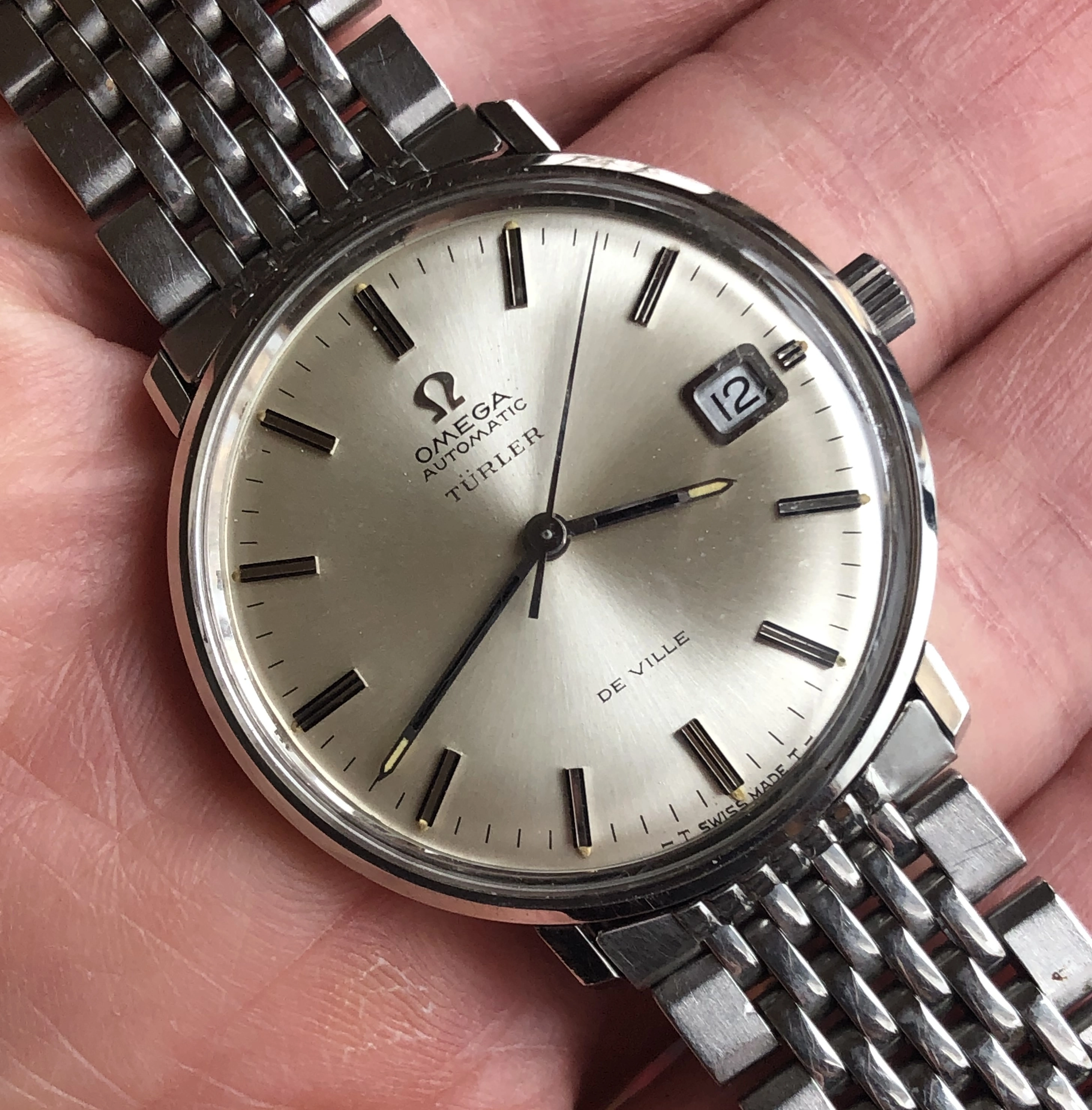 ·Here is a very nice 1960s Omega DeVille double-signed by the retailer Türler. It's in very fine condition with a clean dial and sharp case. The sunburst silver dial has applied markers with black inlay and beautifully aged lume dots, and the hands match perfectly. The 1037 beads of rice bracelet with 564 end-links is long (22 links) and tight. The watch has not been serviced in my possession but is operating correctly, including the quick-set date which advances when the crown is pulled out all the way. The watch has a one-piece case so unfortunately, I am not able to provide internal photos. Beautiful watch, with no significant condition issues to note.