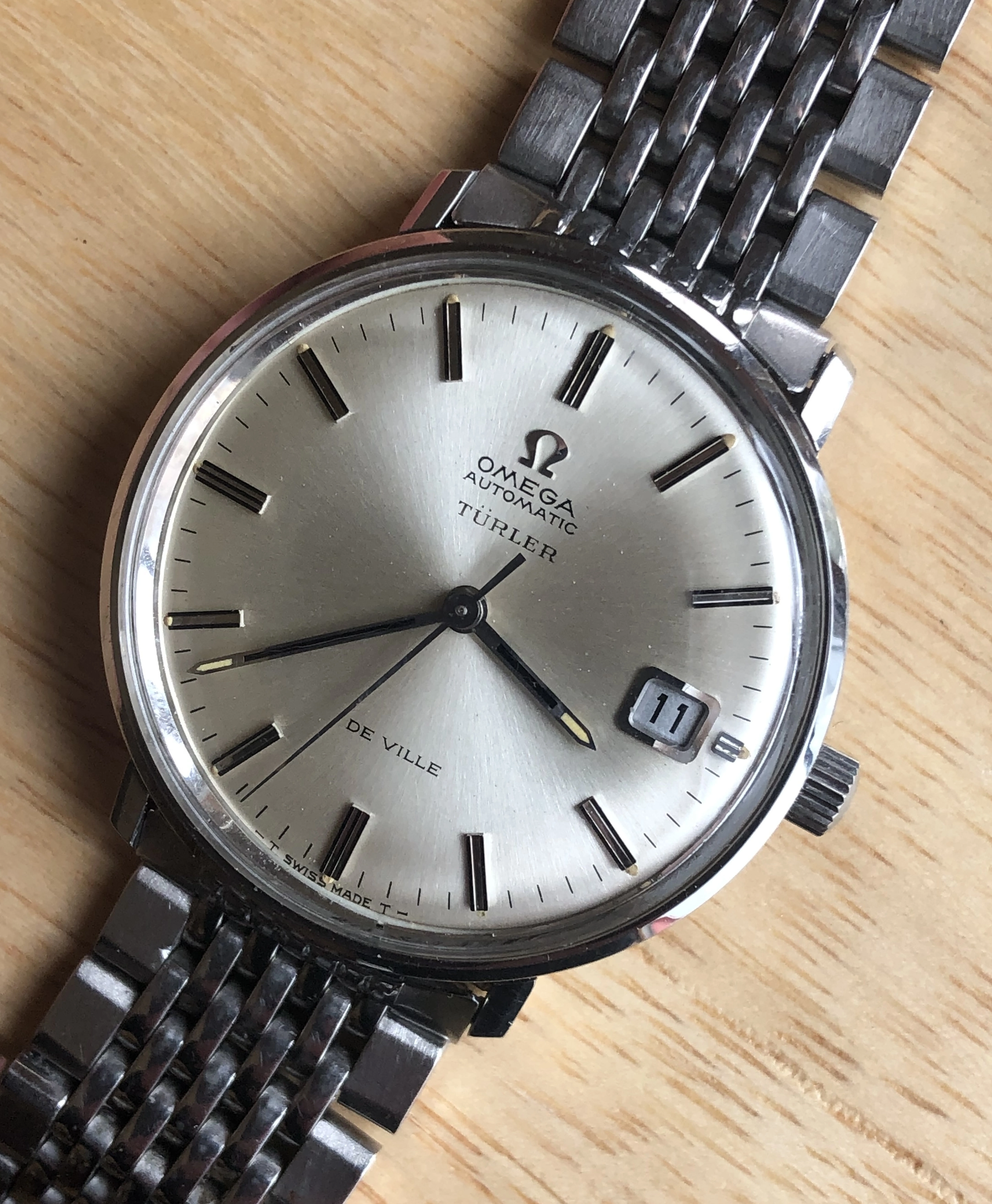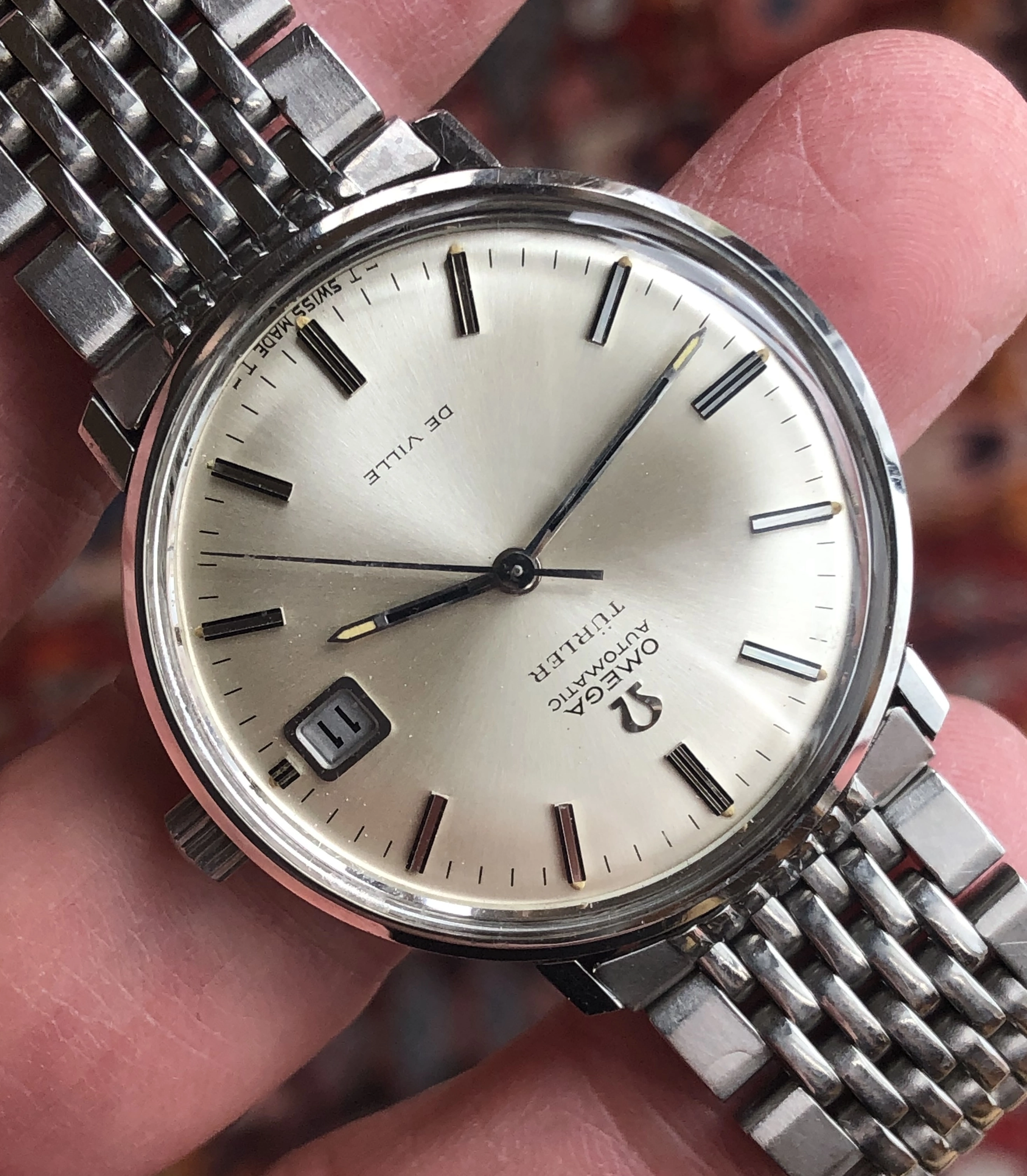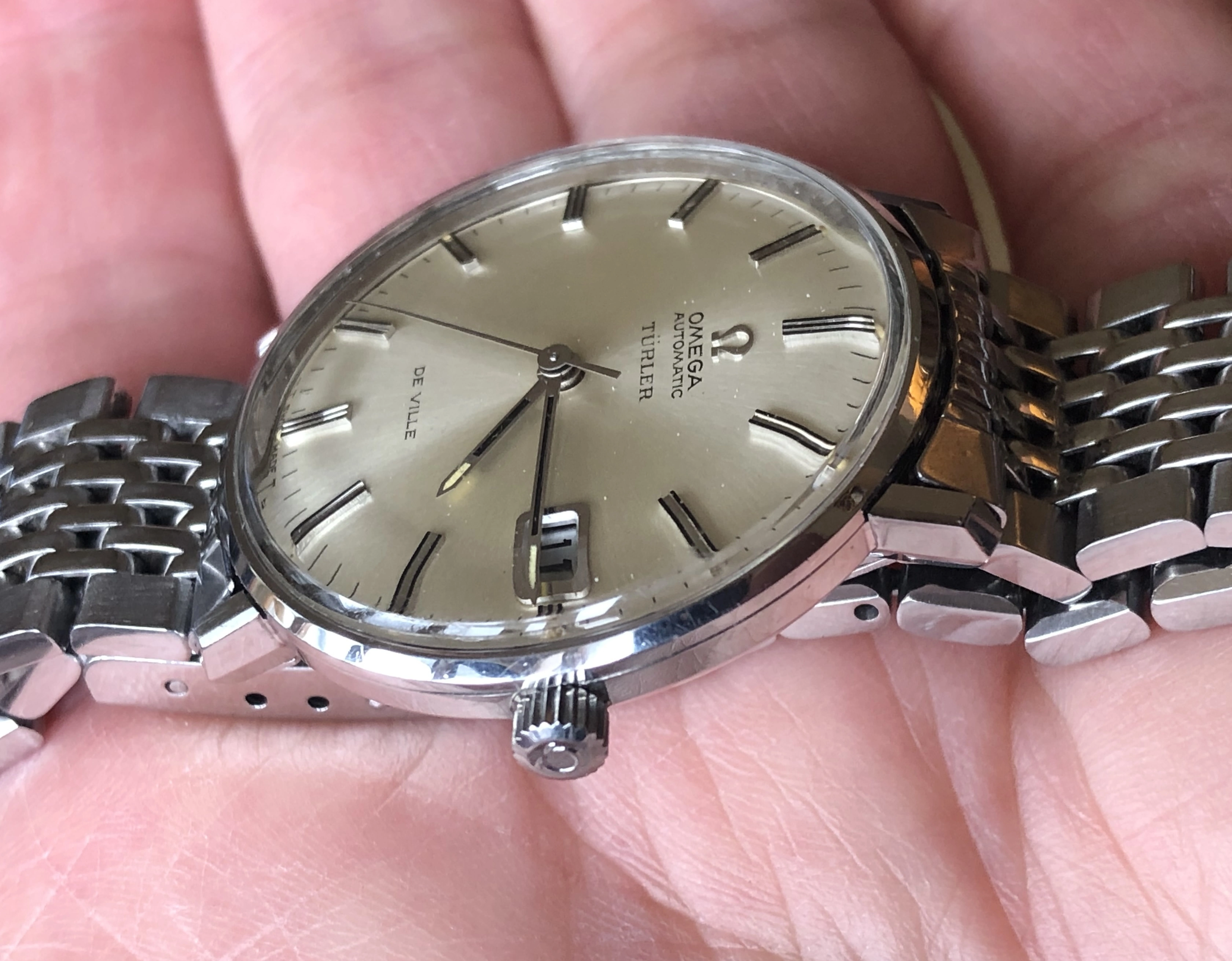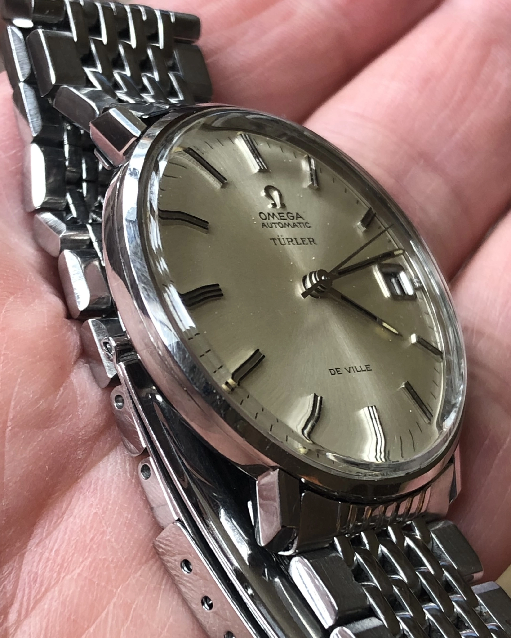 ·Here is a very nice 1960s Omega DeVille double-signed by the retailer Türler. It's in very fine condition with a clean dial and sharp case. The sunburst silver dial has applied markers with black inlay and beautifully aged lume dots, and the hands match perfectly. The 1037 beads of rice bracelet with 564 end-links is long (22 links) and tight. The watch has not been serviced in my possession but is operating correctly, including the quick-set date which advances when the crown is pulled out all the way. The watch has a one-piece case so unfortunately, I am not able to provide internal photos. Beautiful watch, with no significant condition issues to note.