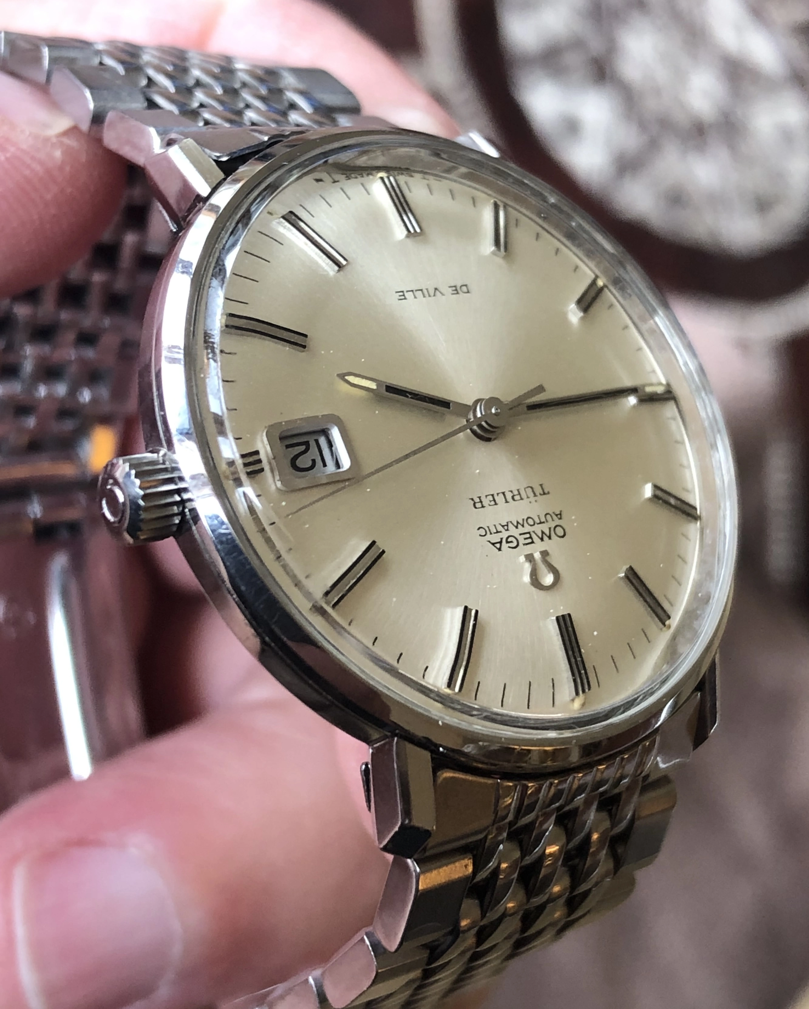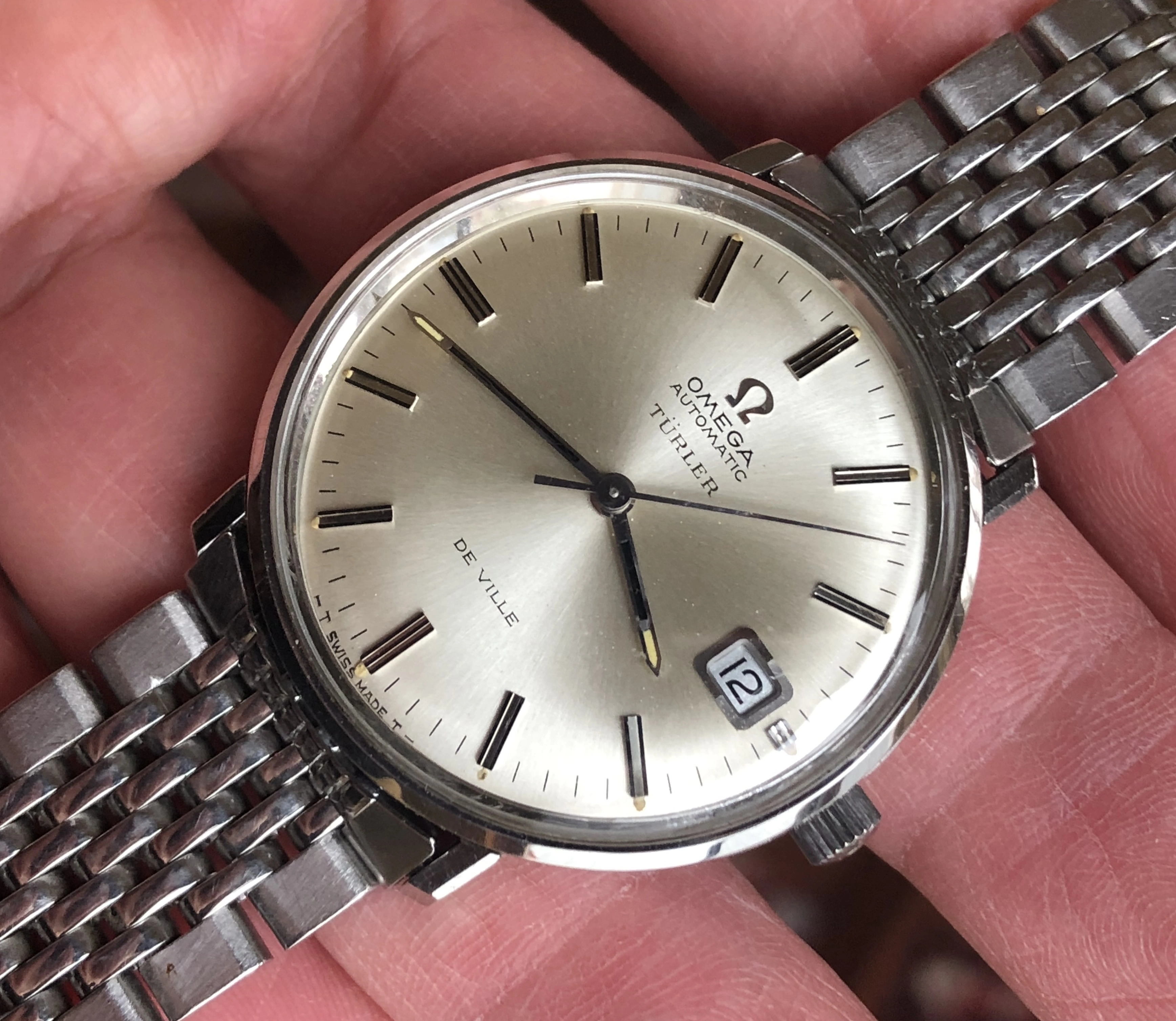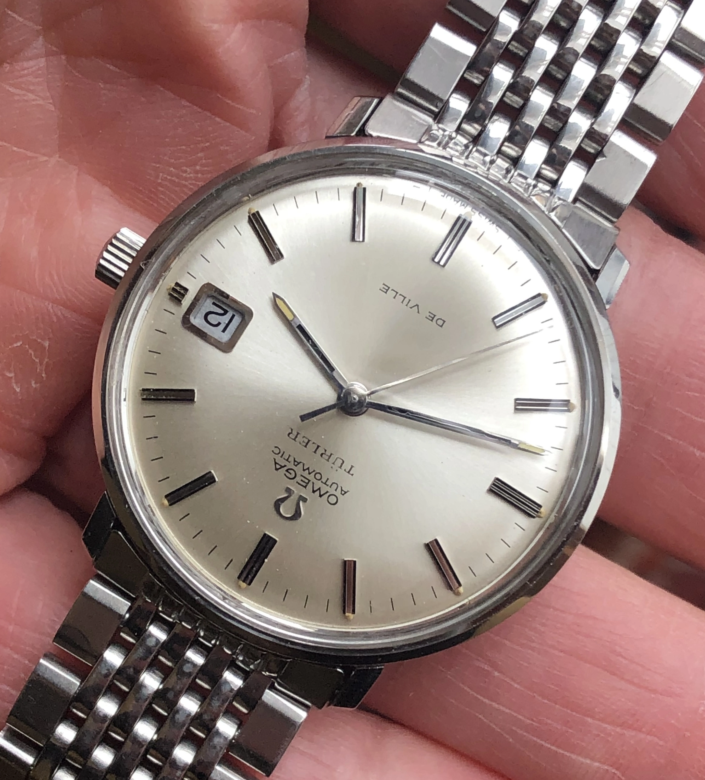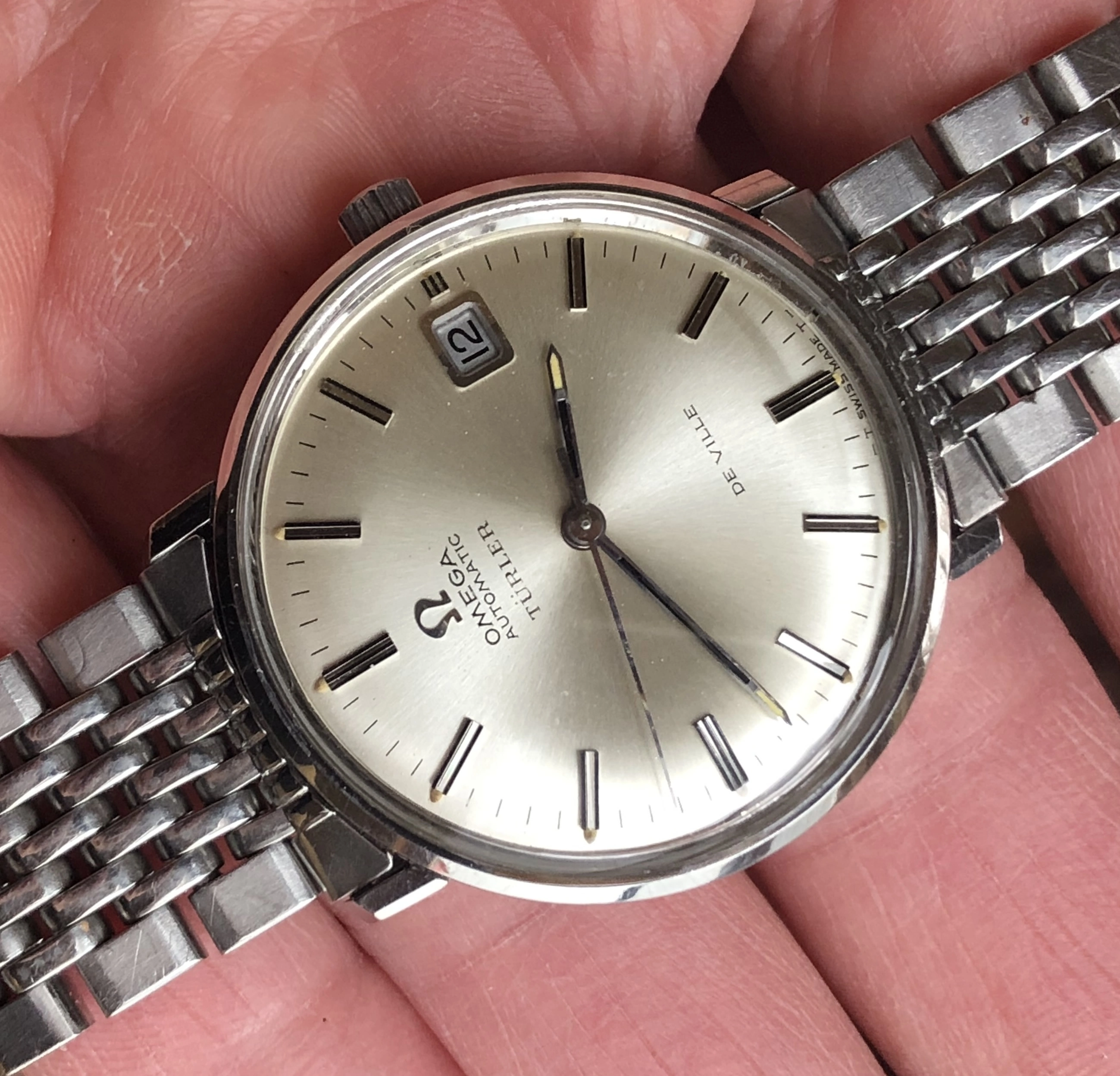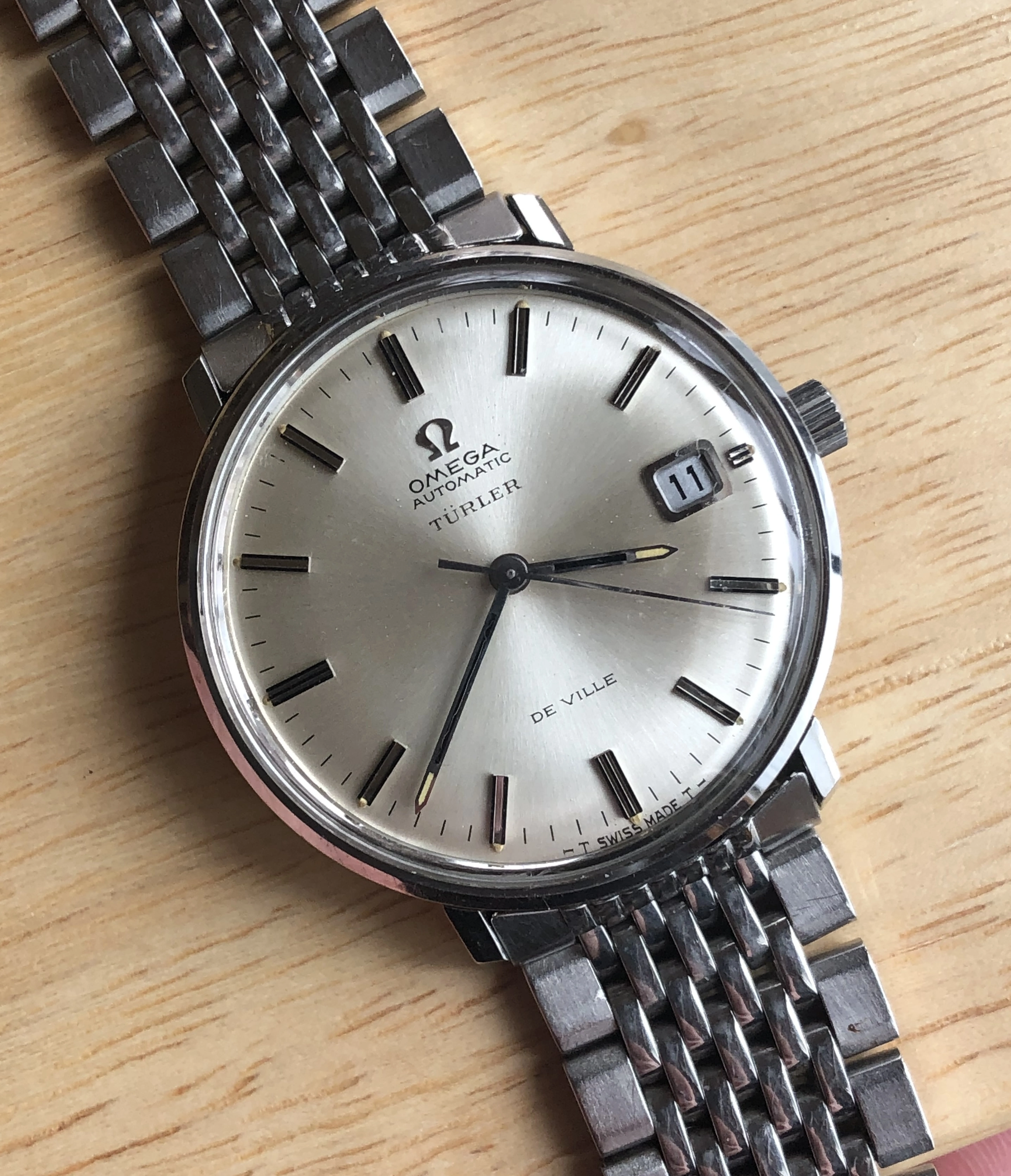 ·Here is a very nice 1960s Omega DeVille double-signed by the retailer Türler. It's in very fine condition with a clean dial and sharp case. The sunburst silver dial has applied markers with black inlay and beautifully aged lume dots, and the hands match perfectly. The 1037 beads of rice bracelet with 564 end-links is long (22 links) and tight. The watch has not been serviced in my possession but is operating correctly, including the quick-set date which advances when the crown is pulled out all the way. The watch has a one-piece case so unfortunately, I am not able to provide internal photos. Beautiful watch, with no significant condition issues to note.