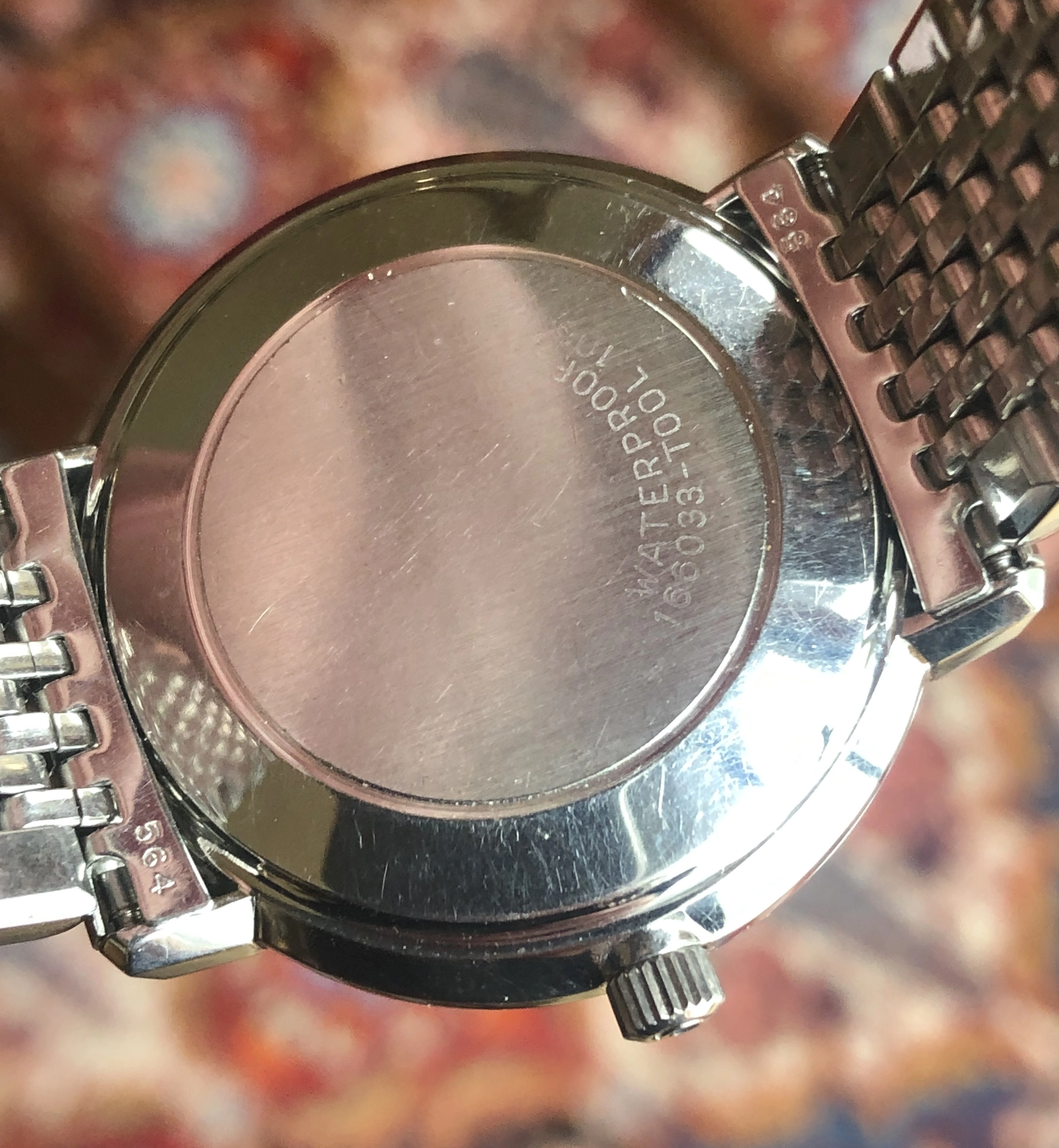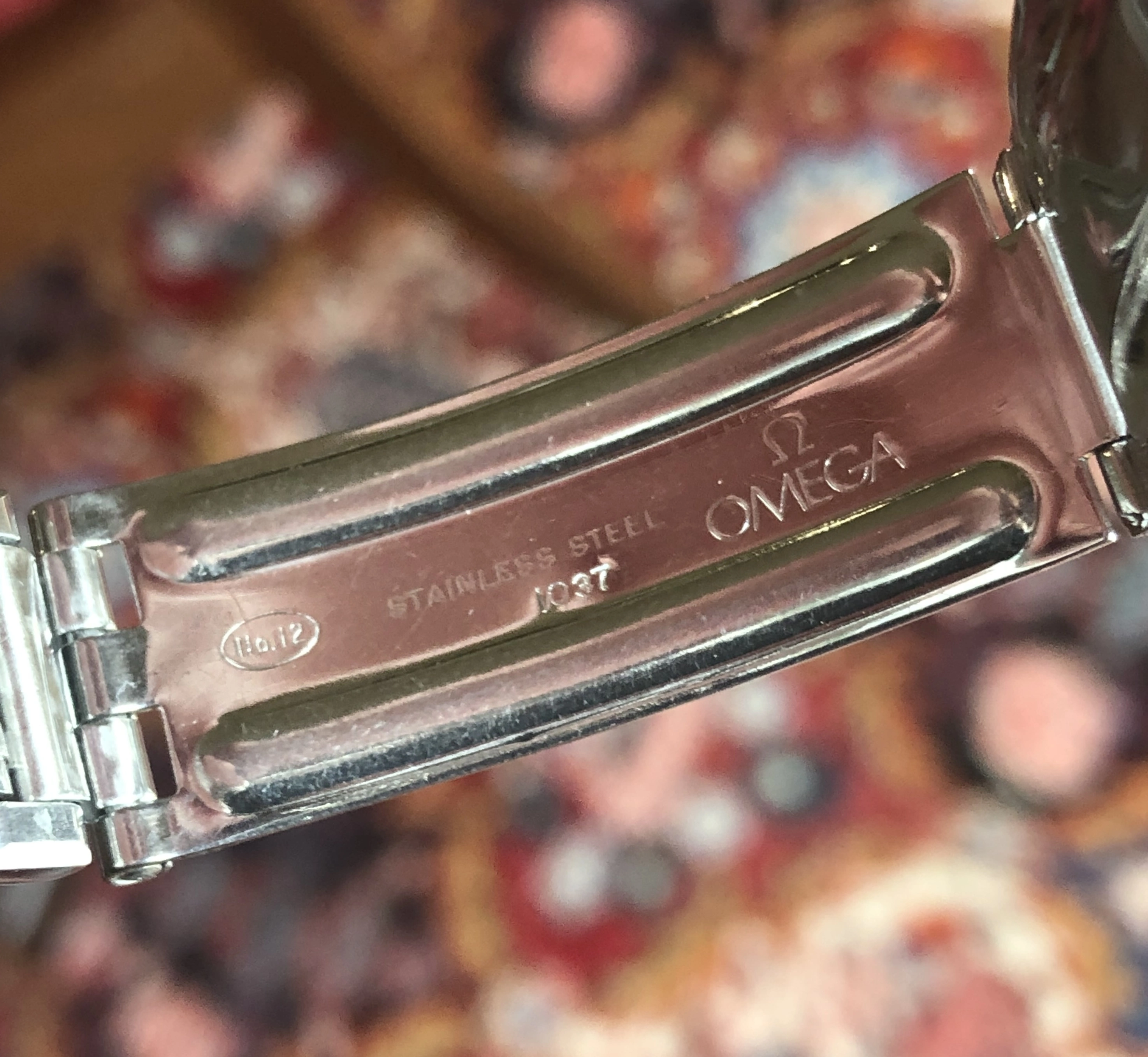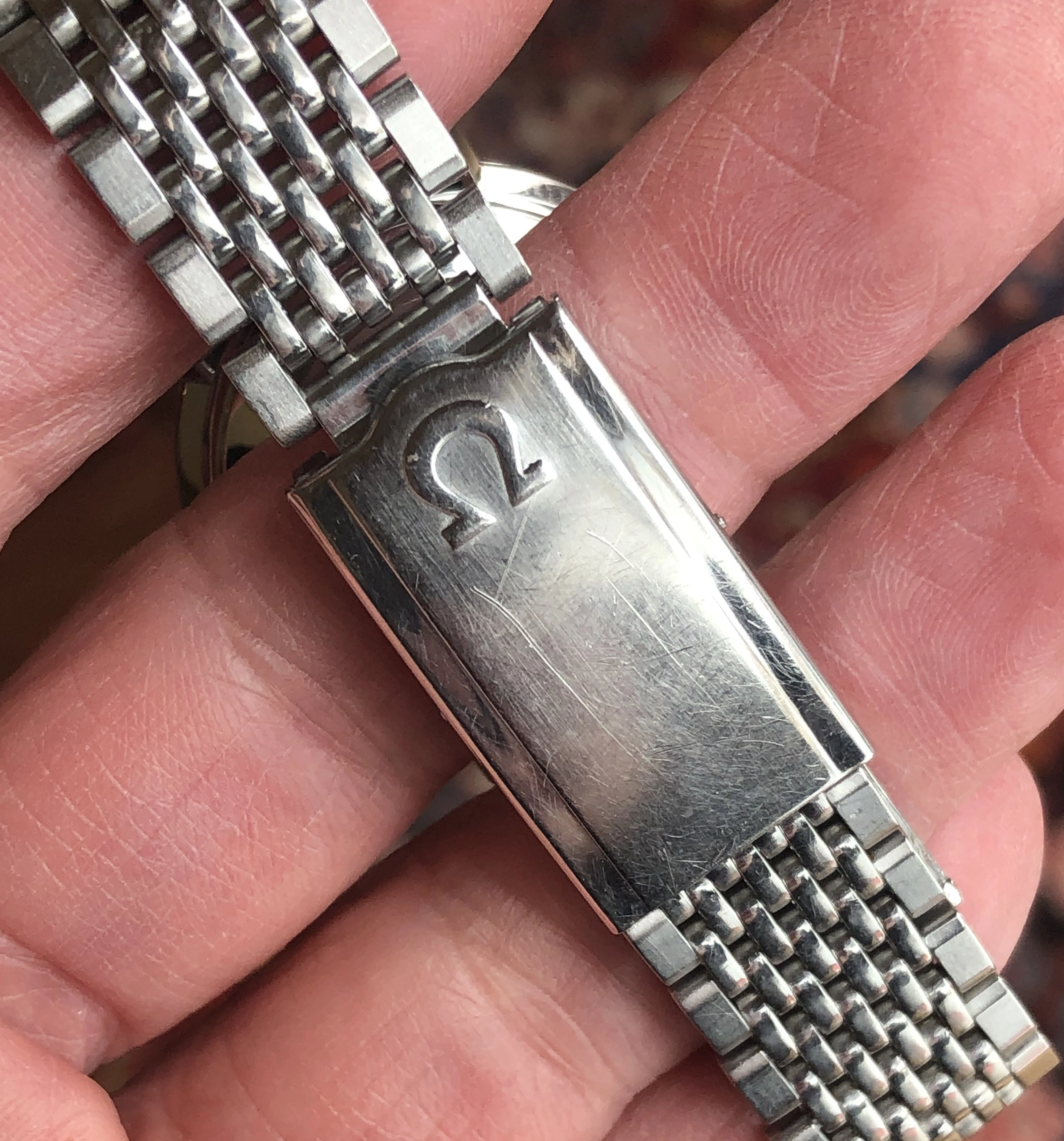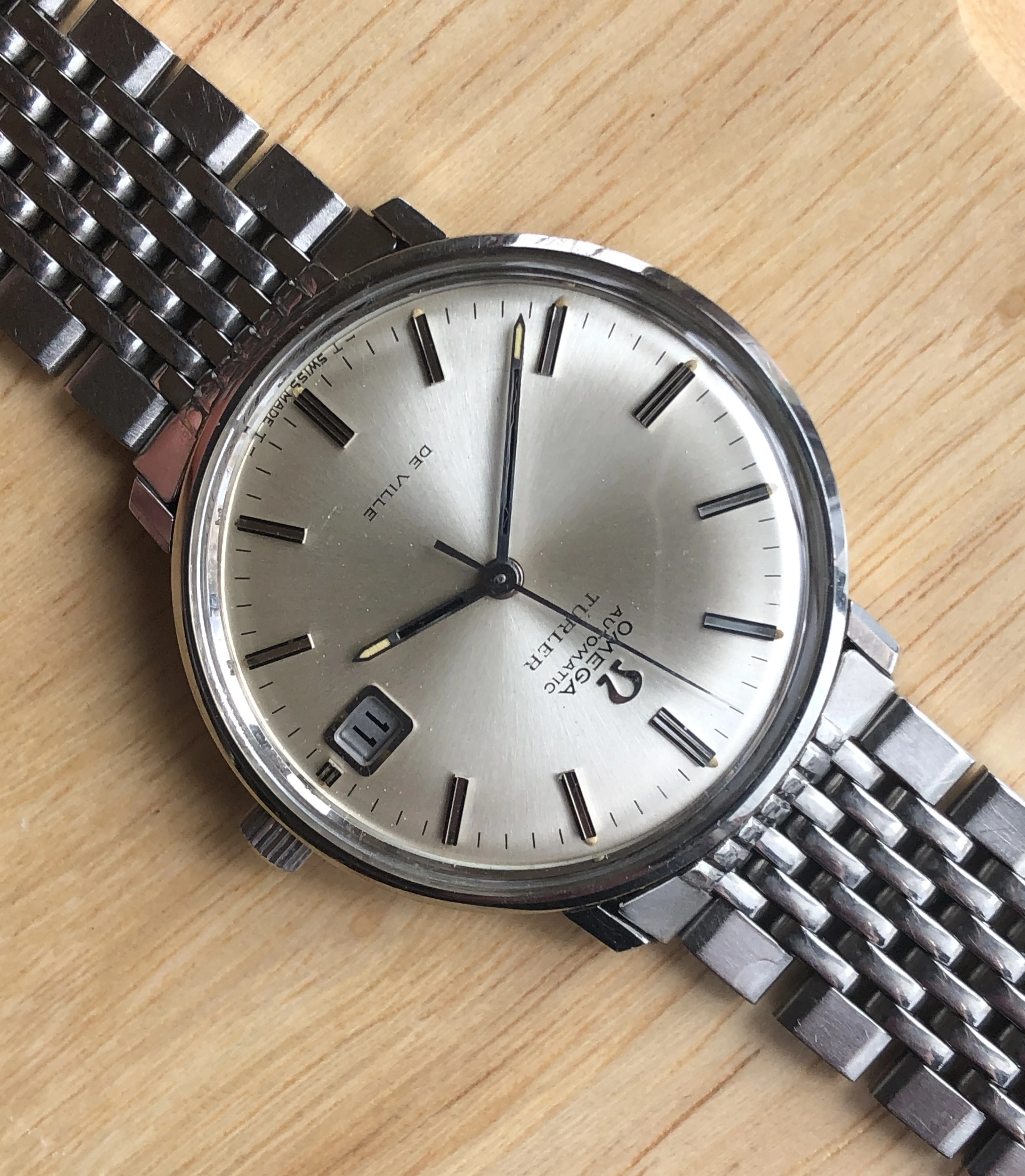 ·Here is a very nice 1960s Omega DeVille double-signed by the retailer Türler. It's in very fine condition with a clean dial and sharp case. The sunburst silver dial has applied markers with black inlay and beautifully aged lume dots, and the hands match perfectly. The 1037 beads of rice bracelet with 564 end-links is long (22 links) and tight. The watch has not been serviced in my possession but is operating correctly, including the quick-set date which advances when the crown is pulled out all the way. The watch has a one-piece case so unfortunately, I am not able to provide internal photos. Beautiful watch, with no significant condition issues to note.