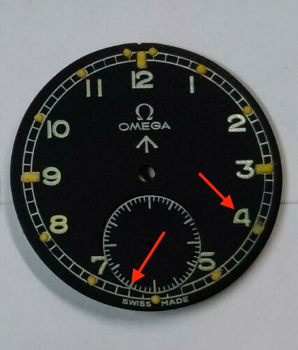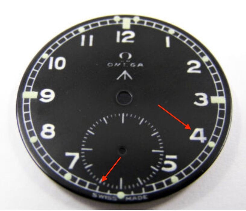 The curious thing is, that looking at all Omegas I can see two distinct dials. One has a bit more rounded number 4 and squares in the bottom are a bit more complete where touching the lower circle for second hand (see the arrows):