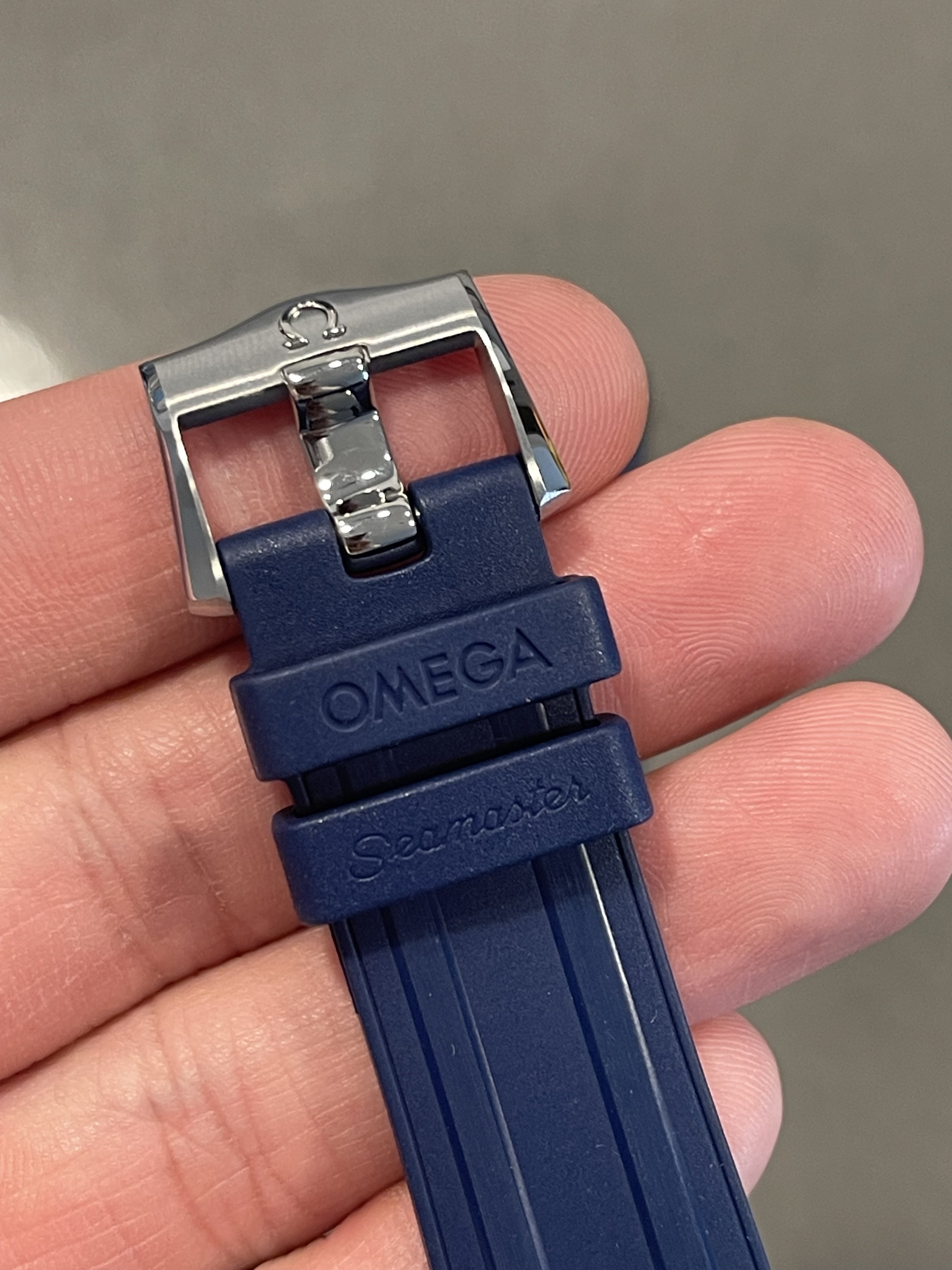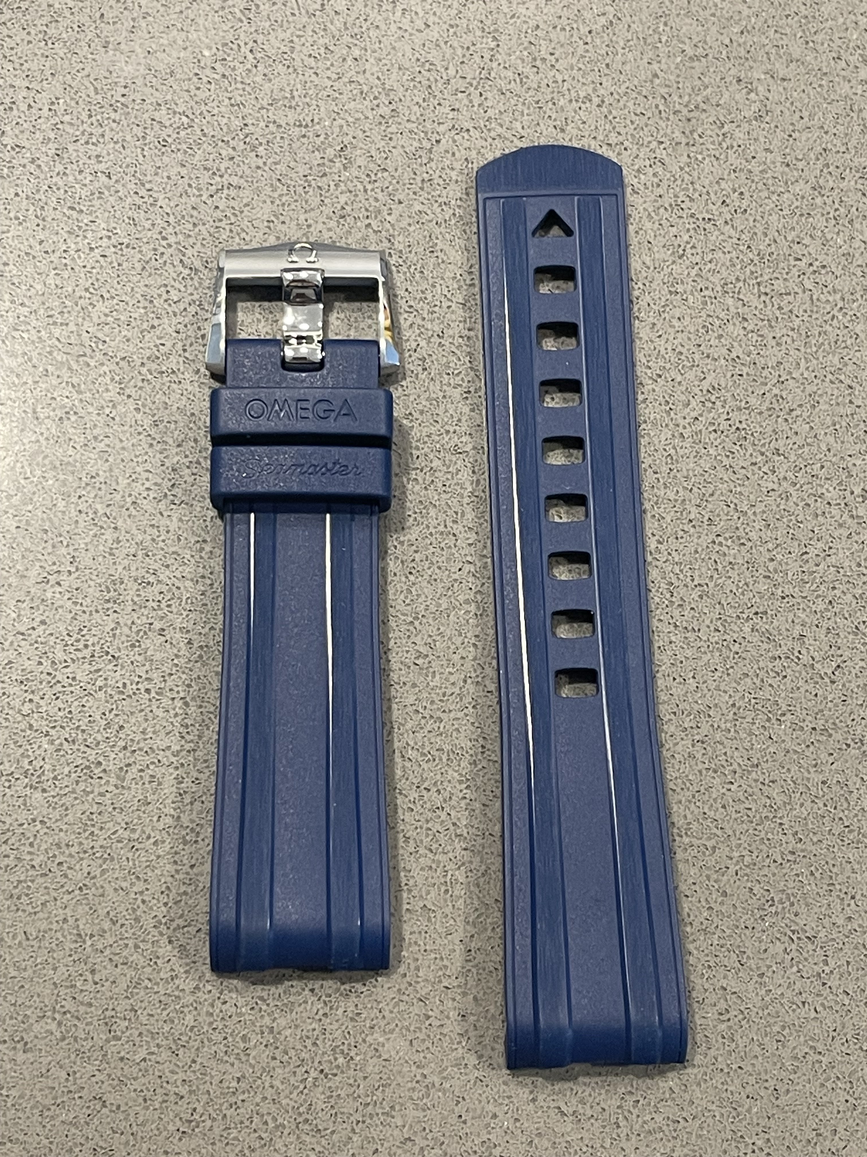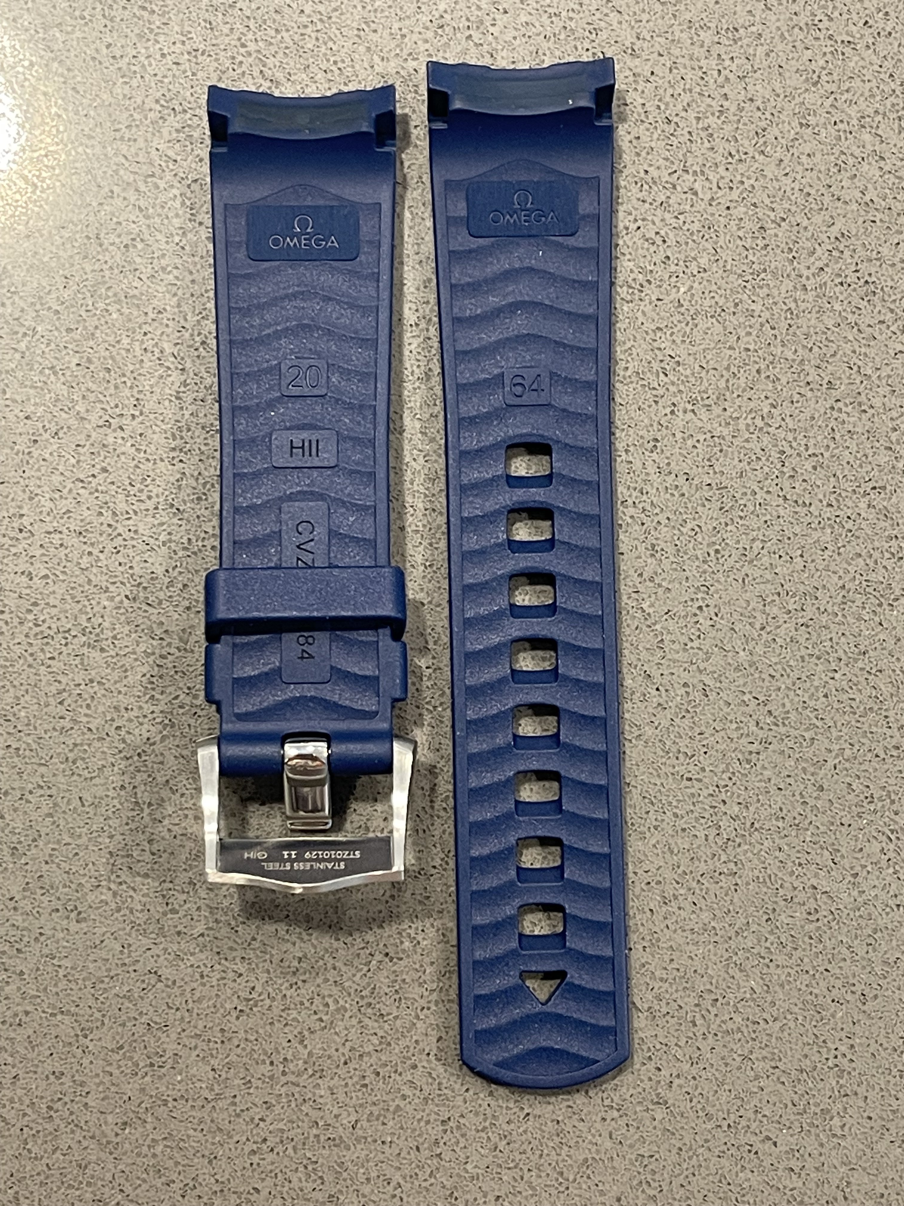 Selling a set of like-new OMEGA SHORT 20mm blue rubber strap (part ref. 032CVZ010484) and matching steel buckle (025STZ010129) that fits all current generation 42mm Seamaster Diver 300m models with 20mm lug widths. Spring bars not included.