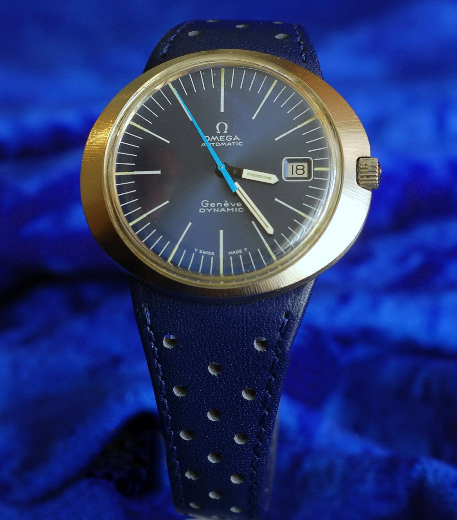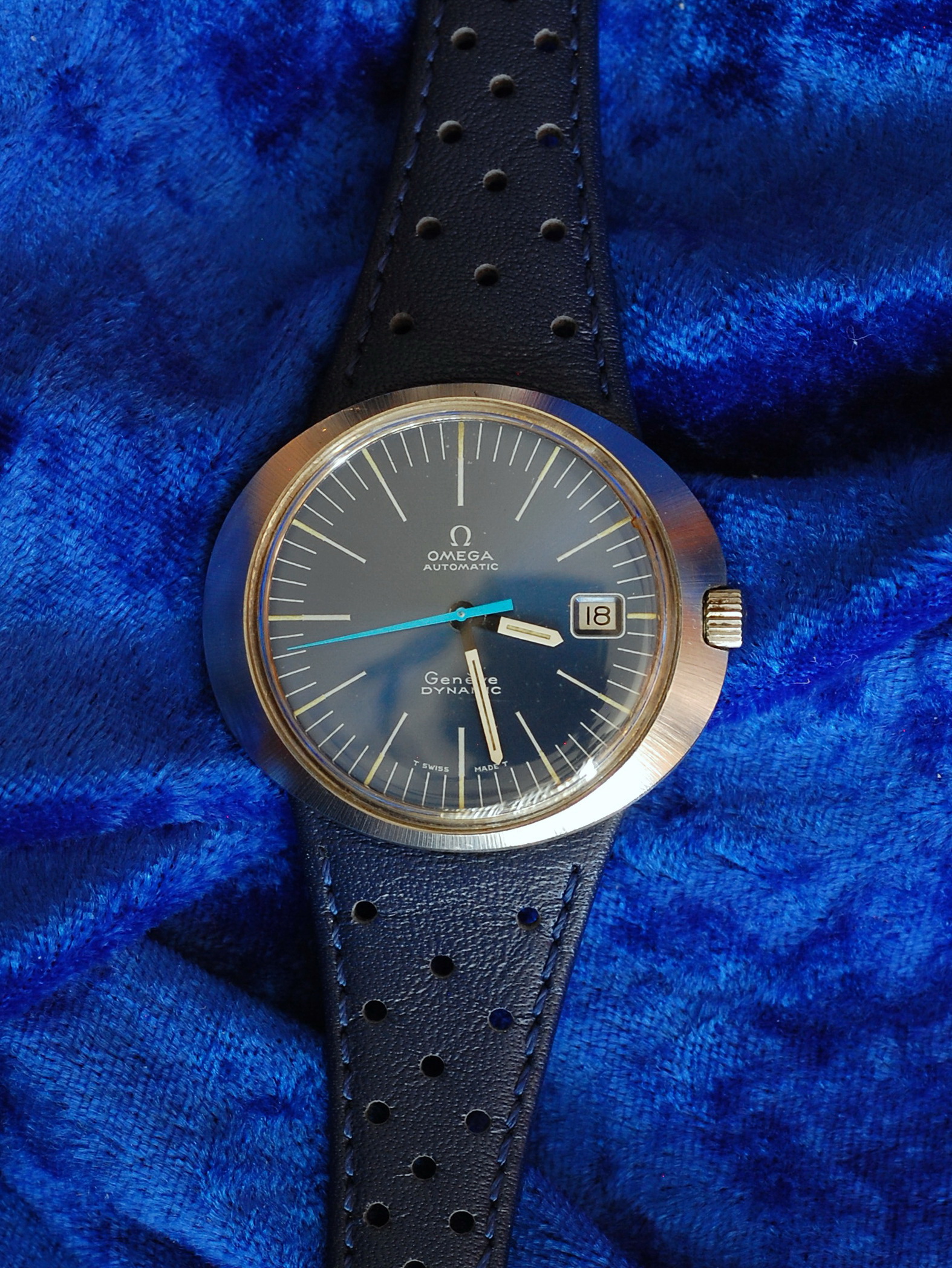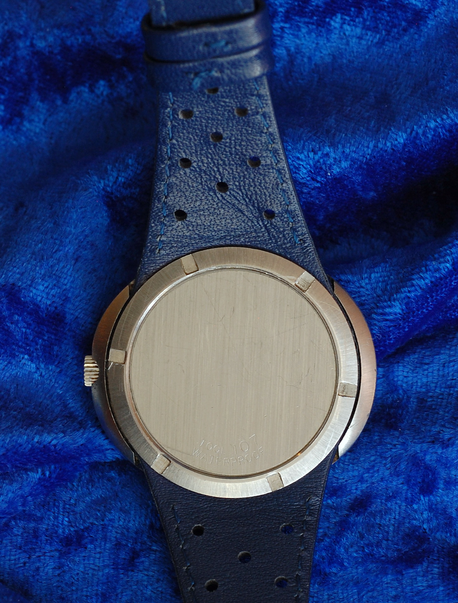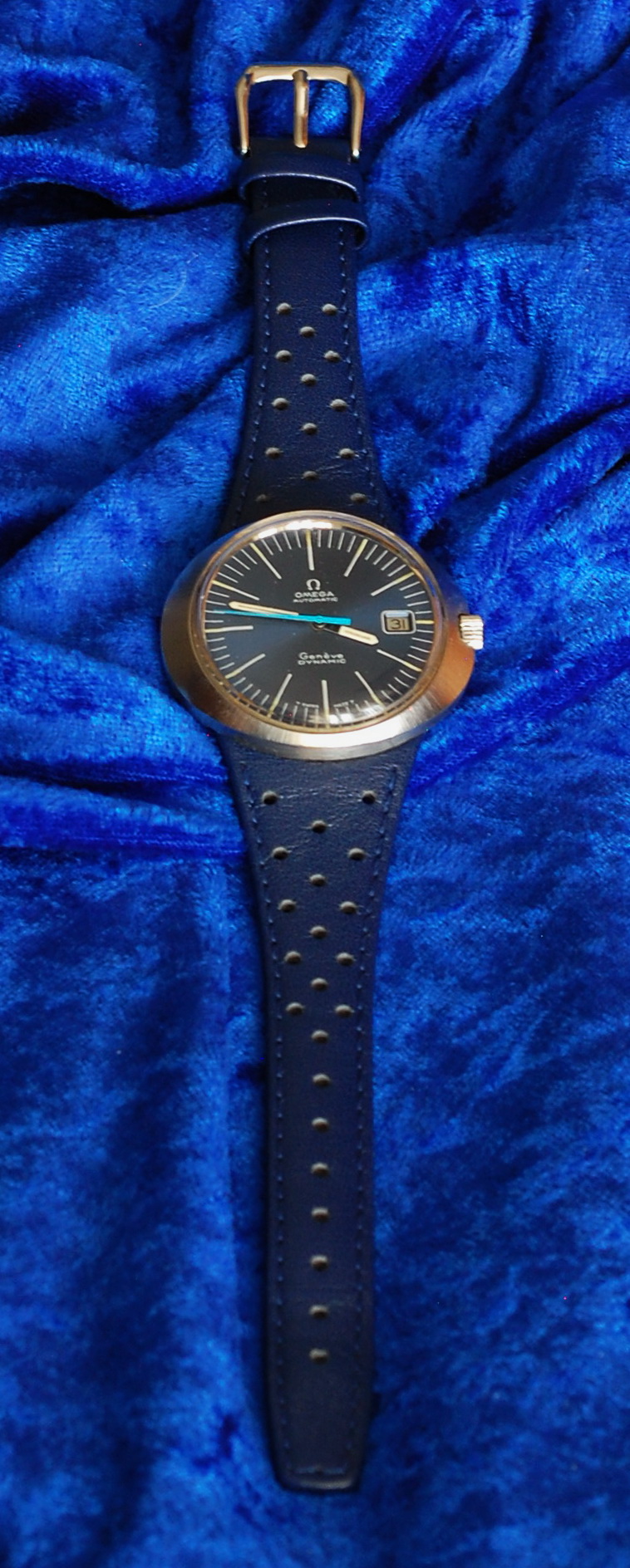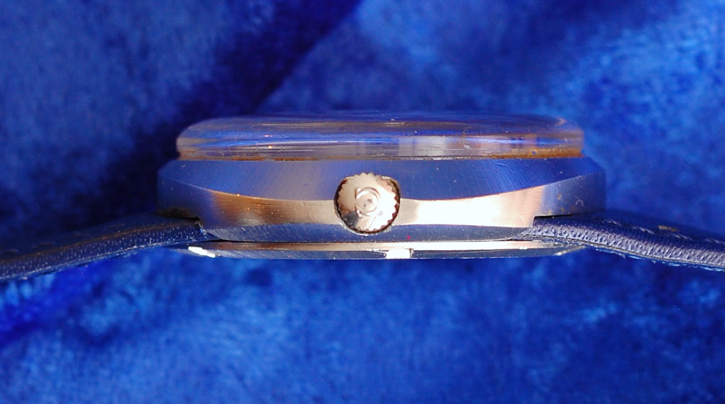 ·Got this a few months back, without a bracelet or strap. Located both blue and a brown leather replica straps and chose the blue one to match the dial. Like the vintage ads say, this shape is super comfortable on the wrist. And the oval case is conspicuously wider than most of my vintage Omegas. Attaching the strap was a bit of a learning experience, as none of my normal caseback tools and spanners would allow me to apply enough pressure evenly to get the thread started. Lucky me, I had a 3D printed six-tab tool that came with a transparent sapphire back I had bought for another vintage Omega. It has a 1.5 inch handle that allows you to press down and turn at the same time. Once the thread caught (and I had determined that it wasn't cross-threaded) I spent the next three weeks easing it down a fifth of a turn at a time. Then I would let it set for a few days to compress the leather, and give it another twist. It is now pretty darn secure, and I can only see one thread peaking out from the ring. Getting it off might be another matter.