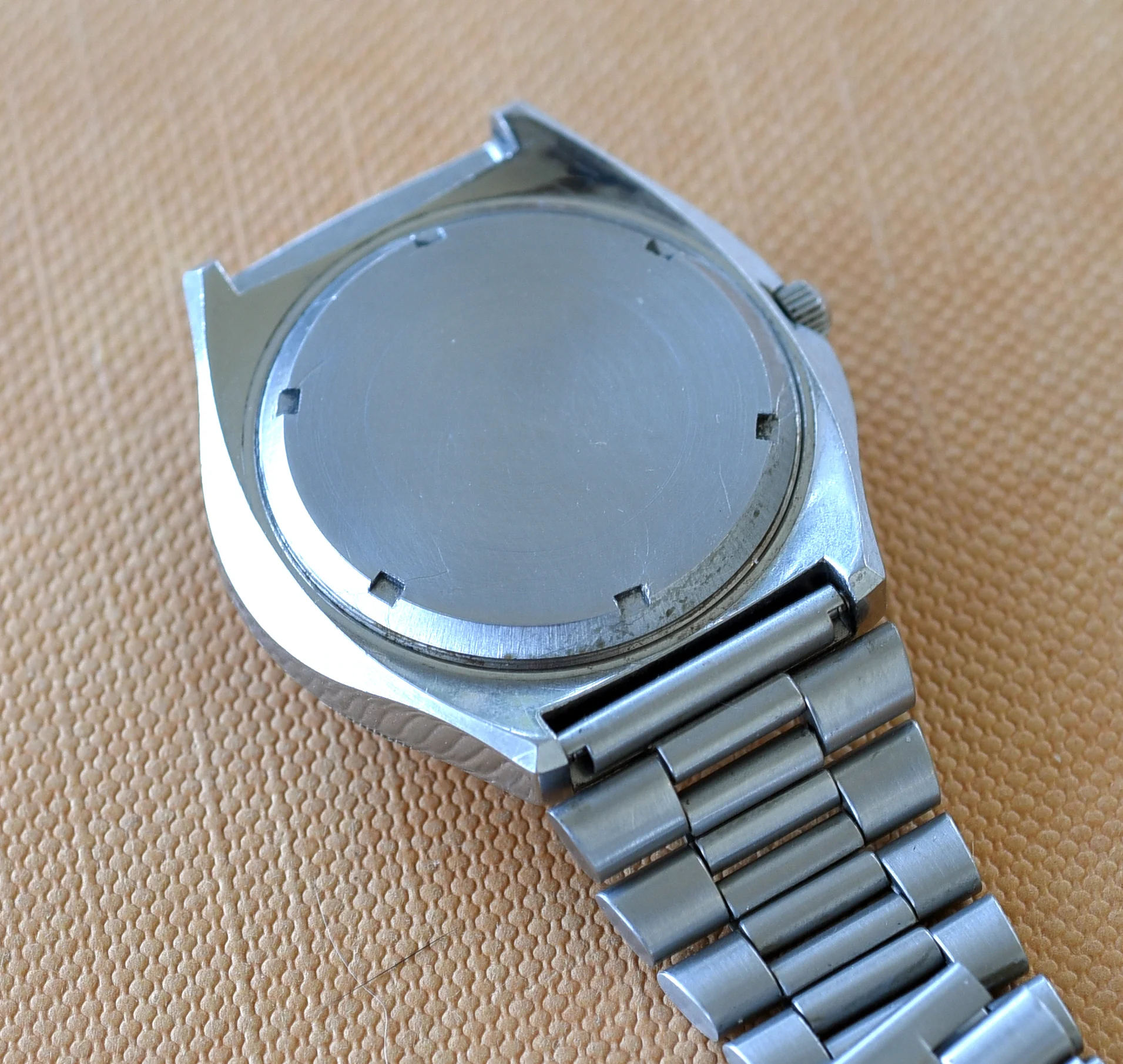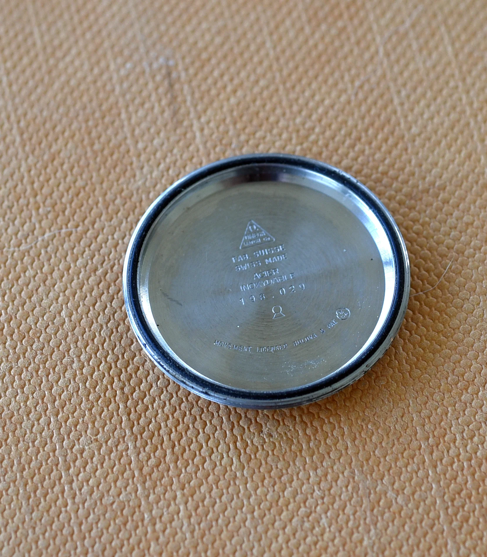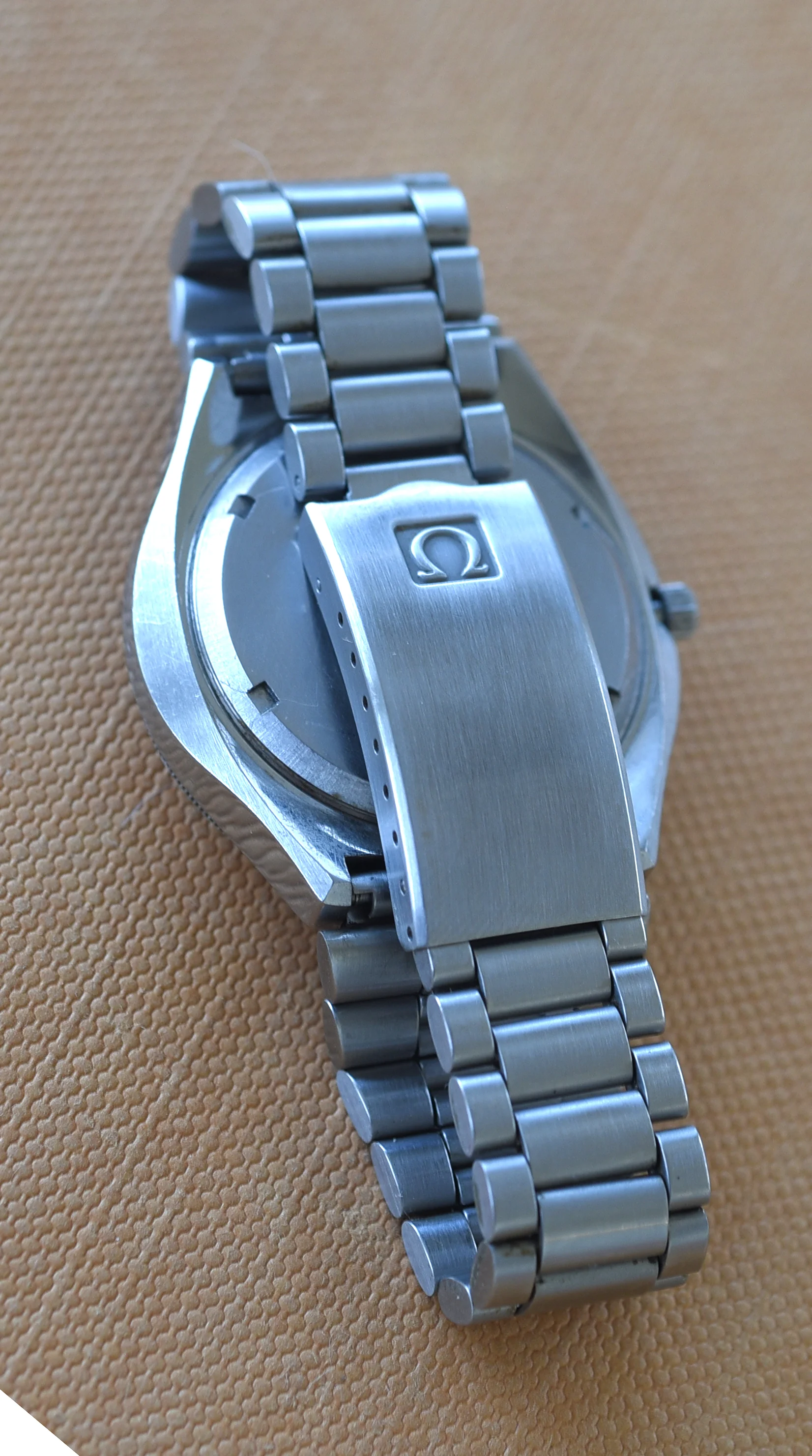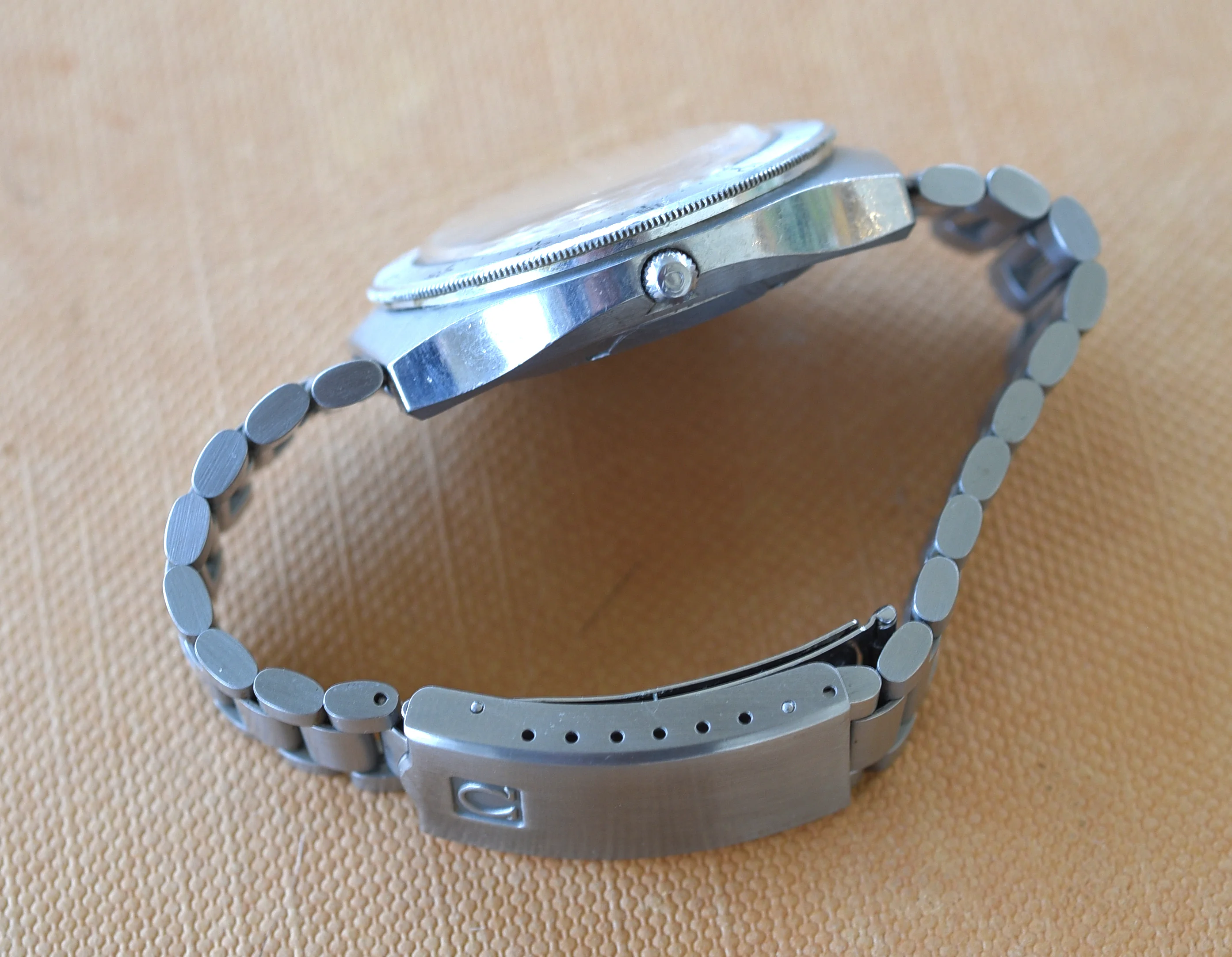 The case is 40mm (without crown) and 41mm lug to lug. The case is in good condition showing some light wear and dings consistent with light use. It still retains the sharp edges and sunburst finish on the top. It looks like the watch was never polished. The crown is signed and original. The crystal is in excellent condition showing no crazing. One of the nice things about this example is the writing on the bezel, which is still in good condition. This ref had weak printing of the bezel numerals and markings and most examples I have seen have lost much of the print. This one still retains the markings and I would estimate it to be about 90% remaining. The bracelet is marked on the clasp 1162/173. The case back is without markings on the outside and marked correctly on the inside with reference, Omega triangle,, Swiss Mdae/Fab. Suisse, Acier Indoxyable, and "Movement licensed Bulova & Patent ESA". The Omega 1260 movement functions perfectly and has all the correct markings as can be seen in the pictures. The dial is perfect.
