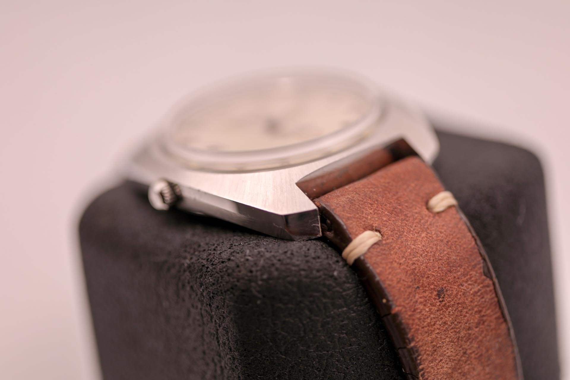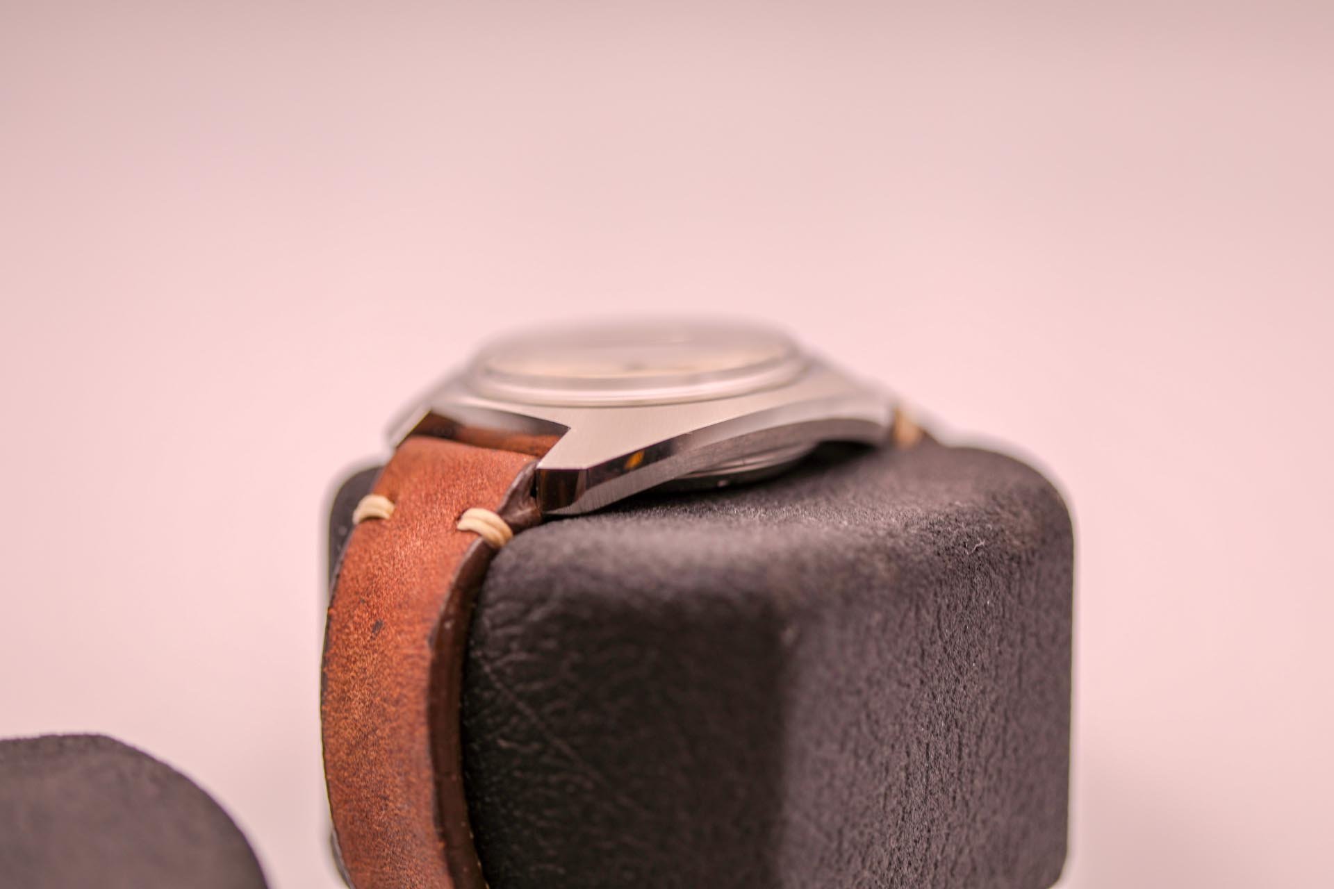 Comes on an a nice leather single stitch strap with steel buckle.