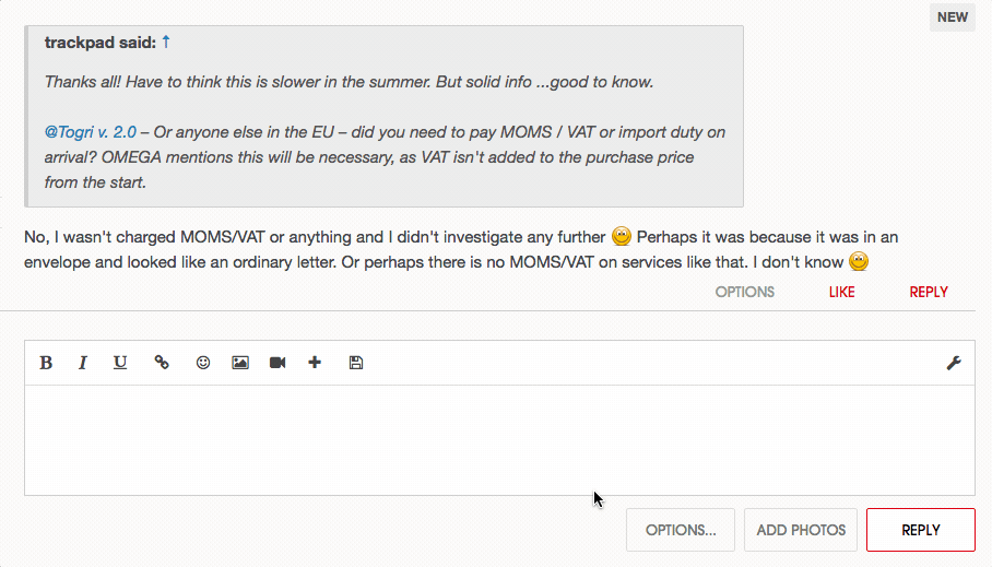 @Togri v. 2.0 - Or anyone else in the EU - did you need to pay MOMS / VAT or import duty on arrival? OMEGA mentions this will be necessary, as VAT isn't added to the purchase price from the start.