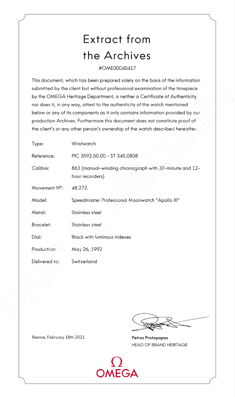 The serial number of the watch starts with 4824 and that would make it a 1990 or a 91 watch. But it has a 1450/808 bracelet that was on the Apollo XI 20th anniversary watches and on others. But from what I know those watches were issued in 1989. Dial, hands, pushers, and everything else is consistent