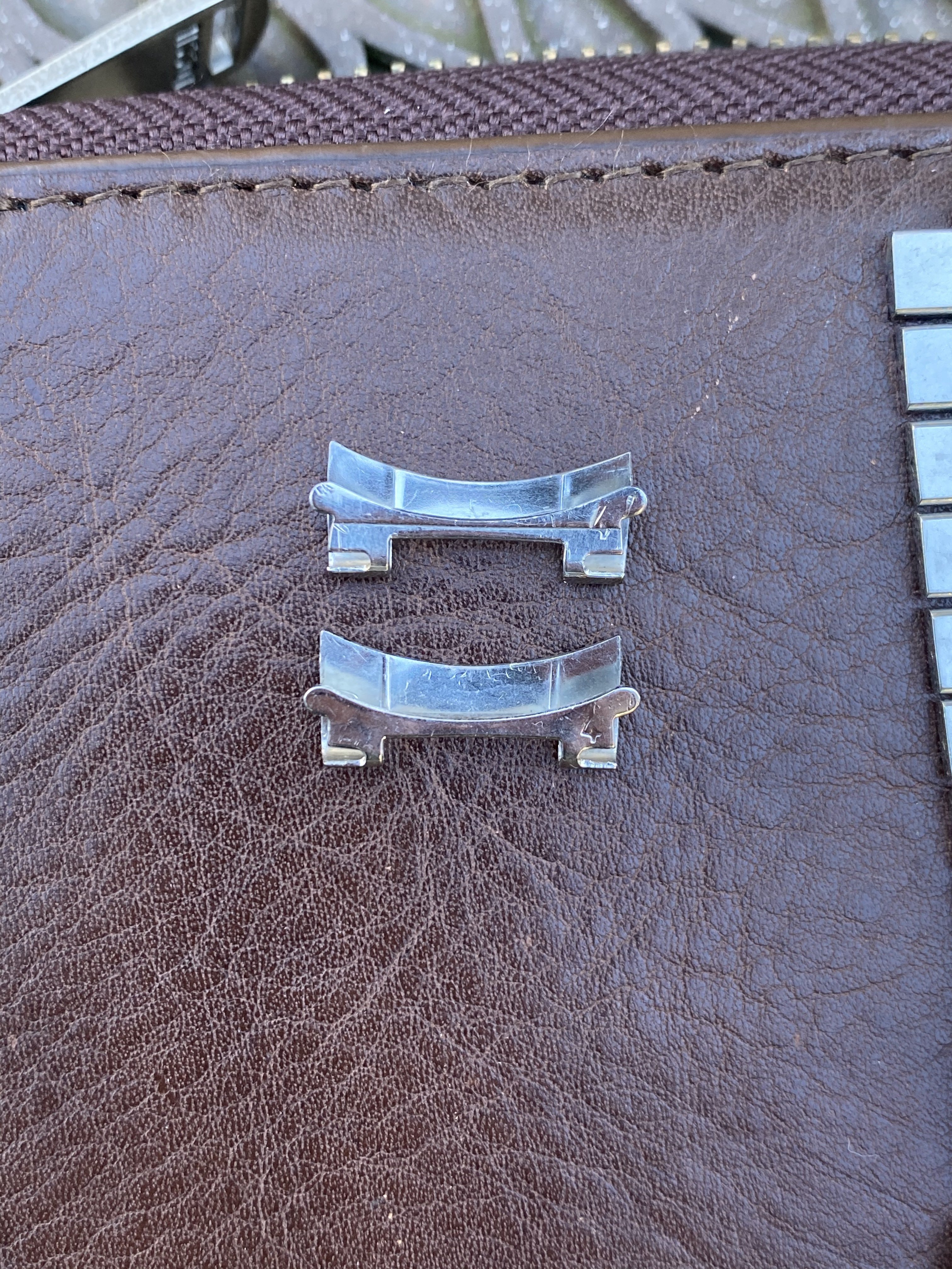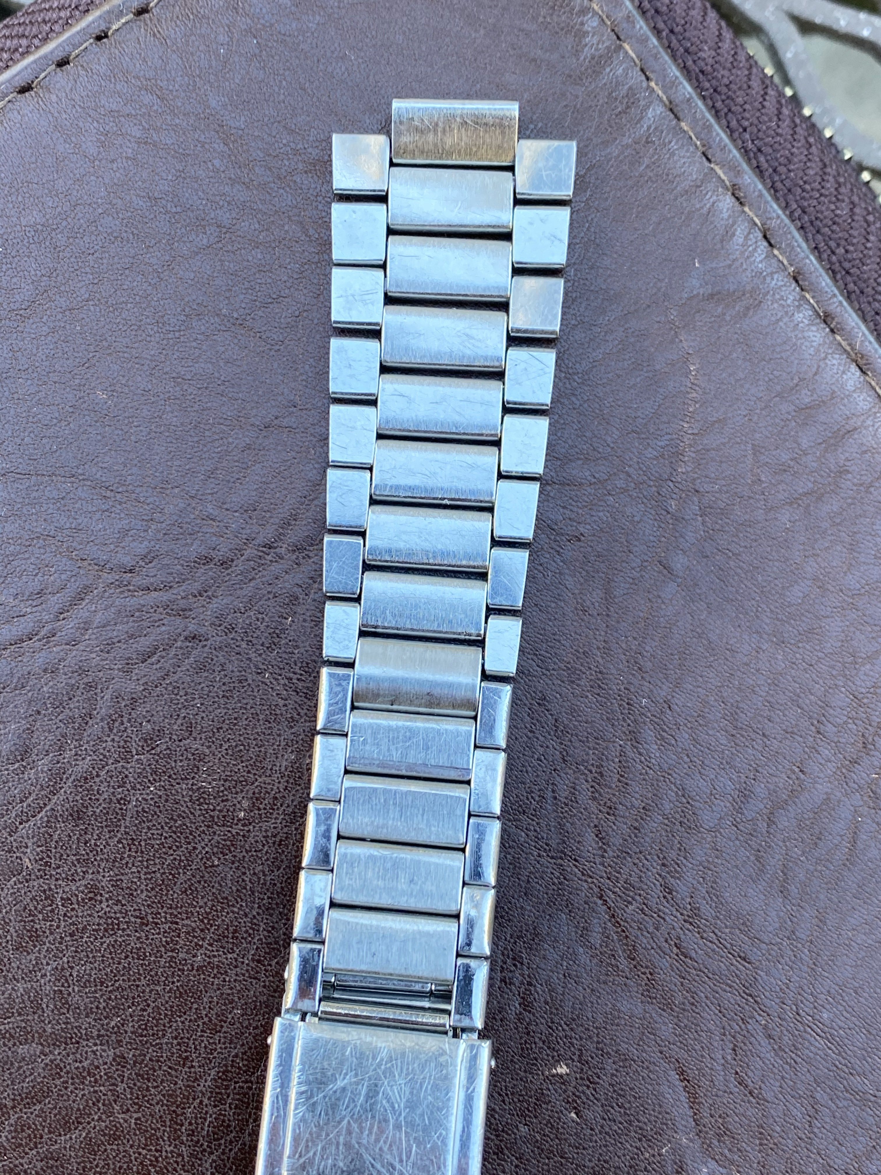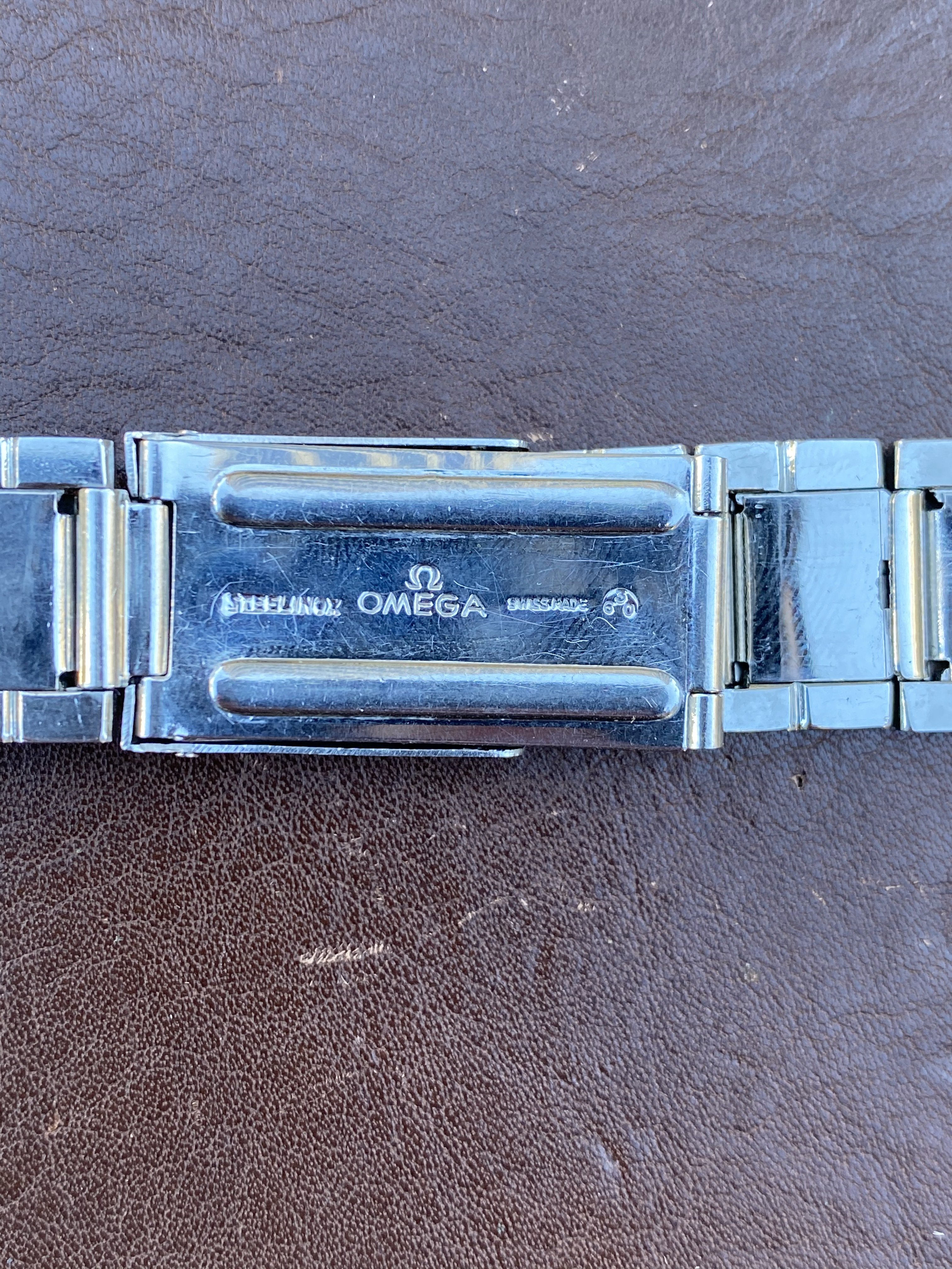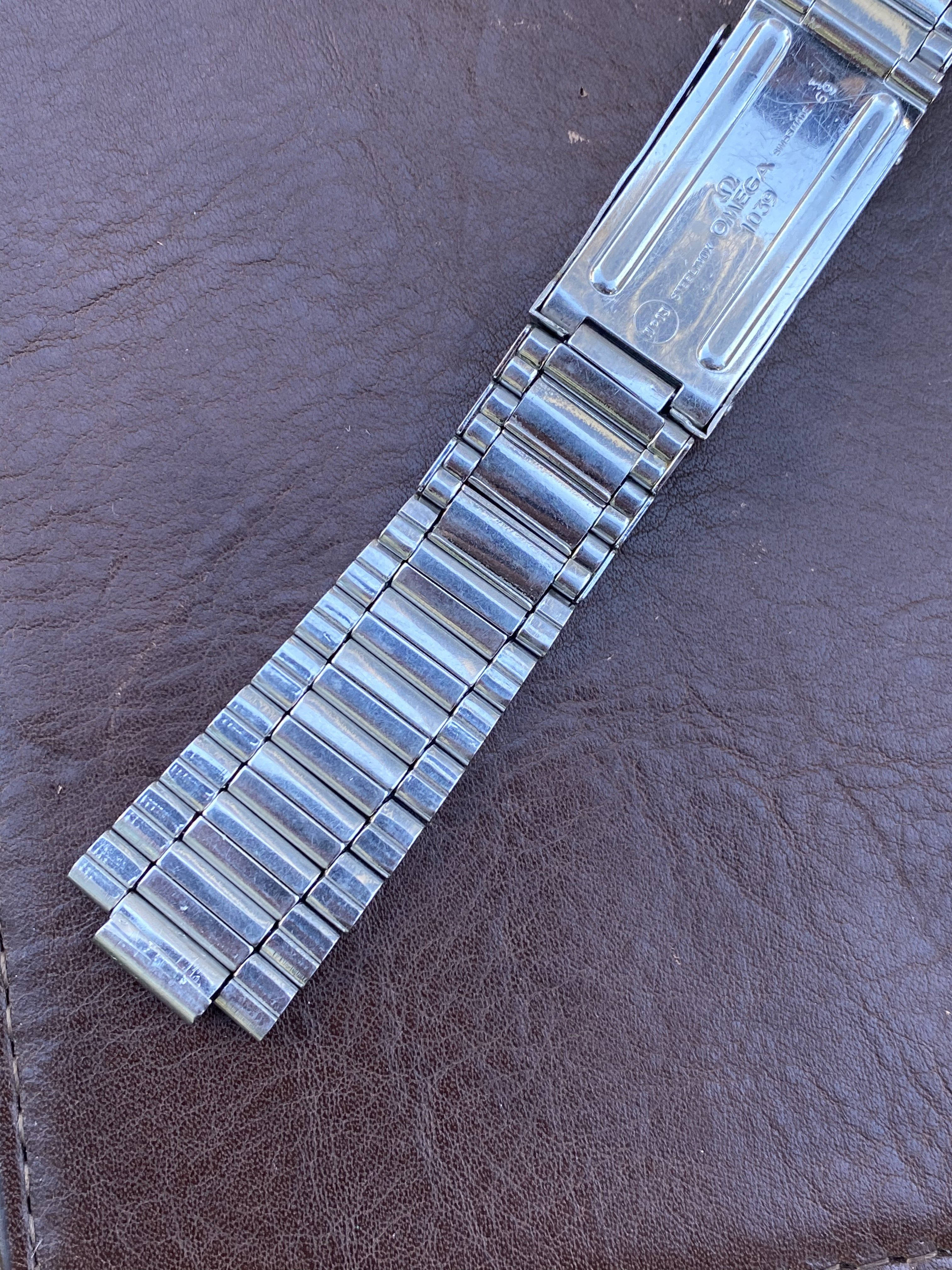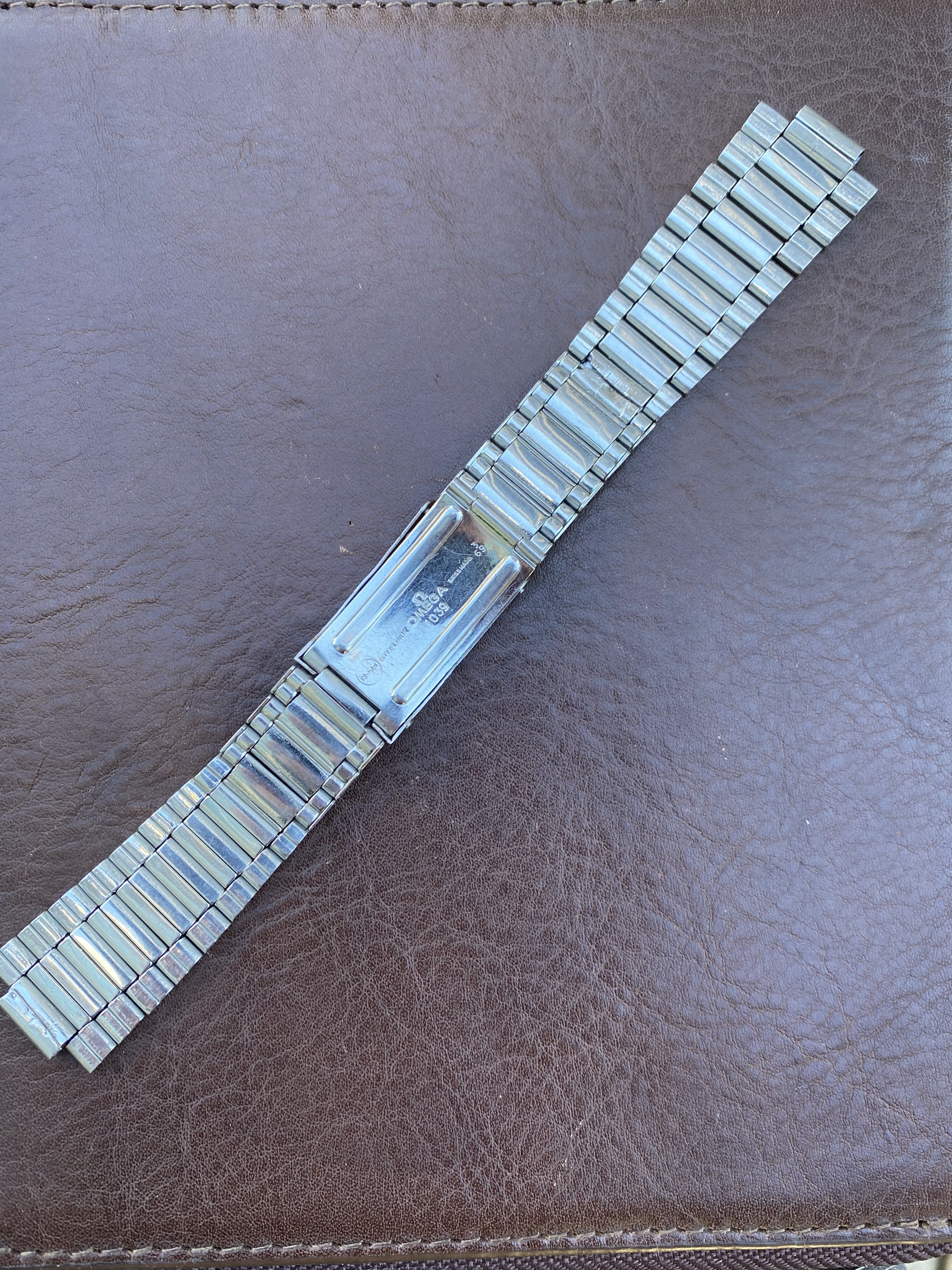 1039 bracelet seems to be unpolished but has some wear, particularly on the buckle. One of the middle links was replaced at some point - it's slightly longer than the others but is fully functional and has the same brushing so it is not very noticeable from the front (see photos). Comes with seven of the original spring links, all of which are fully functional, and 24 links total. Length is 16.5cm (unstretched). Clasp is fully functional. Bracelet is dated to the 3rd quarter of 1969, making it correct for several Speedmaster and Seamaster 300 references (see chart linked above). No endlinks. Price is $1000. [Sold]