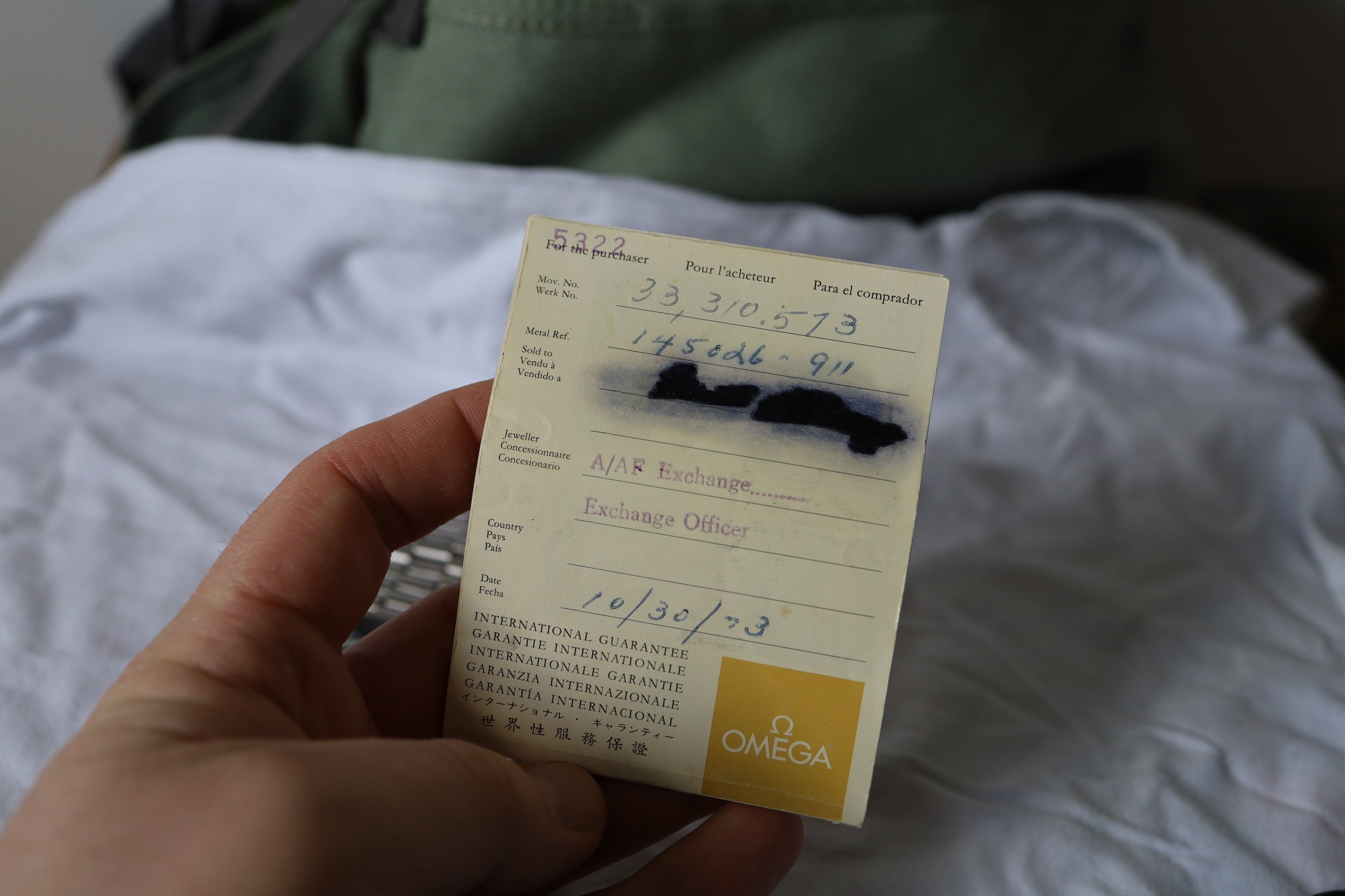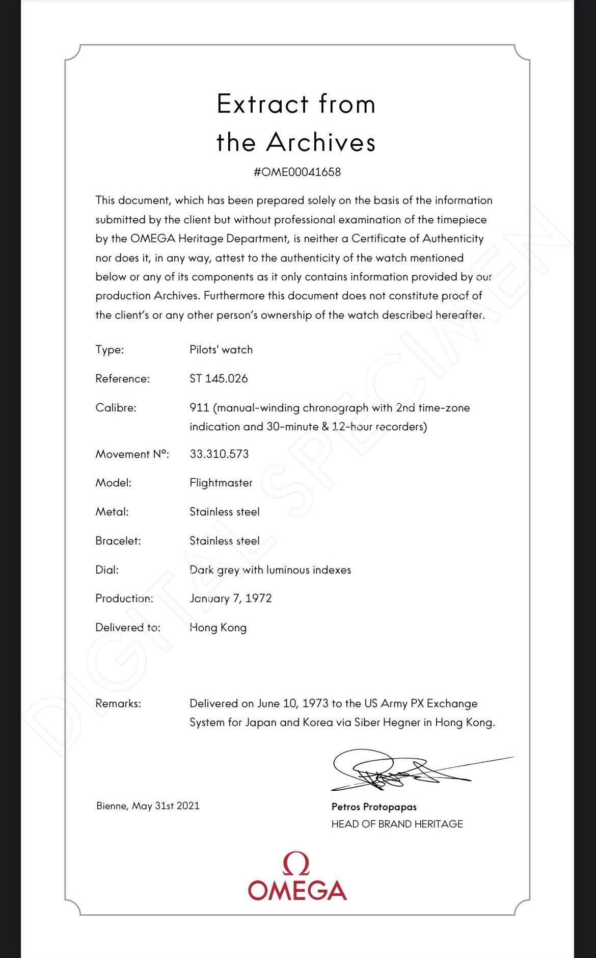 ·Offered up for sale is a 1972 Omega flightmaster reference 145.026, which was produced January 7 1972, and delivered to the US Army PX Exchange System for Japan and Korea via Siber Hegner in Hong Kong on June 10 1973, and sold on October 30 1973 to Robert Allan Maya, a Special Forces Medic, who served in Vietnam.