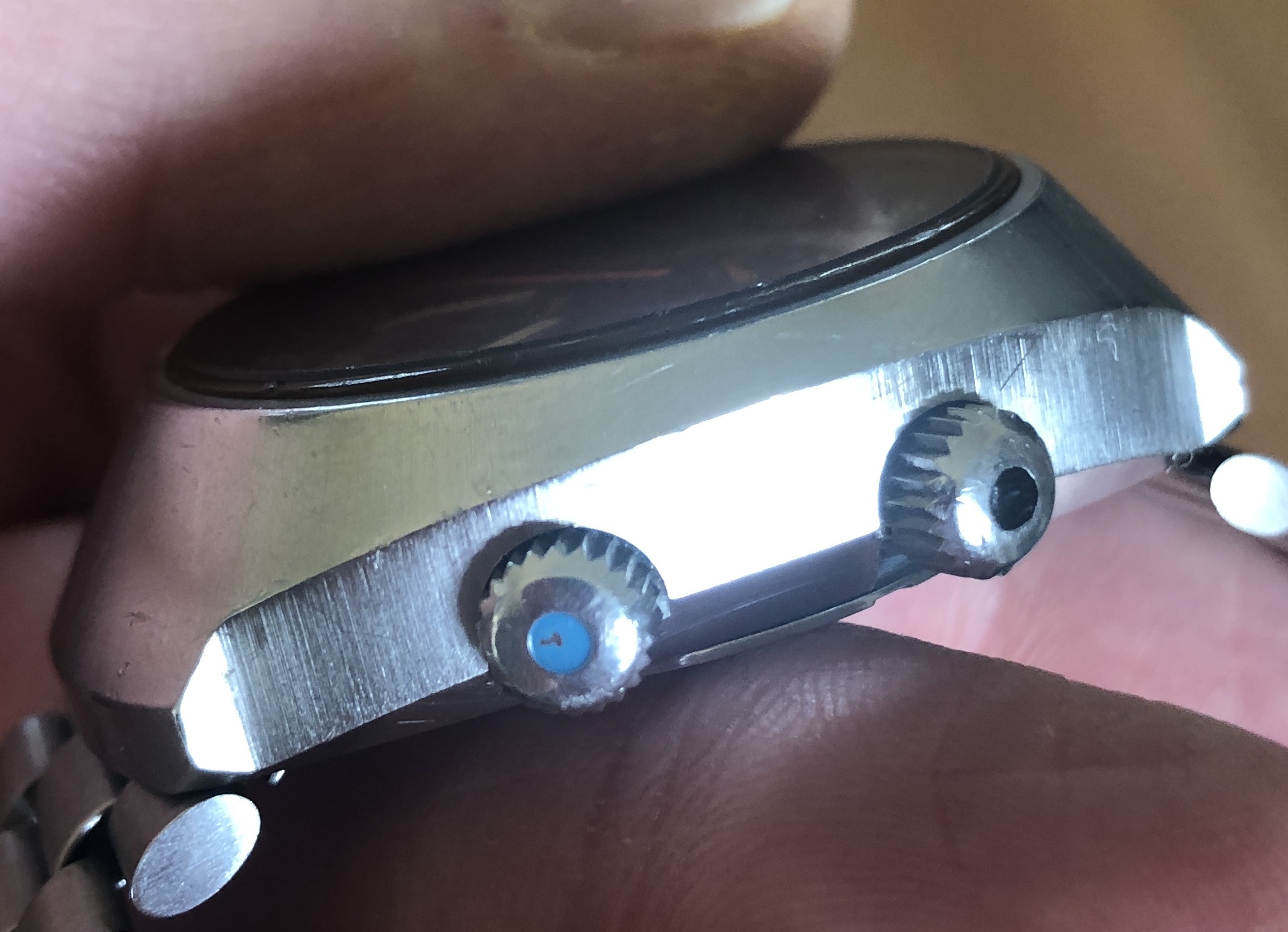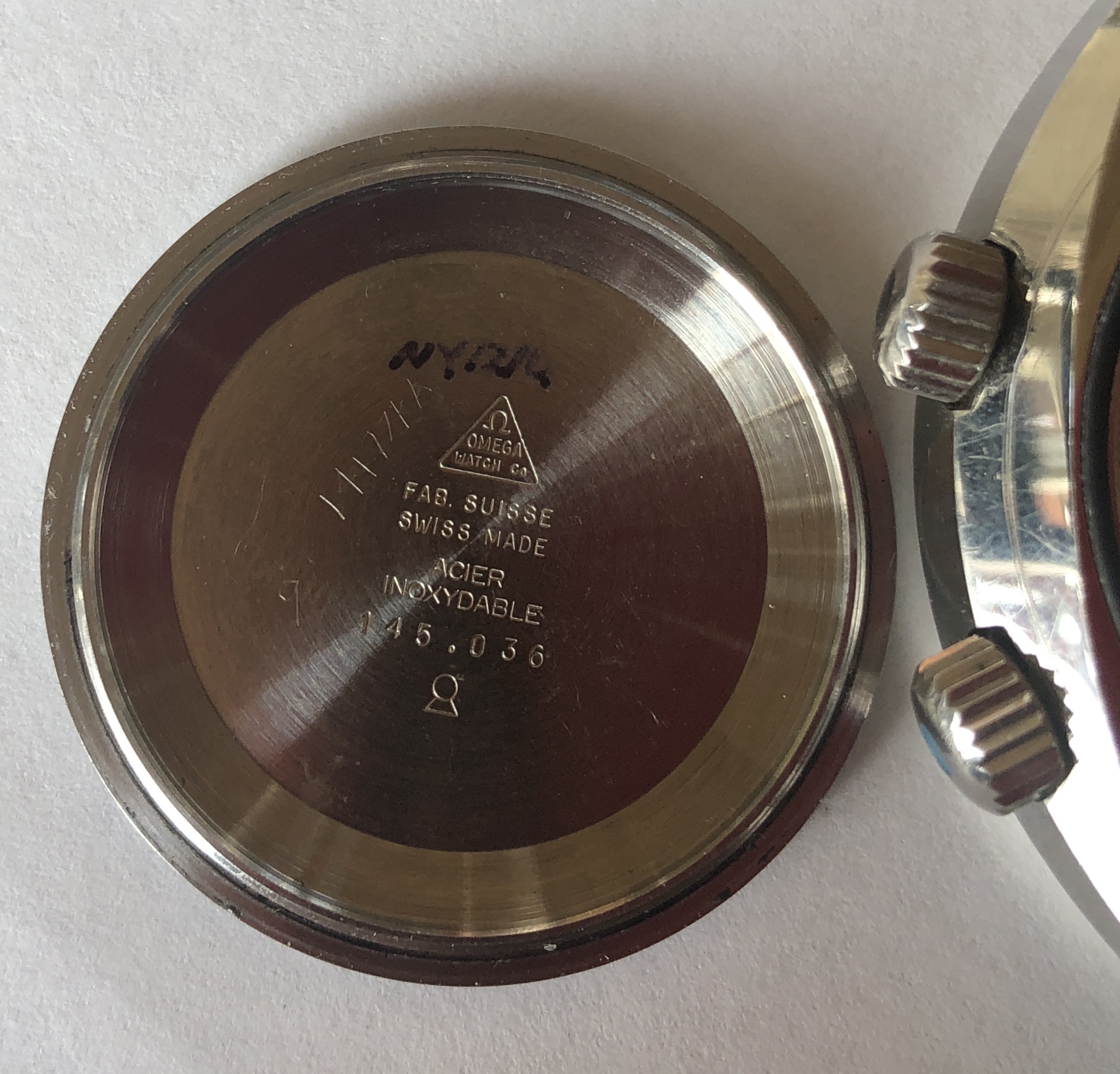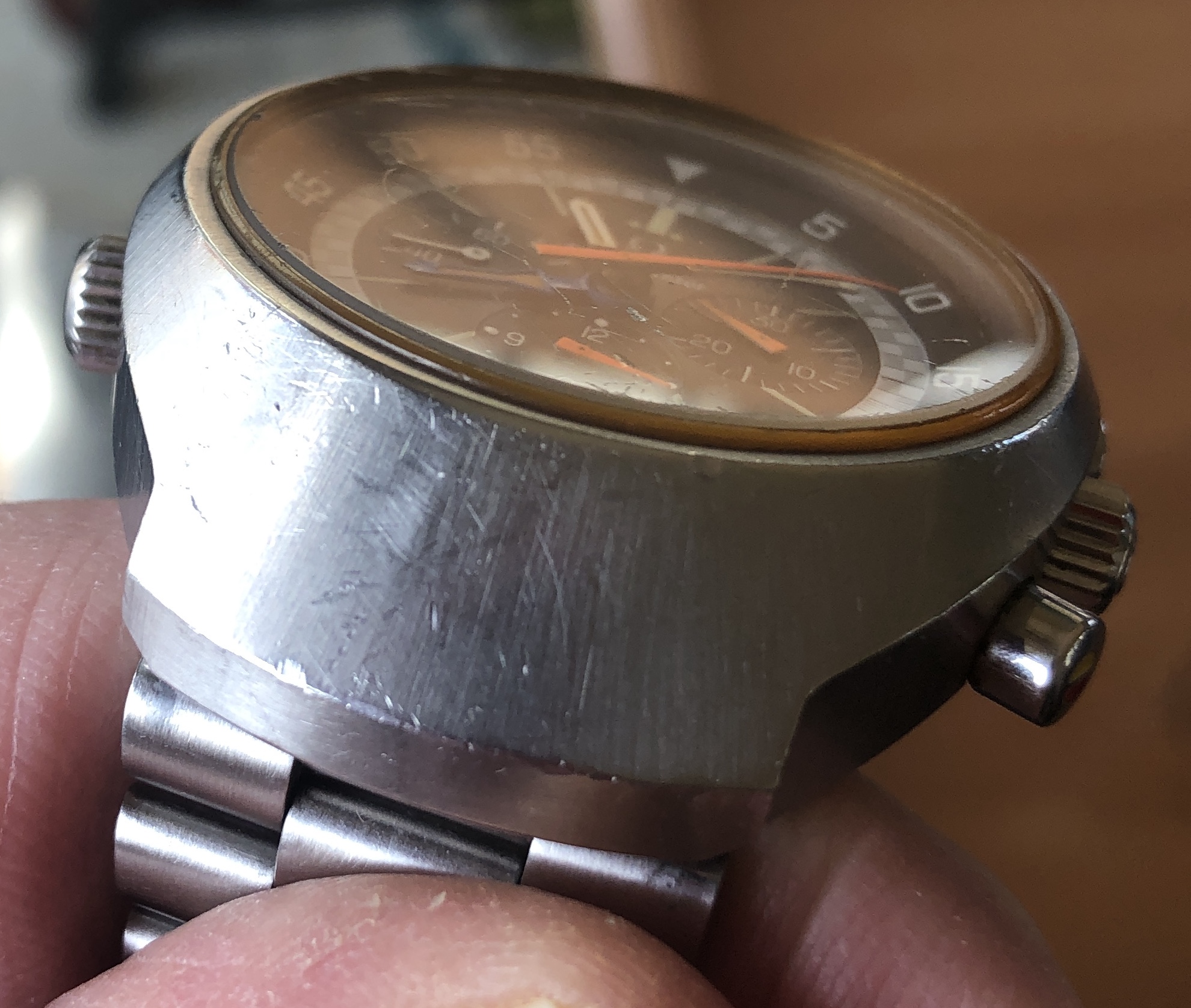 Case has original finish with correct radial brushing, and has wear, scuffs and marks commensurate with regular use. Both case and caseback show no evidence of having been polished or refinished.