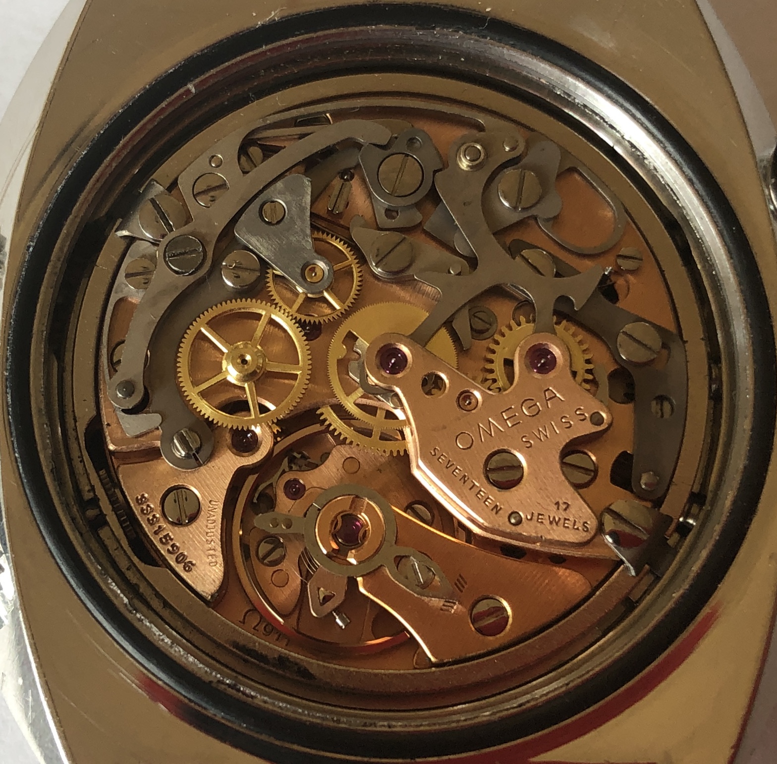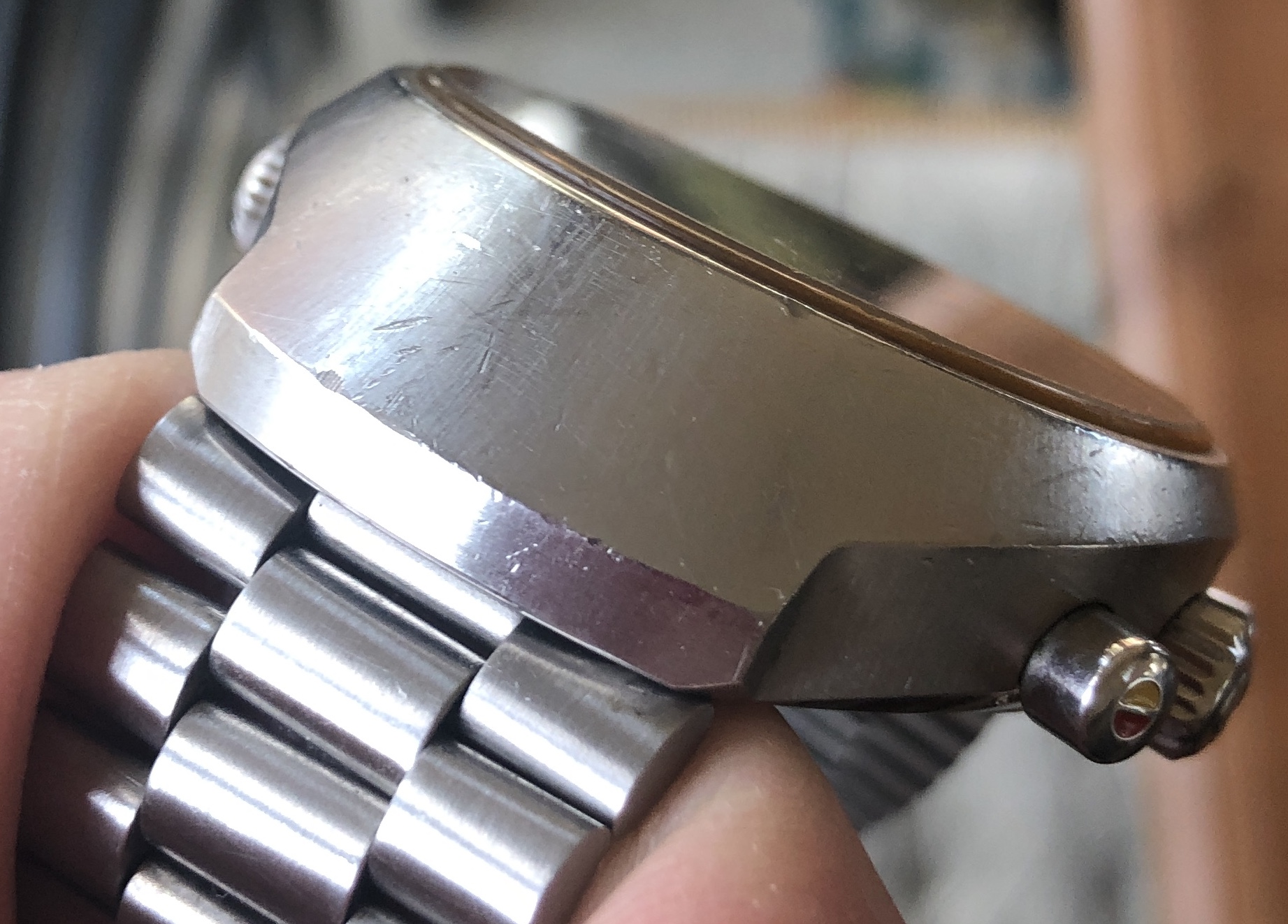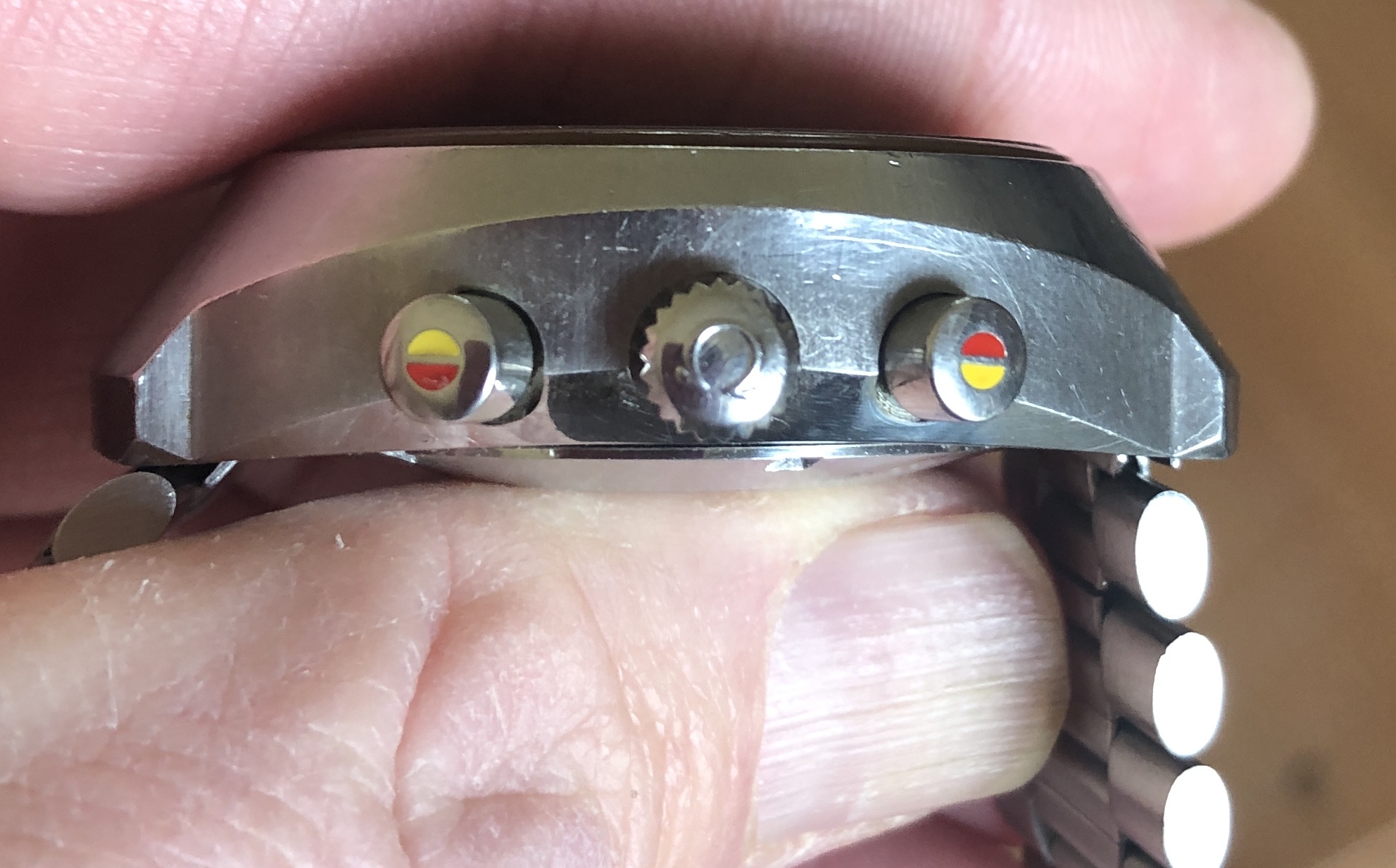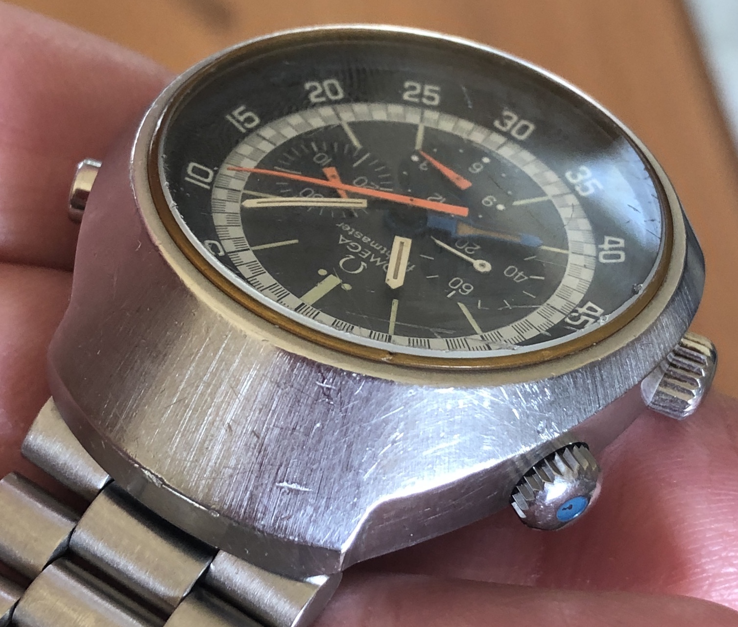 Case has original finish with correct radial brushing, and has wear, scuffs and marks commensurate with regular use. Both case and caseback show no evidence of having been polished or refinished.