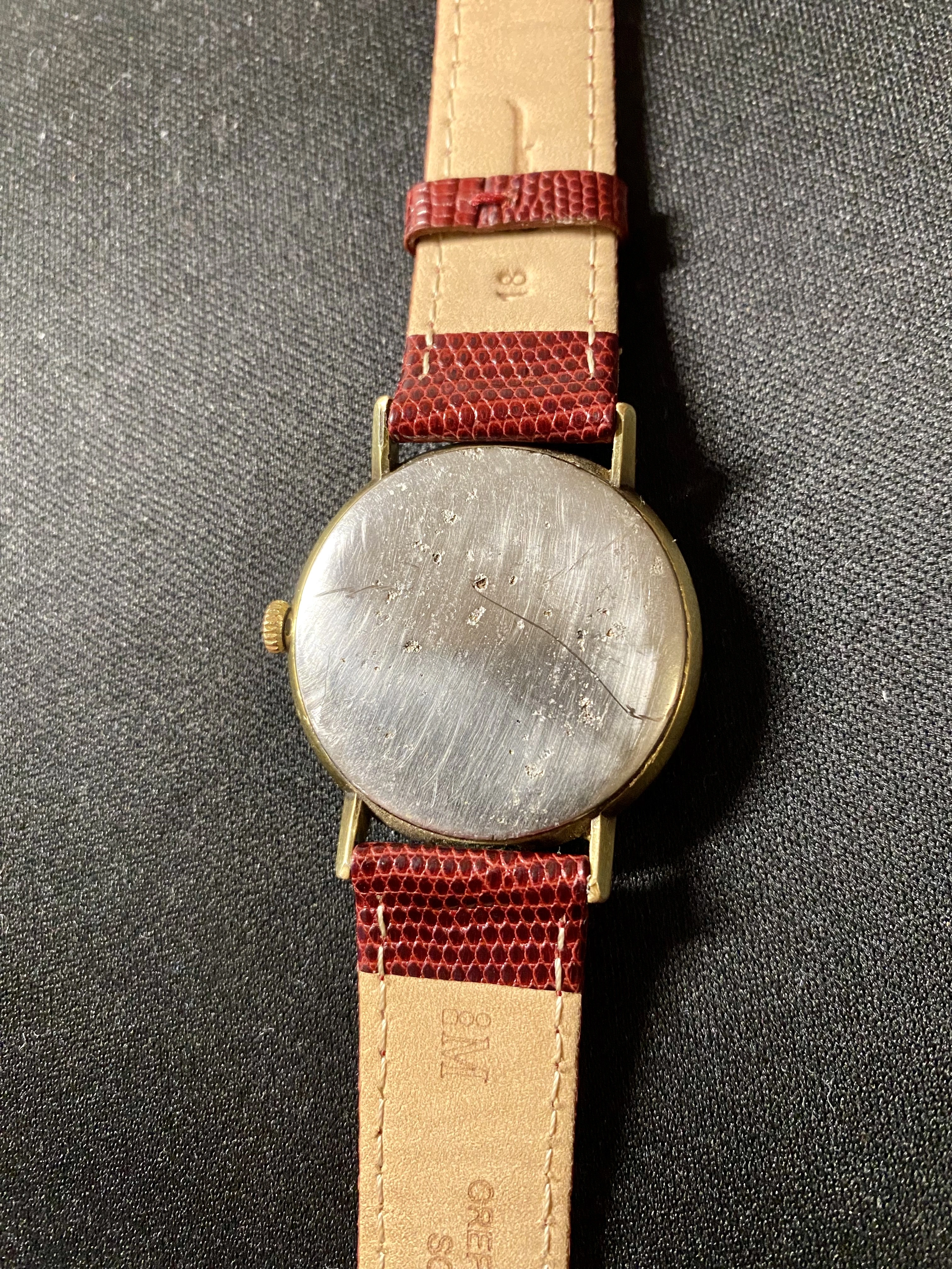 The dial also appears to be a reproduction/reprint, as it’s much too clean possibly considering the condition of the case and caseback. The “Omega” text looks a bit too thick and a crispy, and the indices—where on other watches I’ve seen onyx inserts—are simply drawn or printed on and poorly centered. (They do, however, match the style of the hands and the absence of the “T” marking on the dial).