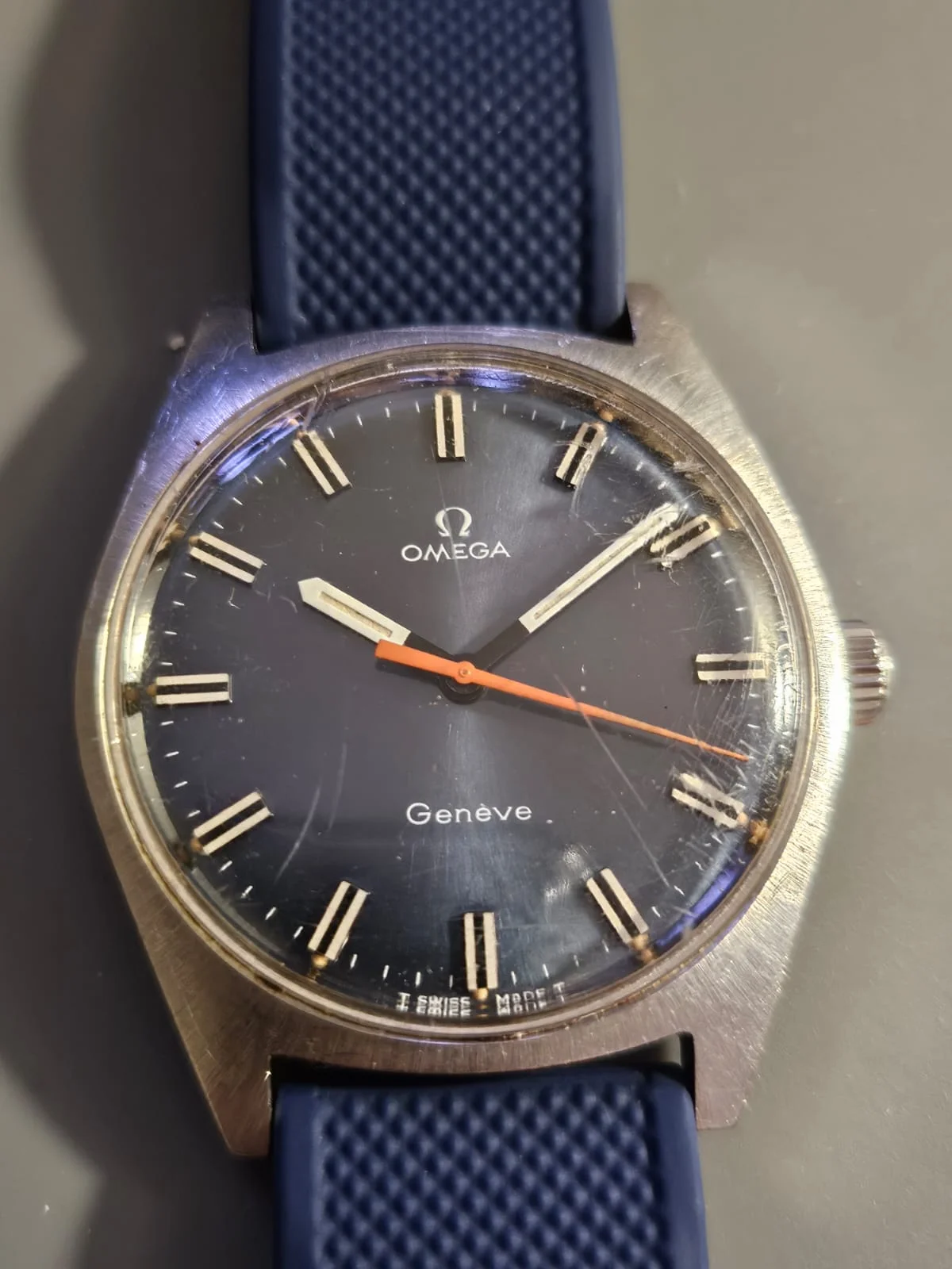 ·Up for sale is nice 135.041 Geneve with a blue sunburst dial and orange hand. Needs a little TLC (crystal polish/swap) but its in great overall condition.