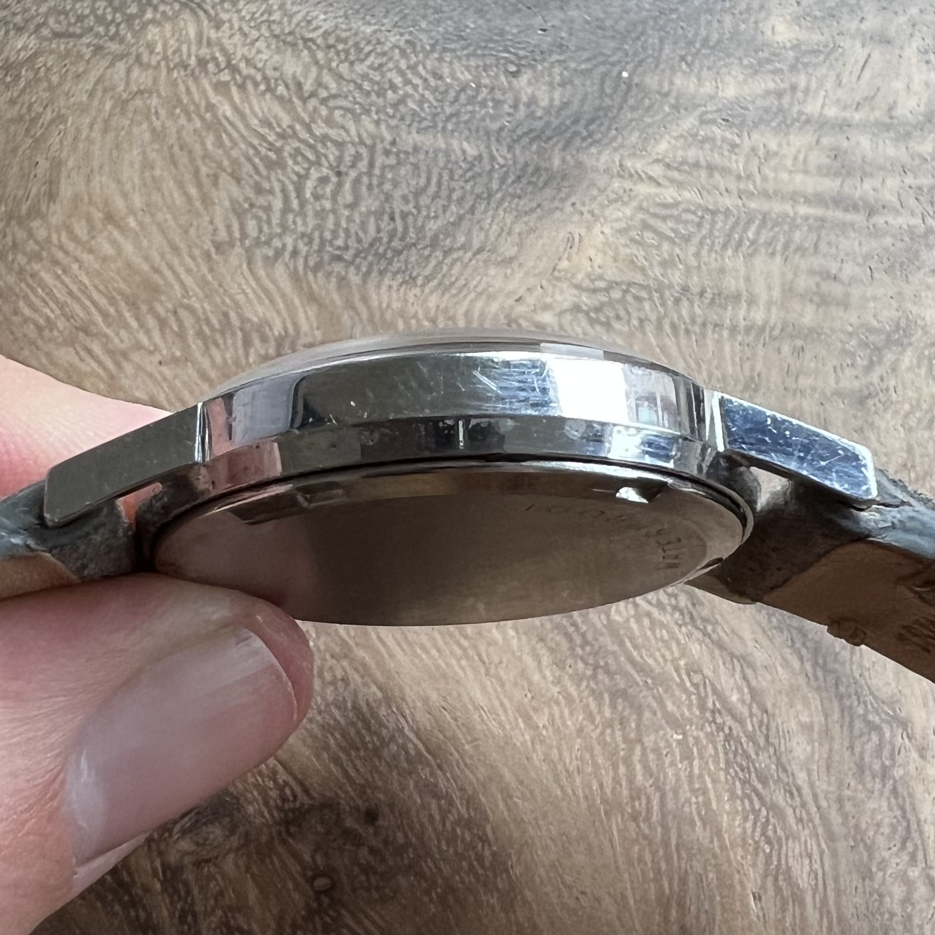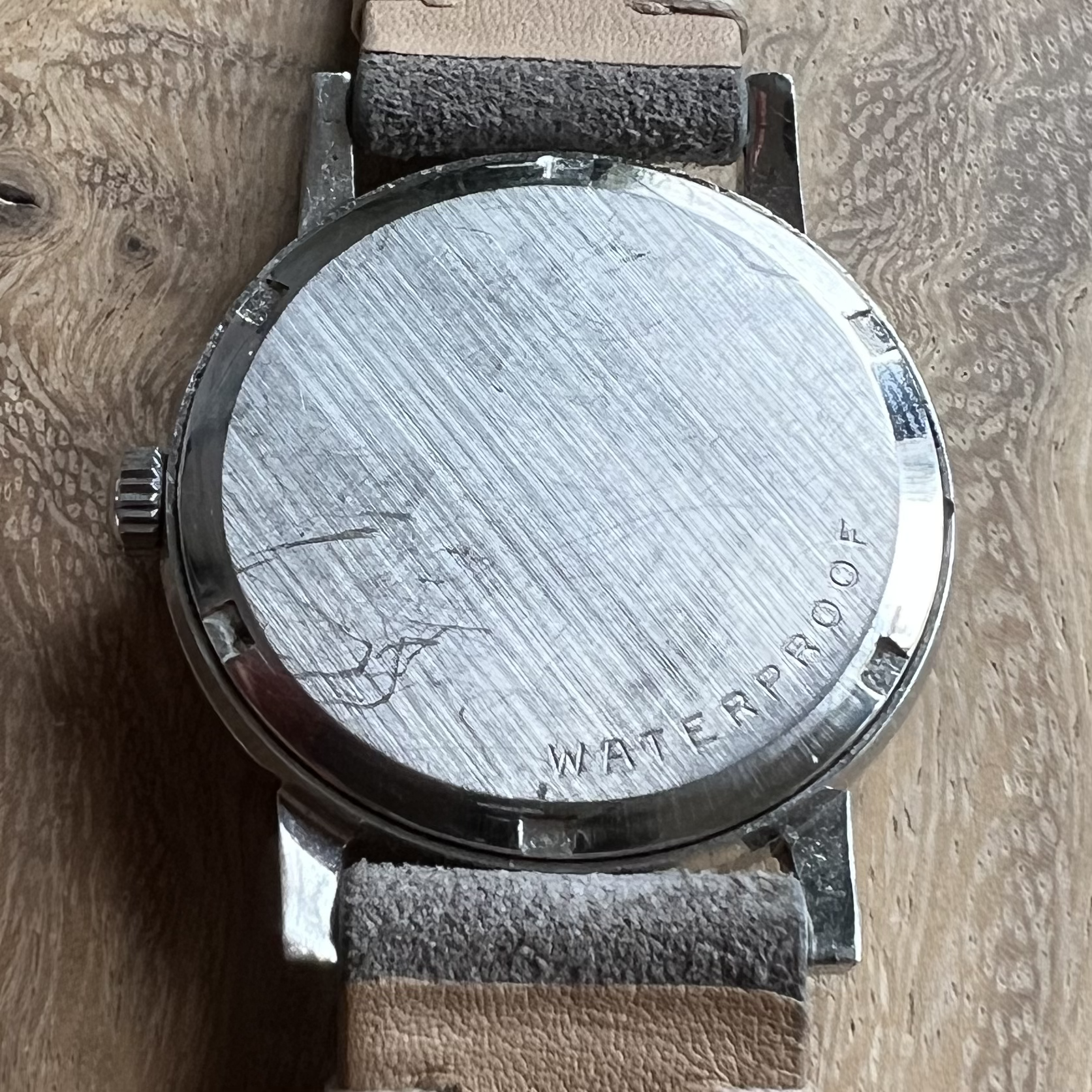 Bracelet: None. Comes with a rather fresh grey suede strap (with unmarked buckle) fitting the watch very nicely.