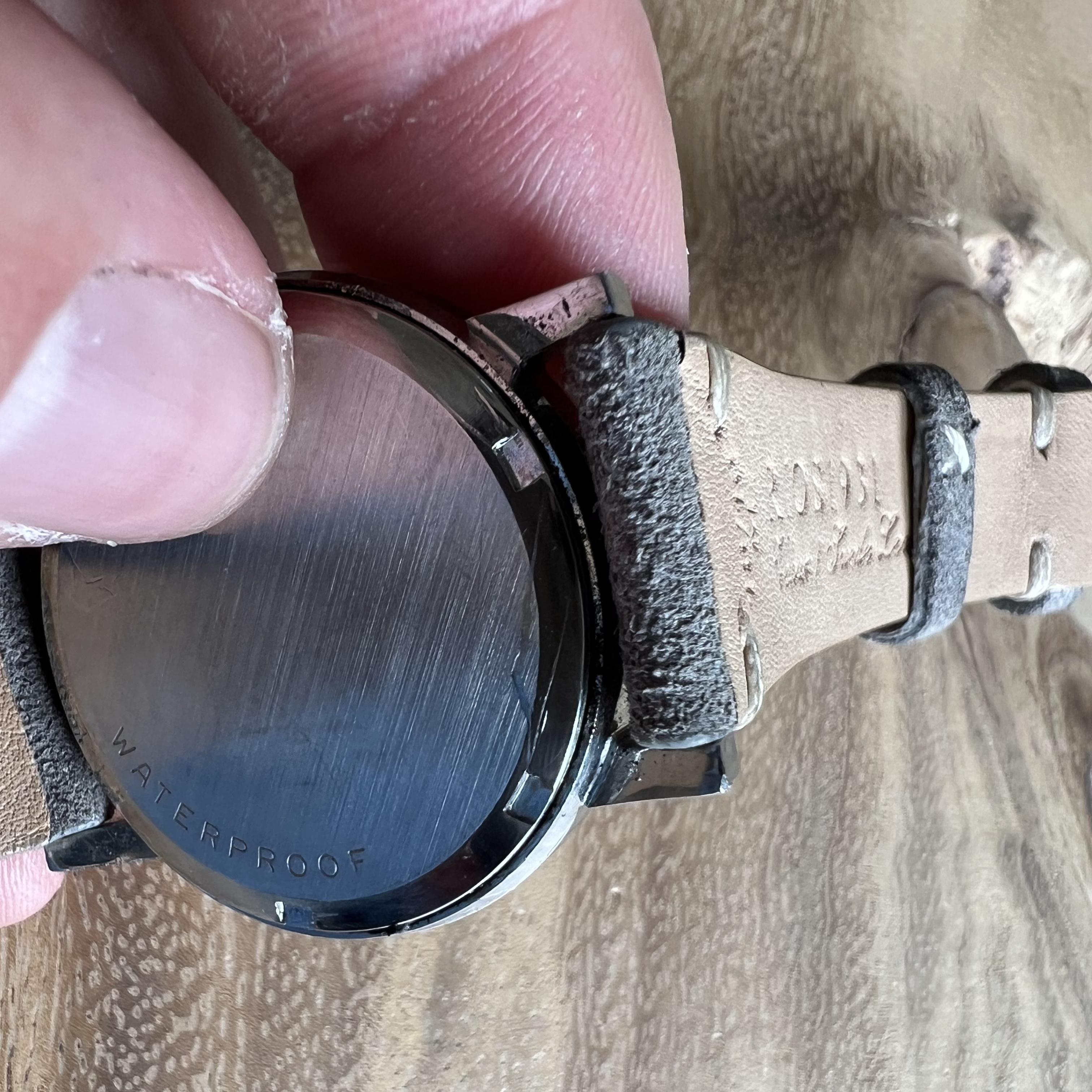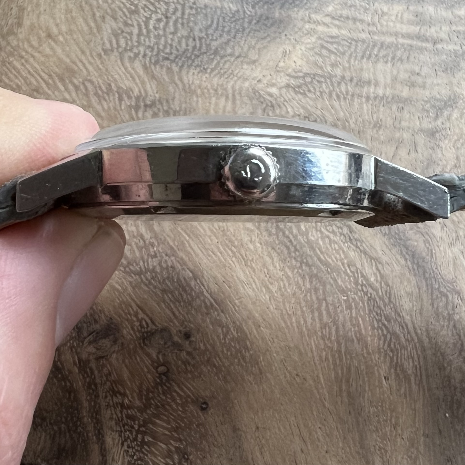 Case: Nice fat case with very sharp edges. Some hairline scratches but overall in good condition, most notable scratches are on the top of the lower right lug and on the case back. Note that there is some minor pitting near the upper right lug. Edit: picture of the affected area added below. Case back with crisp Waterproof engraving. Diameter 35mm excluding crown, but wearing slightly bigger as a result of its relatively large dial surface.