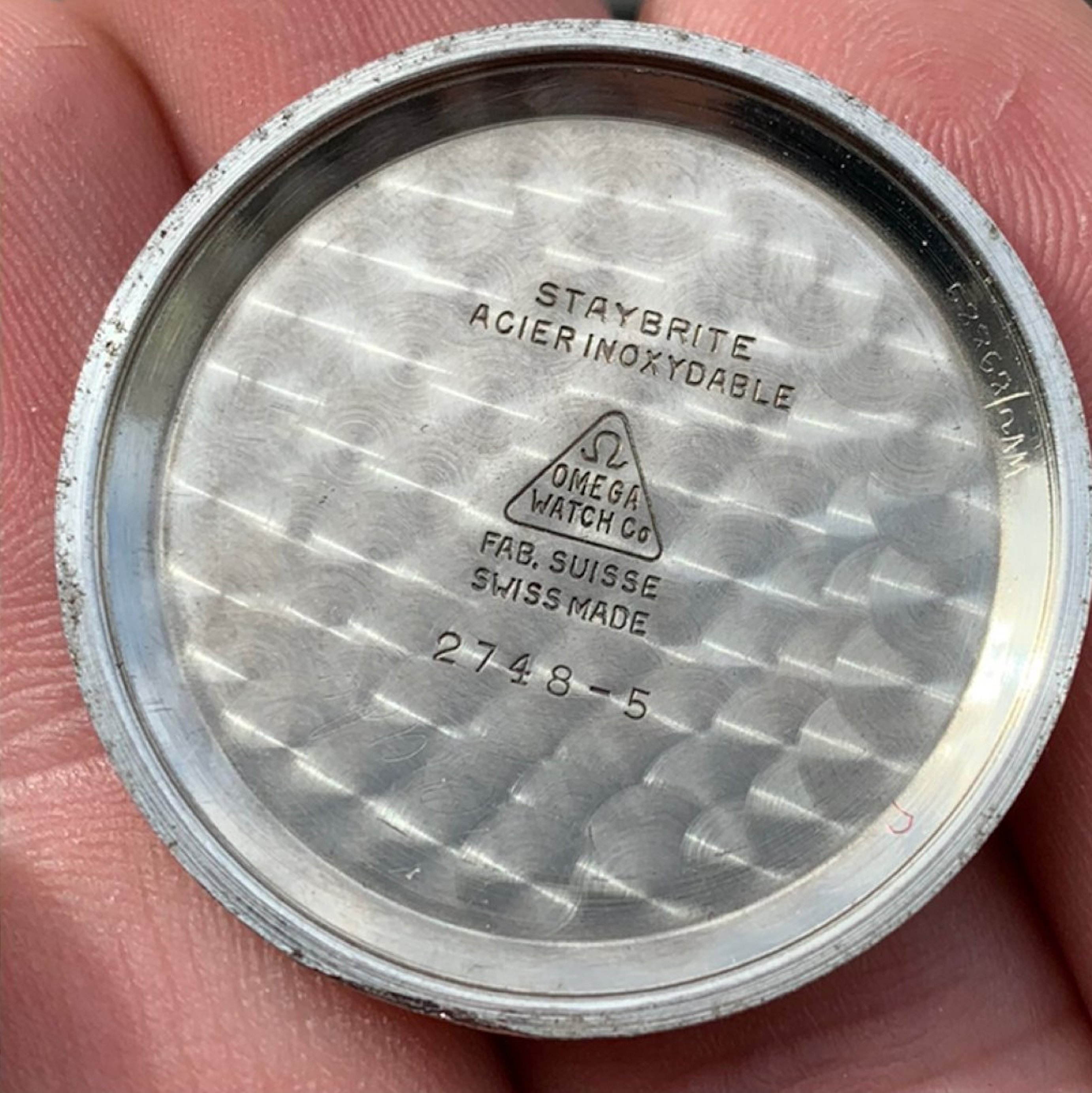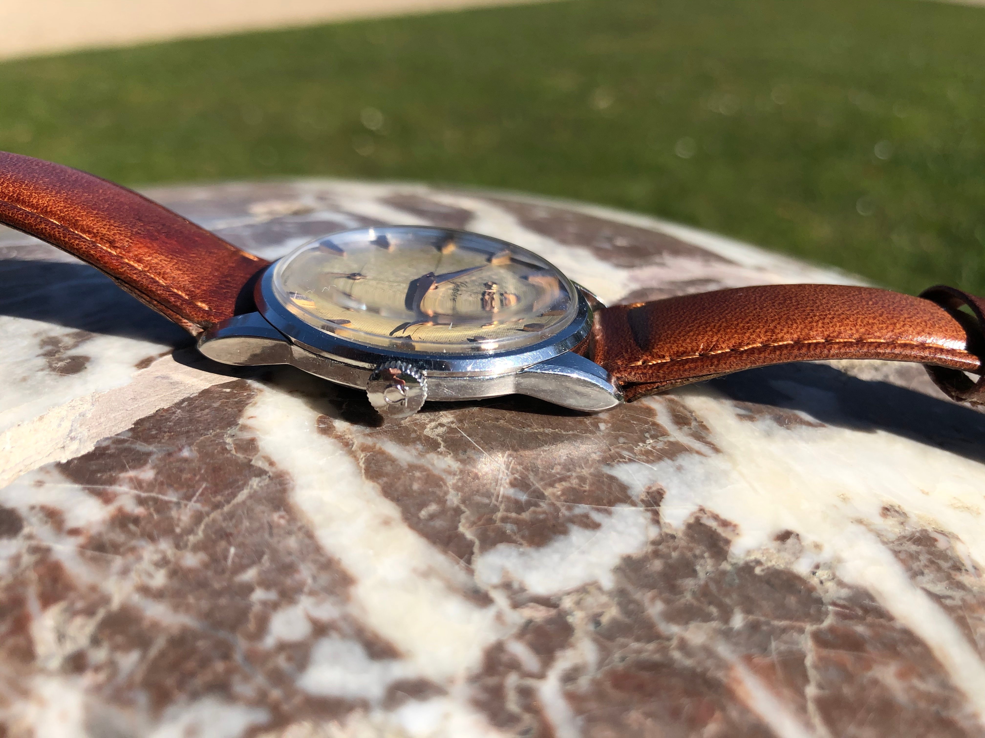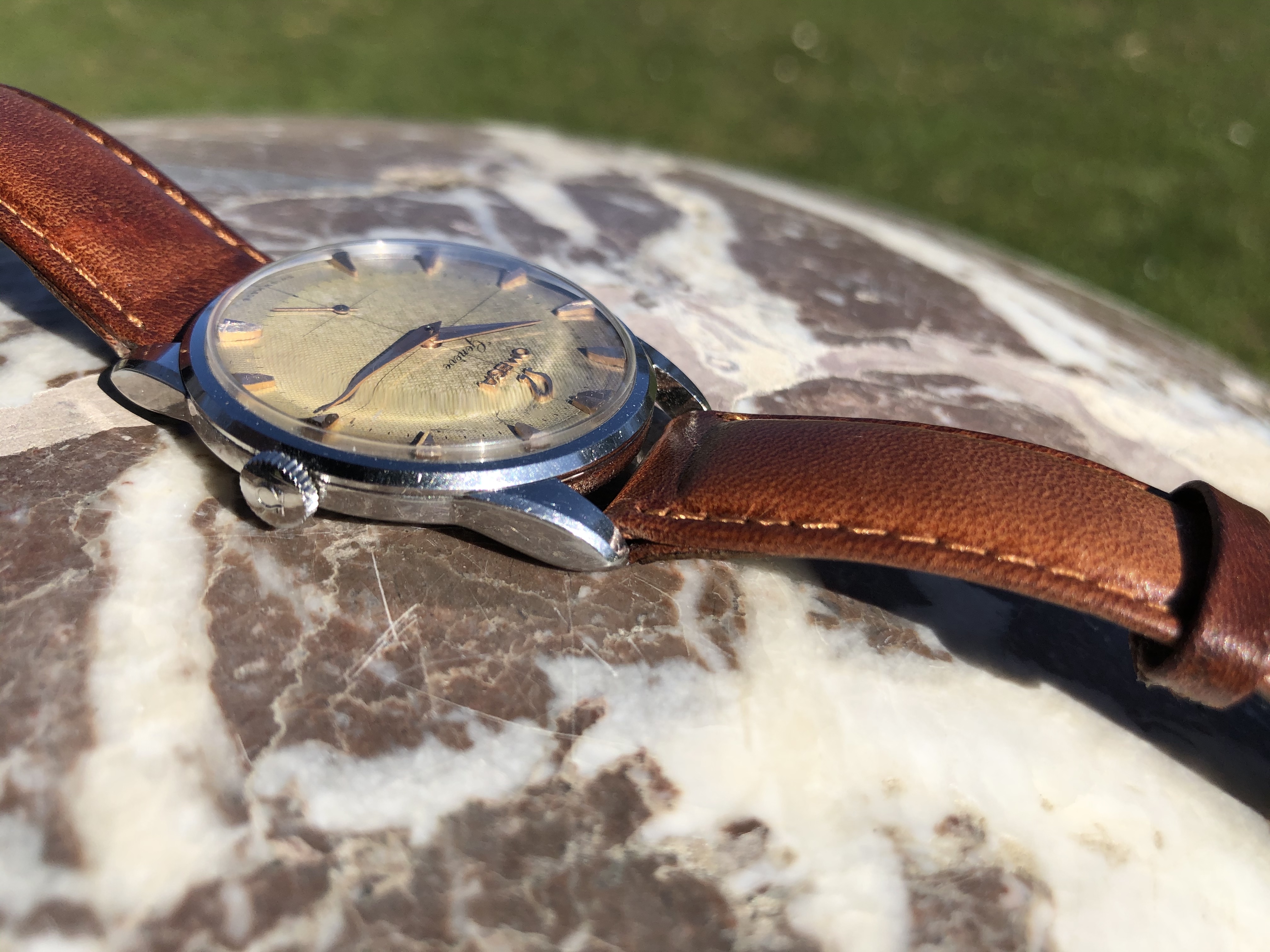 Dial: The two tone waffle dial shows patina and some damage. It still shows a charming appearance if you ask me.