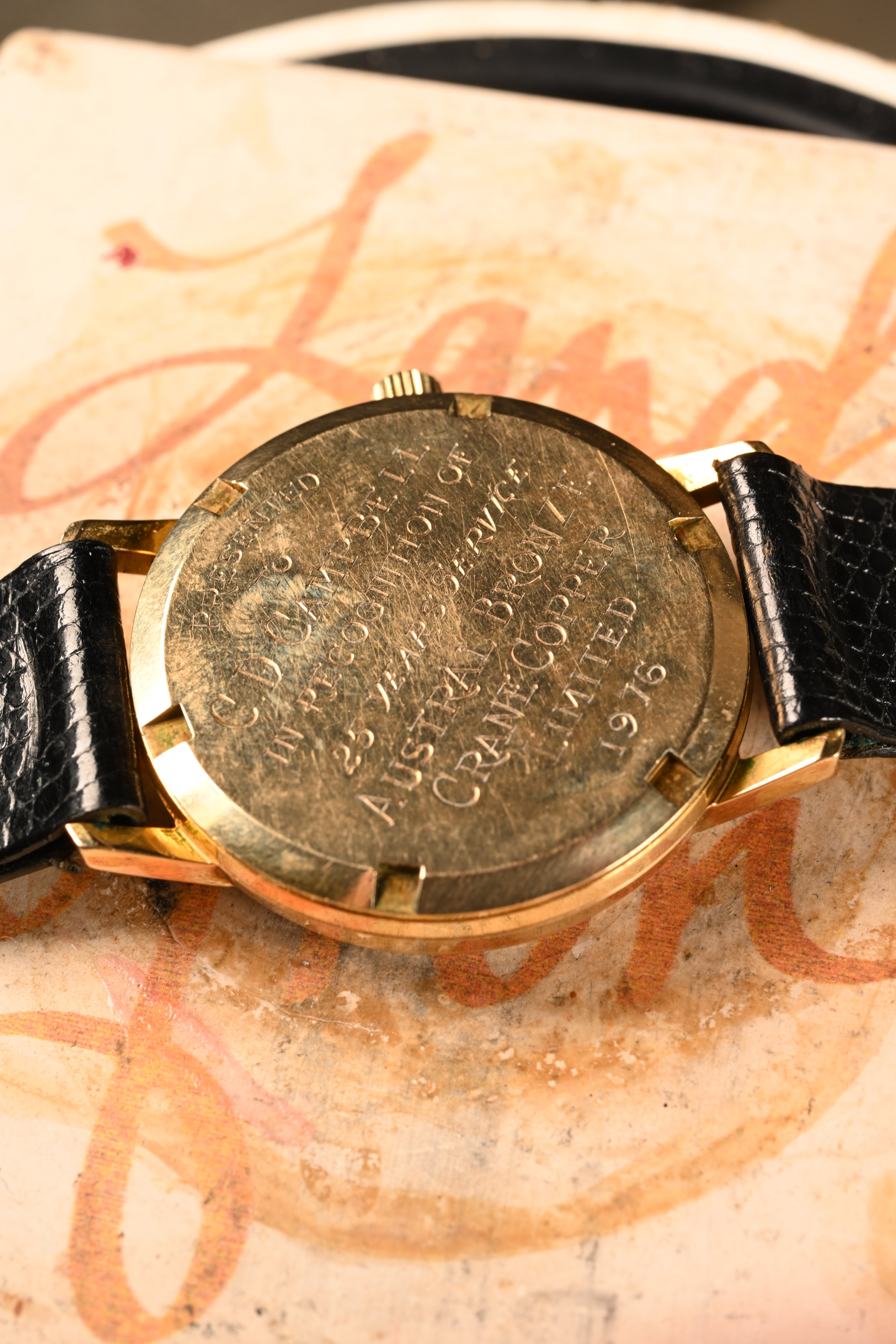 CASE: The 34mm case is in good shape. It is made out of 9kt yellow gold. It presents with wear commensurate for its age. The crystal has been replaced some time in the past. The crown has some wear but is correct for the reference. The screw down case back features an inscription that reads "Presented to C.D Campbell in Recognition of 25 years of service Austral Bronze Crane Copper Limited 1976."