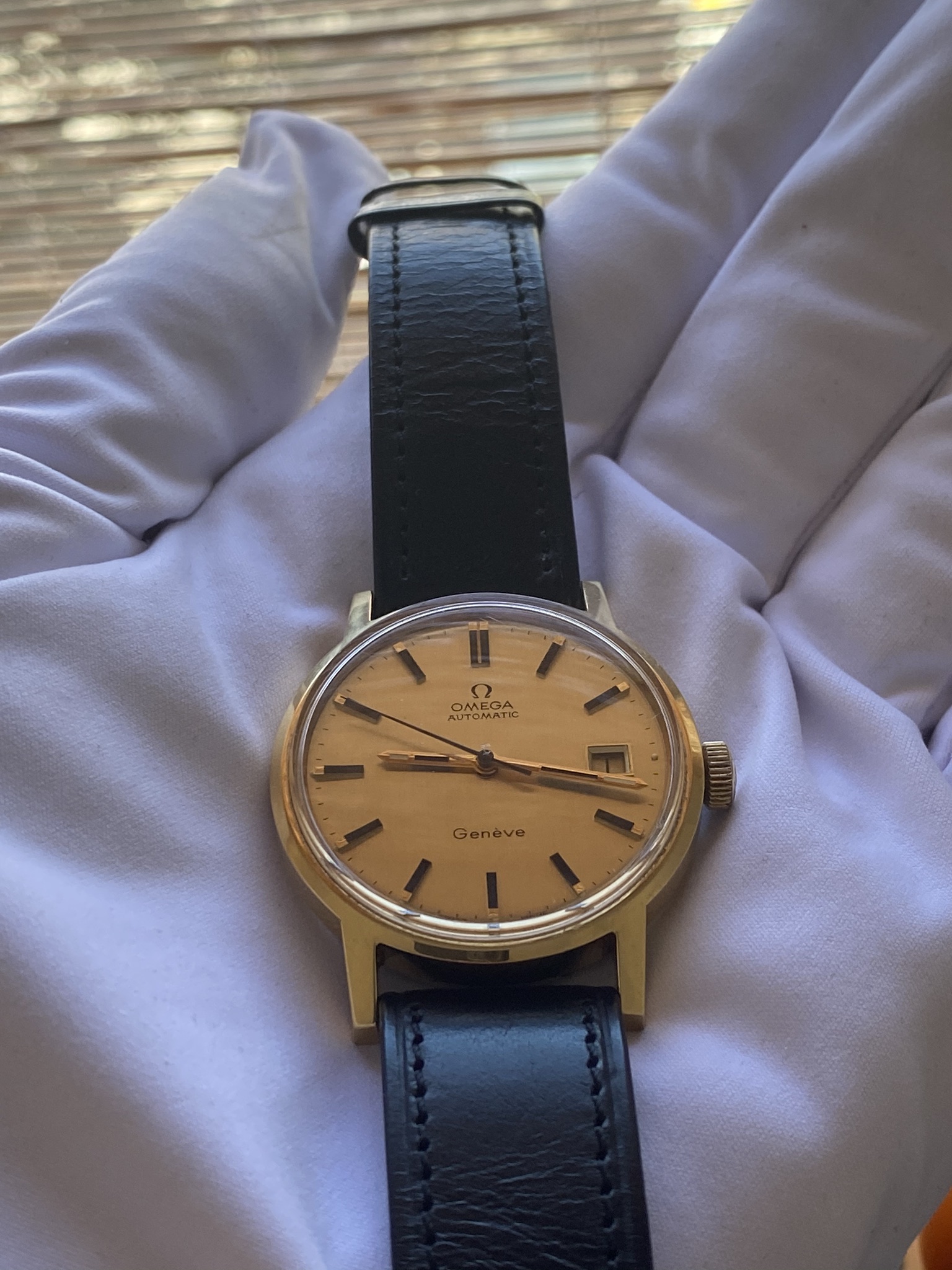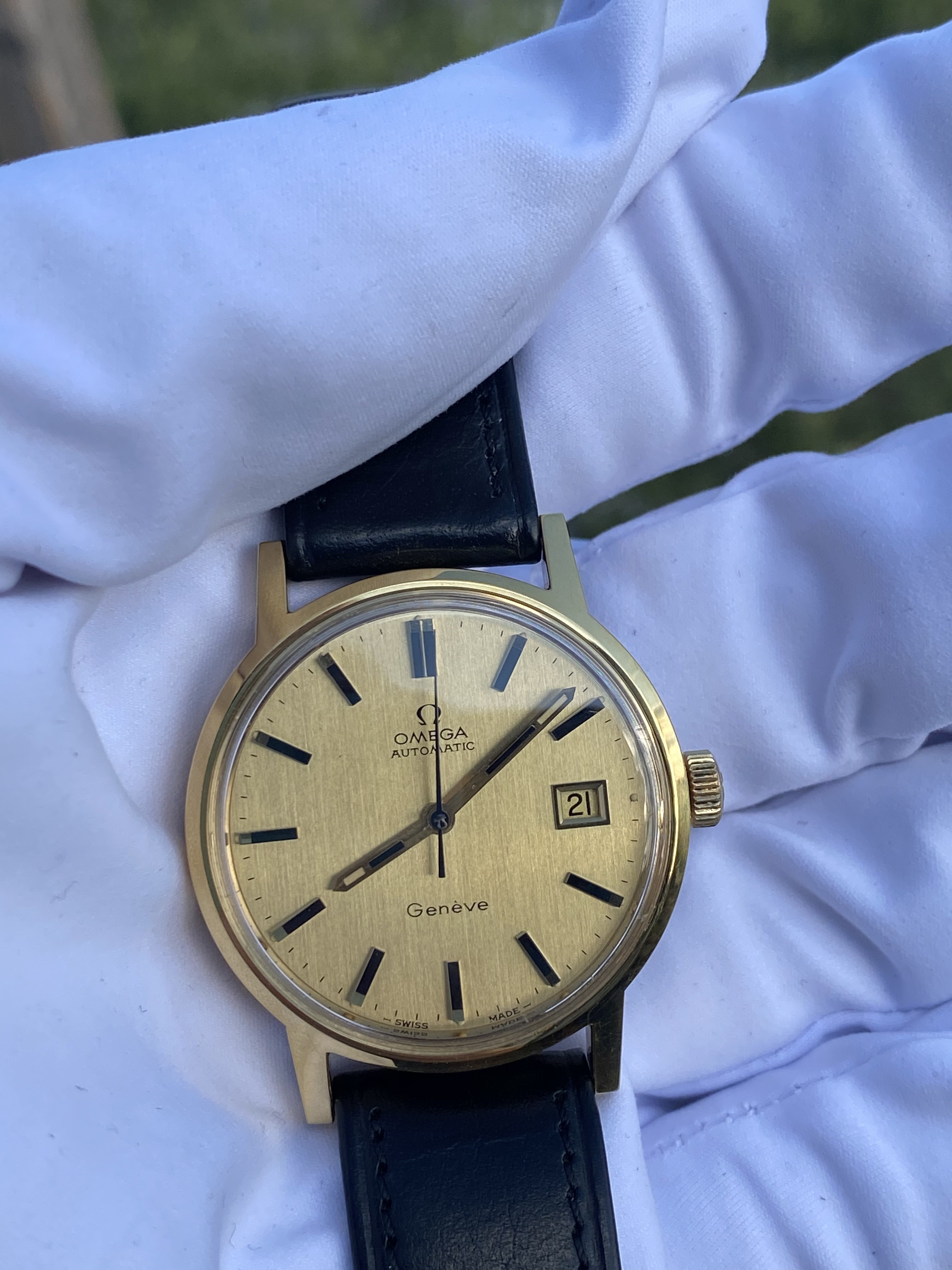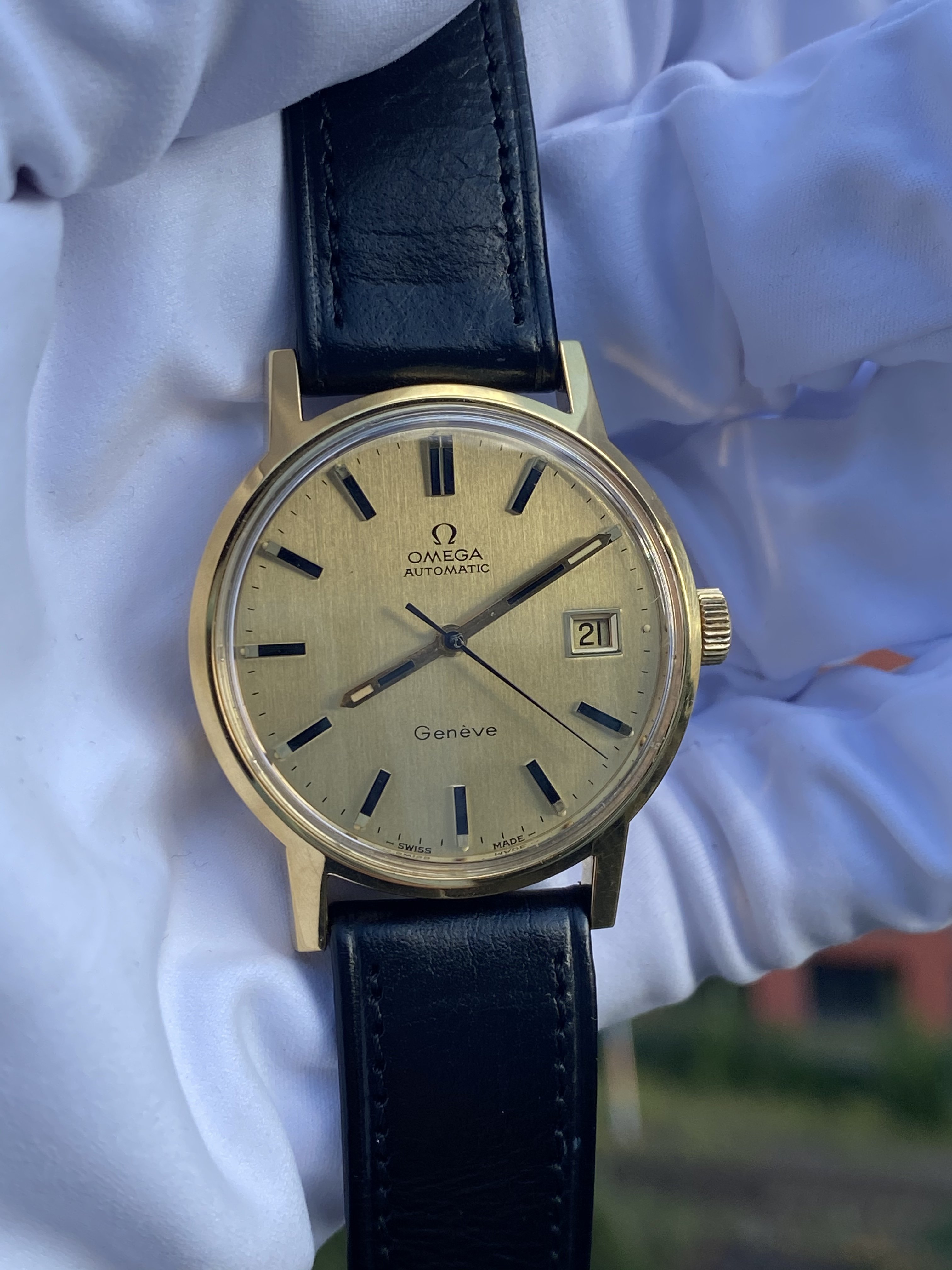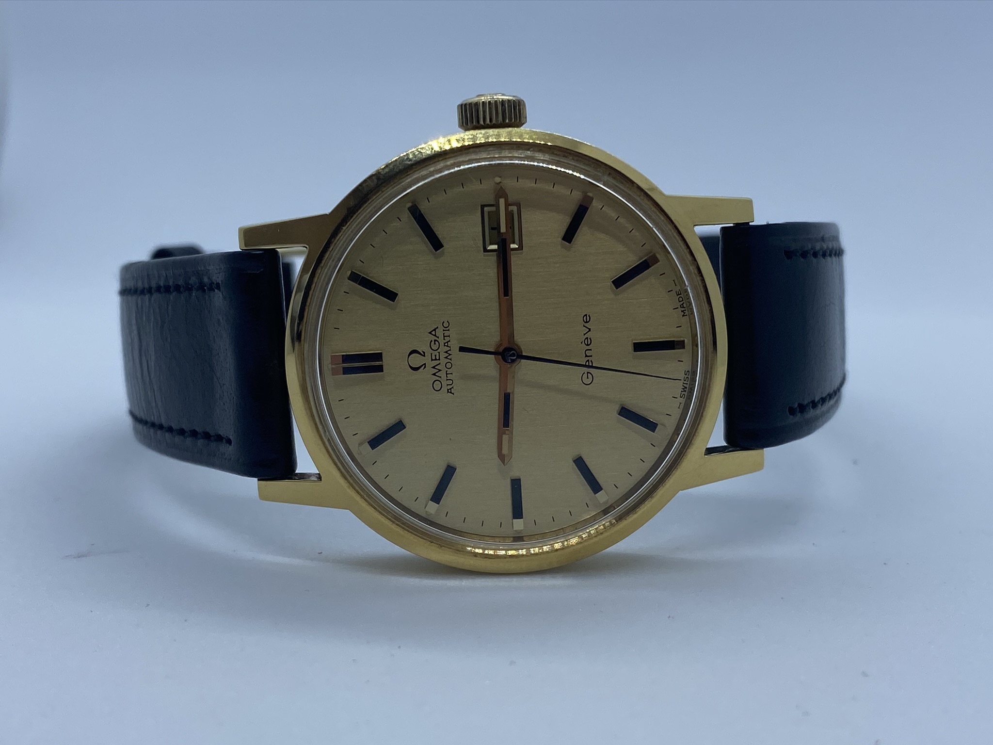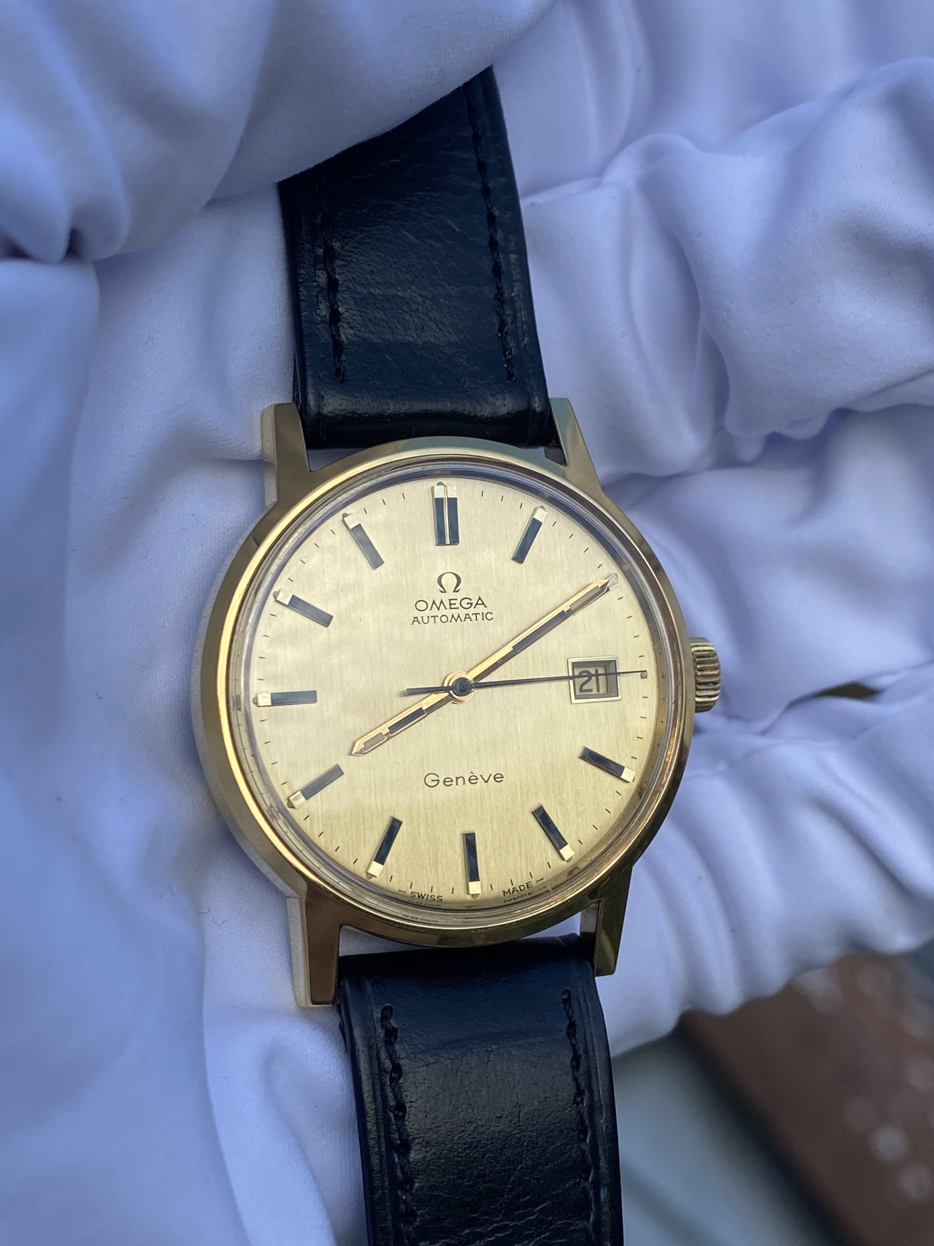 The watch in question is a ca. 1972 Omega Genève Automatic, ref. 166.0098 with a golden brushed dial: