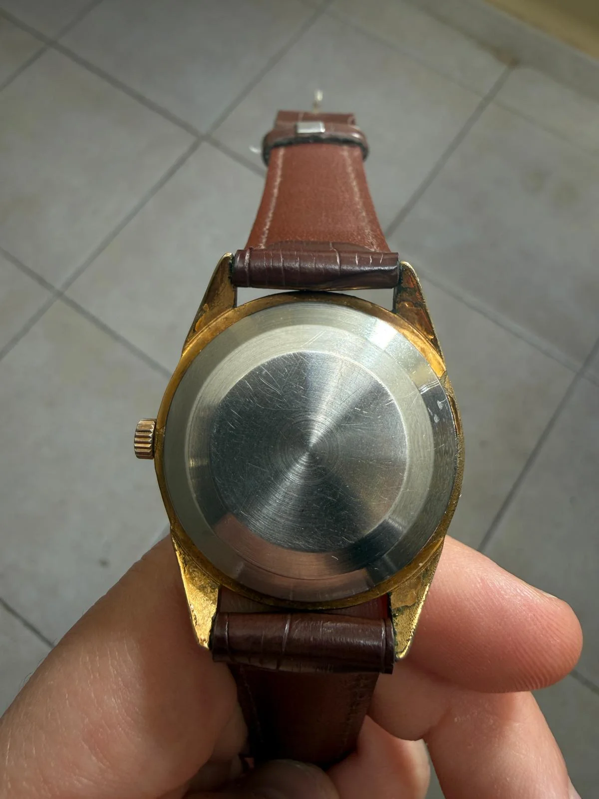 • Gold-colored case shows significant wear on the lugs (appears to be gold plated)