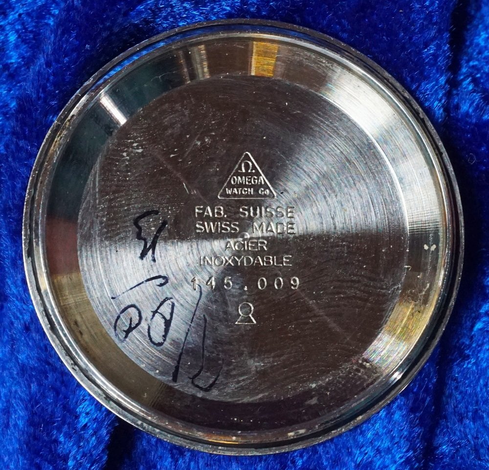 Inside case back inscription: Omega symbol and Omega Watch Company, inside triangle; Fab. Suisse; Swiss Made; Acier Inoxydable; 145.009; stylized Keyhole symbol