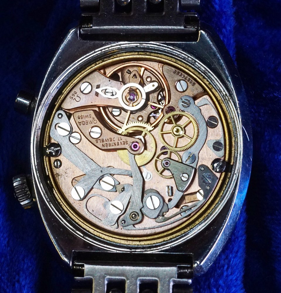 This Chronostop contains a nice Omega caliber 865 hand wind 17 Jewel “no date” movement, which is a lesser-functioned version of the cal. 861 used in earlier Speedmasters. It has decent plating and minimal decoration, and has no indications of being adjusted by Omega.