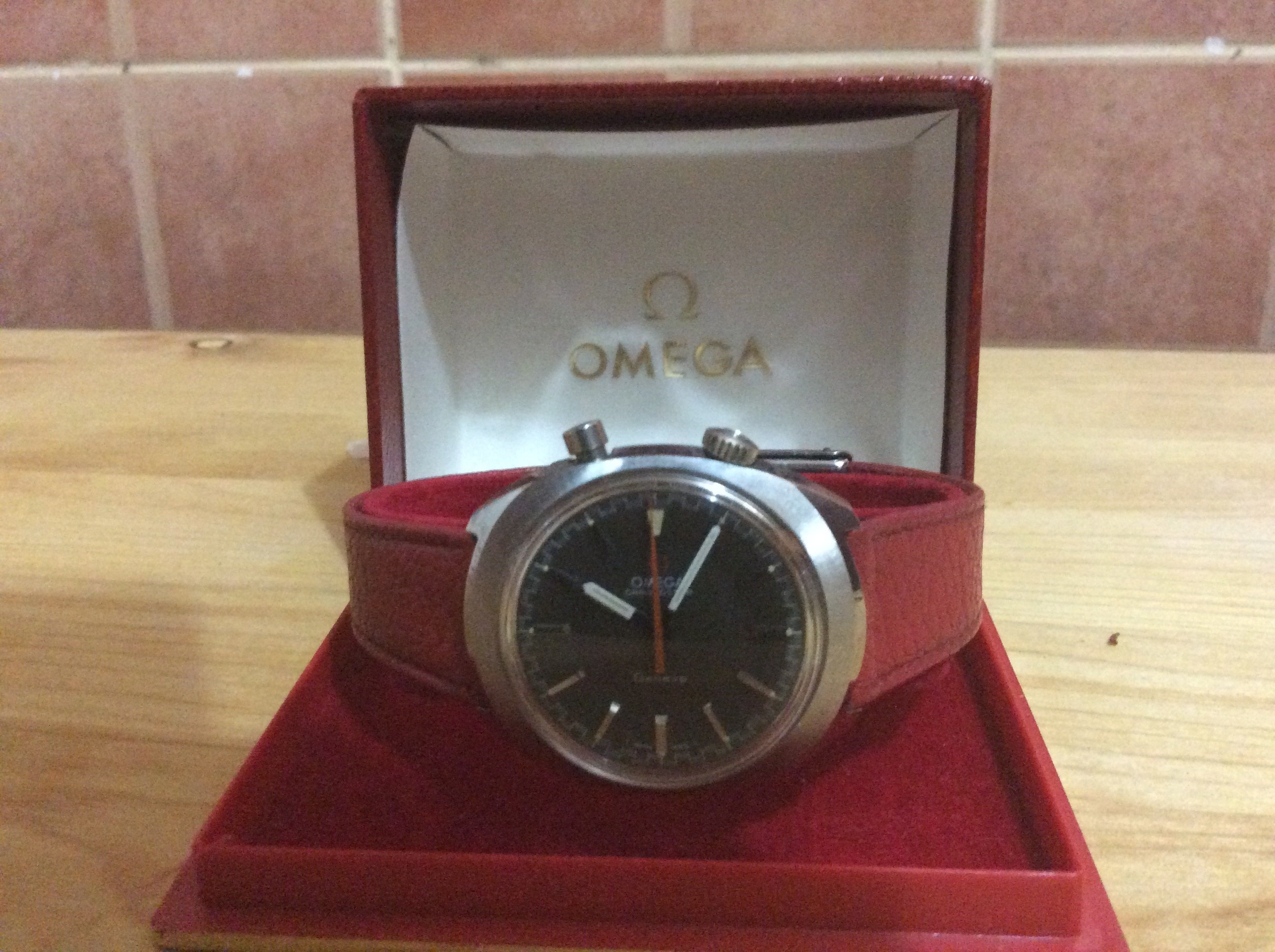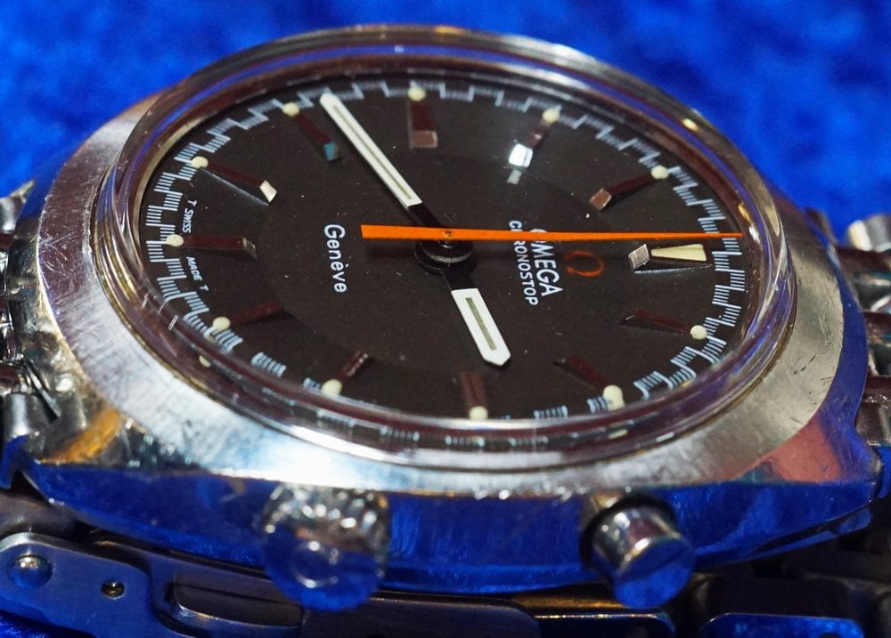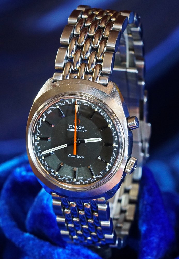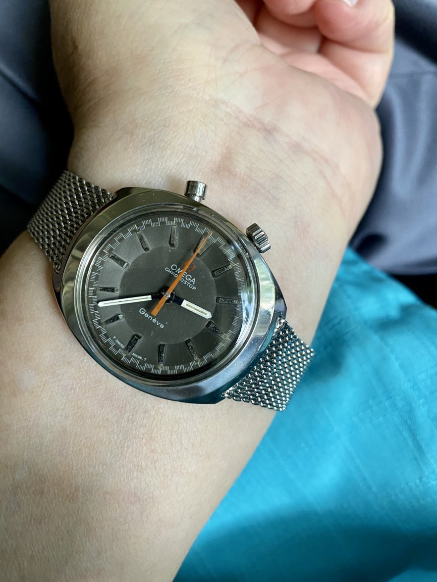 ·Recently got to check another classic Omega off my wishlist, this faded black/grey dialed Chronostop. I had been wanting a “Driver” or even an Italian Dynamic case model, but I wasn’t going to pass this up at the price. Now I am pleased I did, as a “no date” was high on my list, and this fit that bill. I don’t mind that the case shows plenty of use, especially since I see no evidence of buffing. It was hard to tell about the dial at bidding time, as the hesalite was rather wounded. Needless to say, some superfine sanding boards and polywatch revealed this near flawless face. I have already put a tiny scratch back on the crystal, just left of the “Chronostop”. I am cool with that, as I intend to wear it frequently once it returns from service. Even though technically this is smaller than almost all of my Omegas, it wears larger due to the case shape and very defined boxed crystal. Perhaps my next one will be an Italian version, and I’ll be fussier with that…and likely rarely wear it. Much thanks to DSIO for the extraordinary multi-part treatise on these rather unique Omegas.