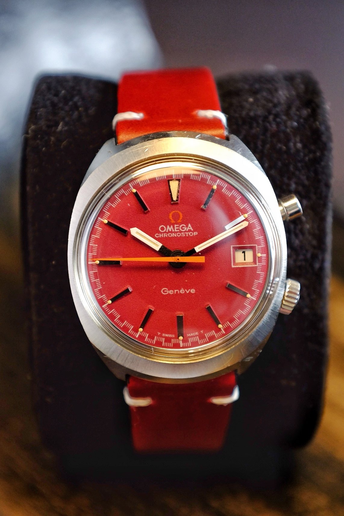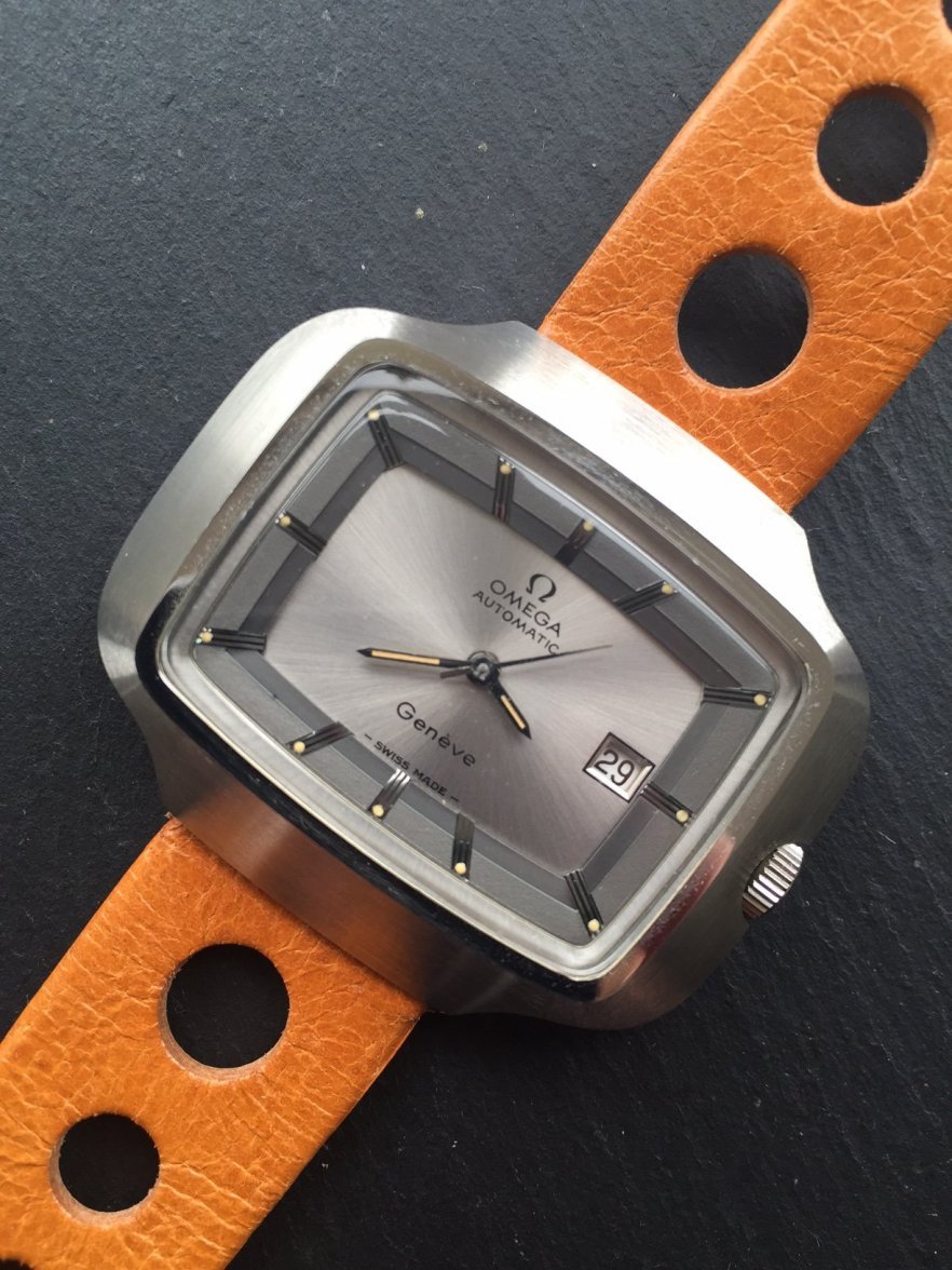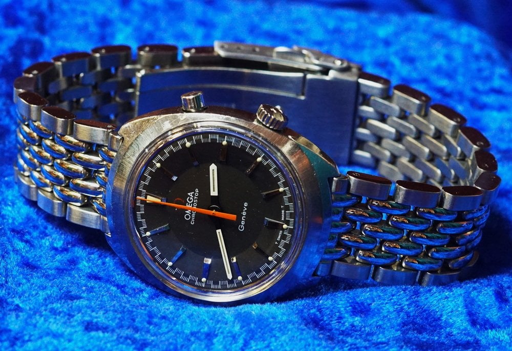 ·Recently got to check another classic Omega off my wishlist, this faded black/grey dialed Chronostop. I had been wanting a “Driver” or even an Italian Dynamic case model, but I wasn’t going to pass this up at the price. Now I am pleased I did, as a “no date” was high on my list, and this fit that bill. I don’t mind that the case shows plenty of use, especially since I see no evidence of buffing. It was hard to tell about the dial at bidding time, as the hesalite was rather wounded. Needless to say, some superfine sanding boards and polywatch revealed this near flawless face. I have already put a tiny scratch back on the crystal, just left of the “Chronostop”. I am cool with that, as I intend to wear it frequently once it returns from service. Even though technically this is smaller than almost all of my Omegas, it wears larger due to the case shape and very defined boxed crystal. Perhaps my next one will be an Italian version, and I’ll be fussier with that…and likely rarely wear it. Much thanks to DSIO for the extraordinary multi-part treatise on these rather unique Omegas.