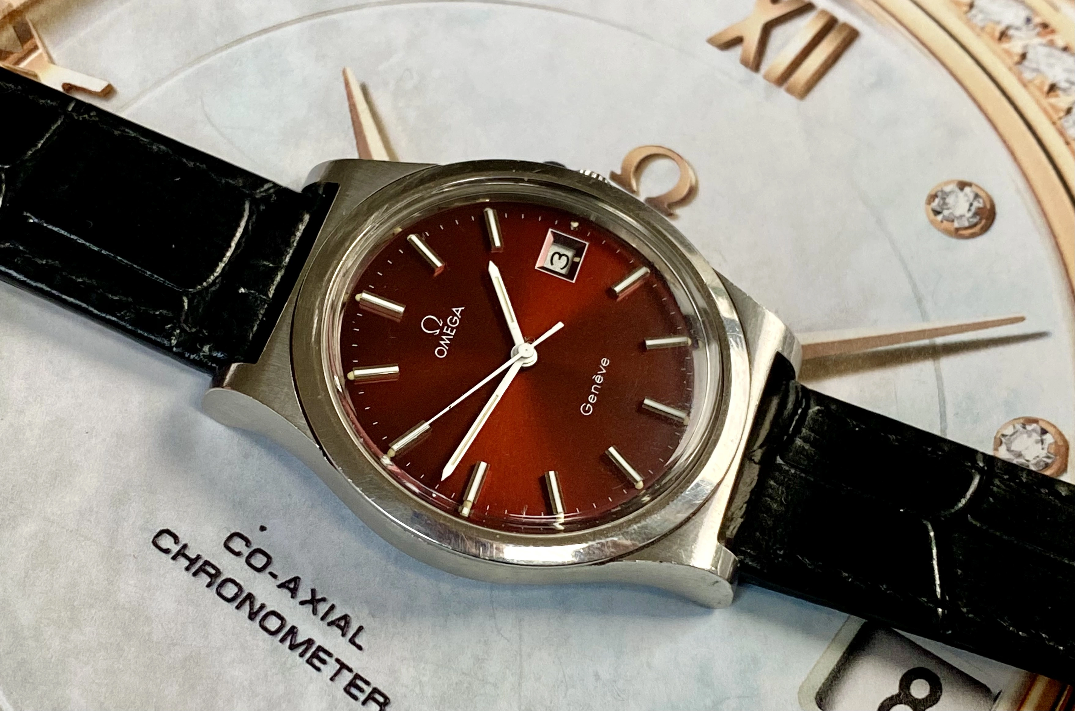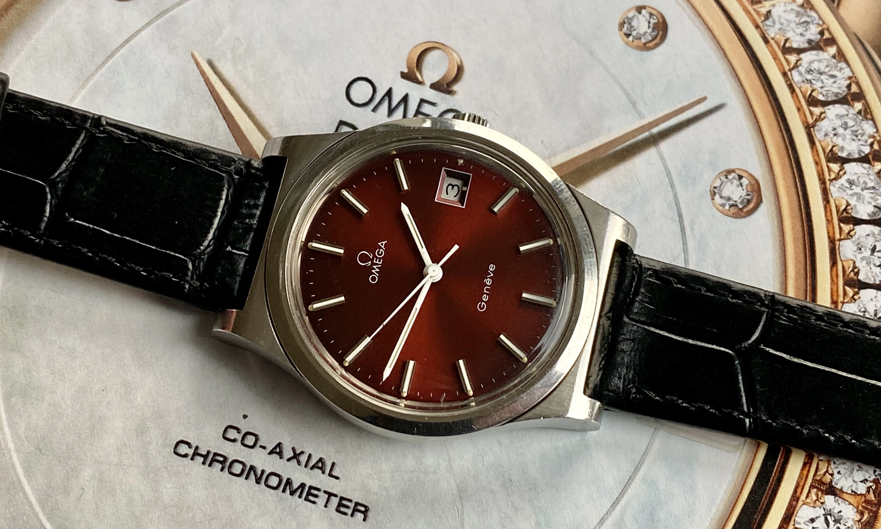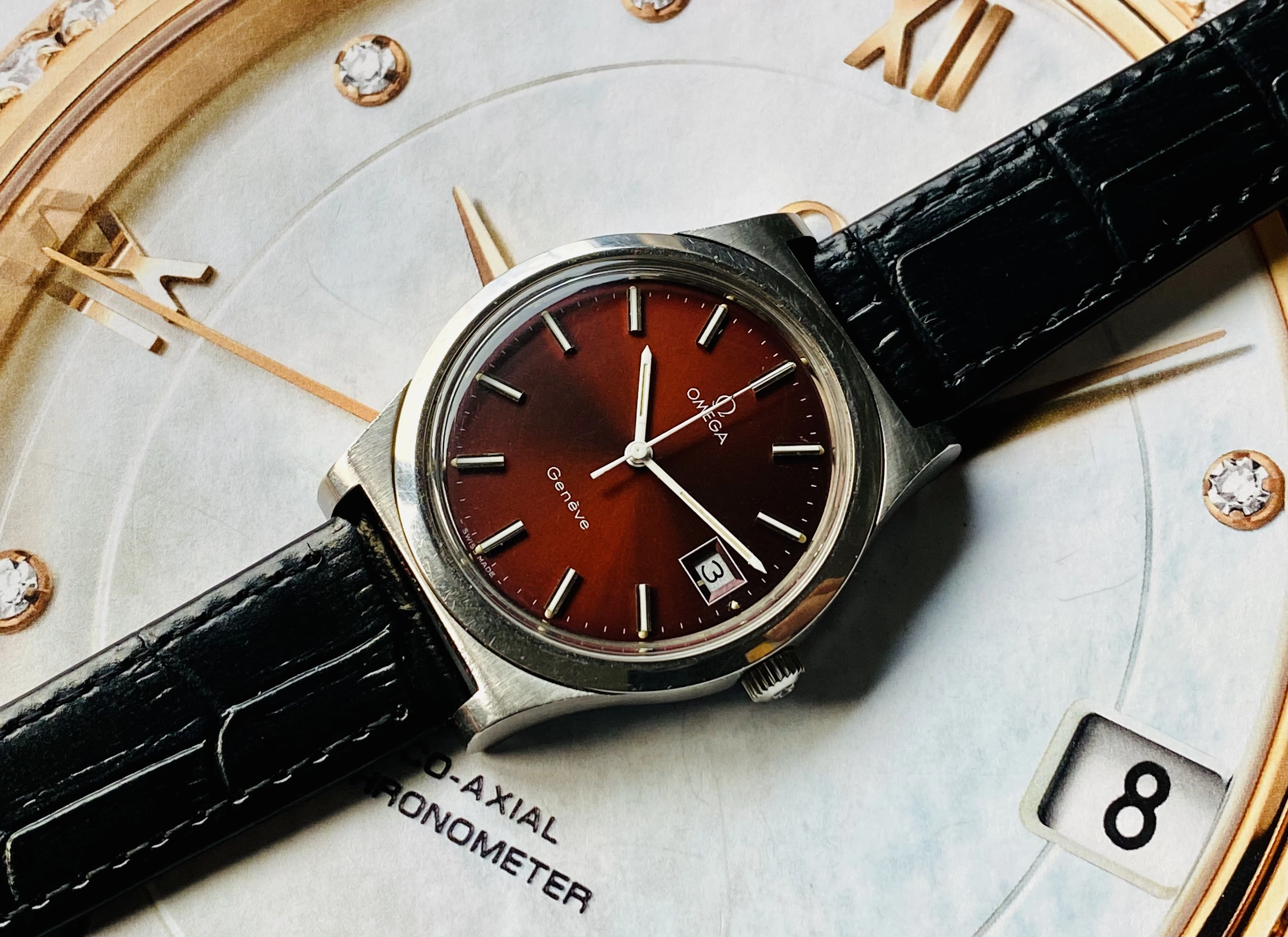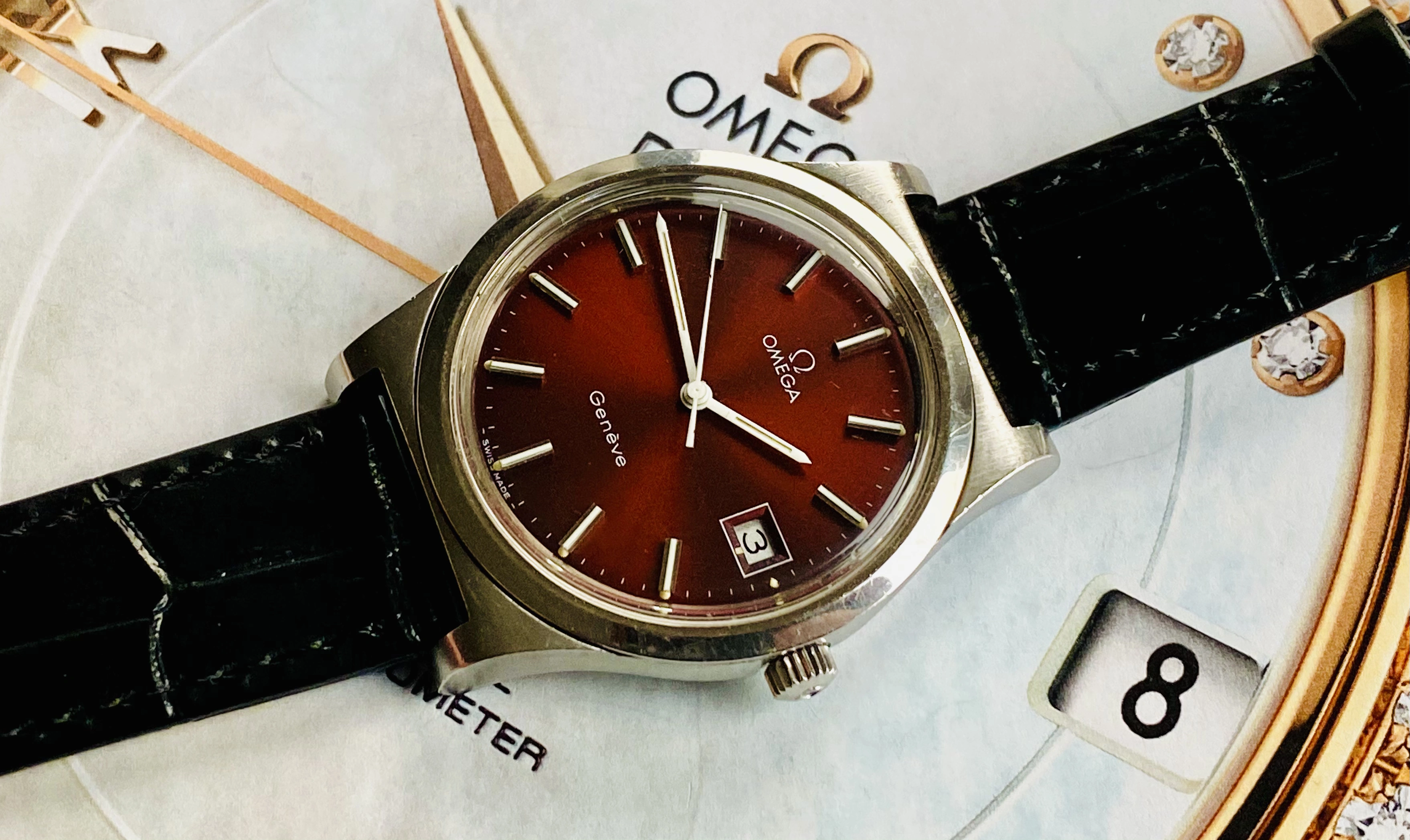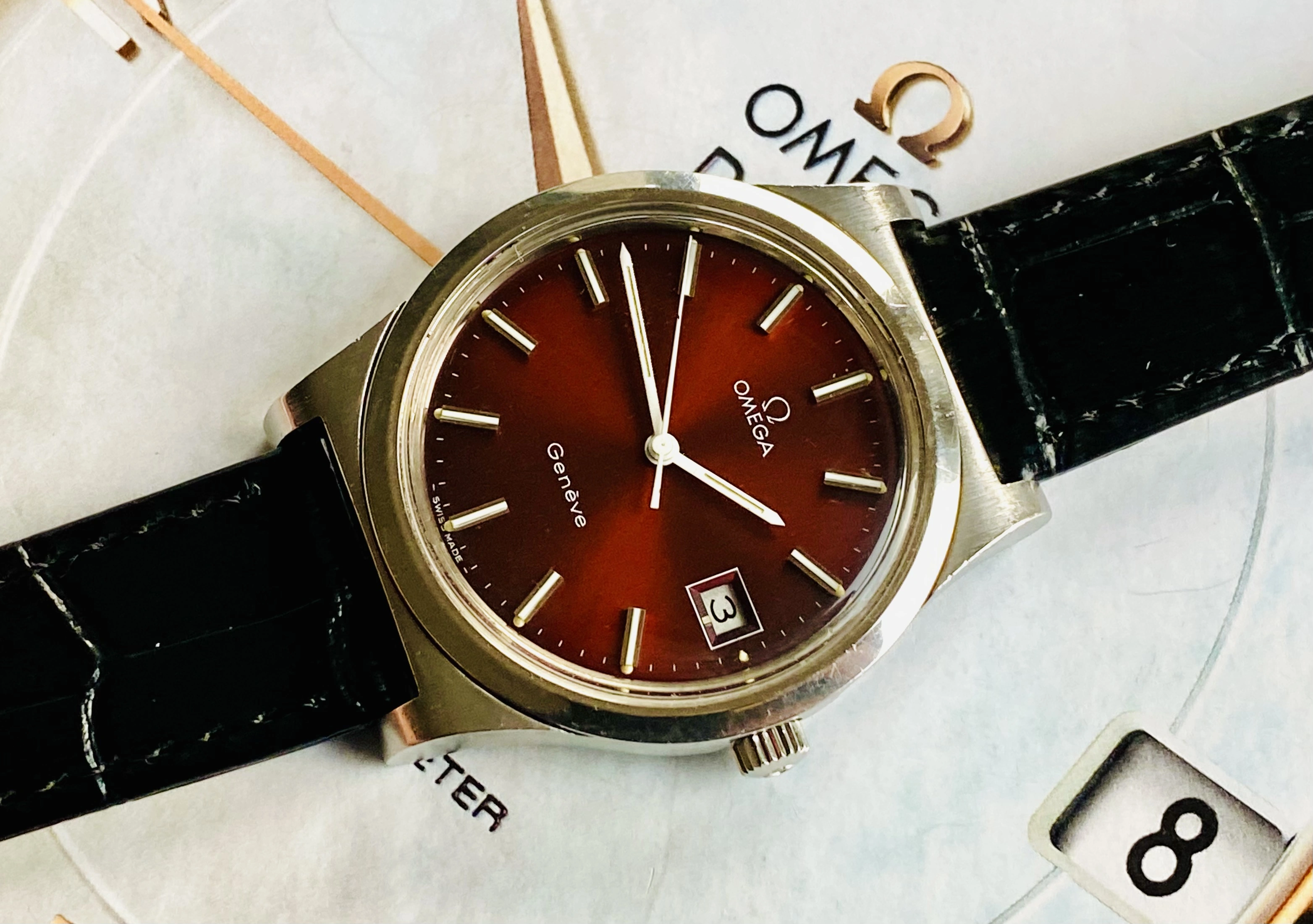 For sale is very nice looking Omega Genève Date Ref. 136.0102 with rare Sunburst Burgundy Dial from 1972, fully serviced.