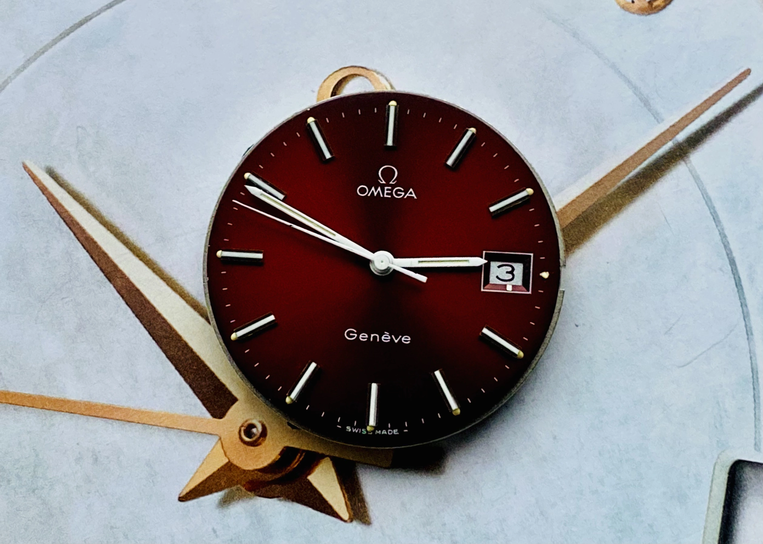 DIAL: with original burgundy dial in very nice condition with applied stick indexes, applied Omega logo, and white colour hands.