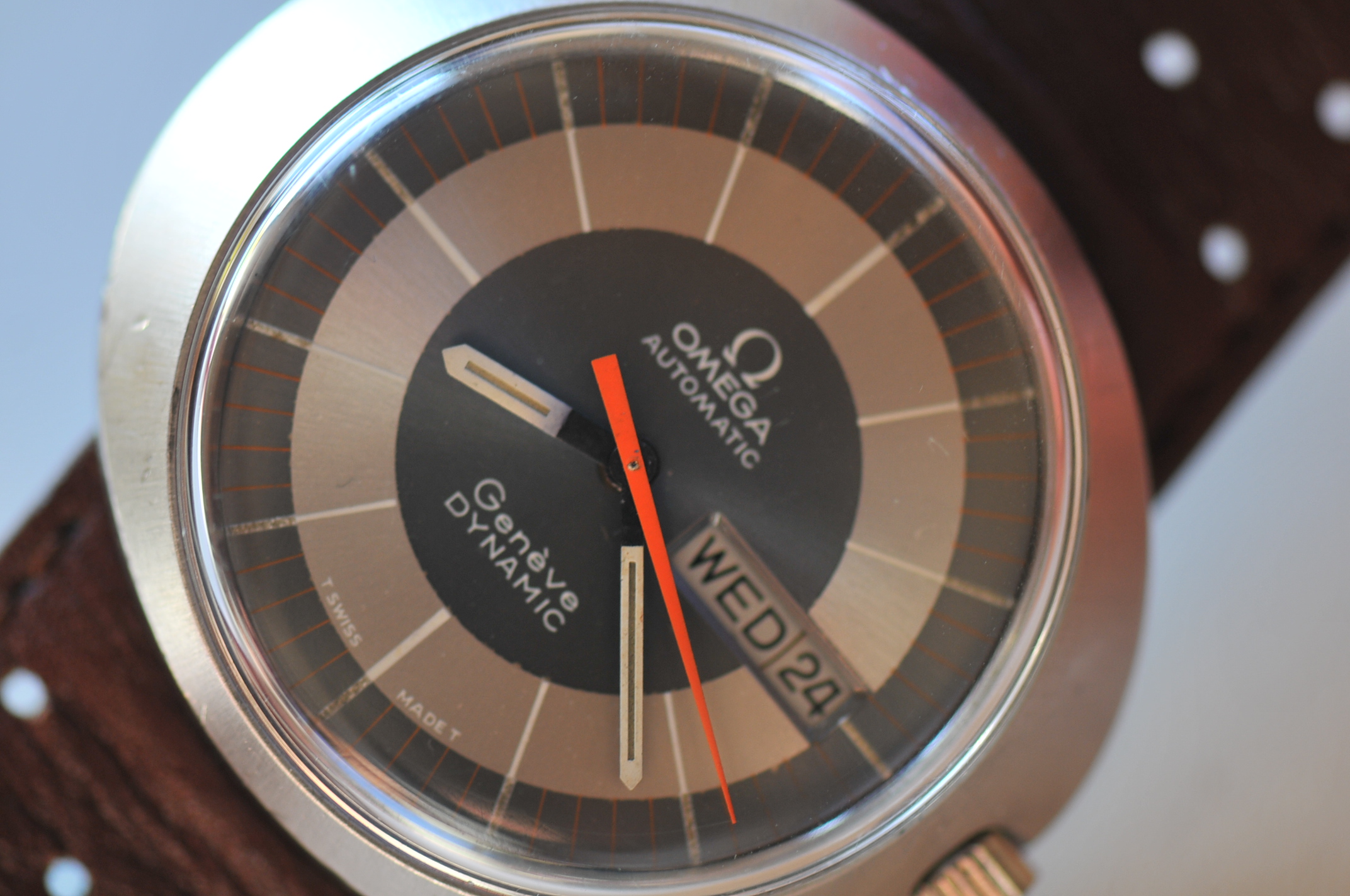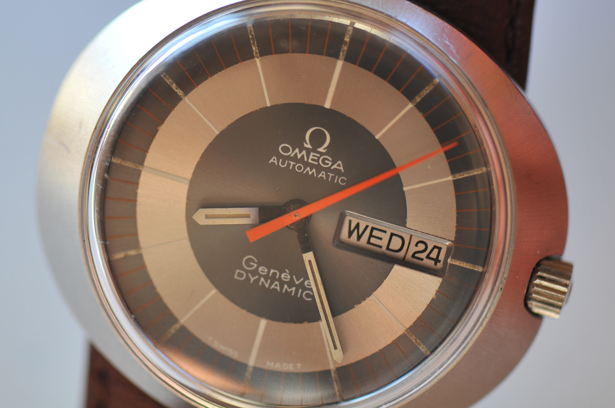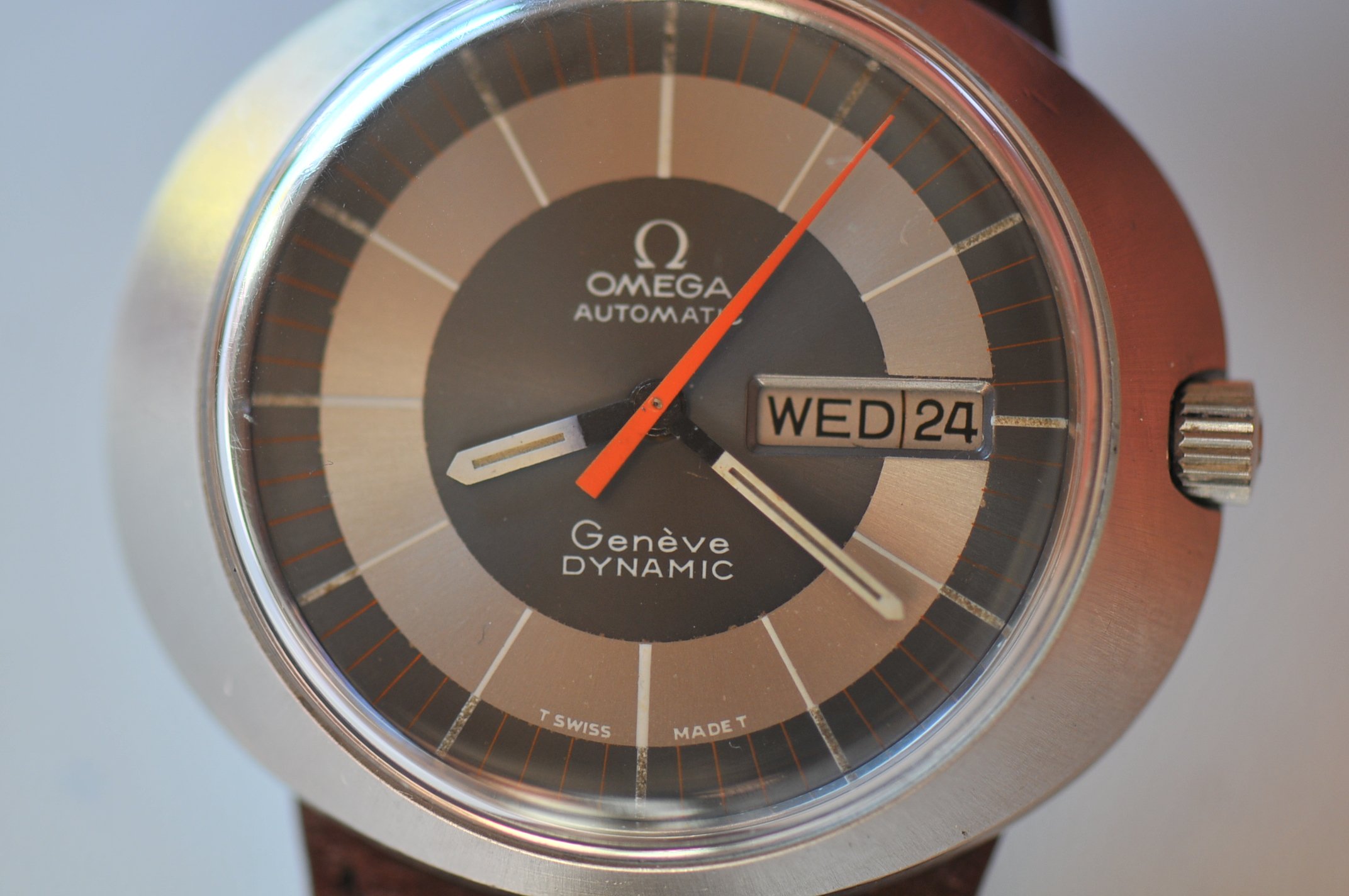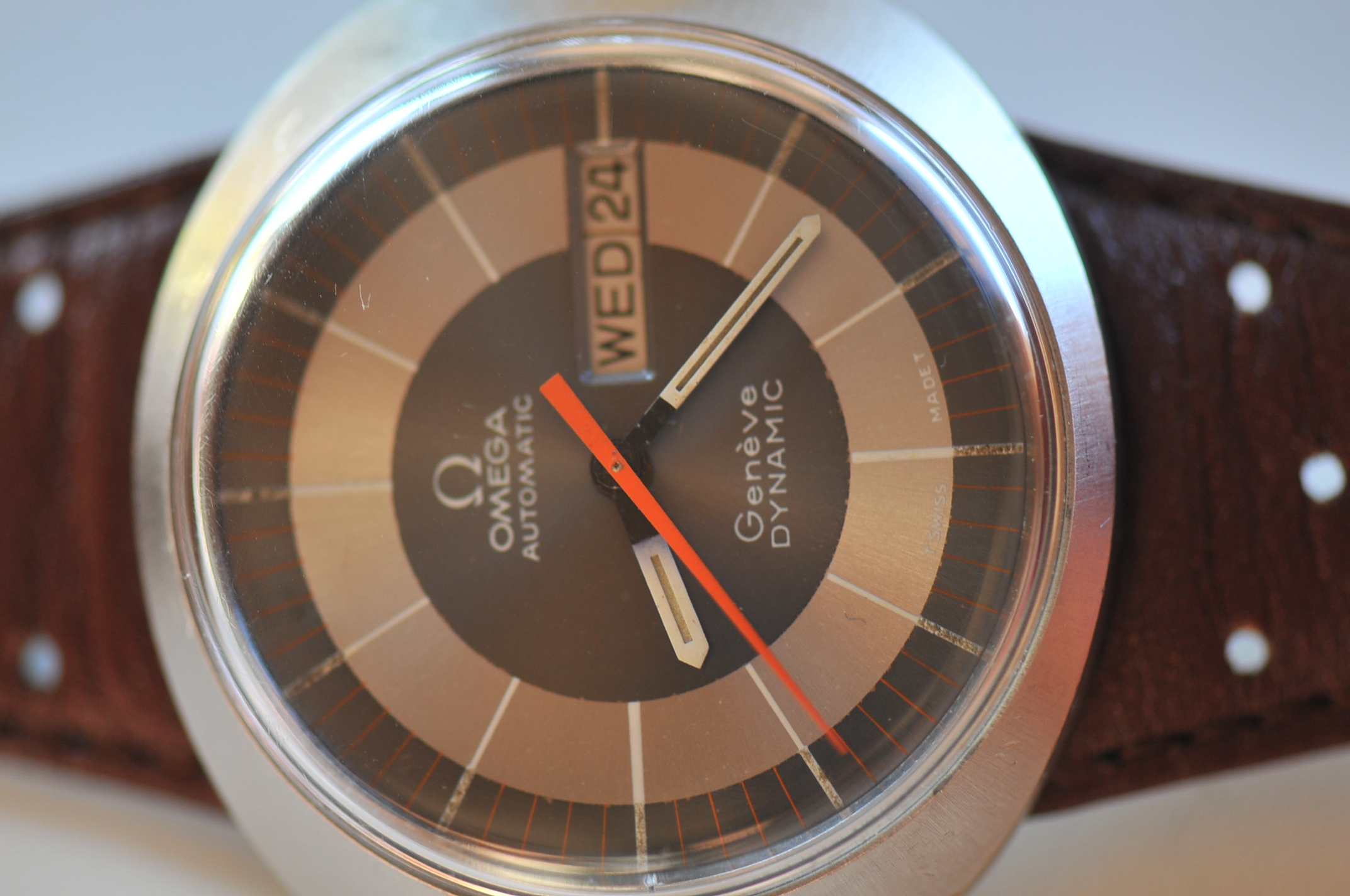 I have for sale a vintage Omega Geneve dynamic automatic watch large size with orange second hand.
