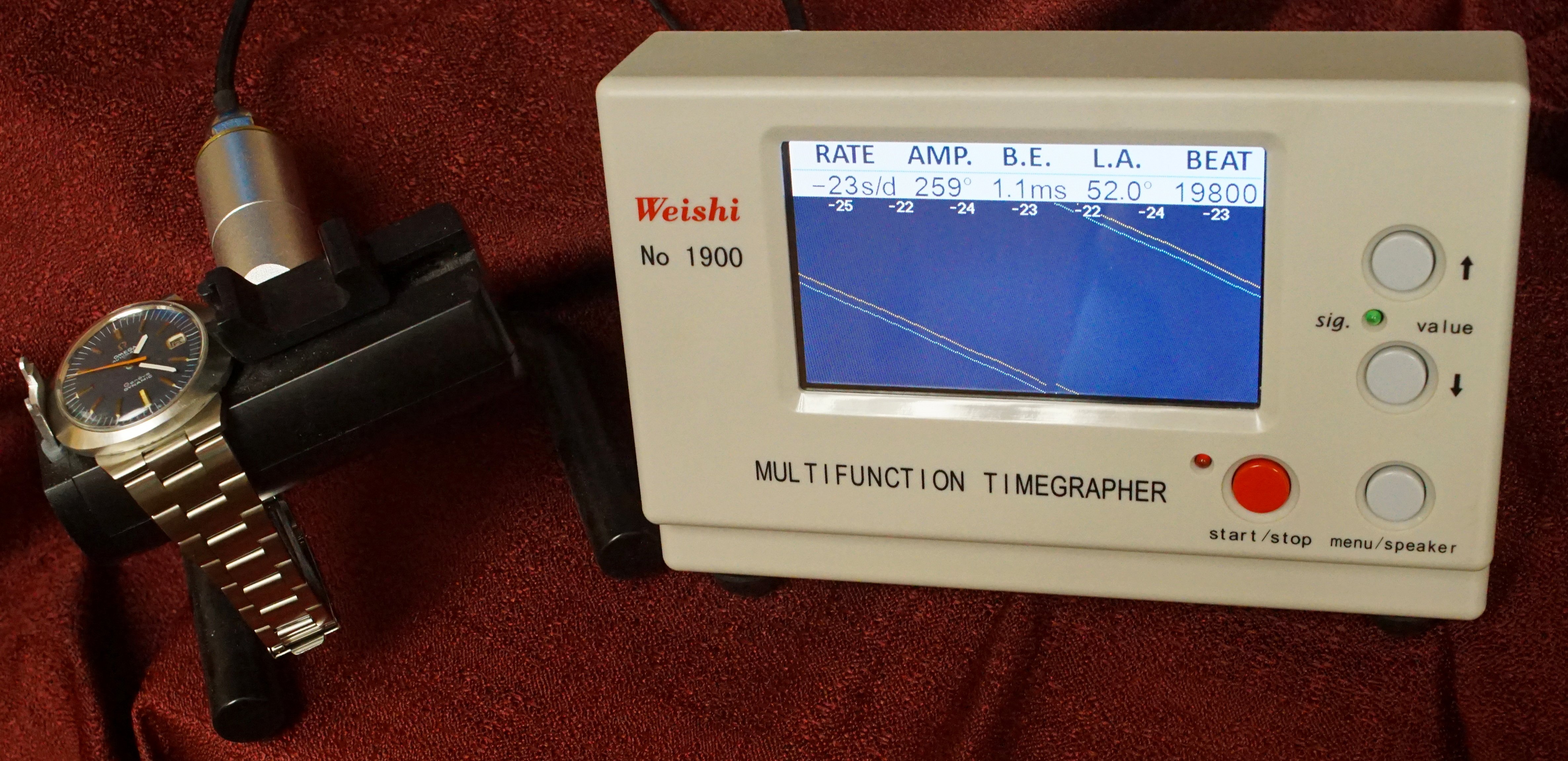 Timegrapher 1900 readings in dial up position (unserviced): -22 to -25 seconds a day; 259 degrees of amplitude; 0.3 milliseconds of beat error; 49 degrees lift angle