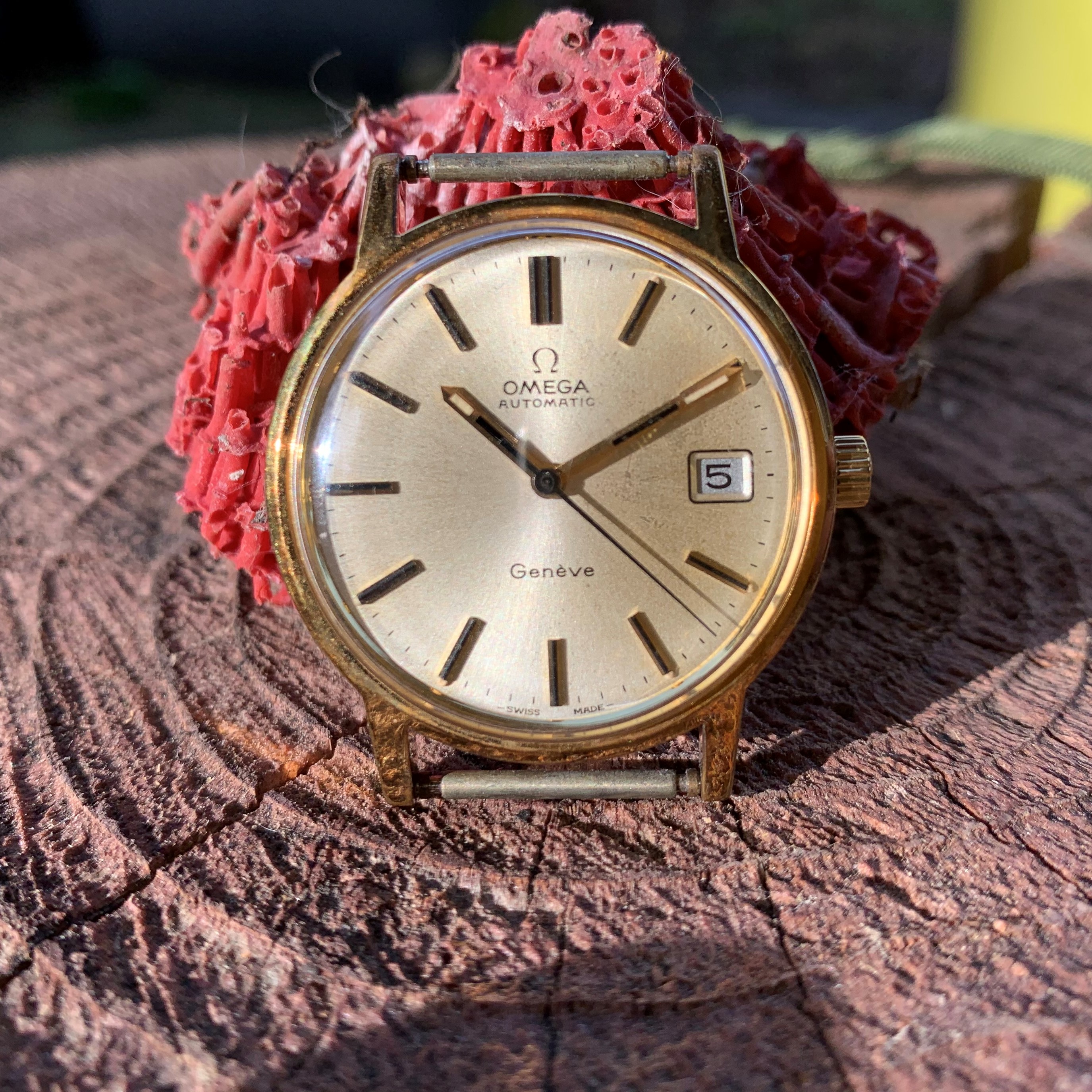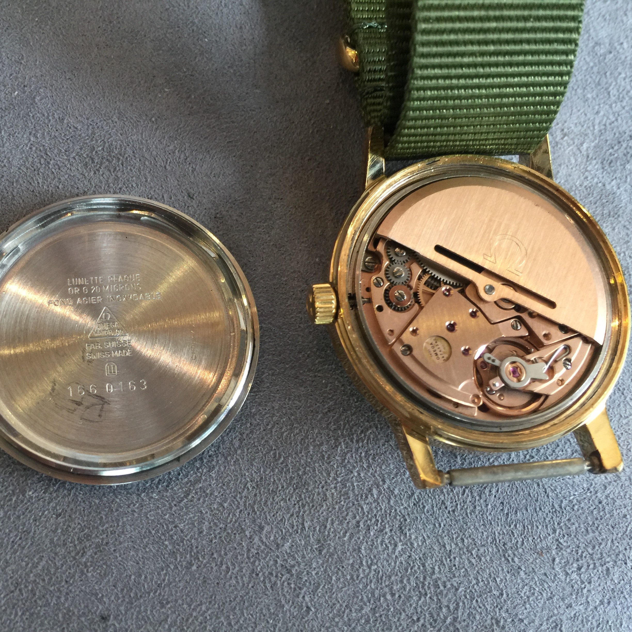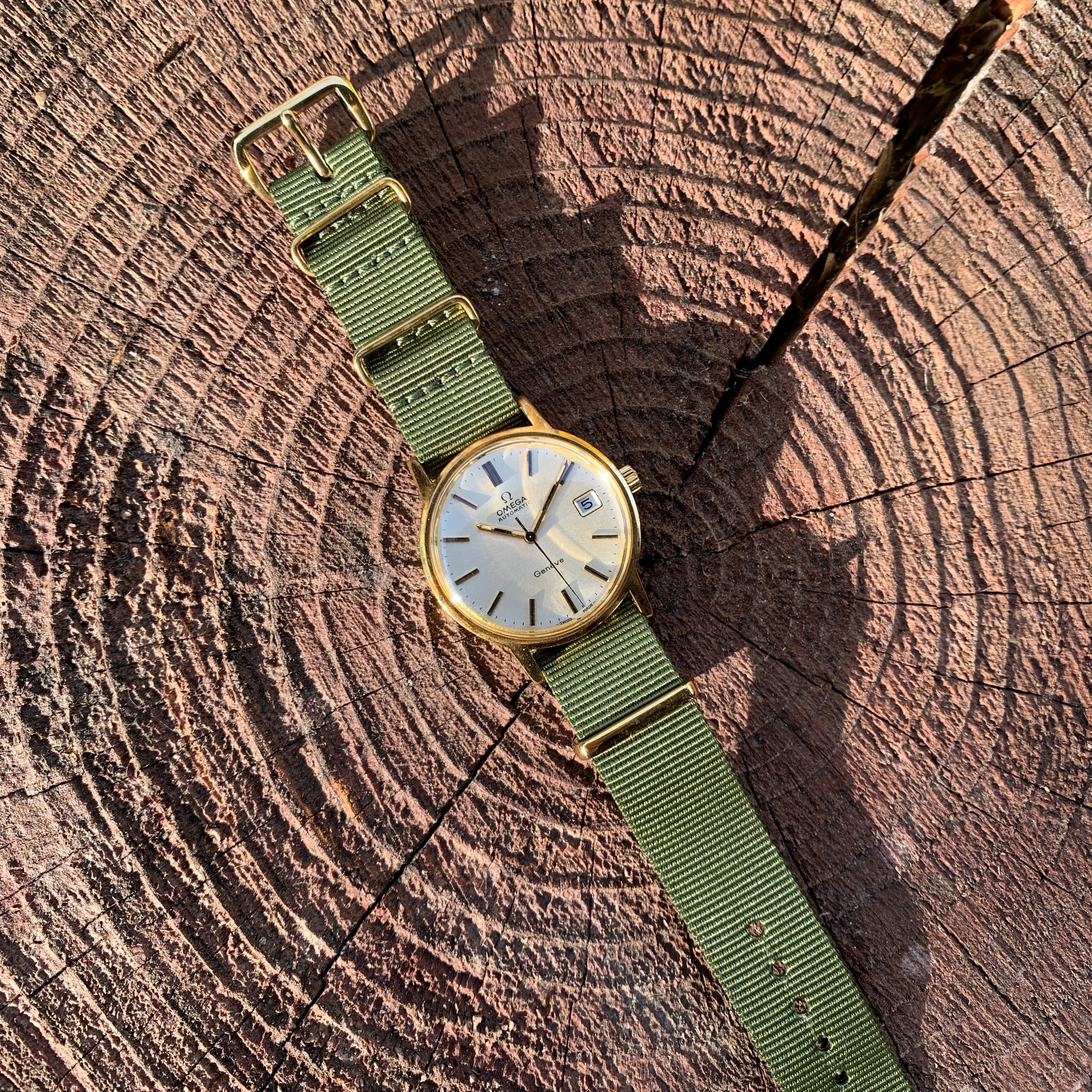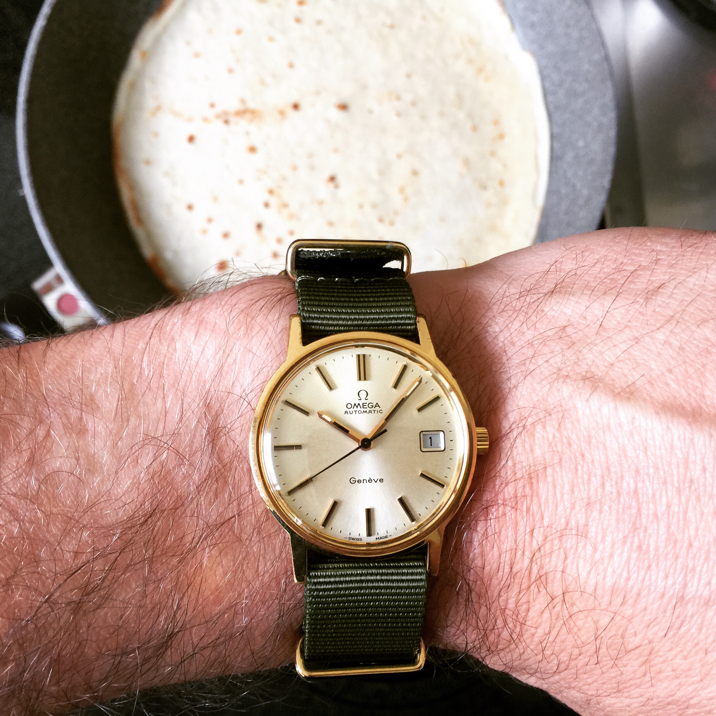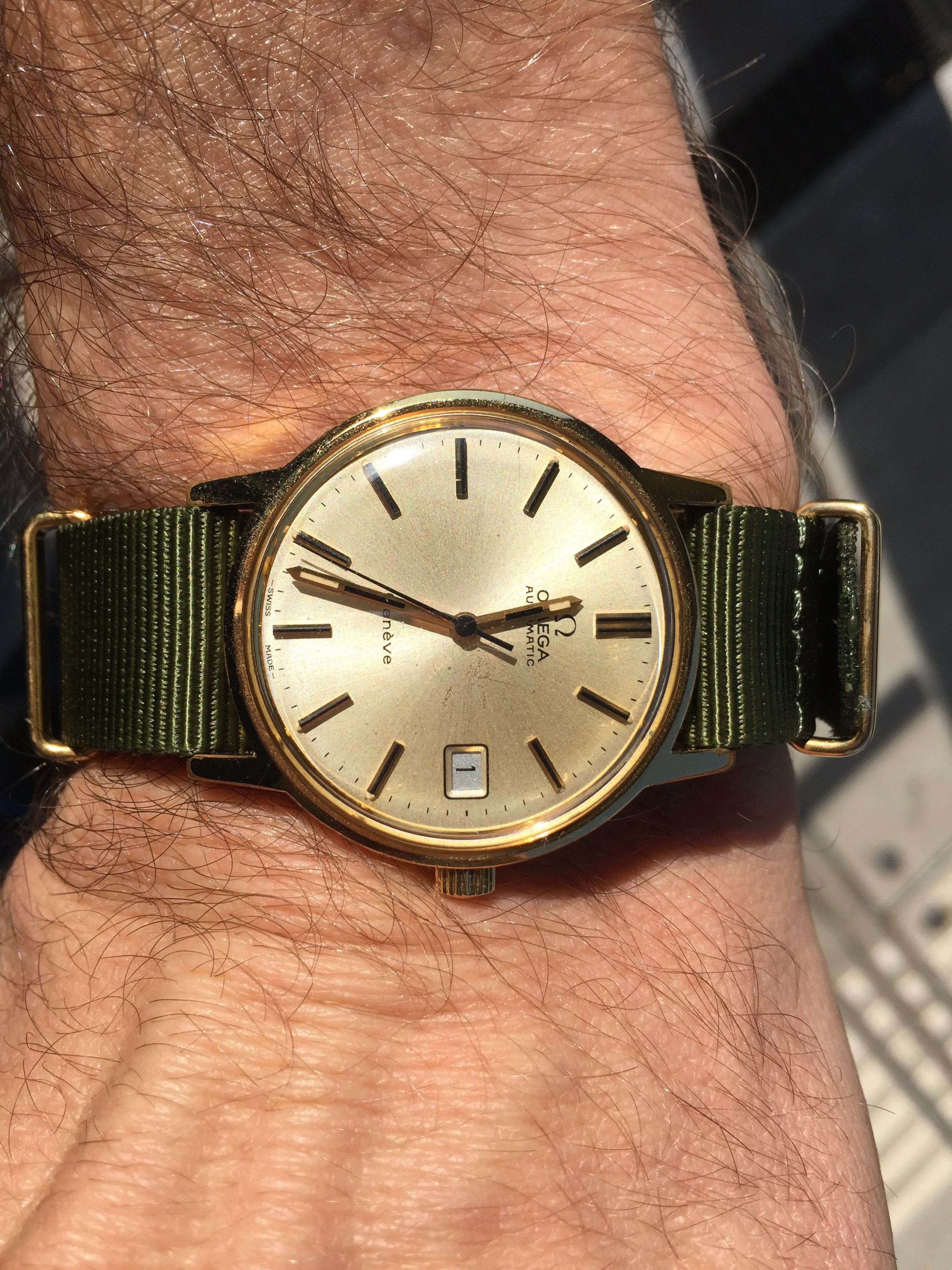 ·Up for grabs my true Uncle Watch. Or rather, great-uncle watch. A gold plated Omega Geneve 1660163. It comes with the green-and-gold nato pictured.