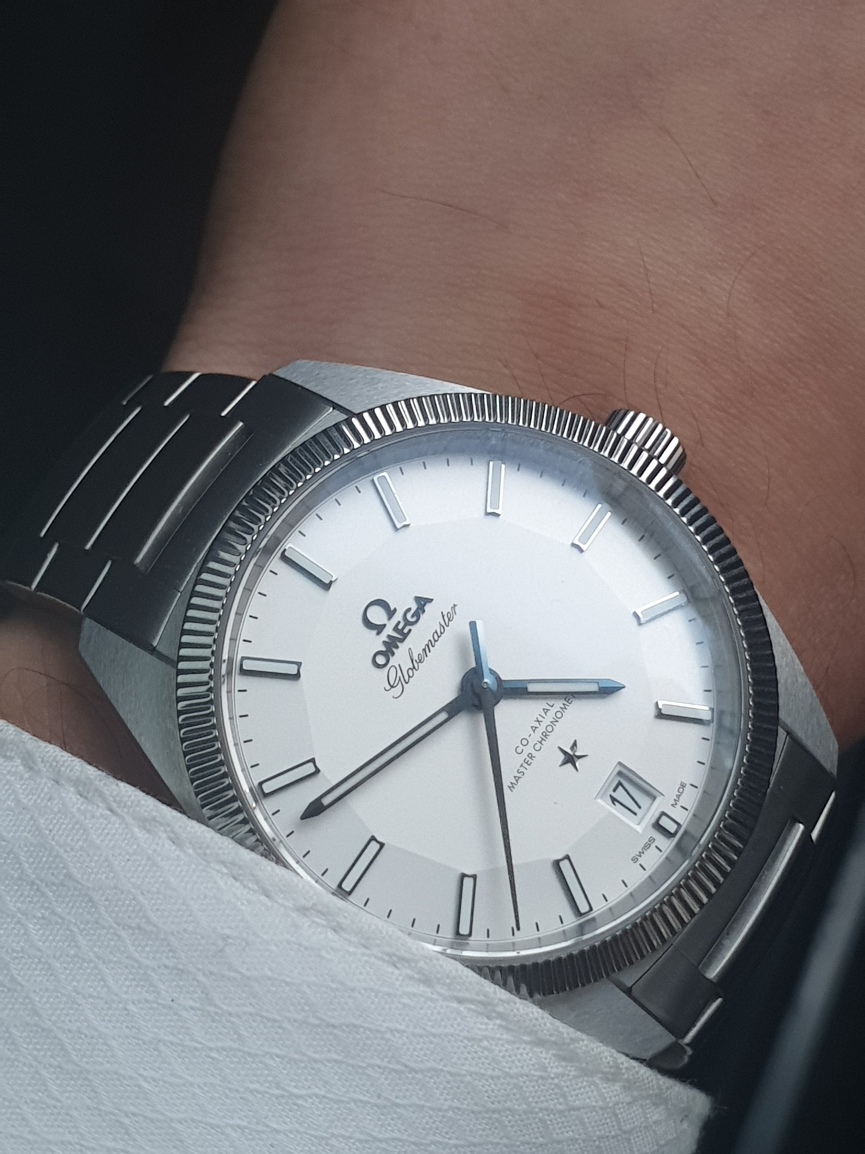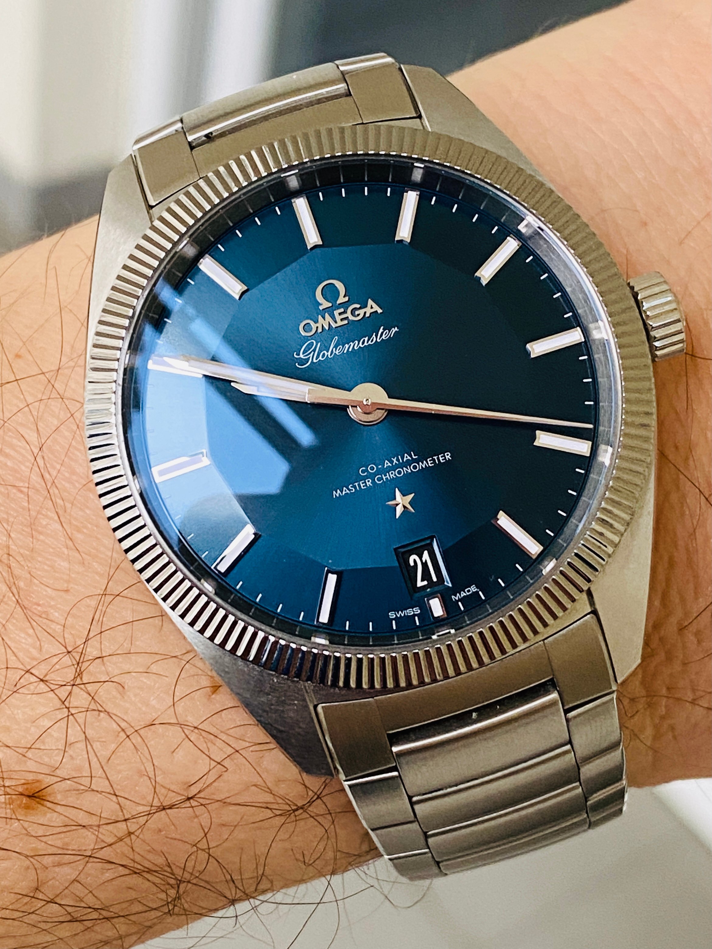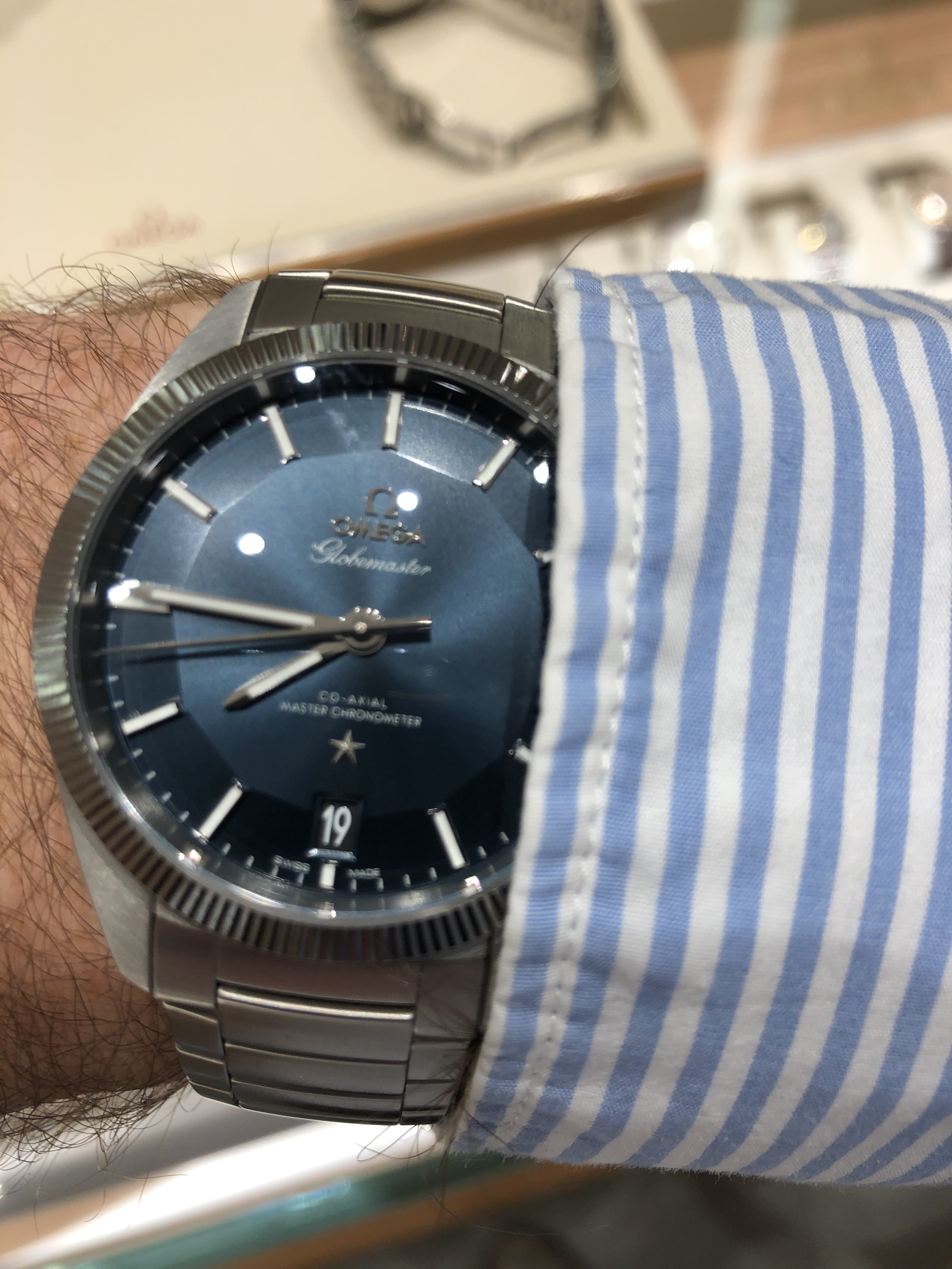 ·if you have a chance to try it on then please do., the blue SS GM has been out of stock for a while in the US online shop . It is definitely the more popular version of the Globemaster and the pie pan is more prominent on the Blue dial watch.