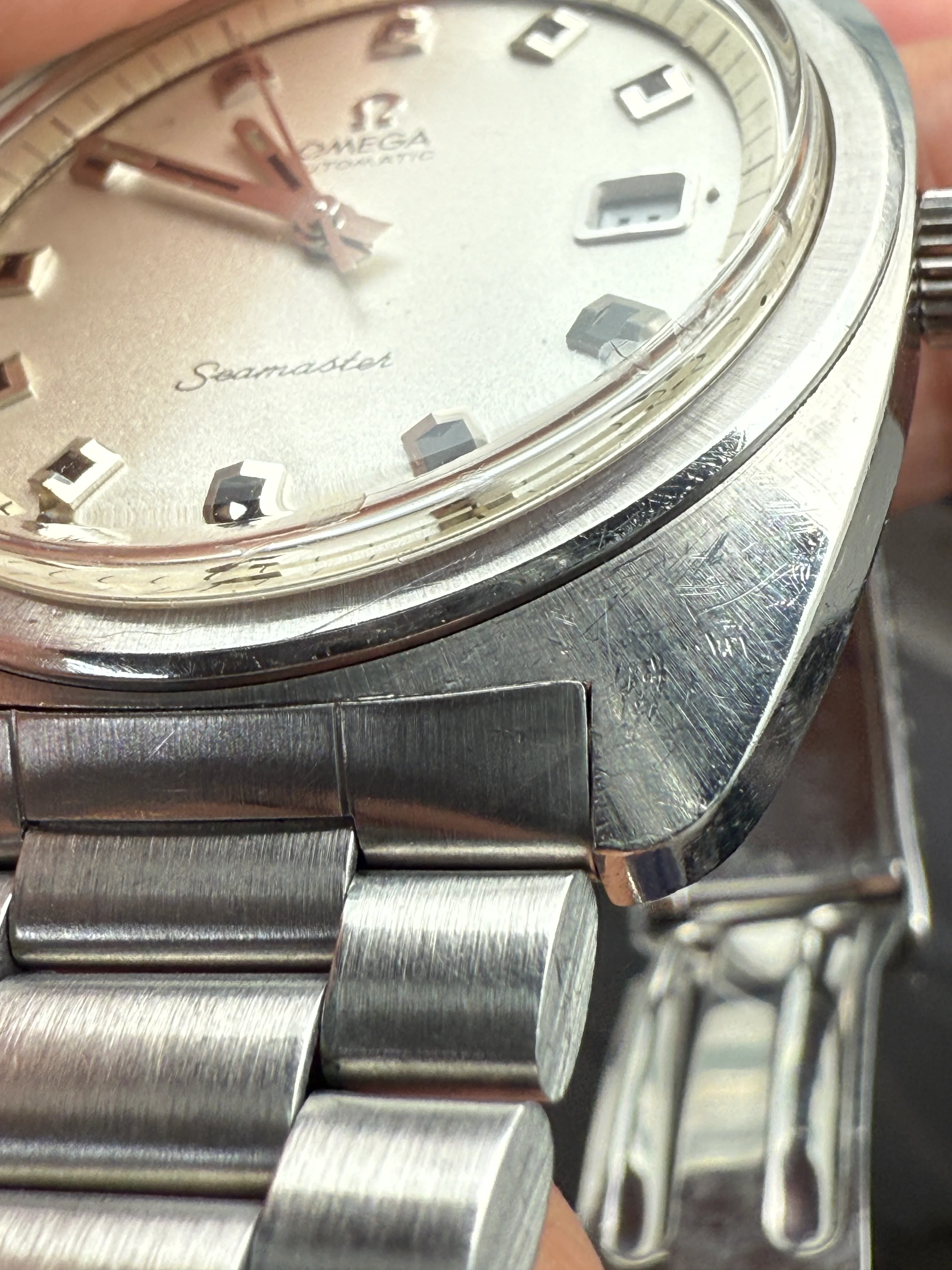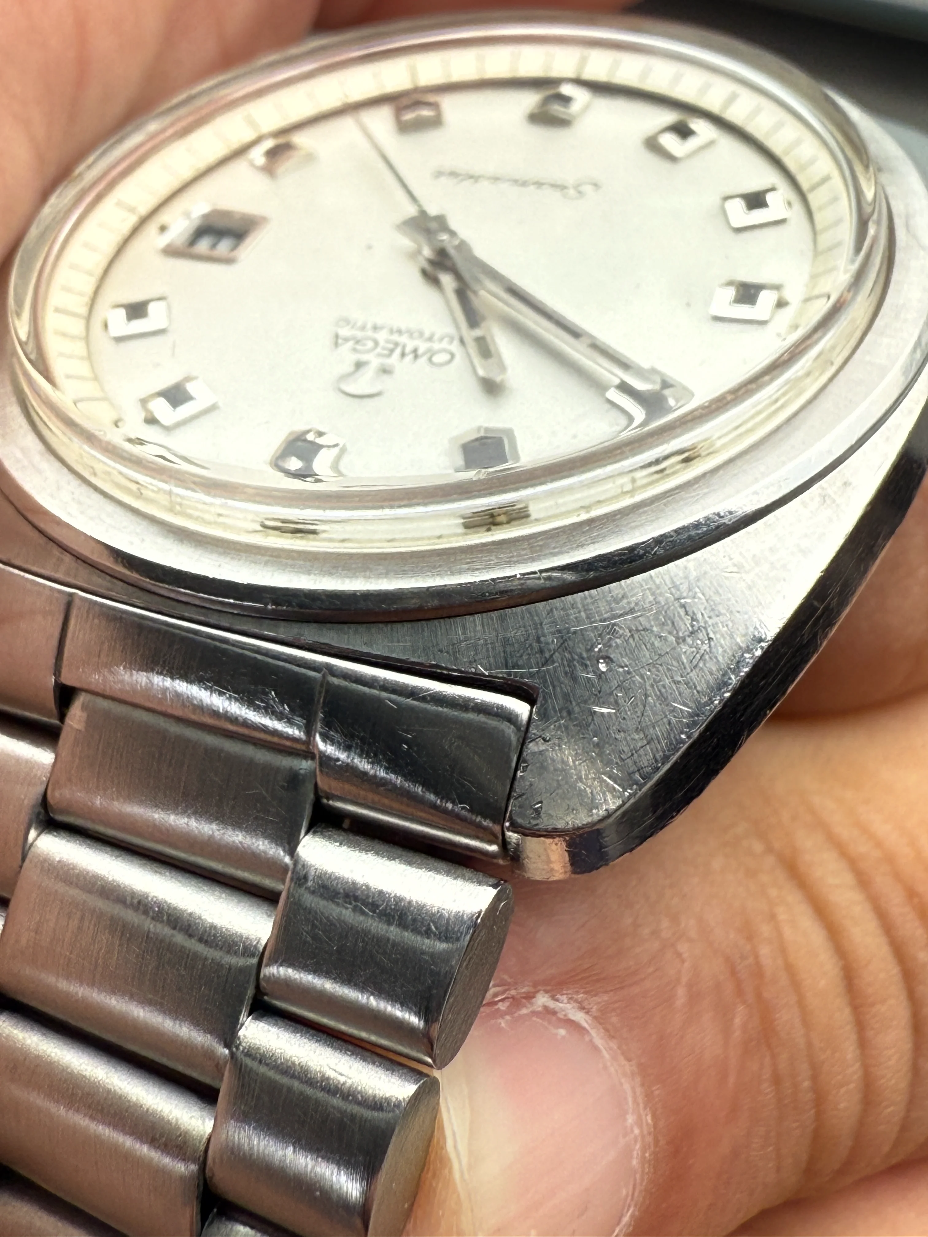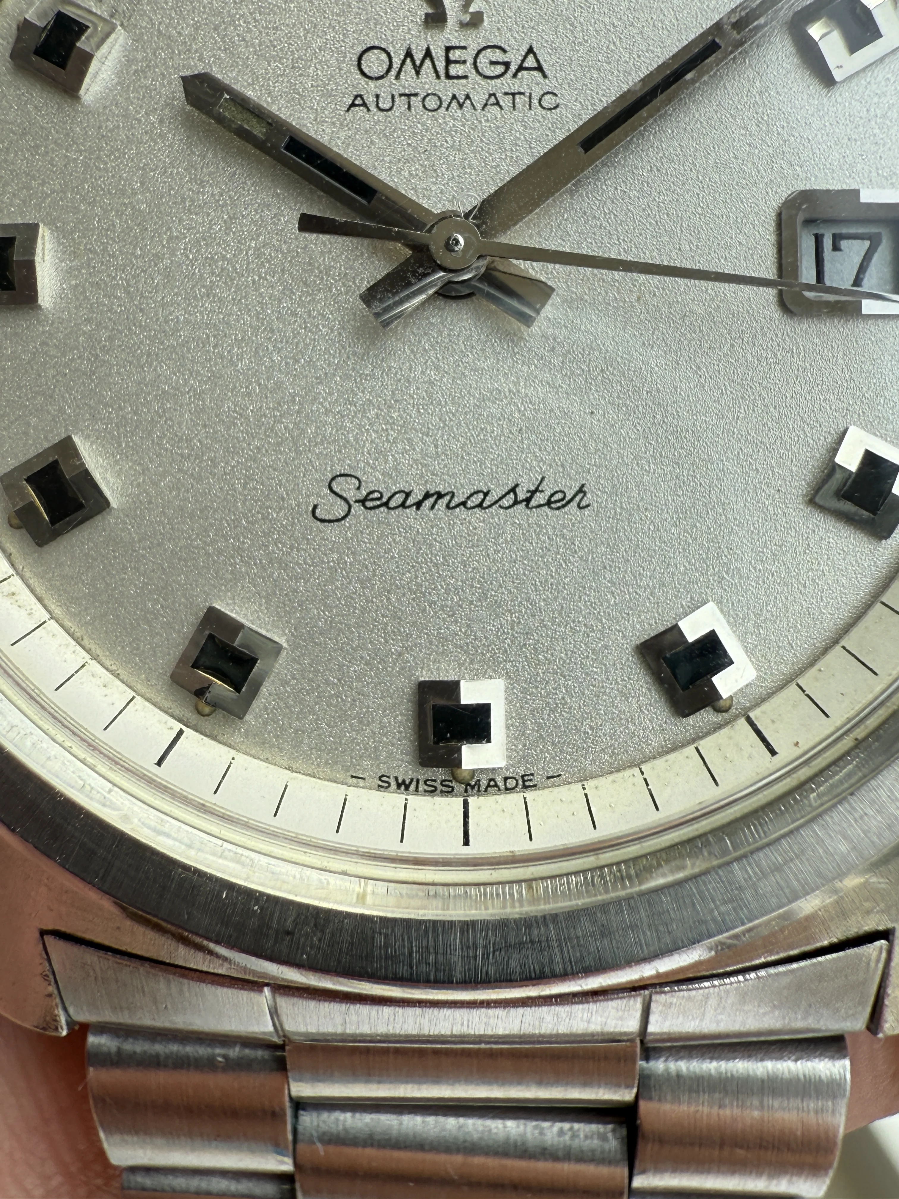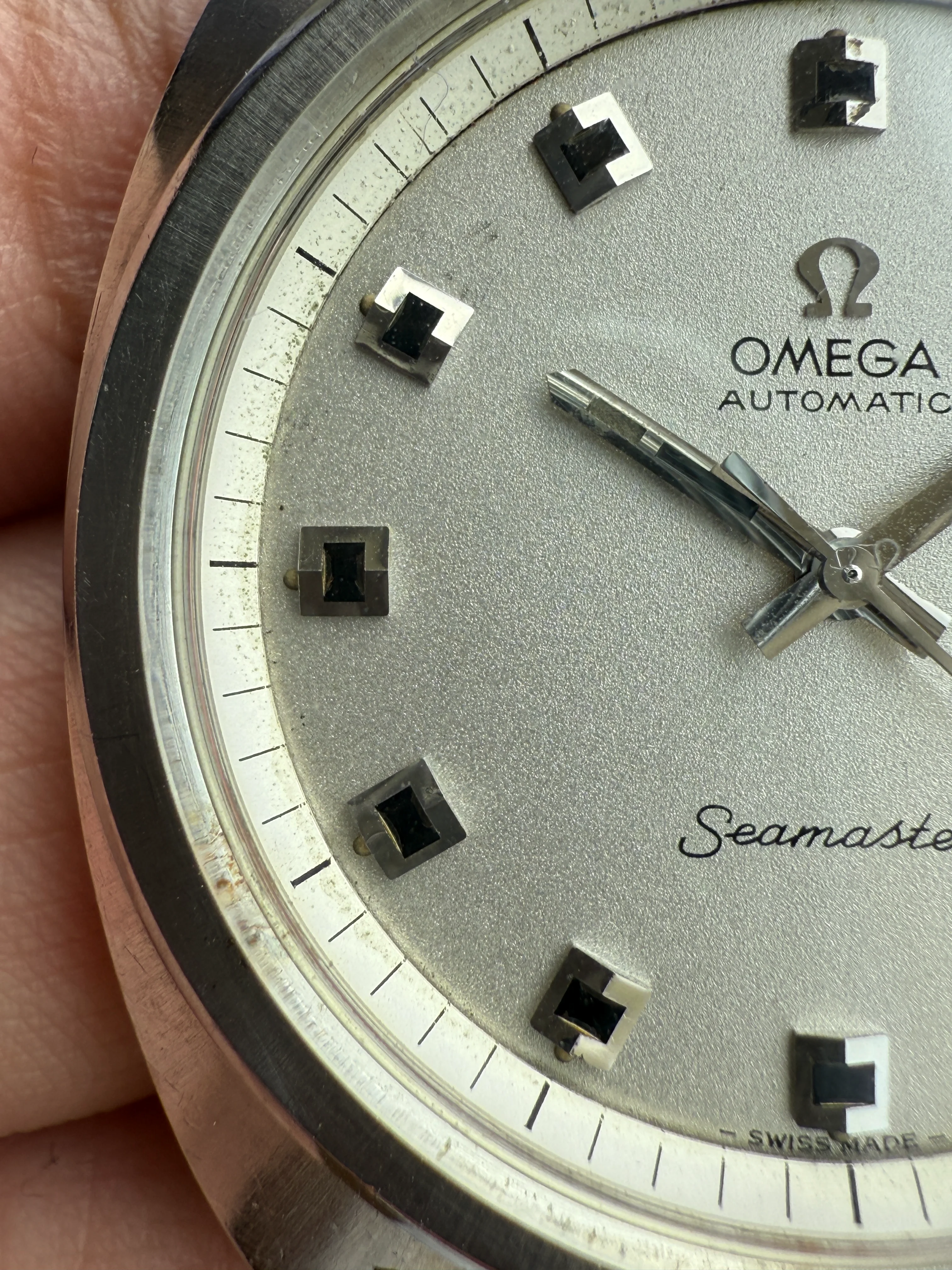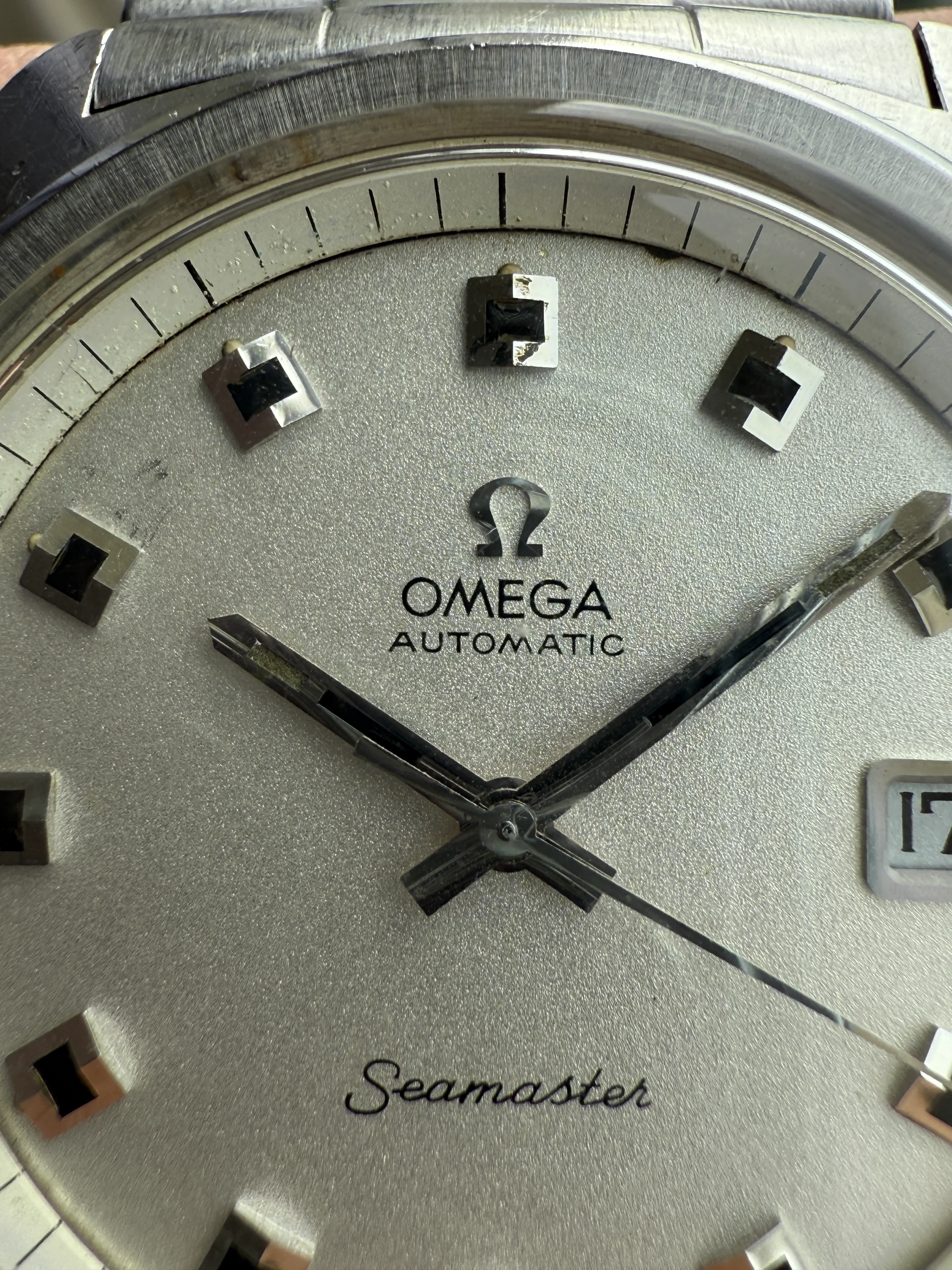 - Dial: Original silver sparkle dial with "roof shaped" hour markers; date-aperture frame at 3; stick hands; tritium lume; applied Omega logo; white inner bezel; prints, hands, lume and hour markers are all good. There are some signs of age and stain on the upper left corner of the inner bezel.