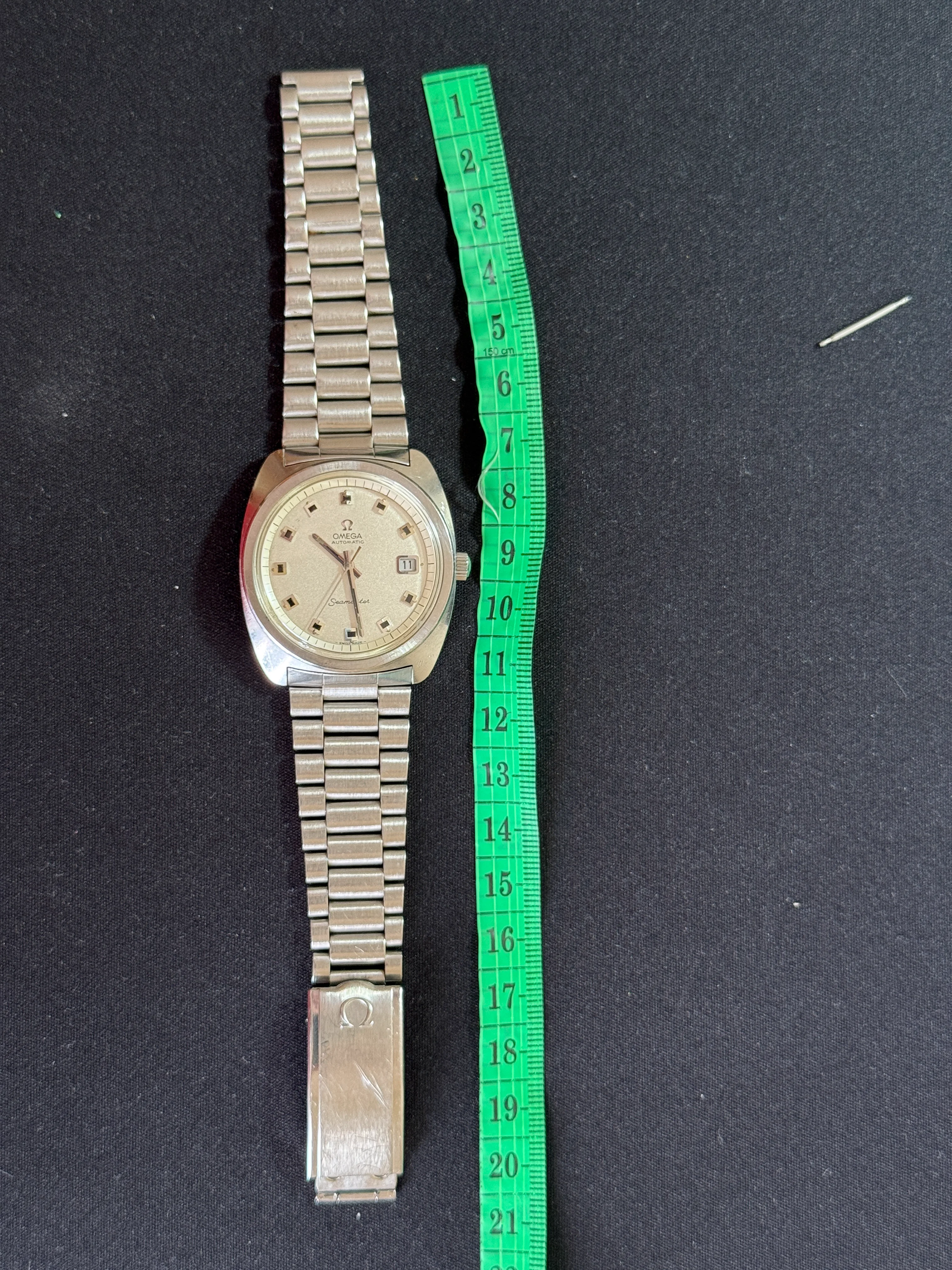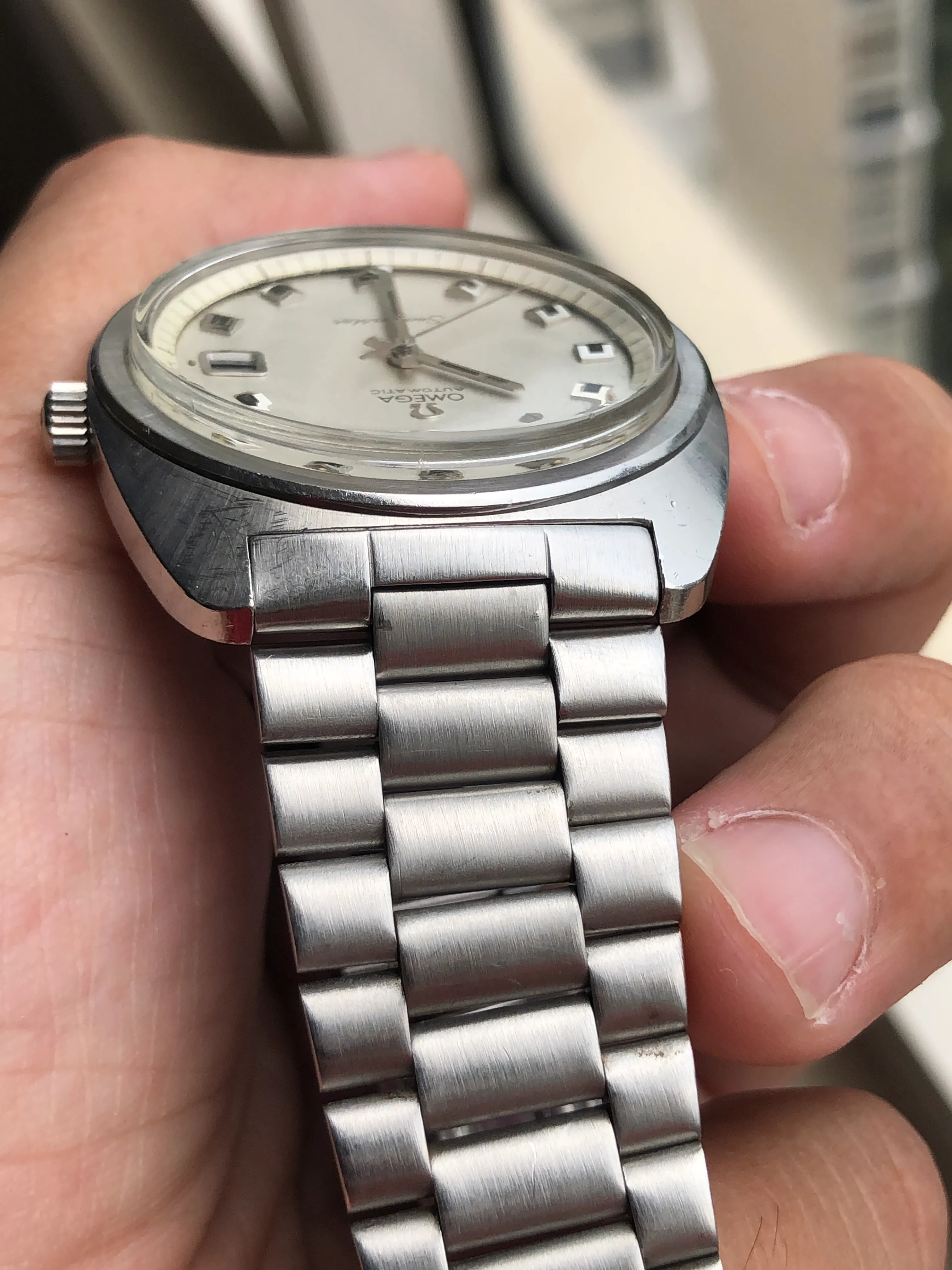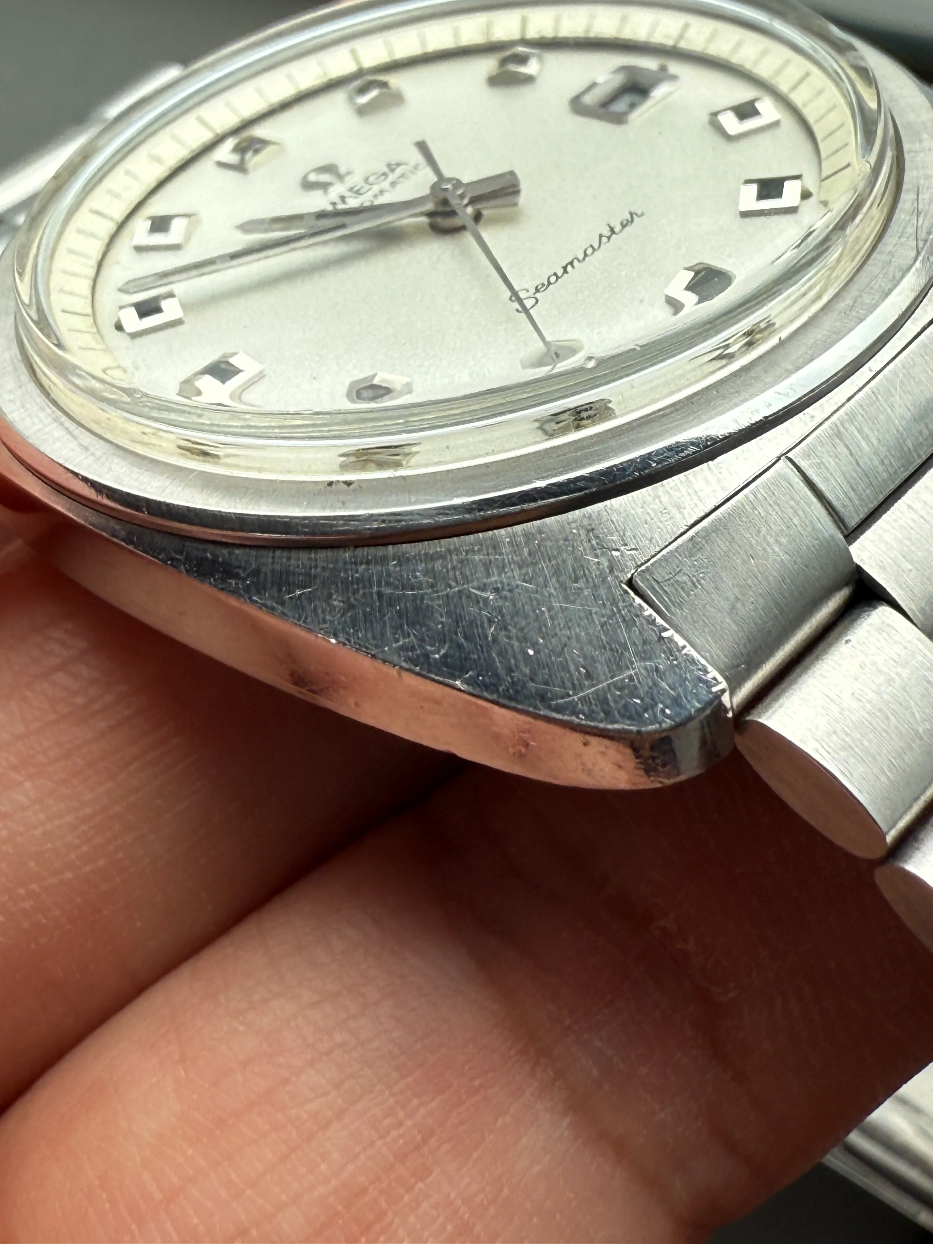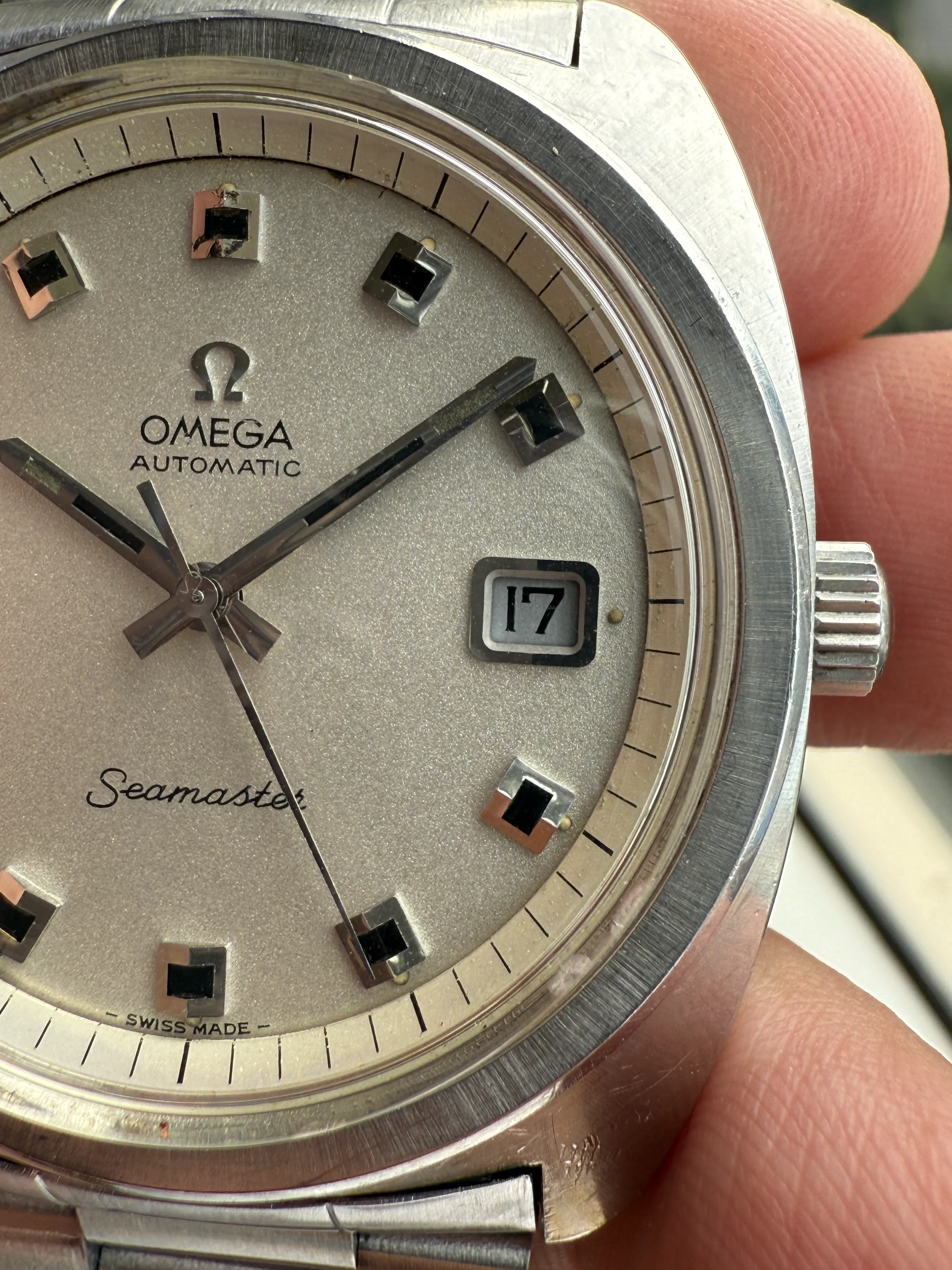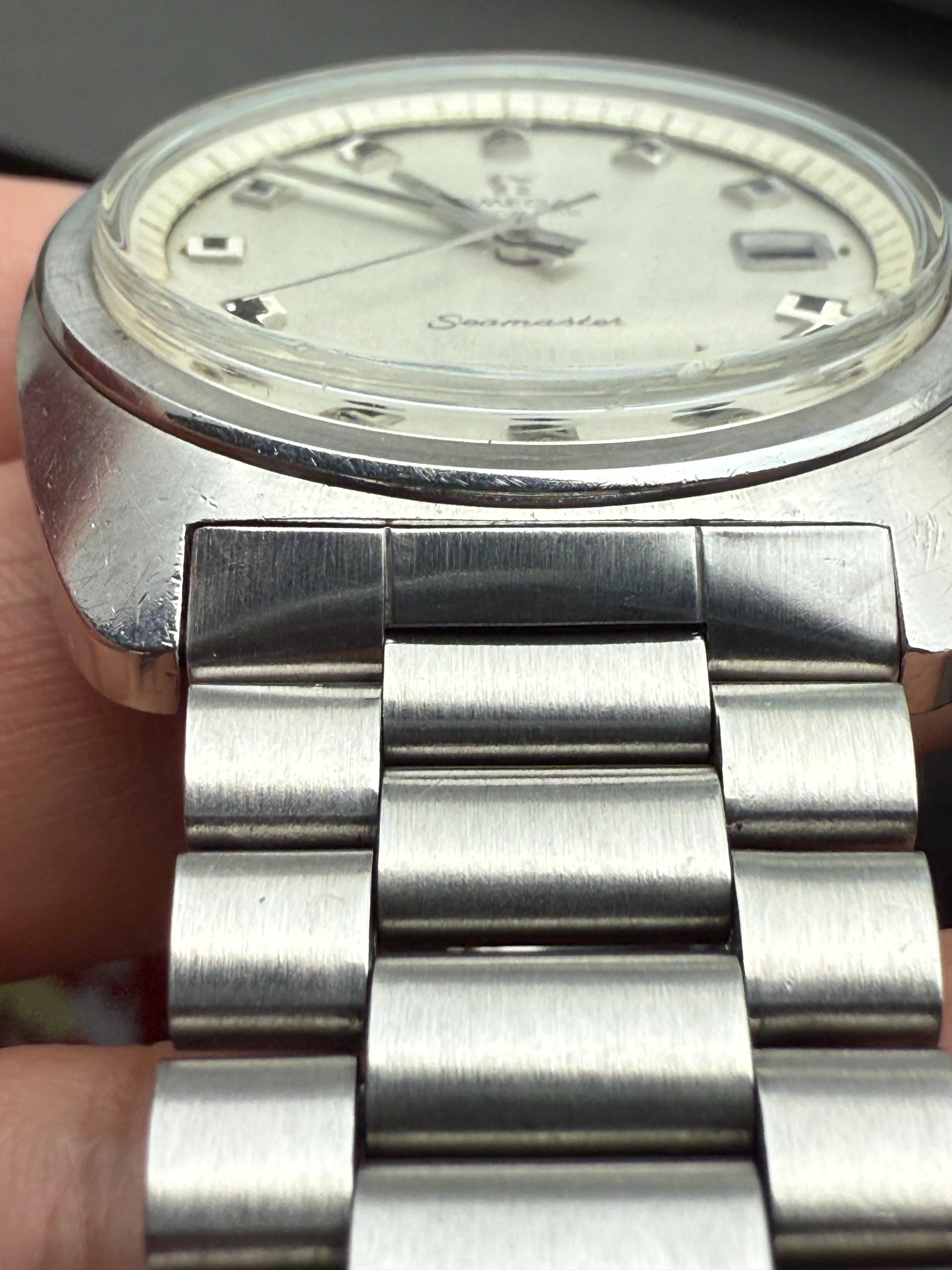 - Dial: Original silver sparkle dial with "roof shaped" hour markers; date-aperture frame at 3; stick hands; tritium lume; applied Omega logo; white inner bezel; prints, hands, lume and hour markers are all good. There are some signs of age and stain on the upper left corner of the inner bezel.