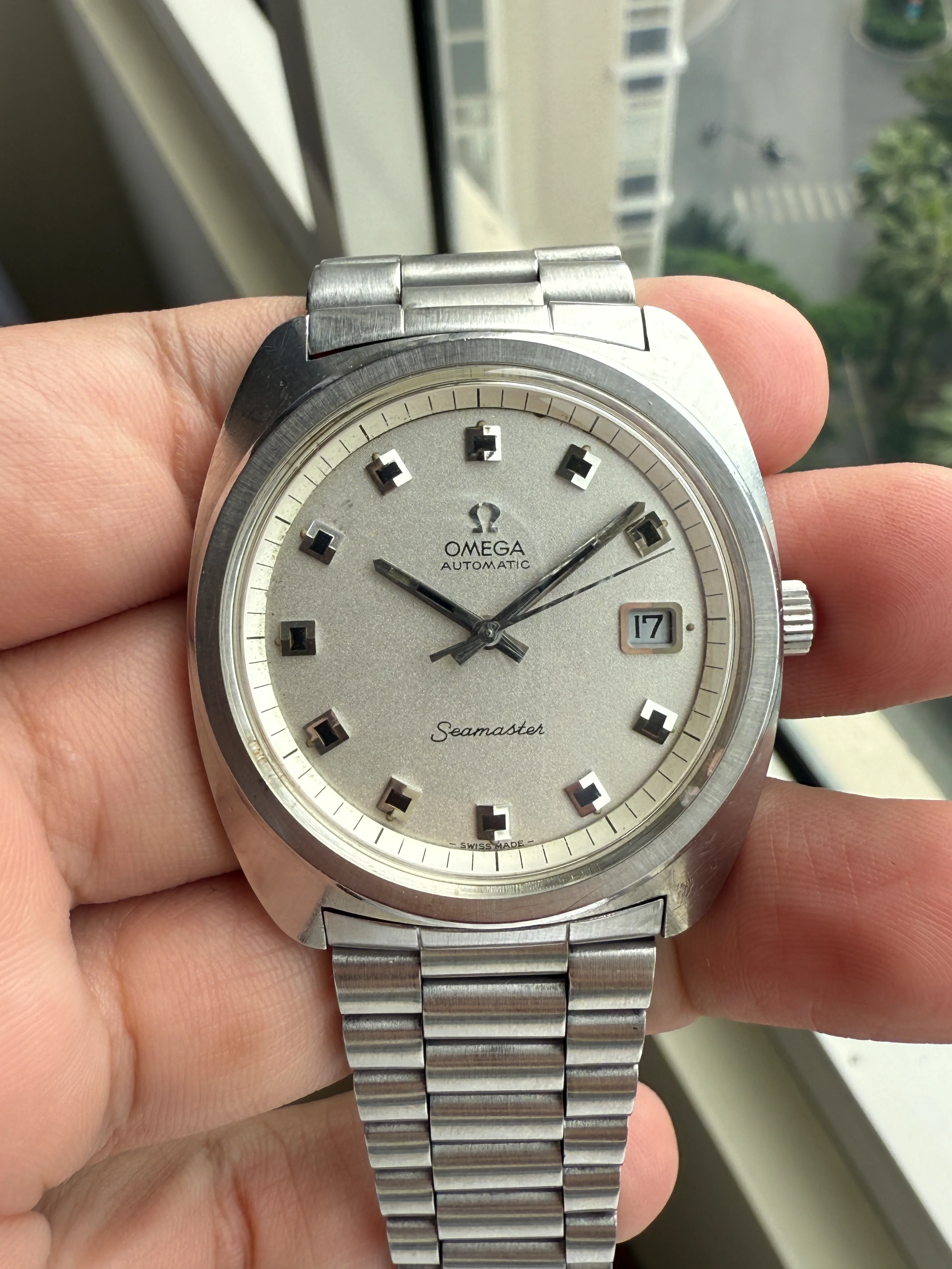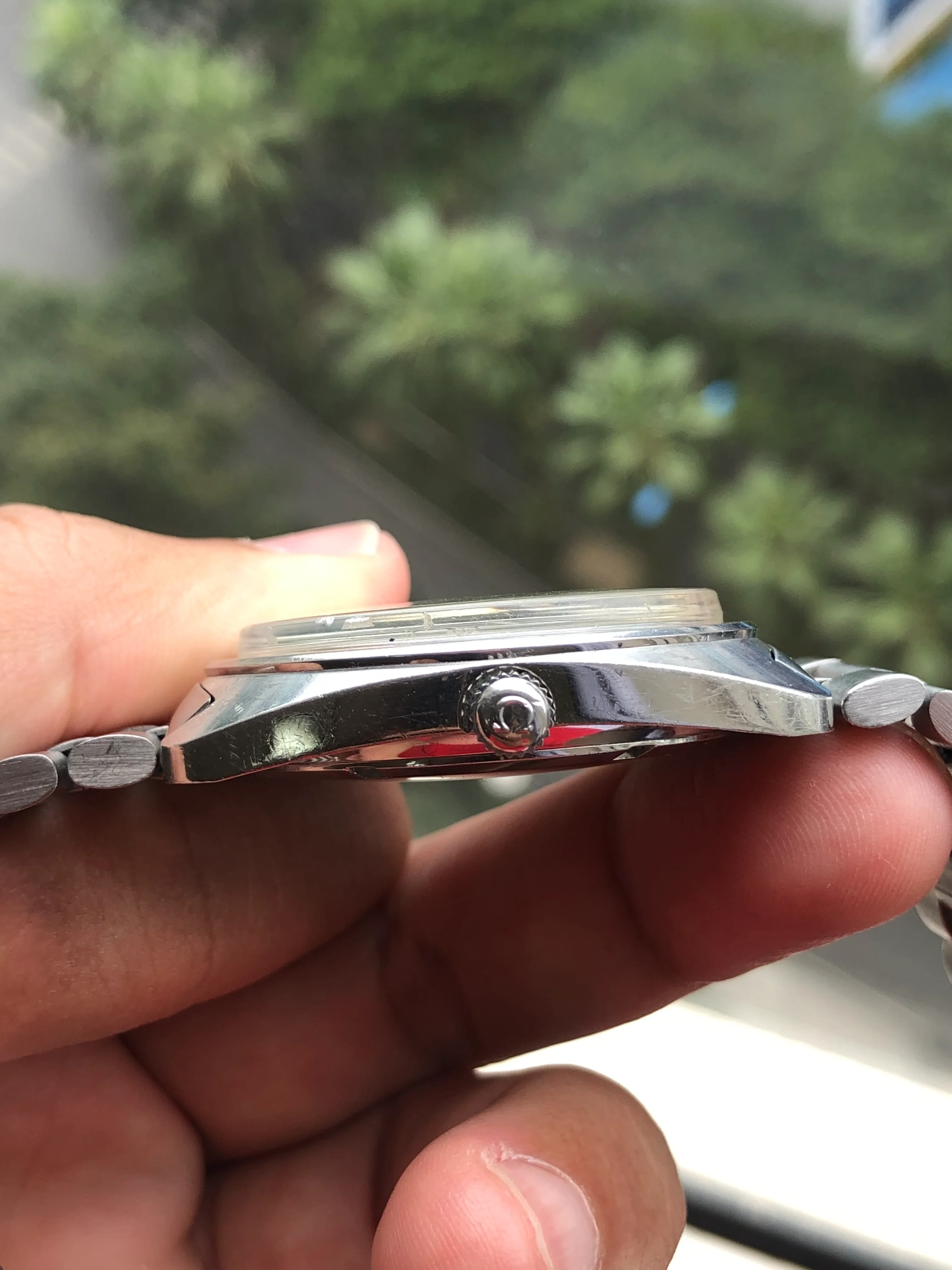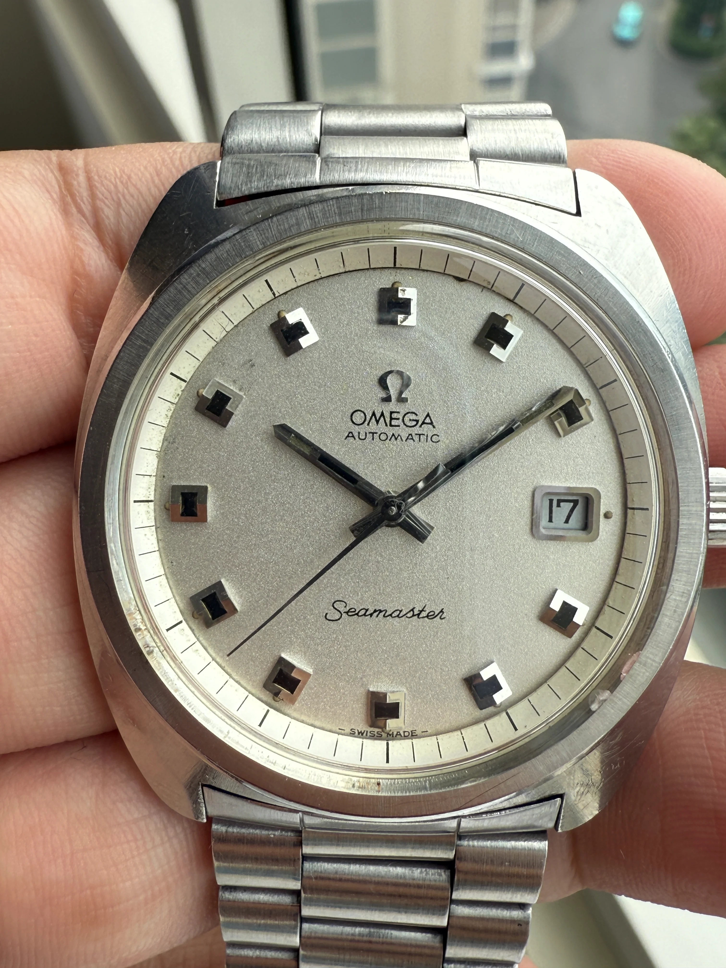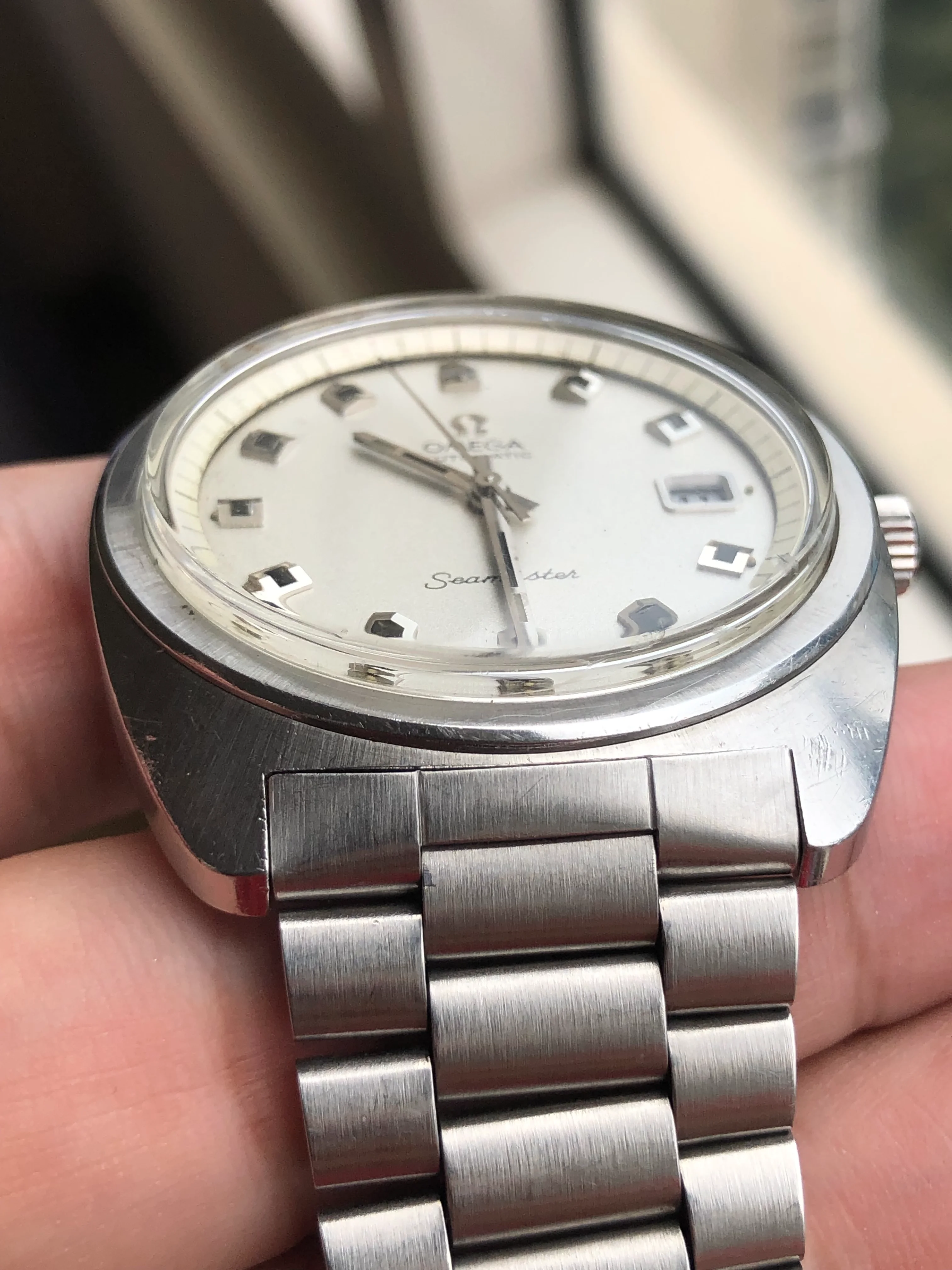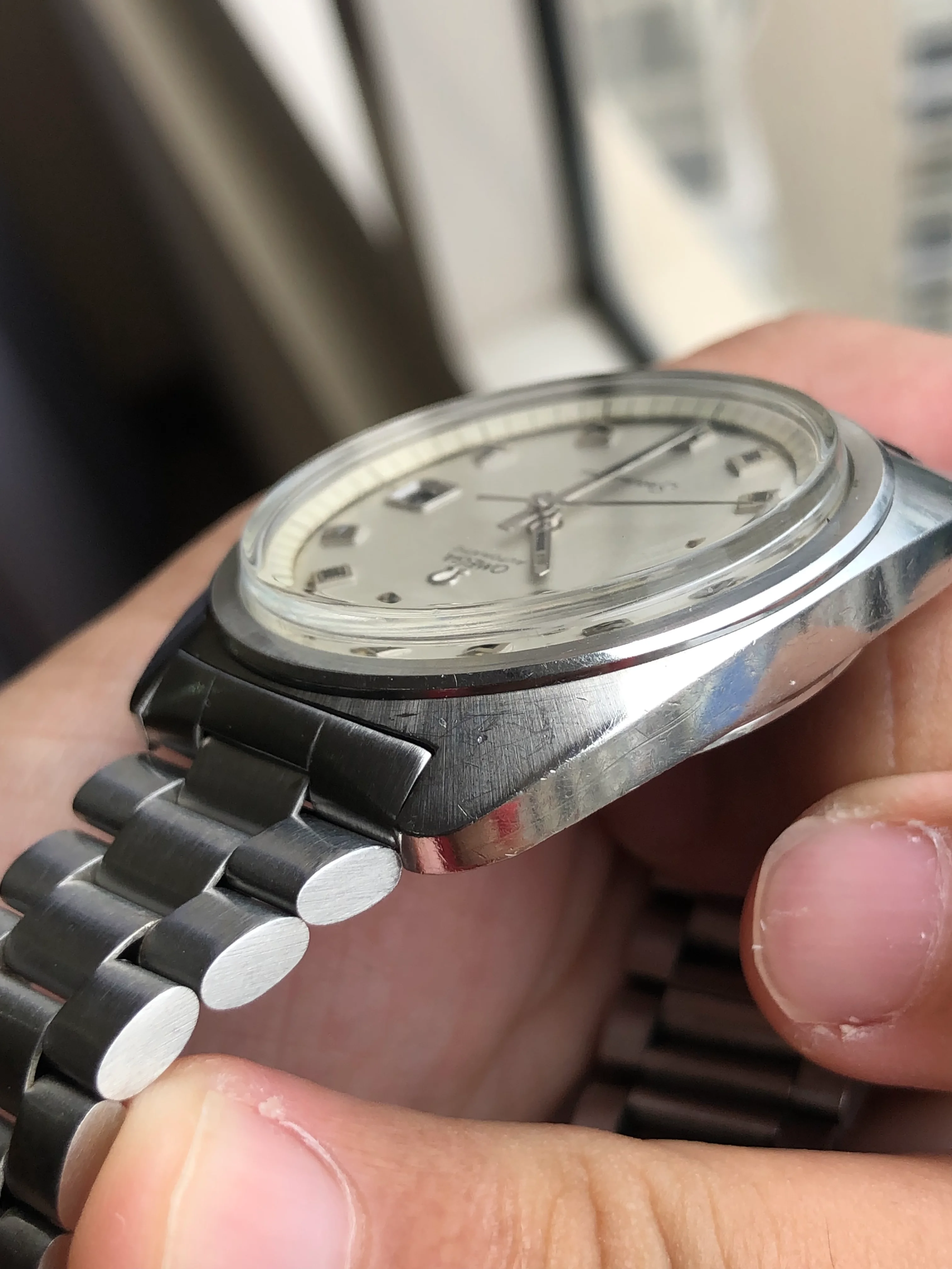 - Dial: Original silver sparkle dial with "roof shaped" hour markers; date-aperture frame at 3; stick hands; tritium lume; applied Omega logo; white inner bezel; prints, hands, lume and hour markers are all good. There are some signs of age and stain on the upper left corner of the inner bezel.